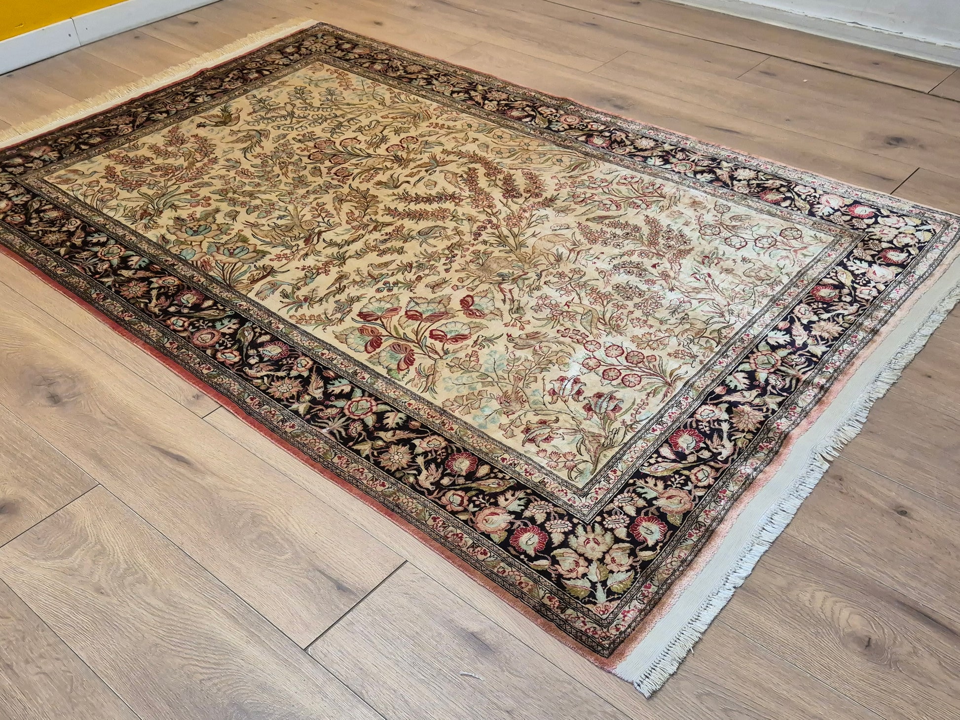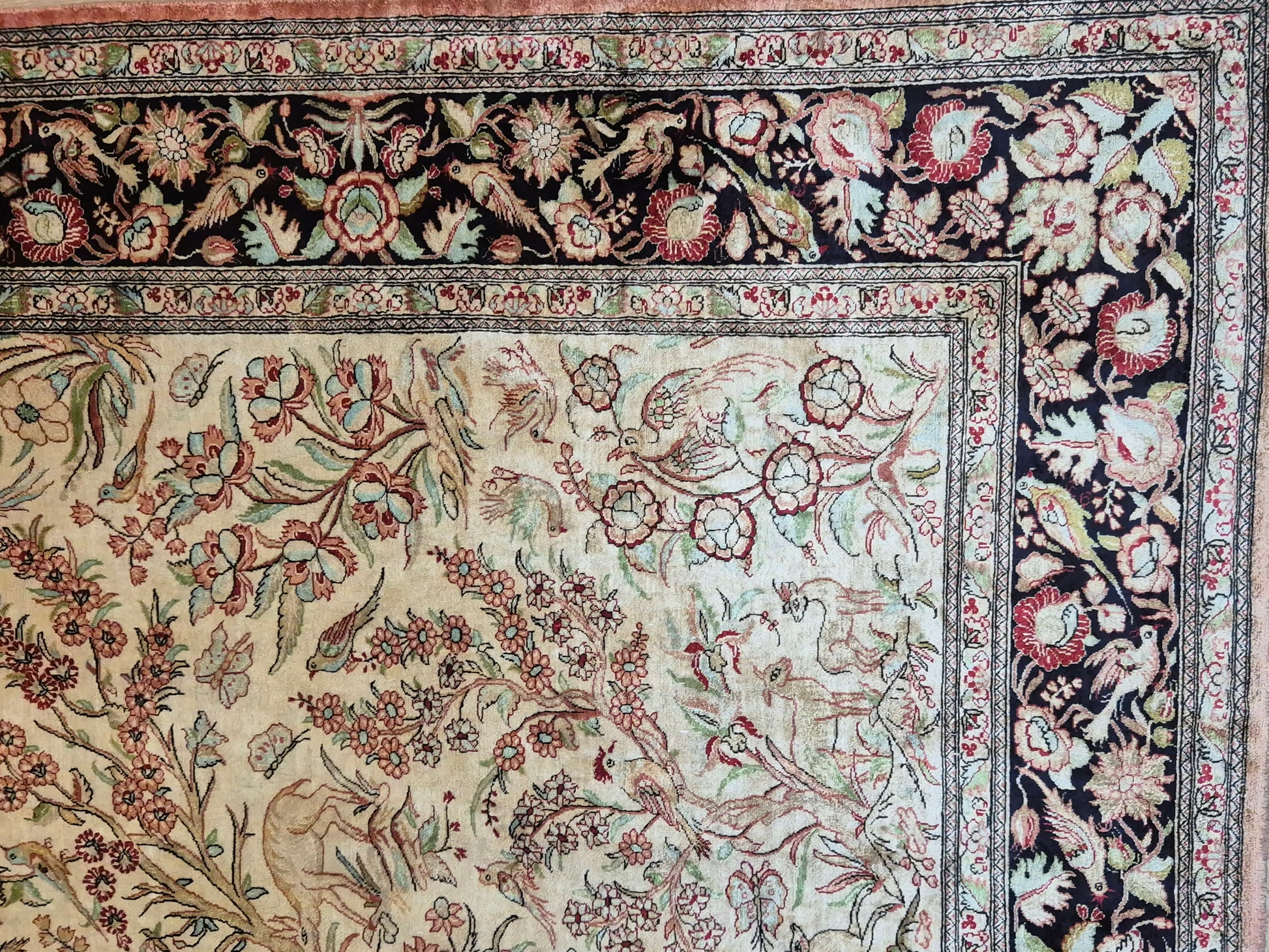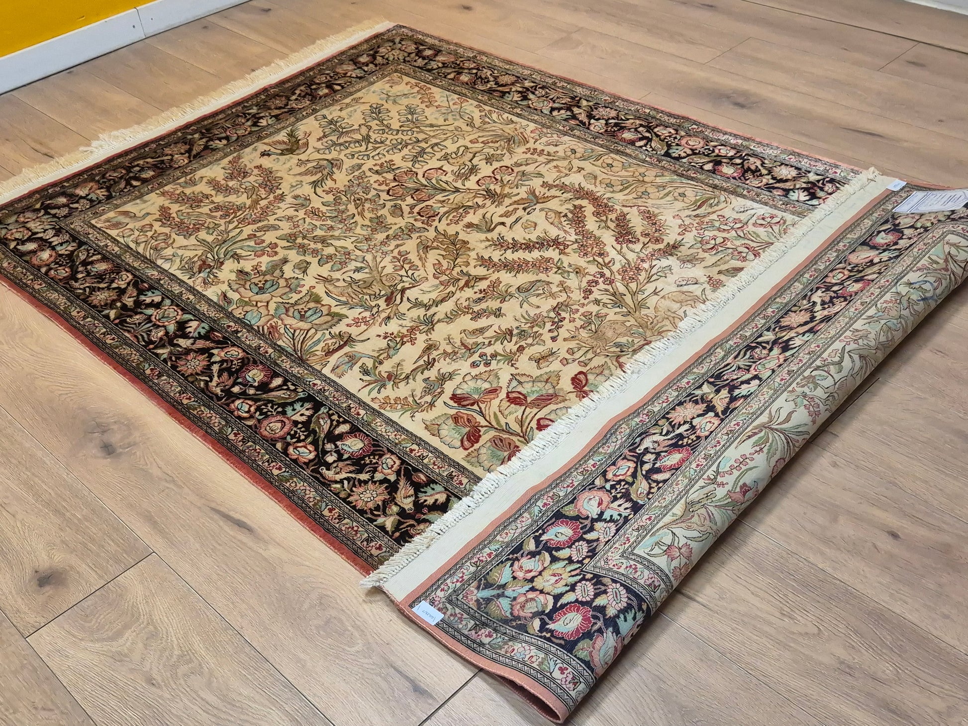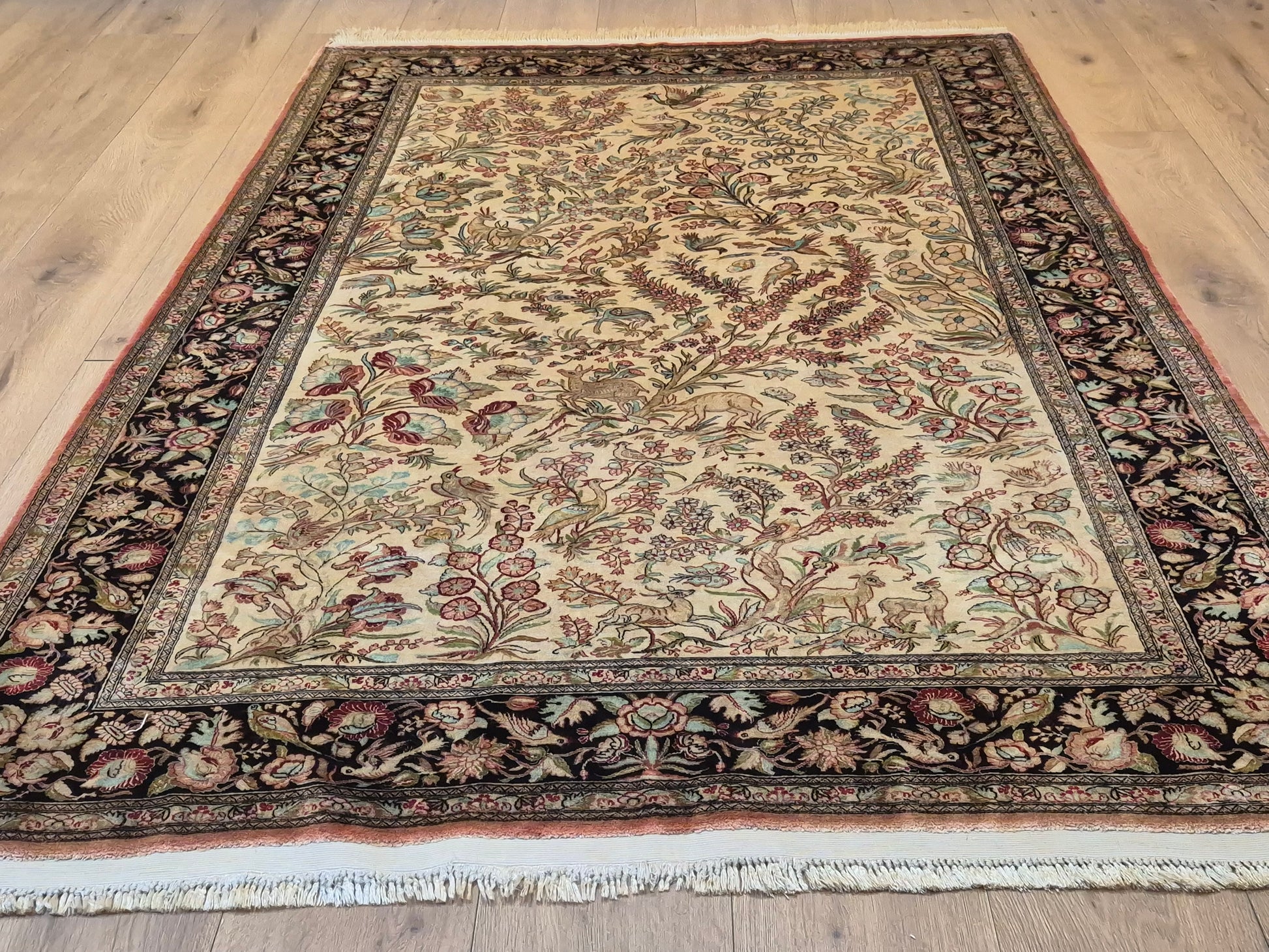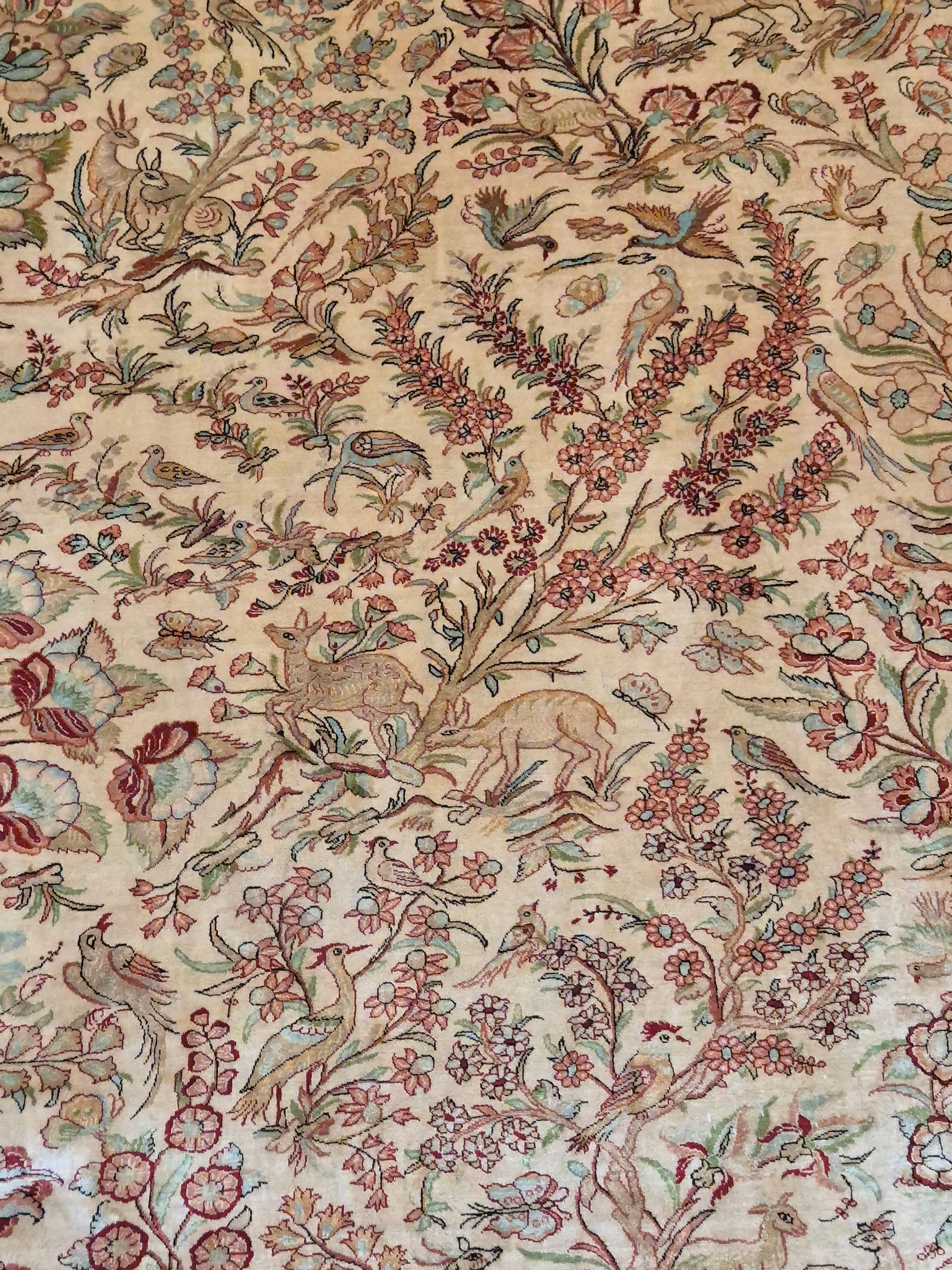 angeboten wird ein edler Ghom Teppich aus reiner Seide auf Seide, handgeknüpft in äußerst feiner Ausführung. Das Design zeigt ein Paradiesgarten-Motiv mit detailreich dargestellten Vögeln, blühenden Zweigen und zarten Ranken – kunstvoll arrangiert auf hellem Fond.