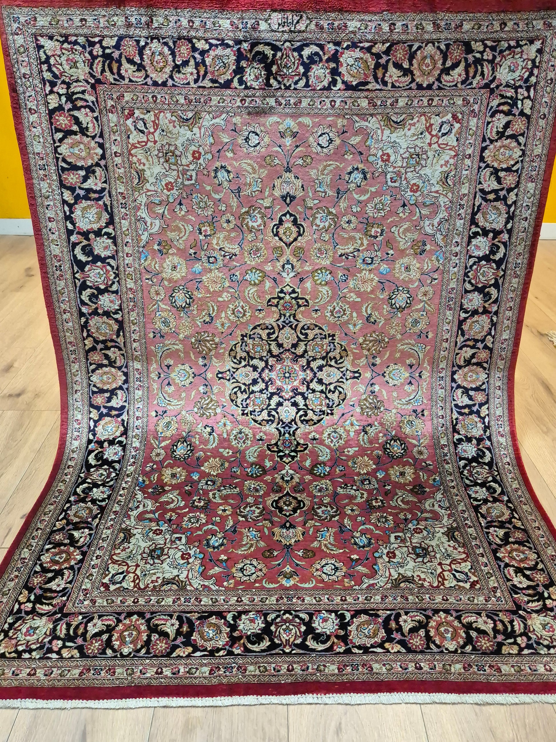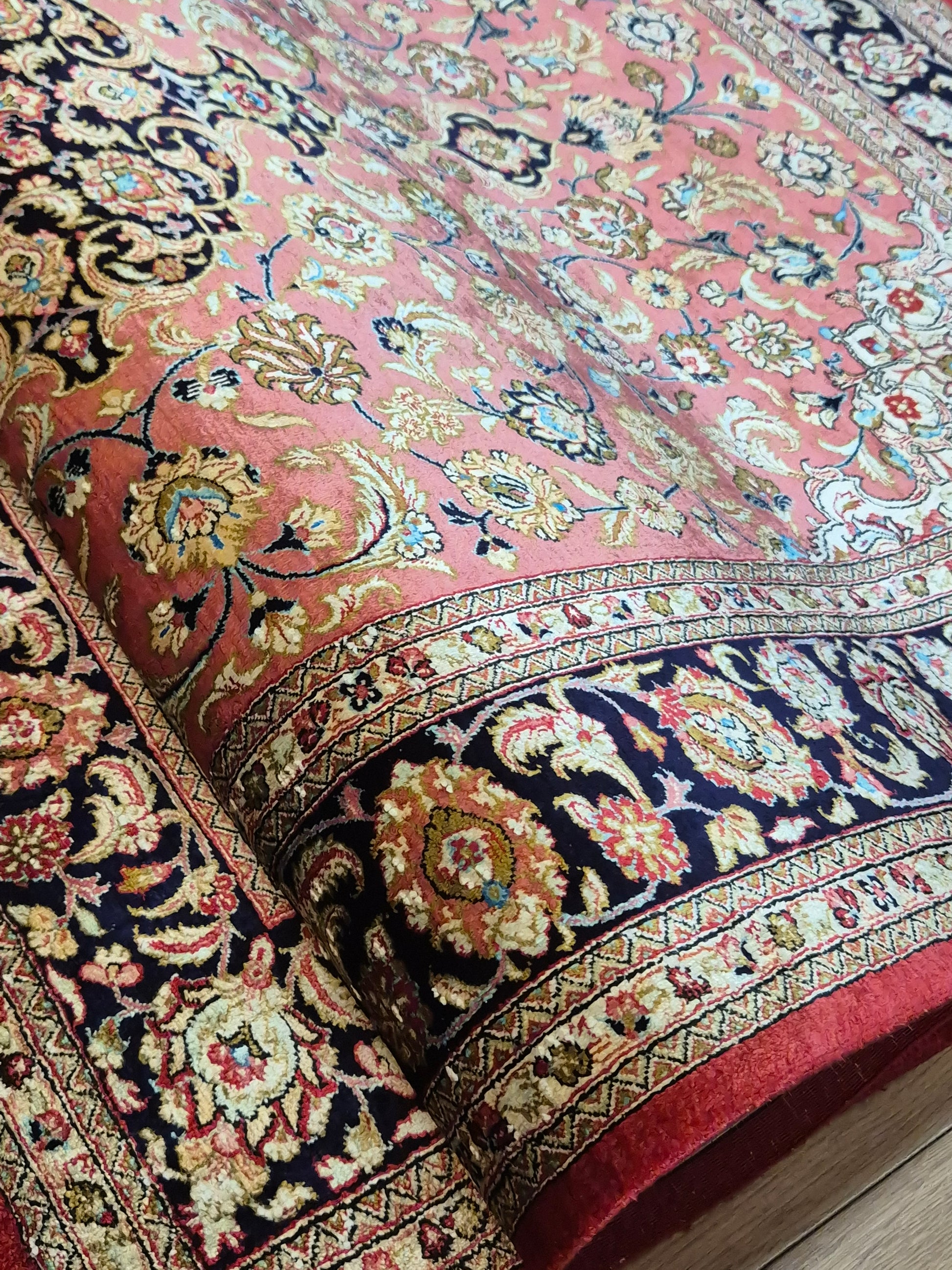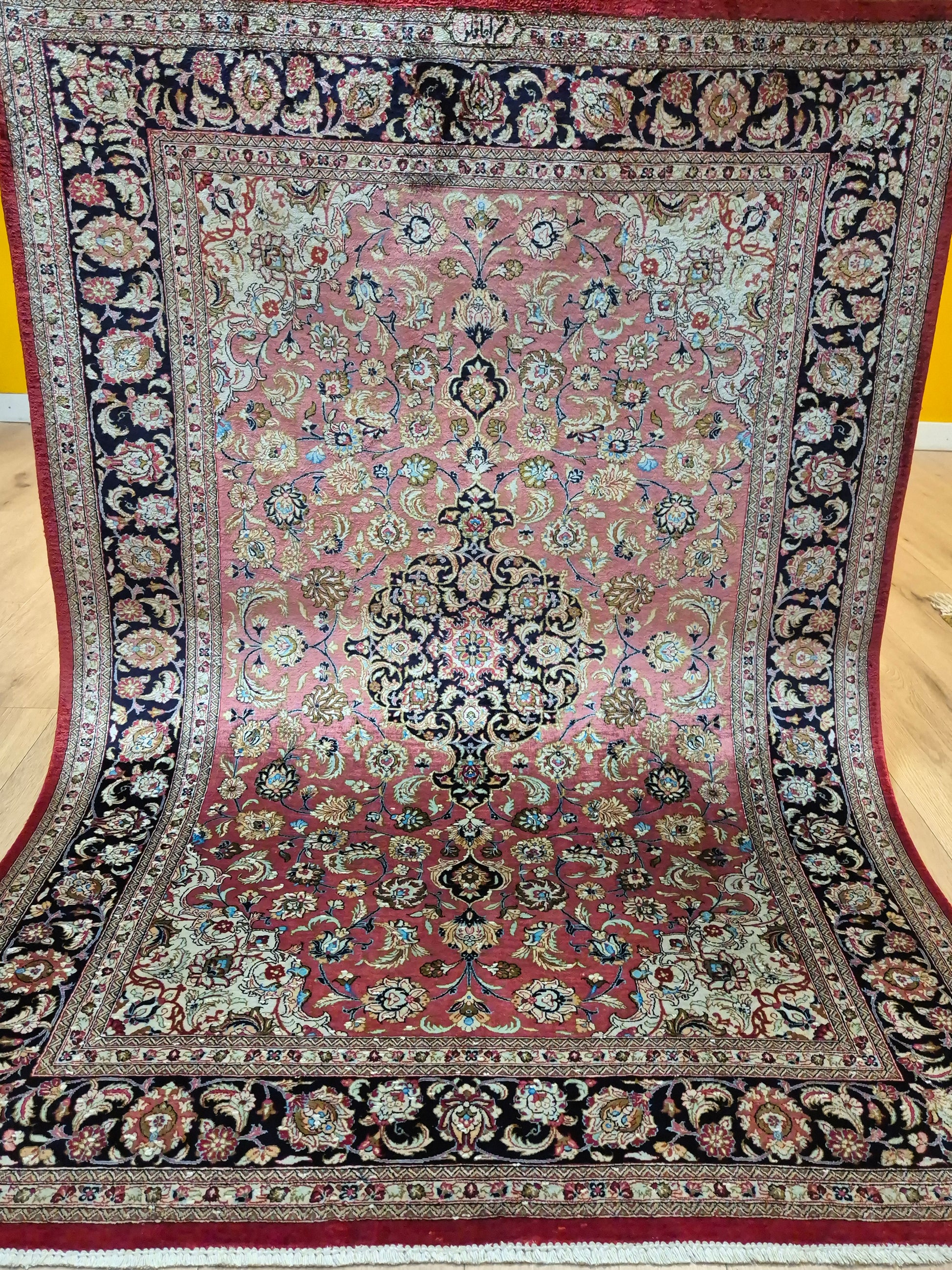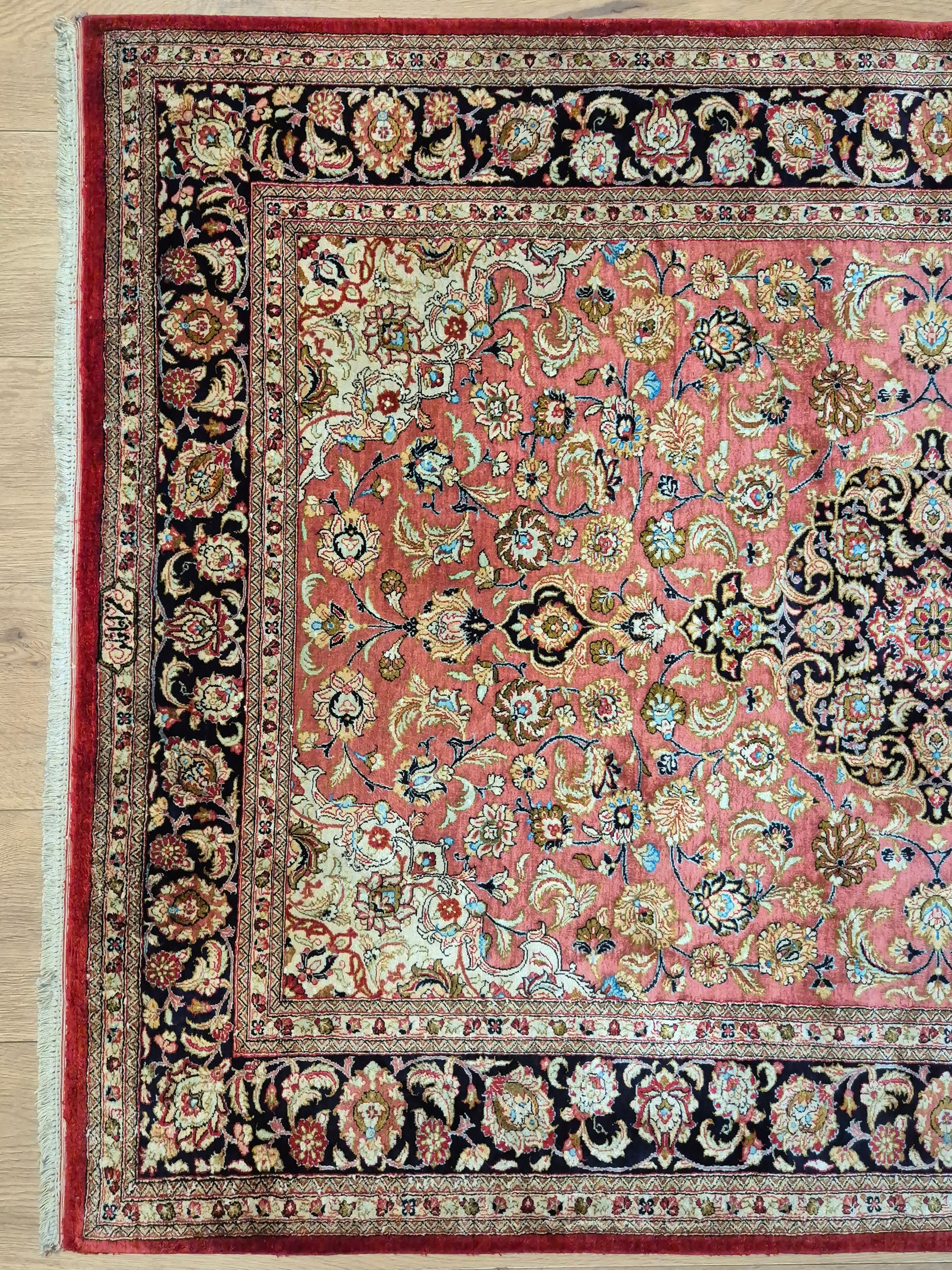 angeboten wird ein edler Ghom Teppich aus reiner Seide auf Seide, handgeknüpft in feiner Qualität. Der Teppich ist signiert und zeigt eine meisterhafte Ausführung klassischer floraler Ornamente. Im Zentrum befindet sich ein Medaillon auf korallenrotem Fond, das von filigranen Blütenranken, Arabesken und Palmetten umspielt wird. Die Bordüre in Dunkelblau rahmt das kunstvolle Design harmonisch ein und betont den luxuriösen Seidenglanz.