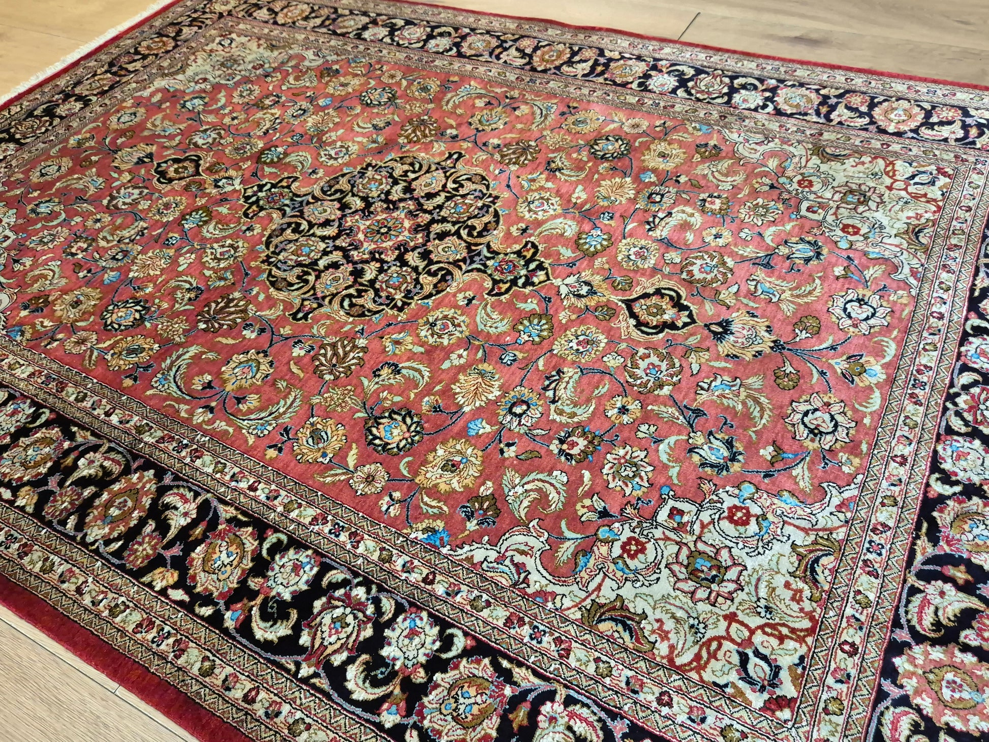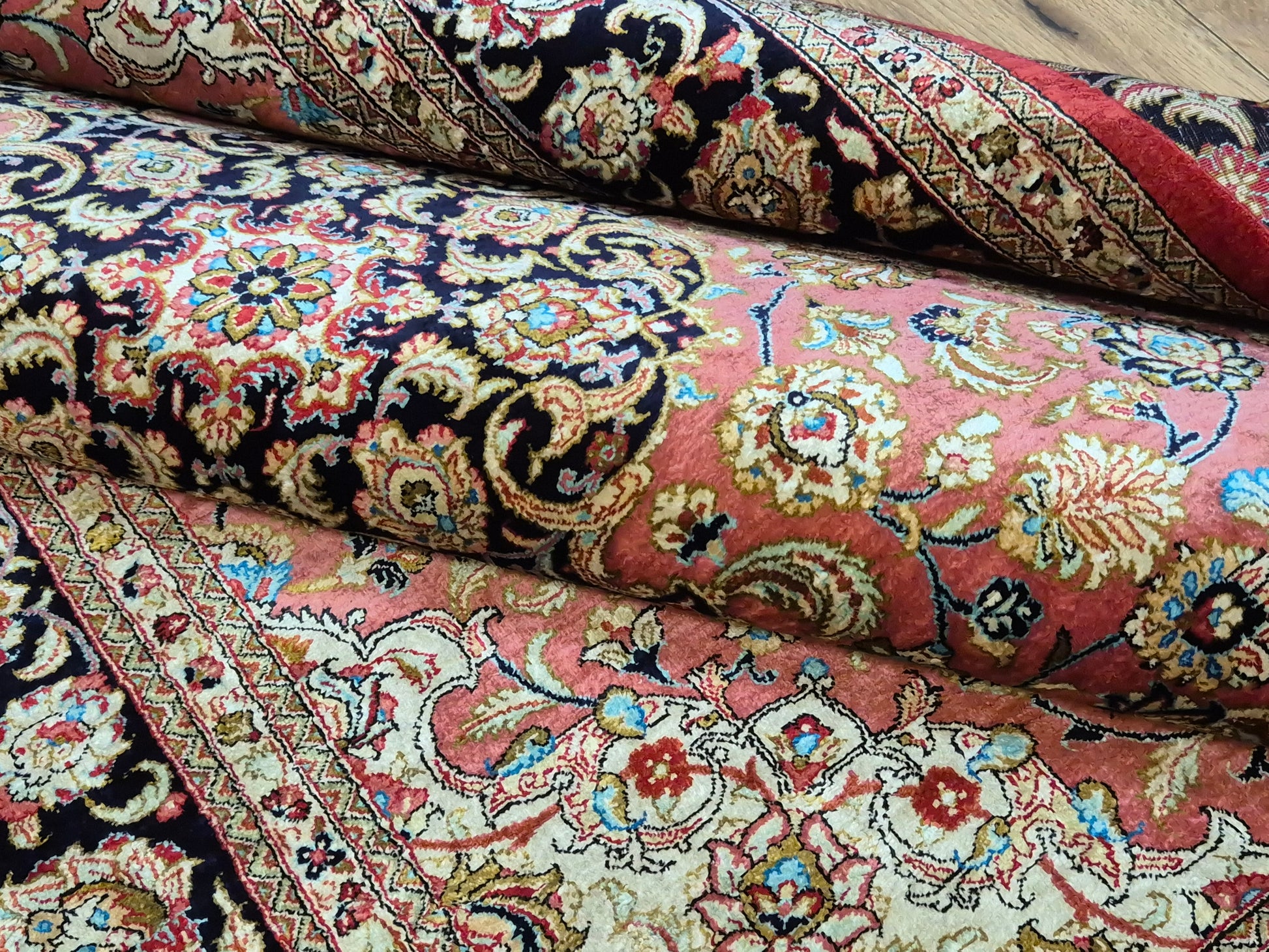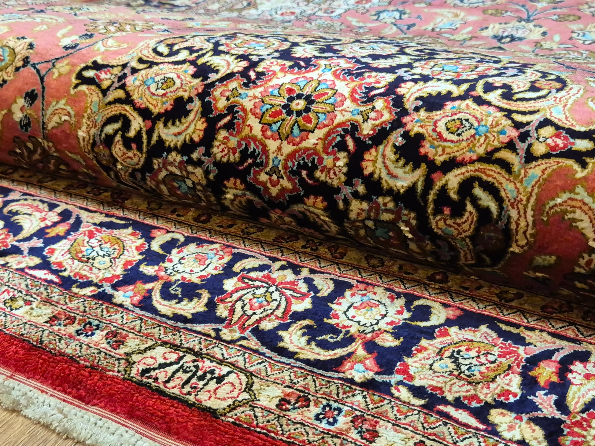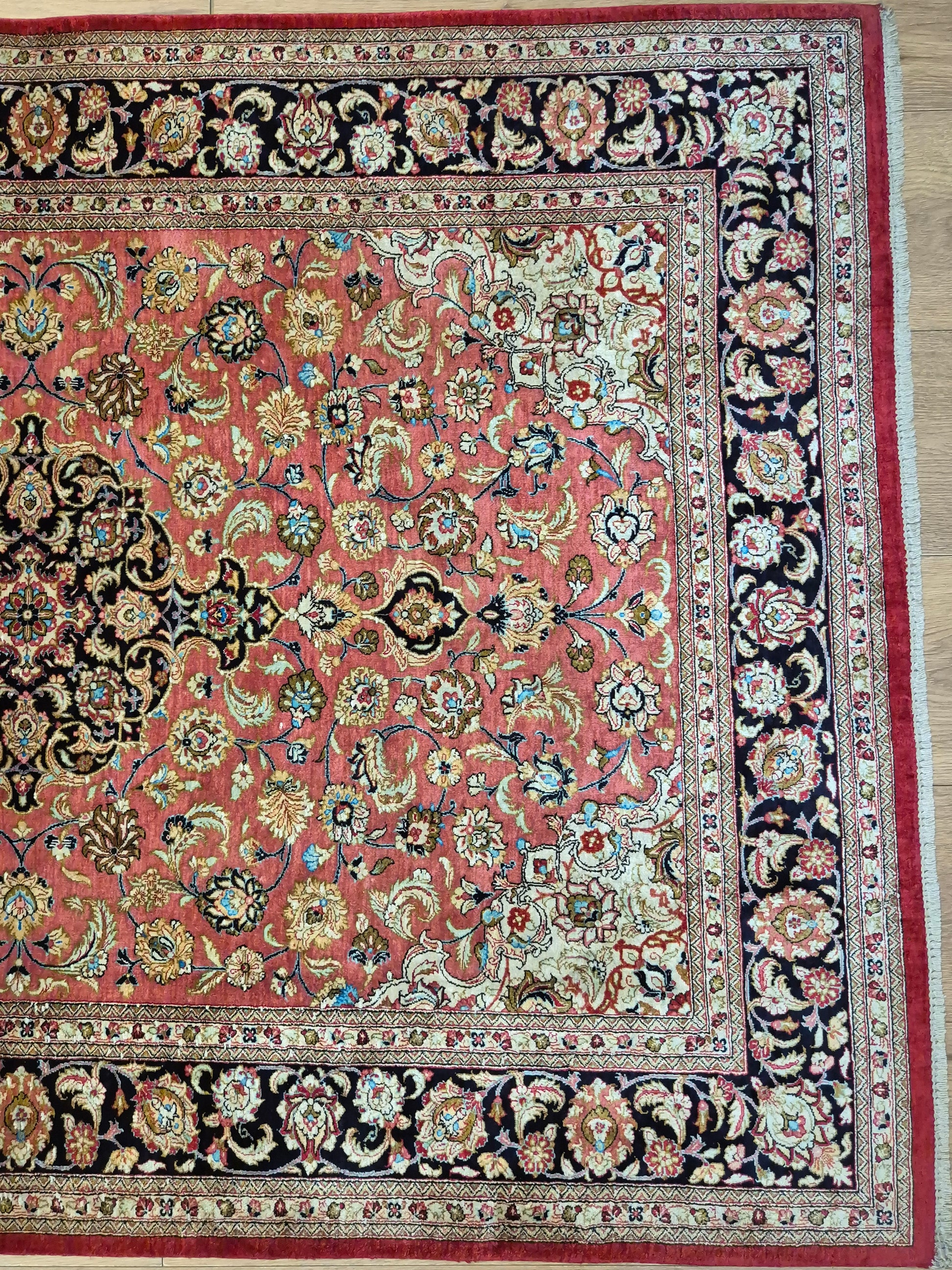 angeboten wird ein edler Ghom Teppich aus reiner Seide auf Seide, handgeknüpft in feiner Qualität. Der Teppich ist signiert und zeigt eine meisterhafte Ausführung klassischer floraler Ornamente. Im Zentrum befindet sich ein Medaillon auf korallenrotem Fond, das von filigranen Blütenranken, Arabesken und Palmetten umspielt wird. Die Bordüre in Dunkelblau rahmt das kunstvolle Design harmonisch ein und betont den luxuriösen Seidenglanz.