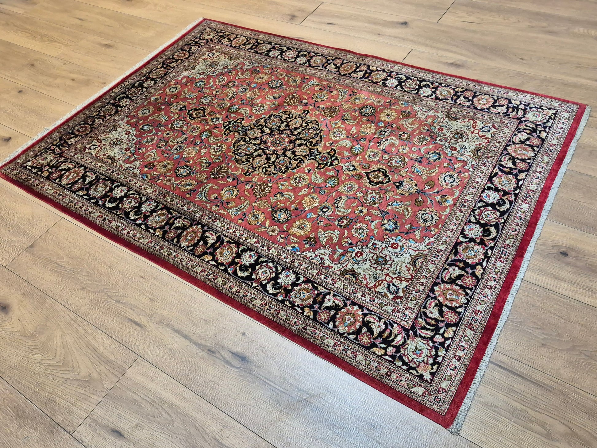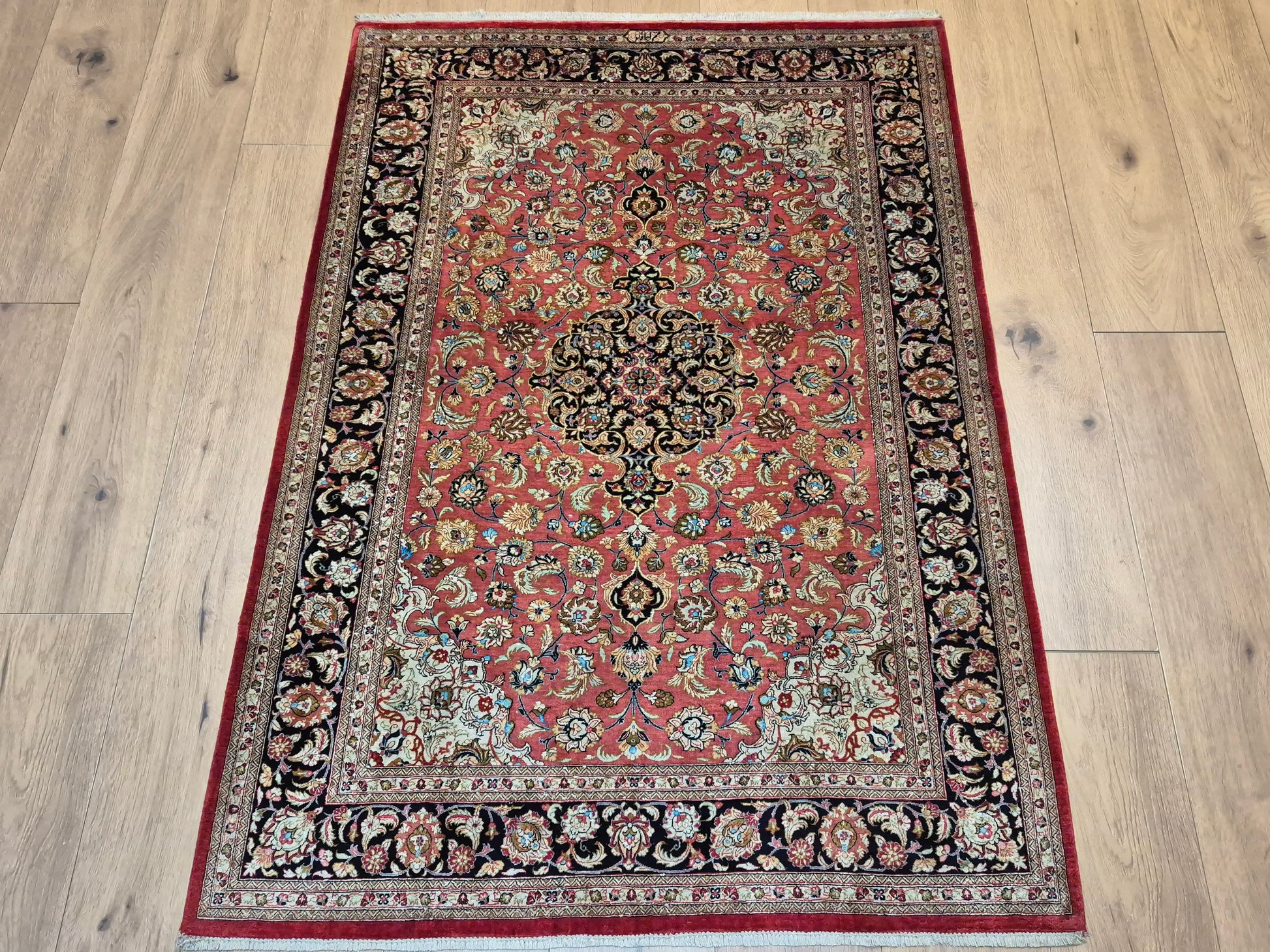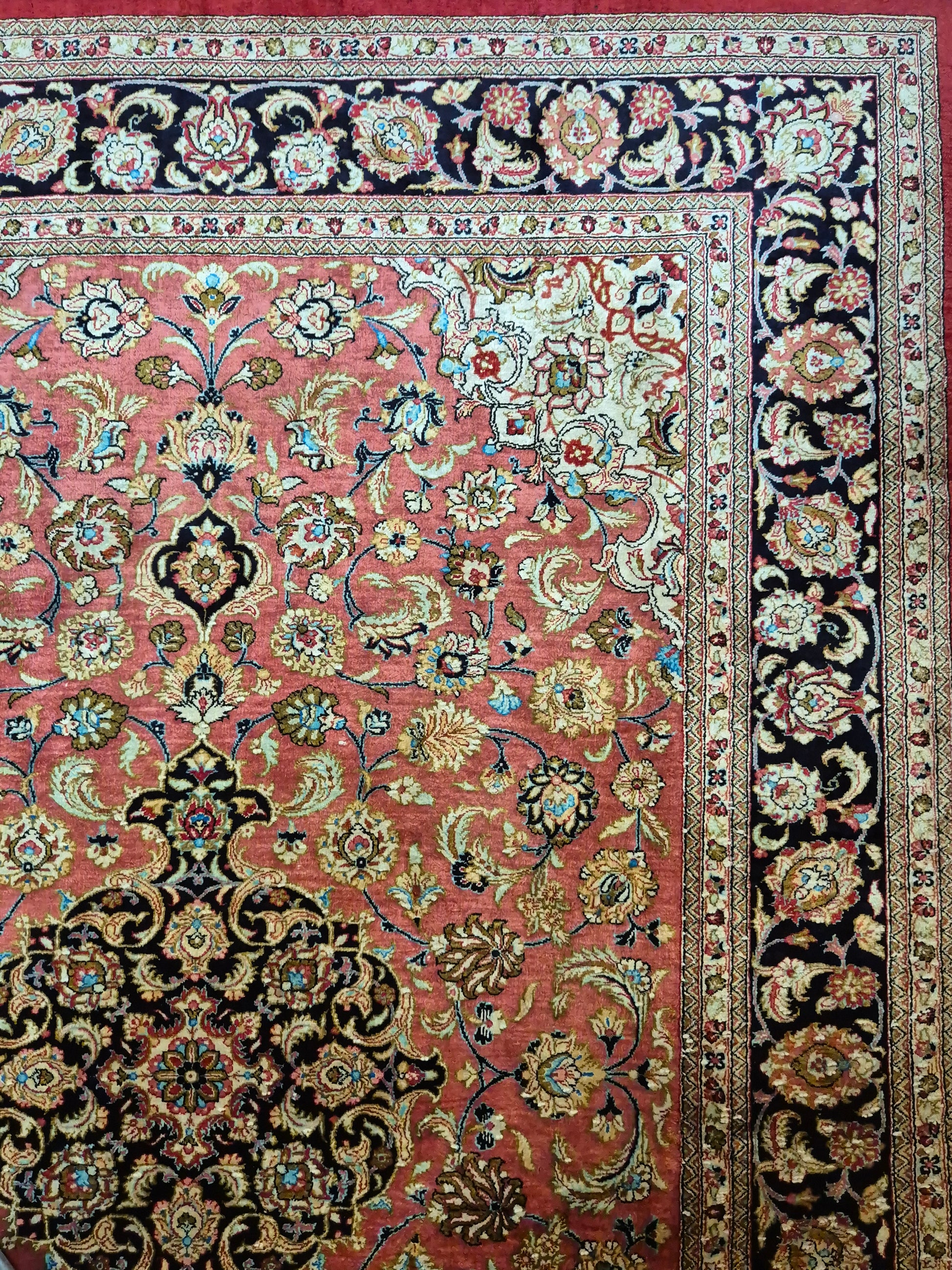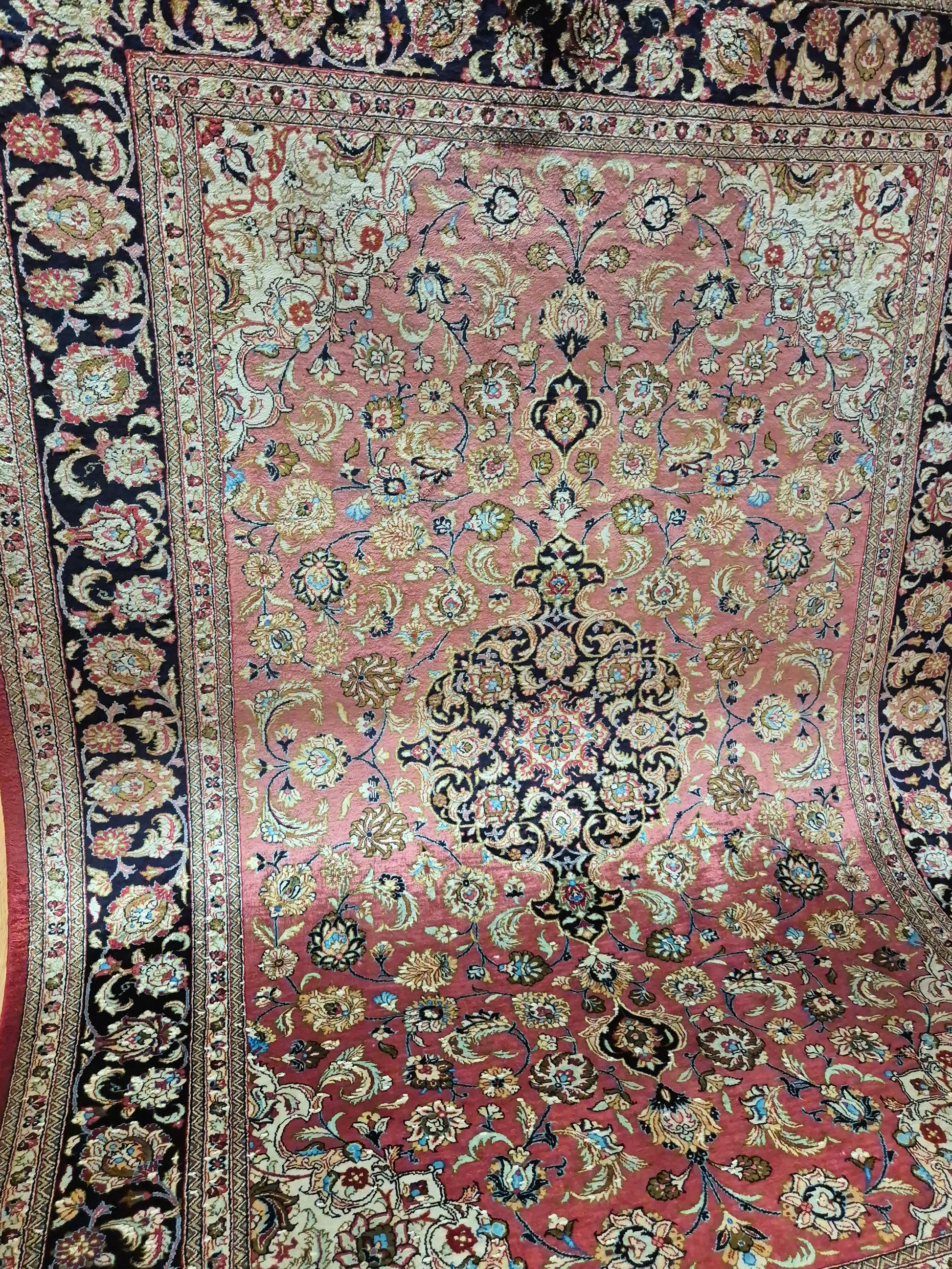 angeboten wird ein edler Ghom Teppich aus reiner Seide auf Seide, handgeknüpft in feiner Qualität. Der Teppich ist signiert und zeigt eine meisterhafte Ausführung klassischer floraler Ornamente. Im Zentrum befindet sich ein Medaillon auf korallenrotem Fond, das von filigranen Blütenranken, Arabesken und Palmetten umspielt wird. Die Bordüre in Dunkelblau rahmt das kunstvolle Design harmonisch ein und betont den luxuriösen Seidenglanz.