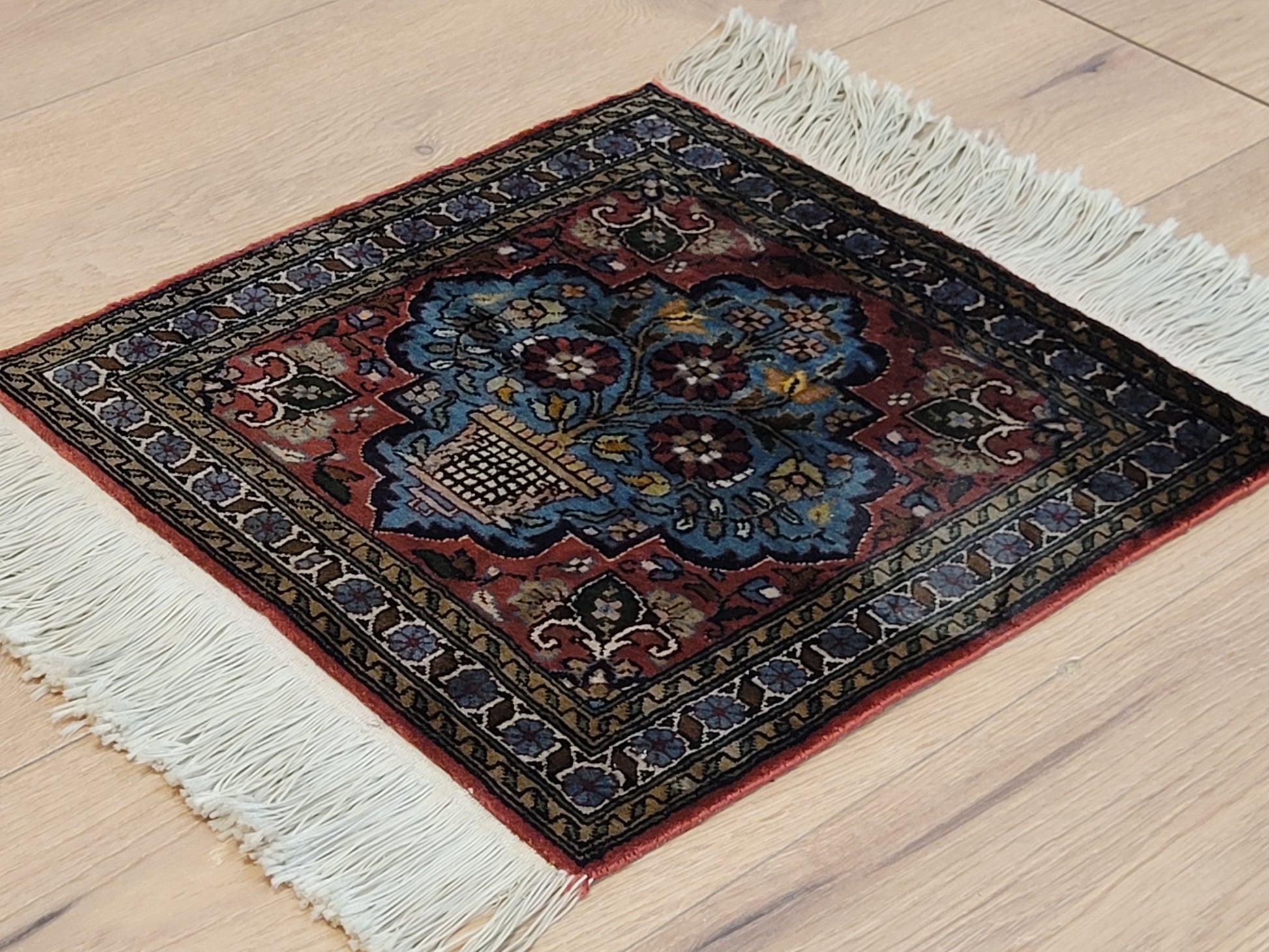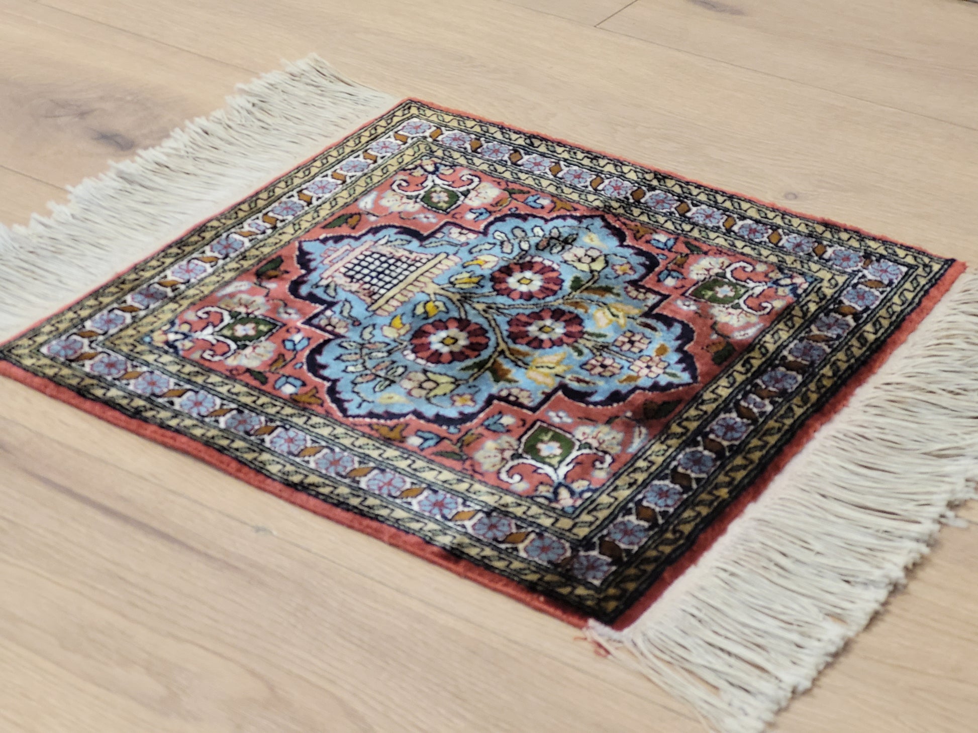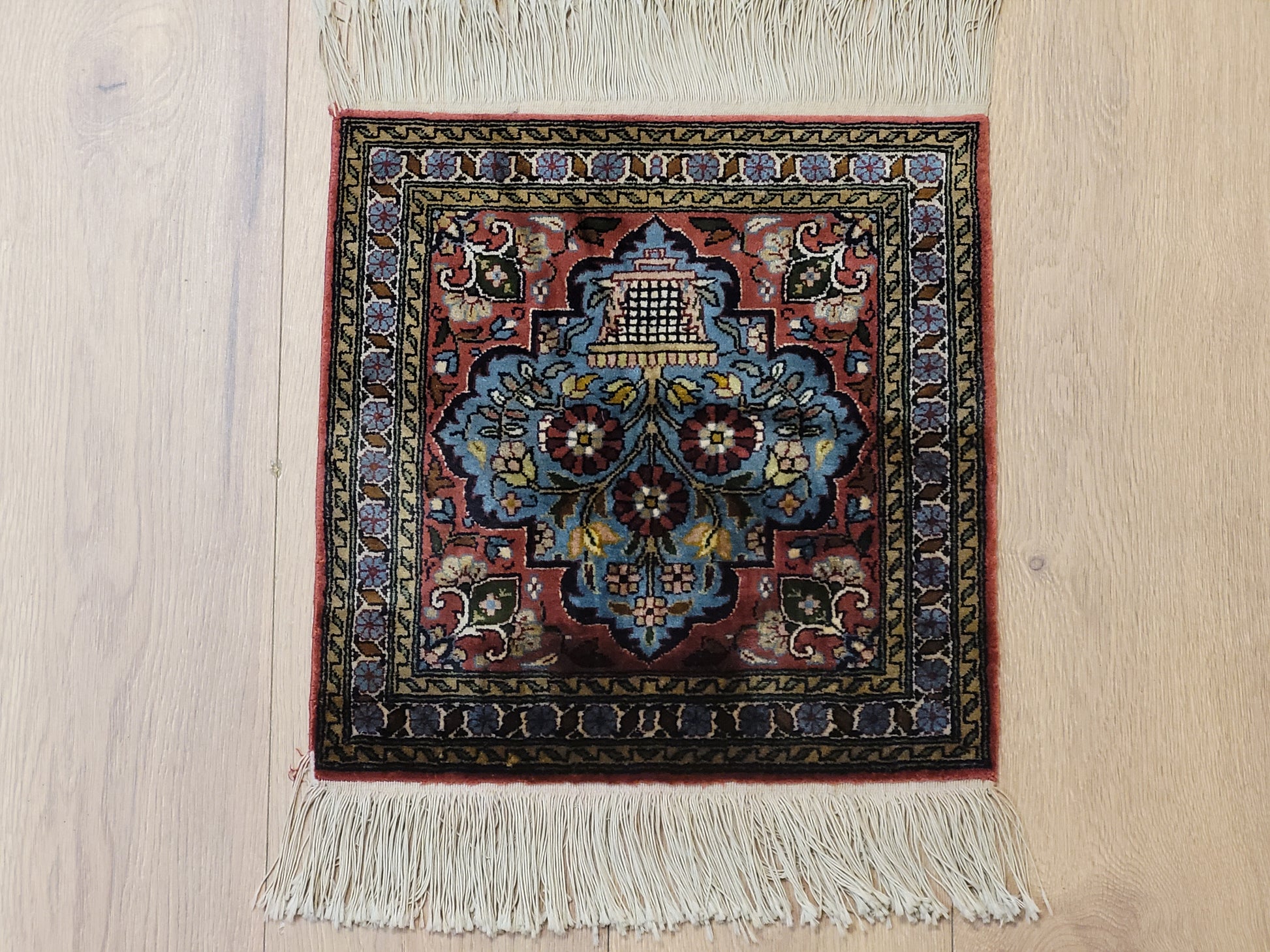 angeboten wird ein besonders feiner Ghom Teppich aus reiner Seide, handgeknüpft im Miniaturformat. Das quadratische Design zeigt ein kunstvoll gestaltetes Medaillon mit floralen Blütenmotiven, eingerahmt von einer filigranen Bordüre. Durch die hochwertige Seide entsteht ein edler Glanz, der die Farben lebendig und brillant wirken lässt. Dieses Stück eignet sich hervorragend als dekoratives Sammlerobjekt oder repräsentativer Wandbehang.