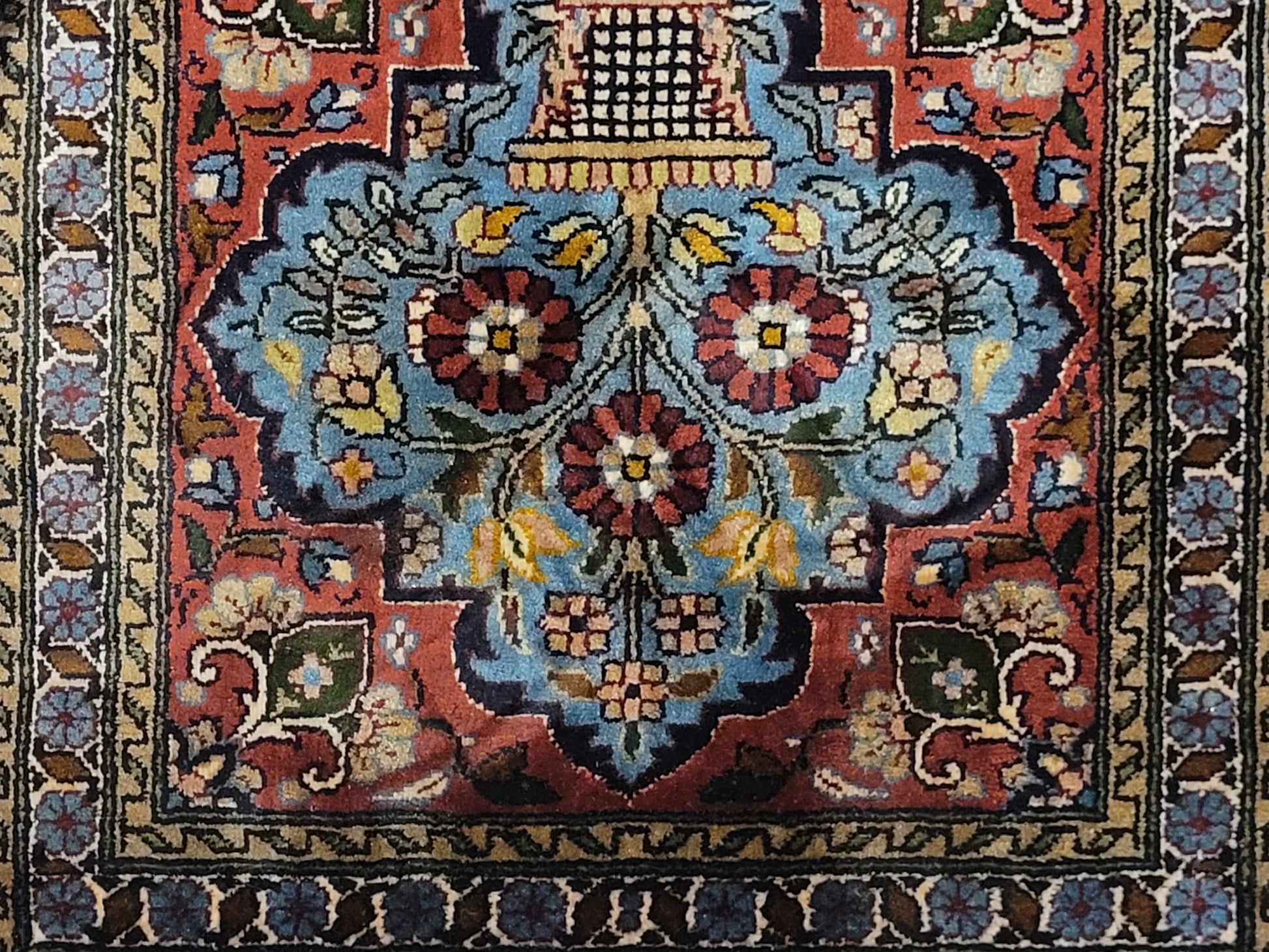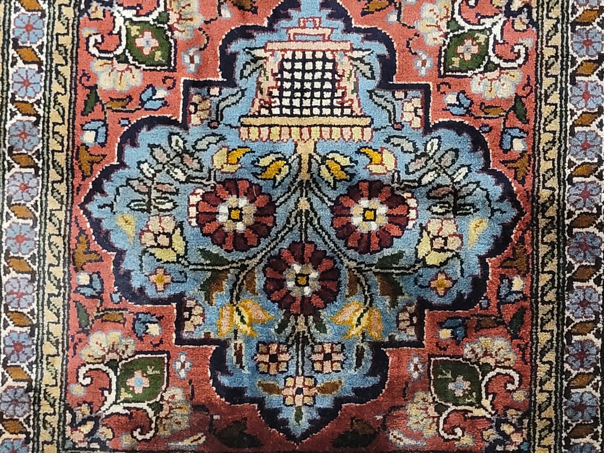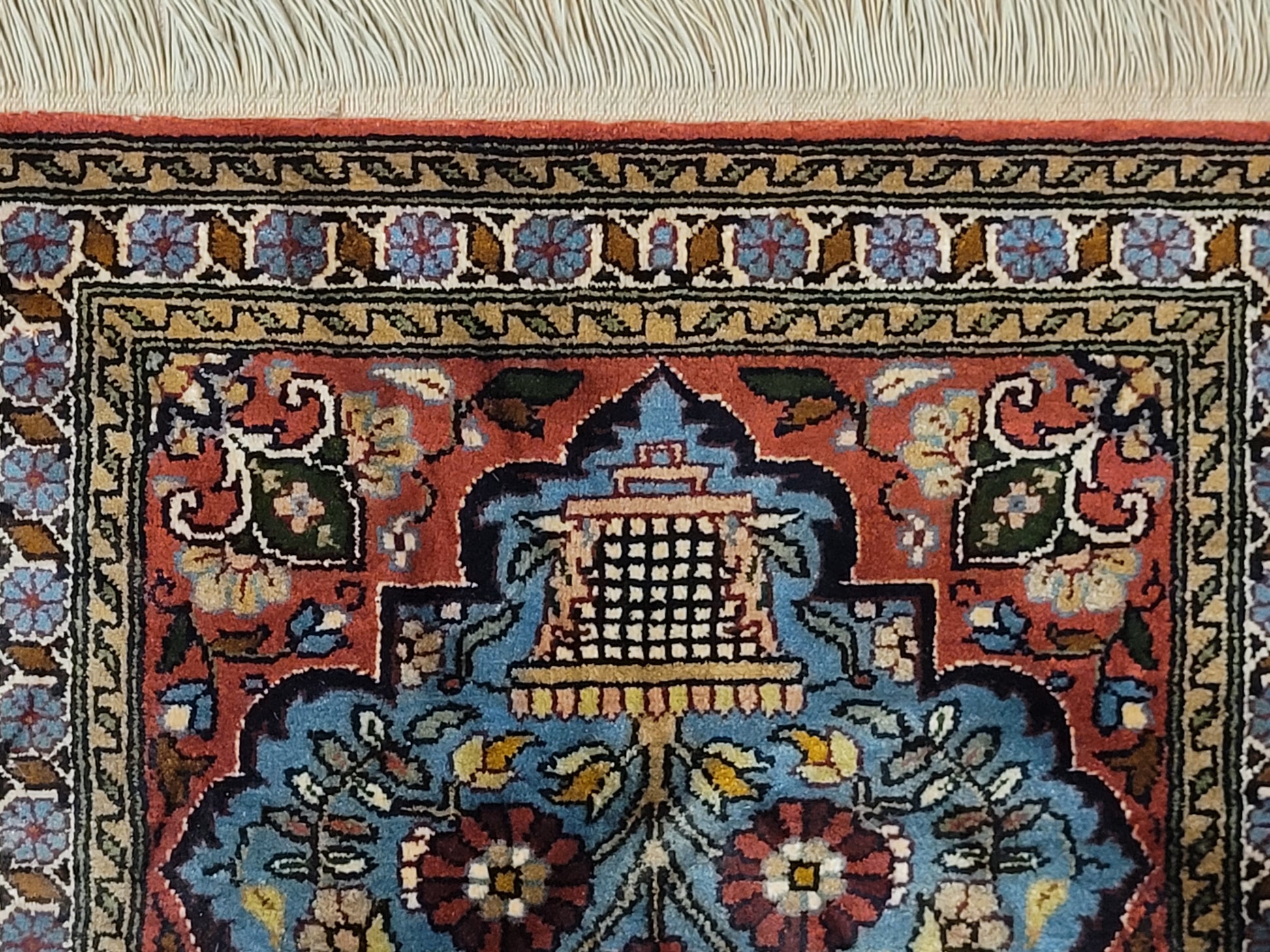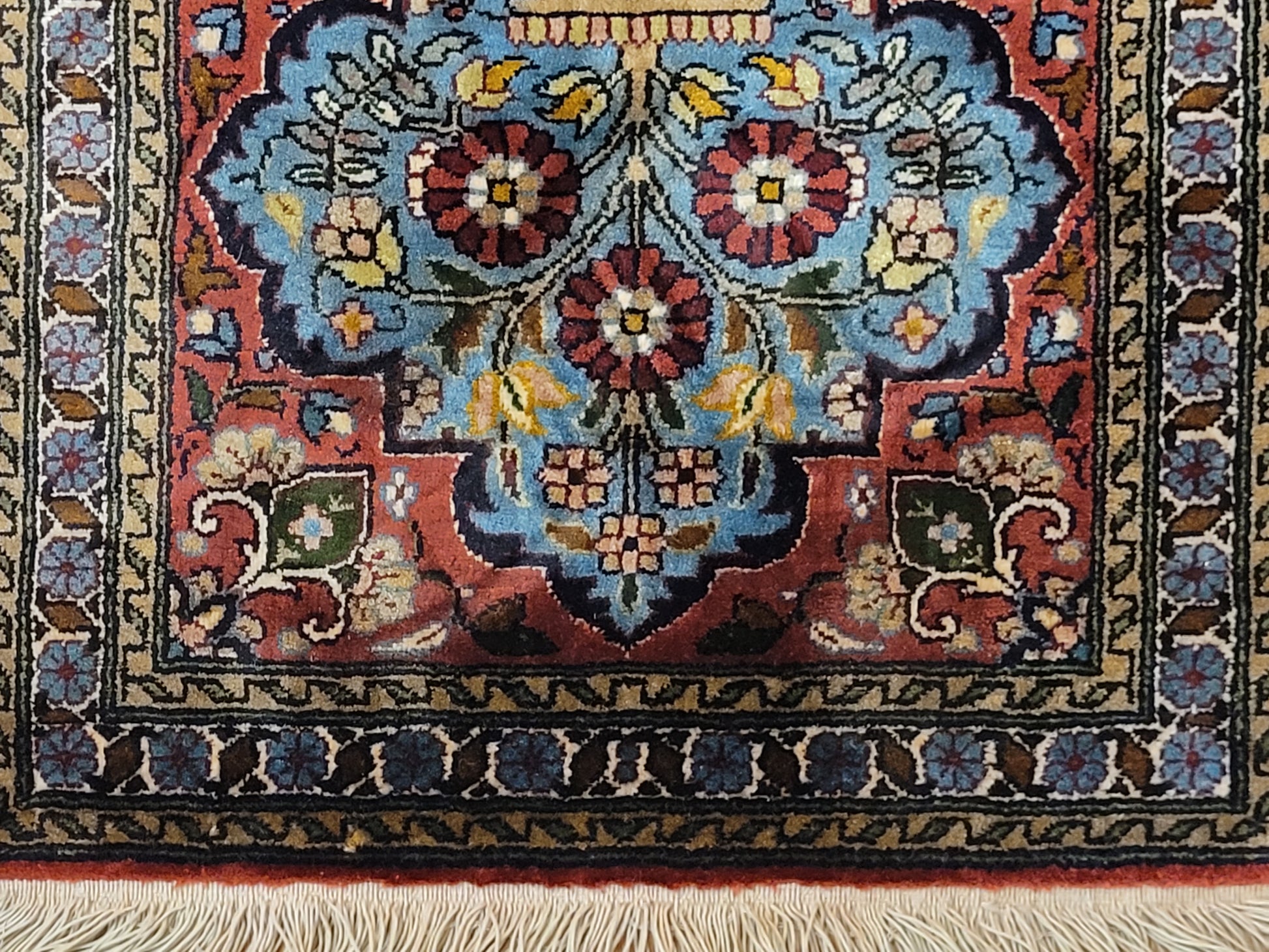 angeboten wird ein besonders feiner Ghom Teppich aus reiner Seide, handgeknüpft im Miniaturformat. Das quadratische Design zeigt ein kunstvoll gestaltetes Medaillon mit floralen Blütenmotiven, eingerahmt von einer filigranen Bordüre. Durch die hochwertige Seide entsteht ein edler Glanz, der die Farben lebendig und brillant wirken lässt. Dieses Stück eignet sich hervorragend als dekoratives Sammlerobjekt oder repräsentativer Wandbehang.