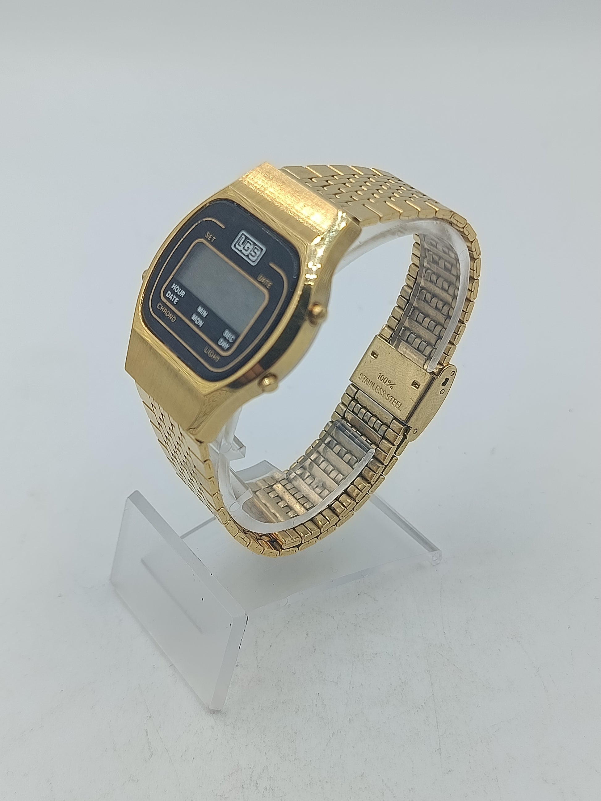 Diese stilvolle Digitaluhr im Vintage-Look überzeugt durch ihr goldfarbenes Gehäuse und das passende Metallarmband. Das schwarze Display mit klarer Anzeige verleiht der Uhr einen authentischen Retro-Charakter, der an klassische Digitaluhren erinnert. Dank der übersichtlichen Funktionen wie Uhrzeit, Datum, Chrono und Licht ist sie alltagstauglich und zugleich ein echter Blickfang. Ideal für Liebhaber zeitloser Designs mit nostalgischem Flair.