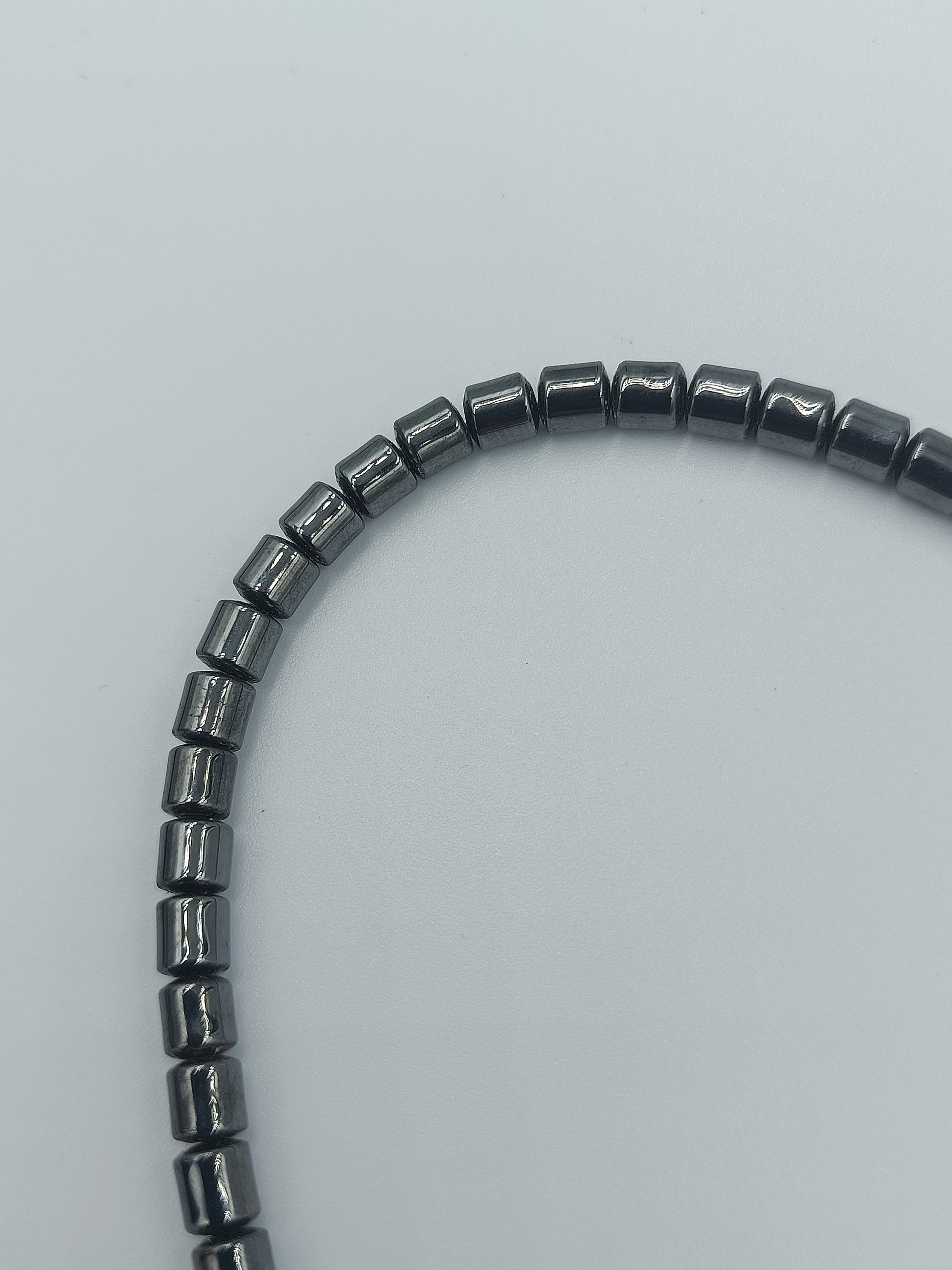 Elegante Halskette aus glänzenden Hämatitwürfeln kombiniert mit cremefarbenen Perlenimitaten und einem zentralen, facettierten Hämatit-Stein. Ein dezenter Strassring in der Mitte sorgt für einen Hauch von Glanz. Die Kette ist schlicht, aber edel – ideal für den Alltag oder als elegantes Accessoire.