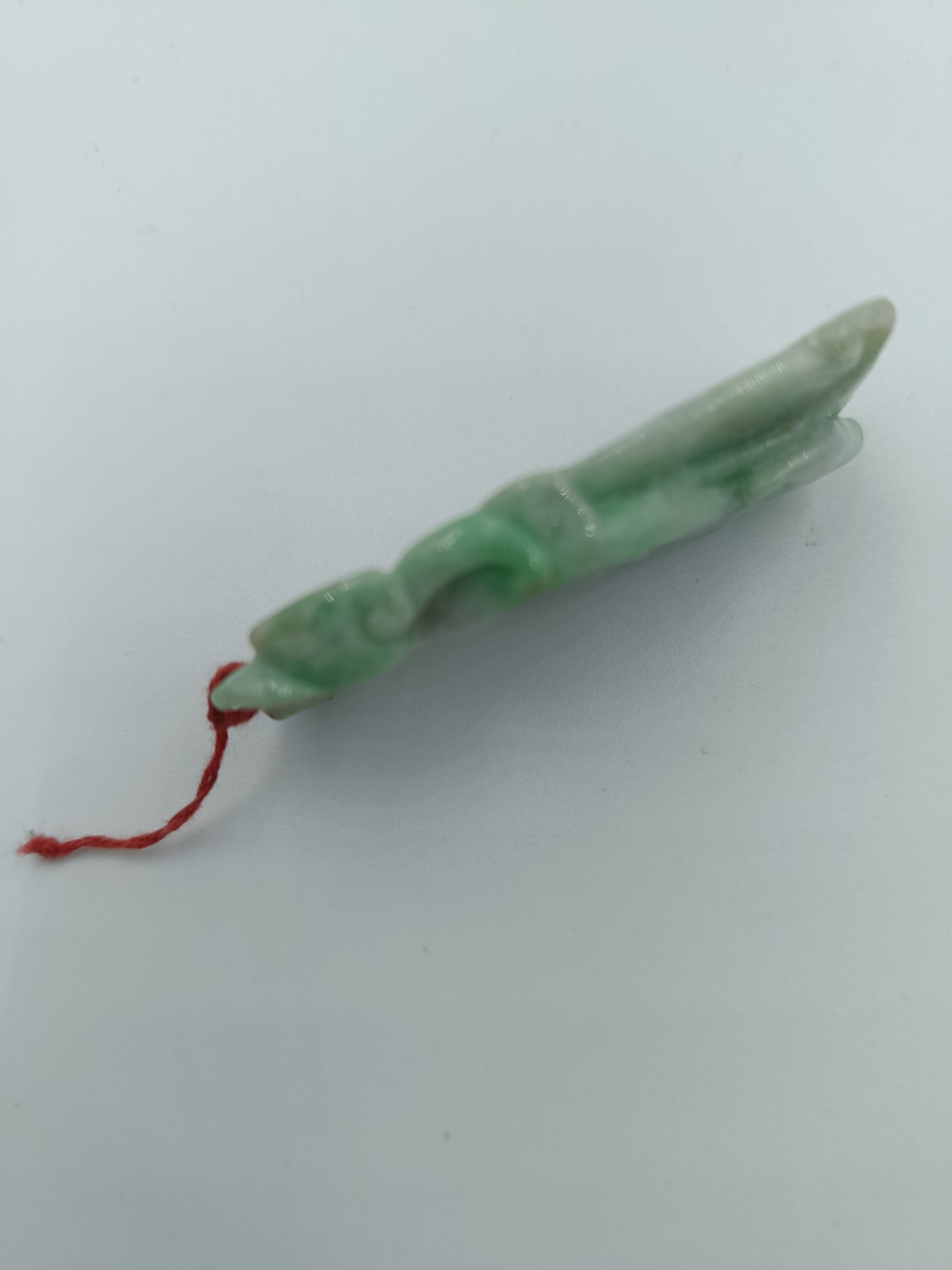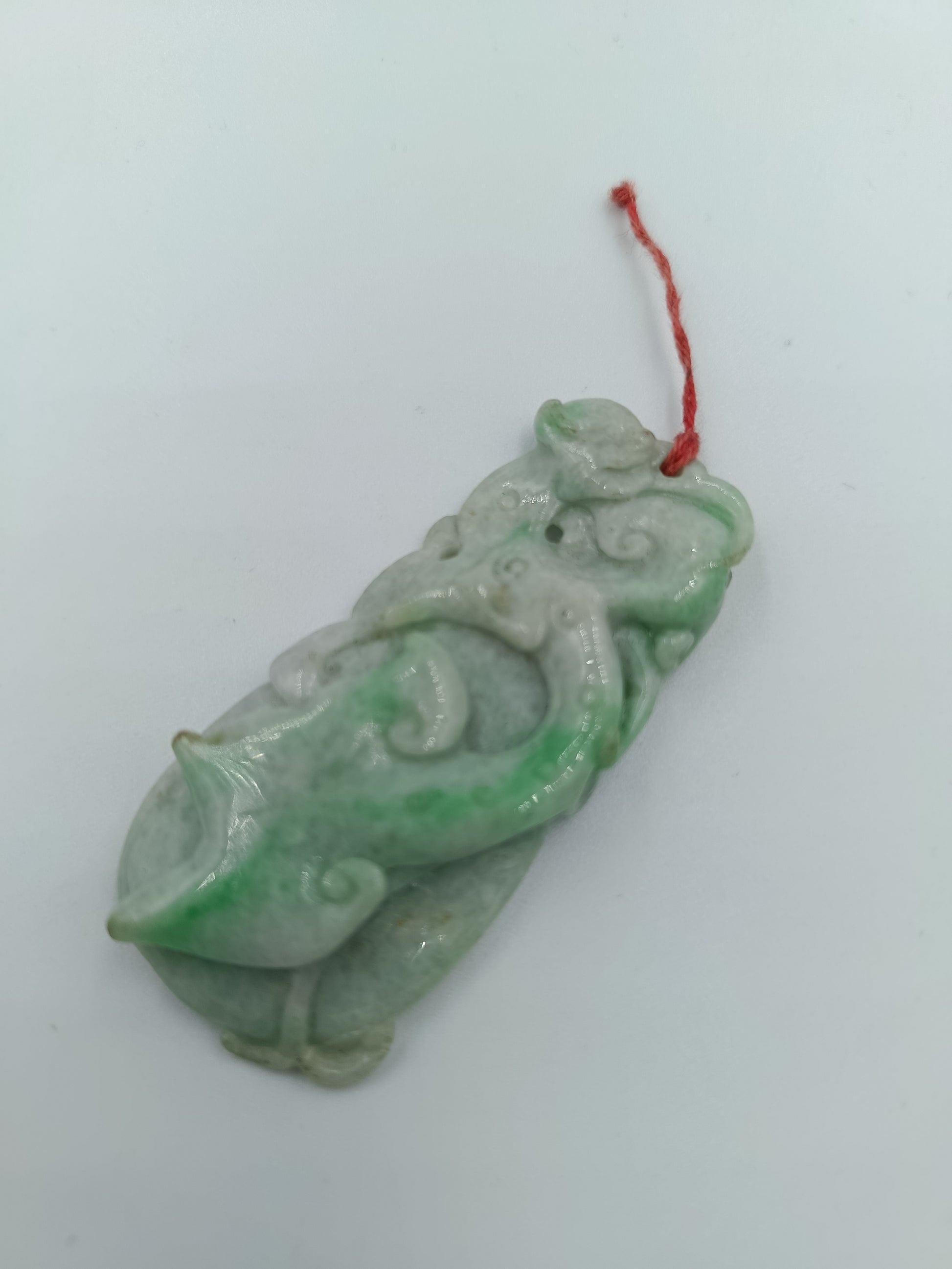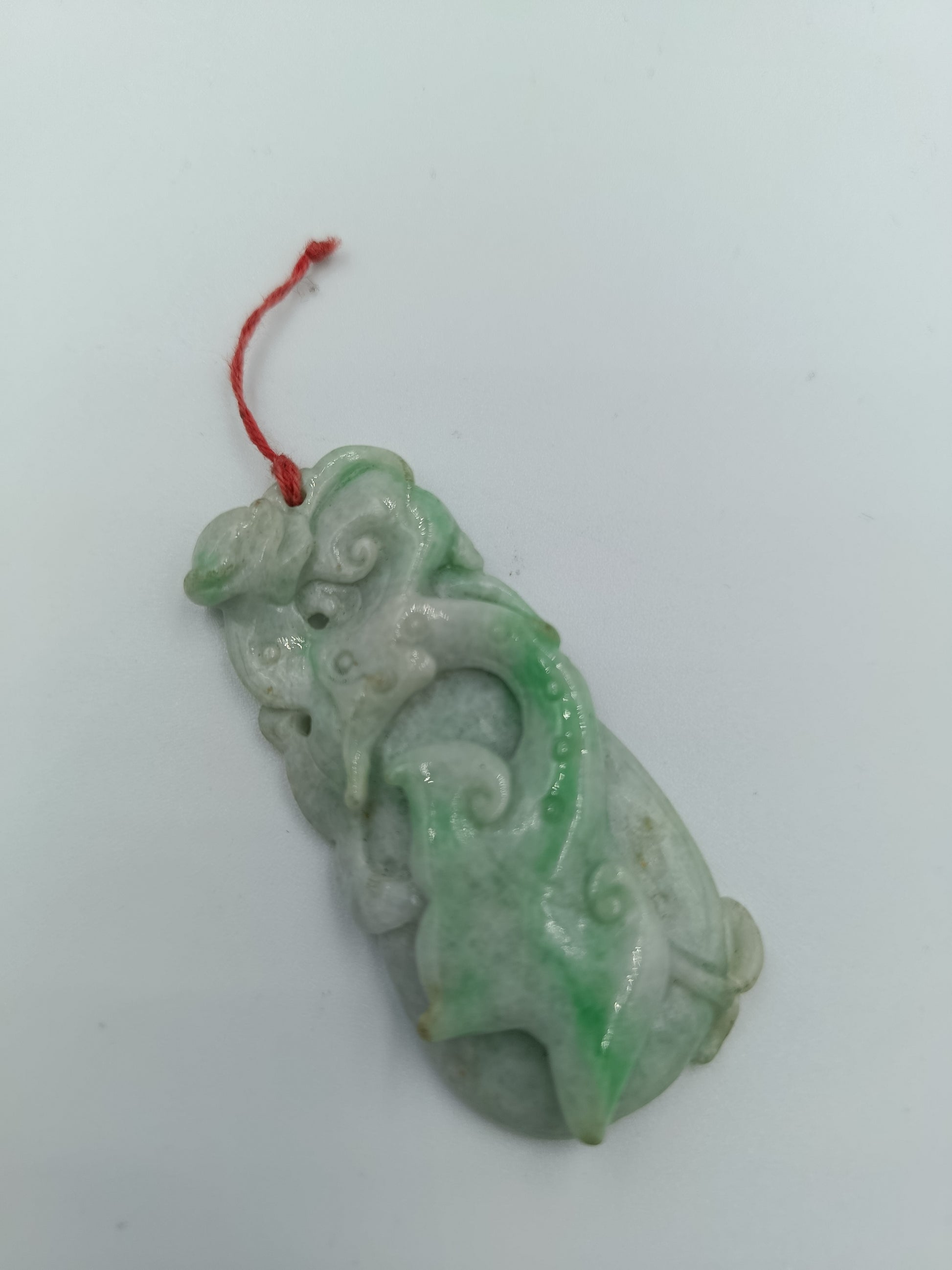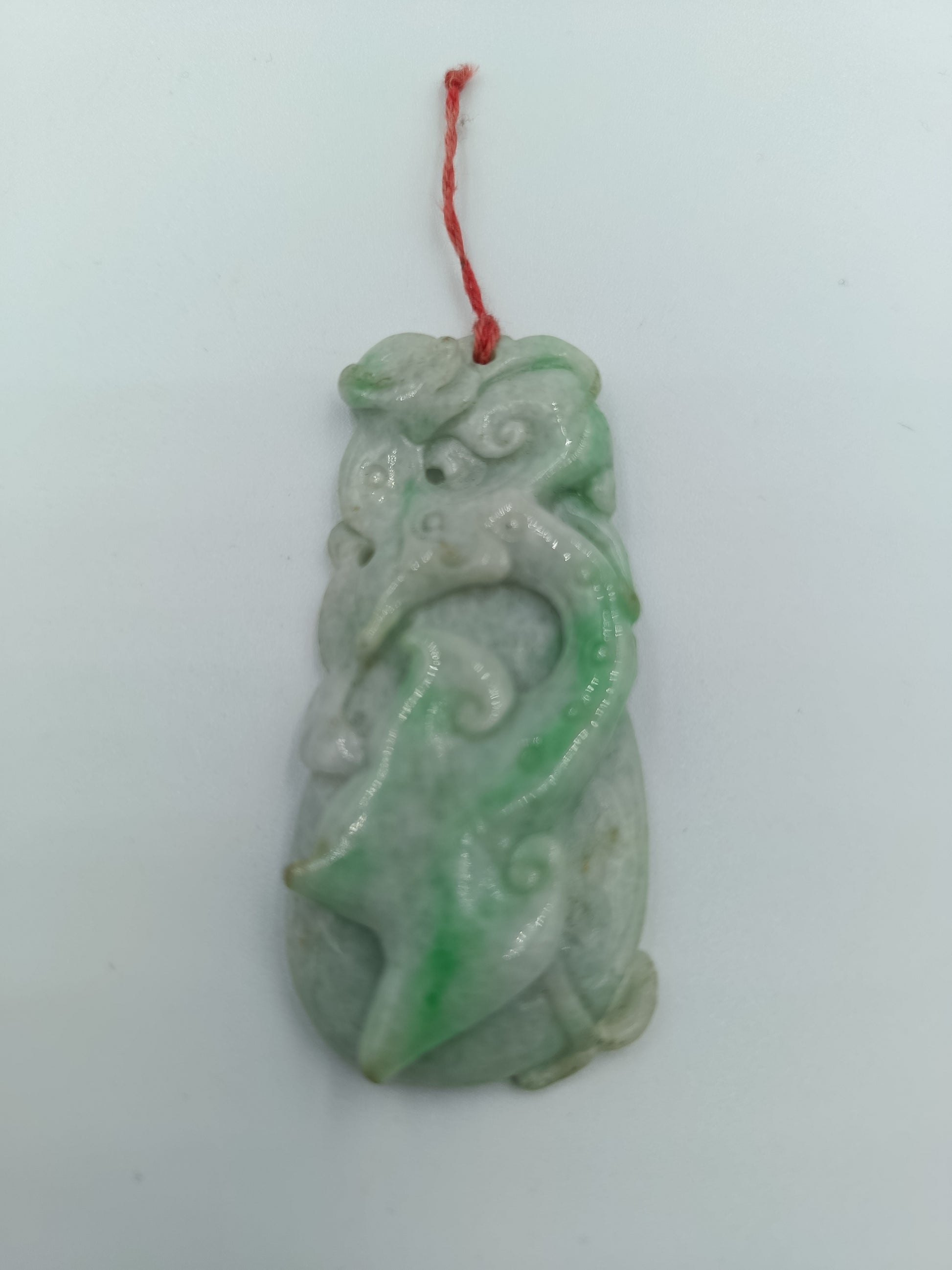 Wunderschöner, handgeschnitzter Anhänger aus grünem Jadestein. Das Motiv zeigt einen stilisierten Drachen oder ein mythisches Tier, kunstvoll in Relief gearbeitet. Ein echtes Statement-Piece – traditionell, symbolträchtig und voller Charakter.