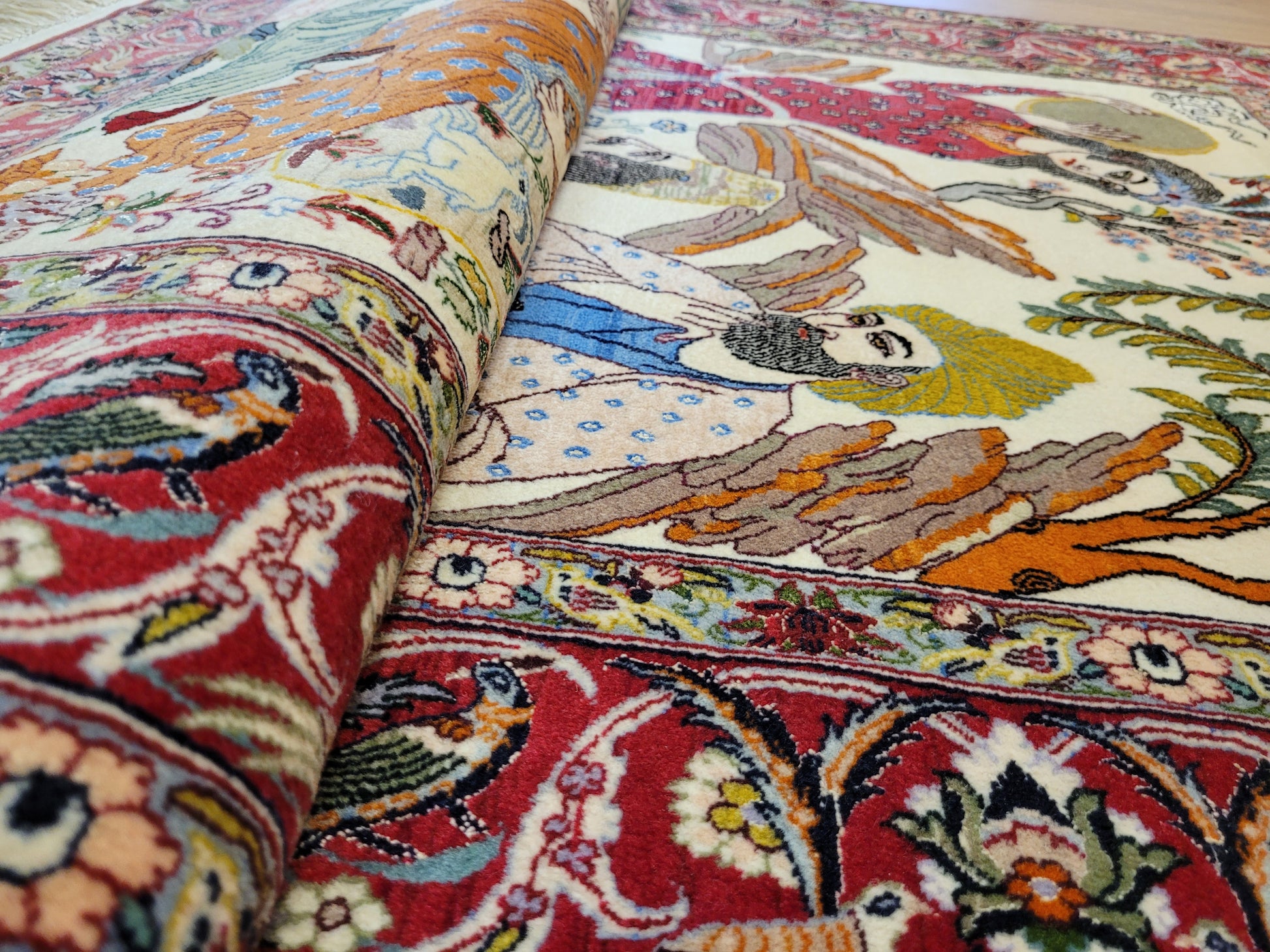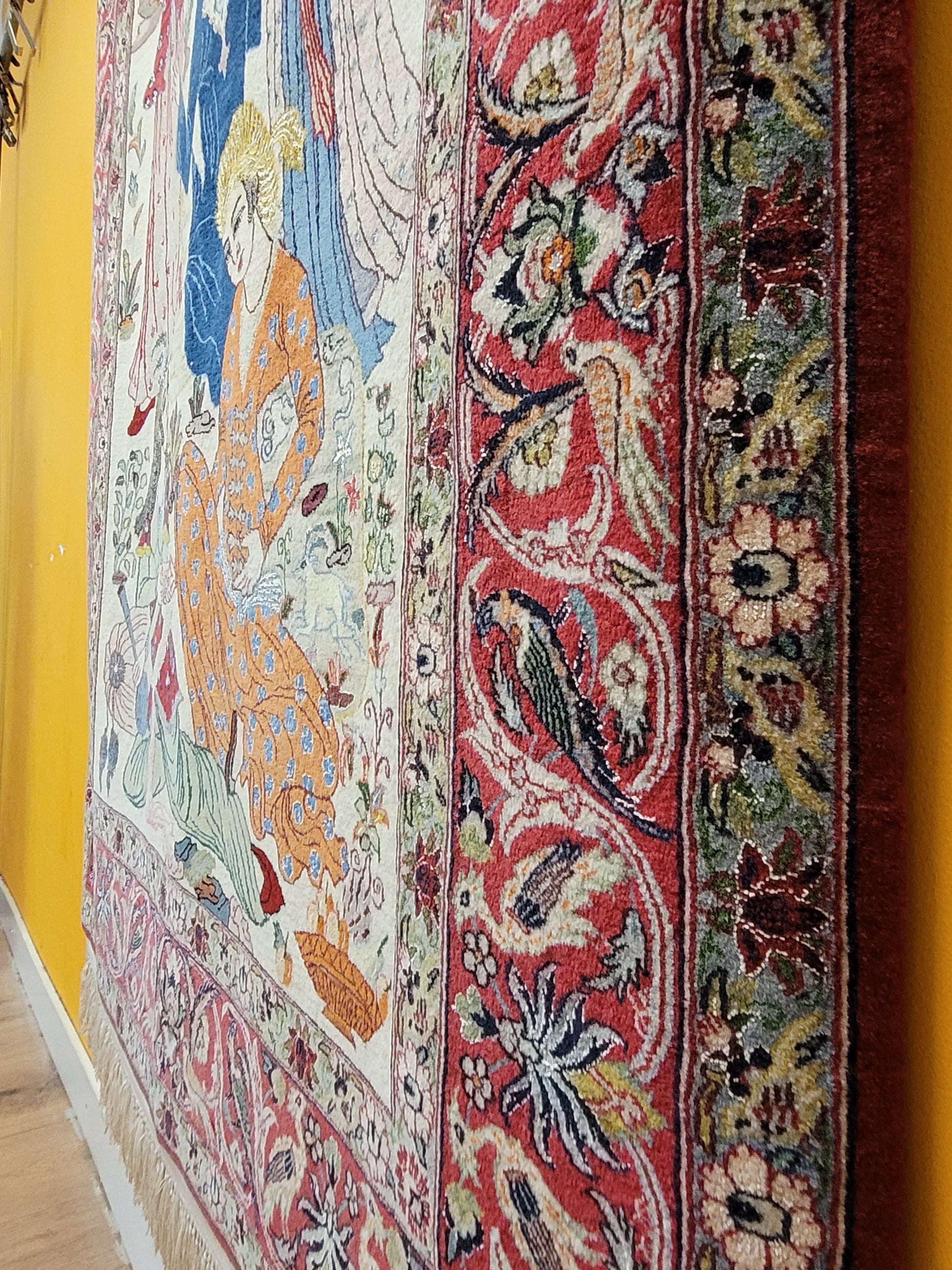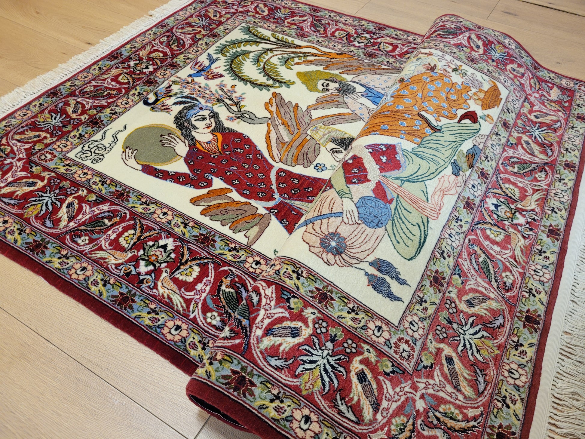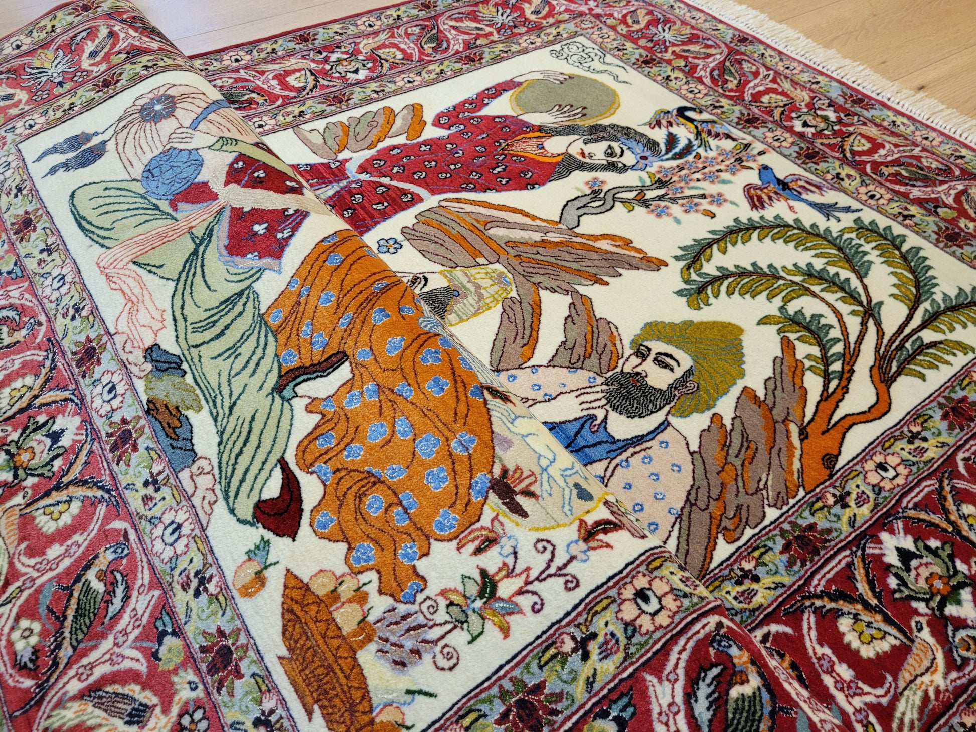 angeboten wird ein außergewöhnlicher Isfahan Bilderteppich aus feiner Korkwolle mit zarten Seidenelementen, meisterhaft von Hand geknüpft. Der Teppich zeigt eine detailreiche Bildszene, kunstvoll in ein orientalisches Dekor eingebettet und umrahmt von einer fein ausgearbeiteten Bordüre. Durch die Kombination aus figürlicher Darstellung und ornamentalen Elementen entsteht eine künstlerische Komposition mit hoher Ausdruckskraft.