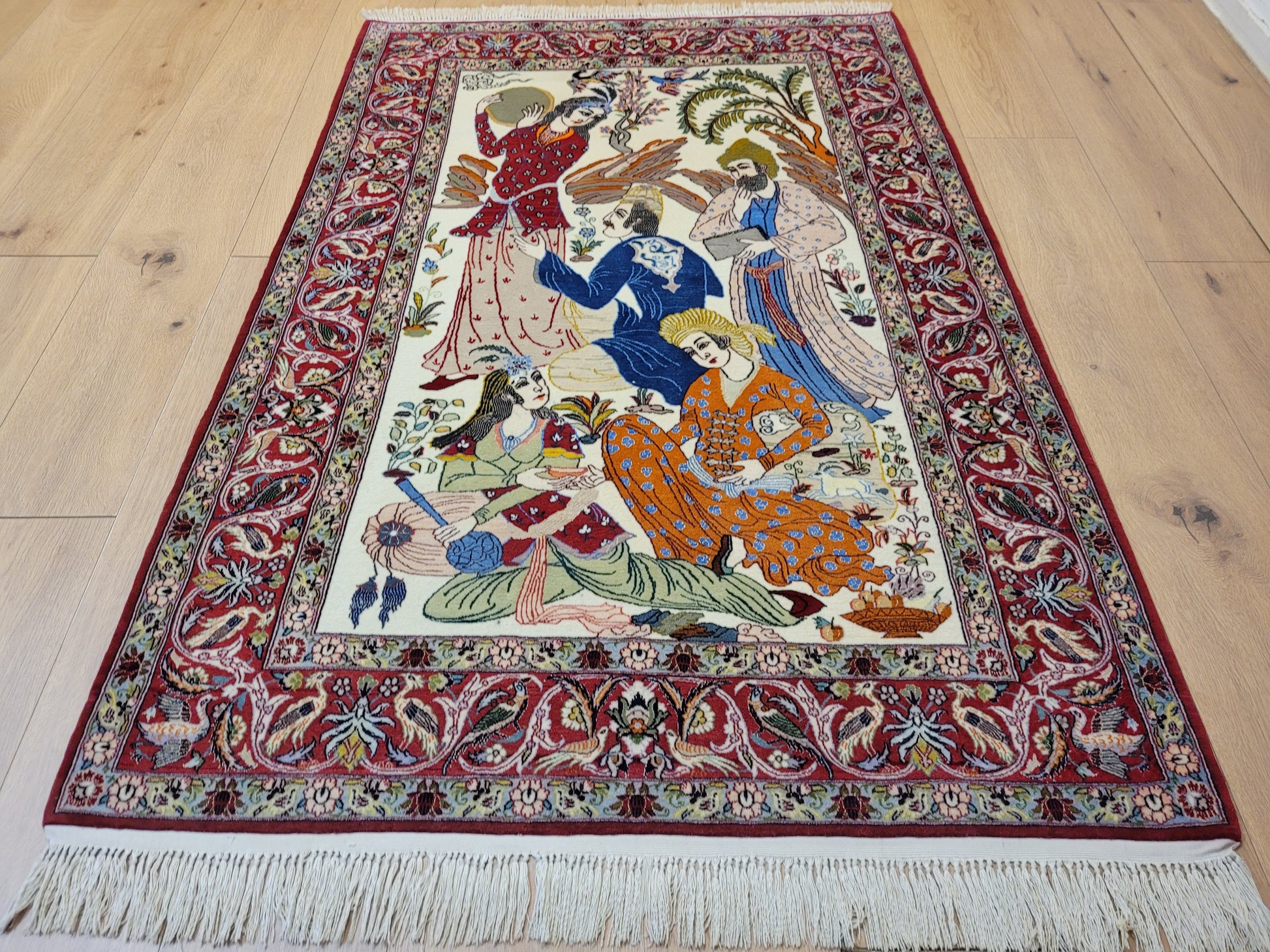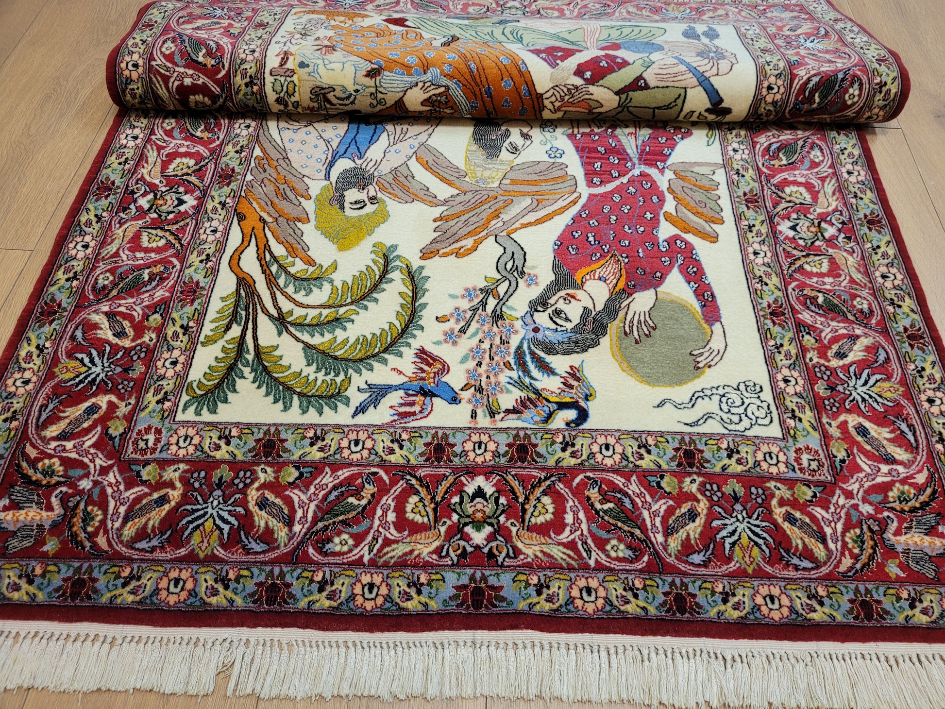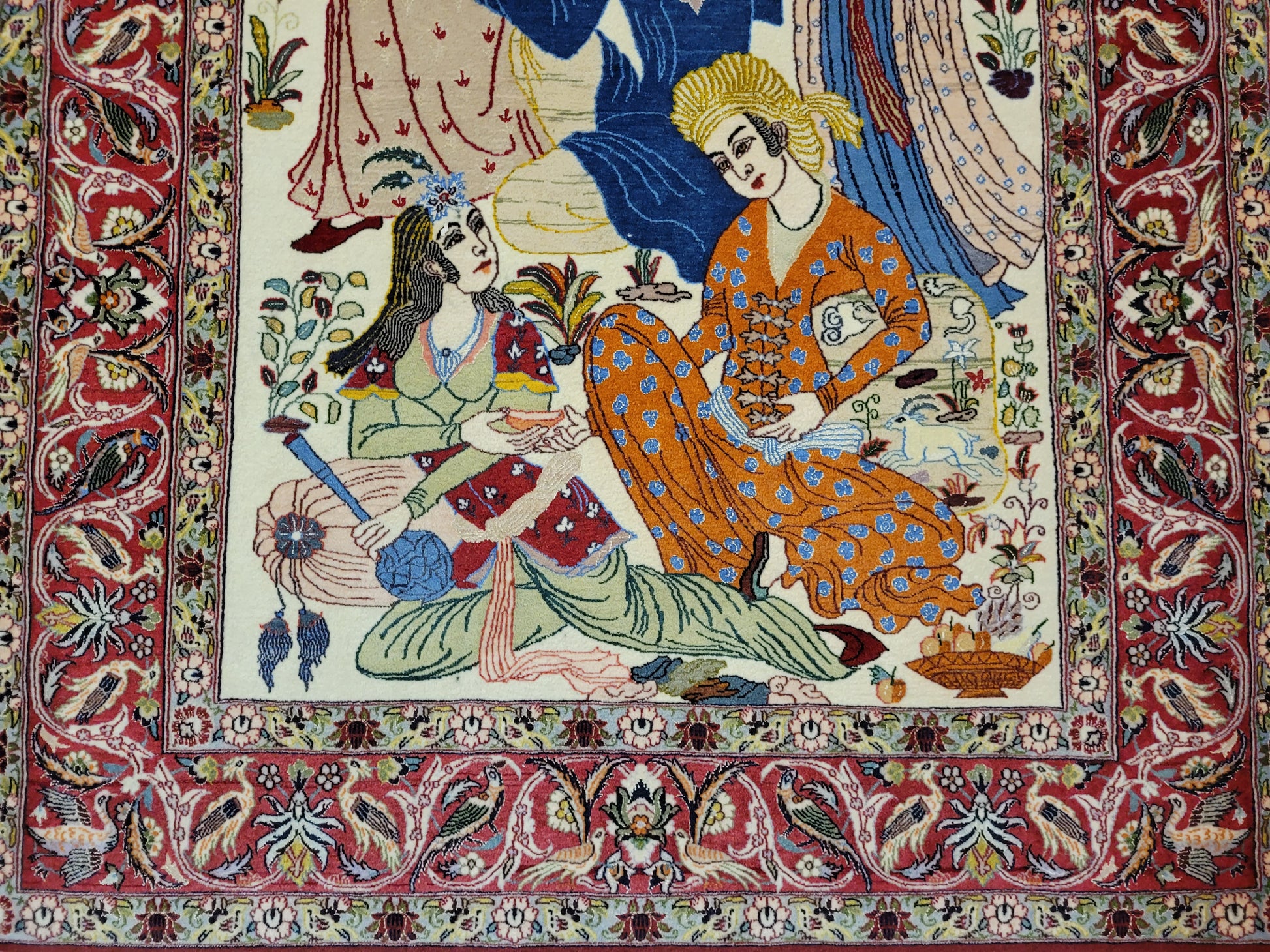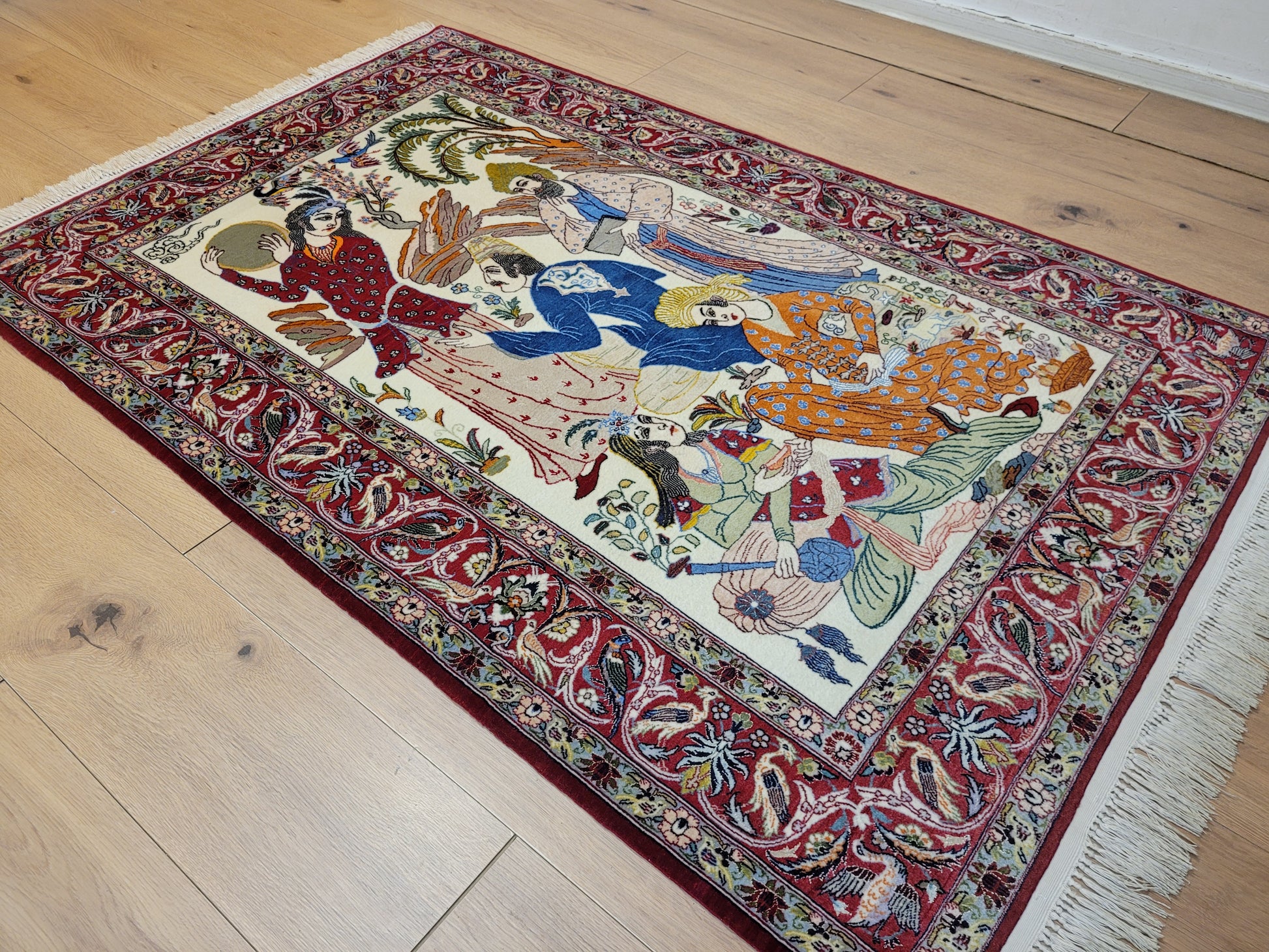 angeboten wird ein außergewöhnlicher Isfahan Bilderteppich aus feiner Korkwolle mit zarten Seidenelementen, meisterhaft von Hand geknüpft. Der Teppich zeigt eine detailreiche Bildszene, kunstvoll in ein orientalisches Dekor eingebettet und umrahmt von einer fein ausgearbeiteten Bordüre. Durch die Kombination aus figürlicher Darstellung und ornamentalen Elementen entsteht eine künstlerische Komposition mit hoher Ausdruckskraft.