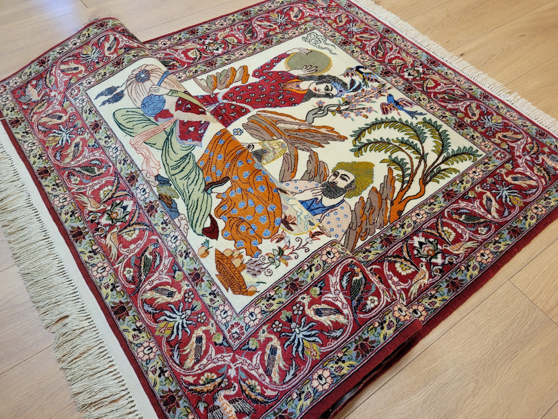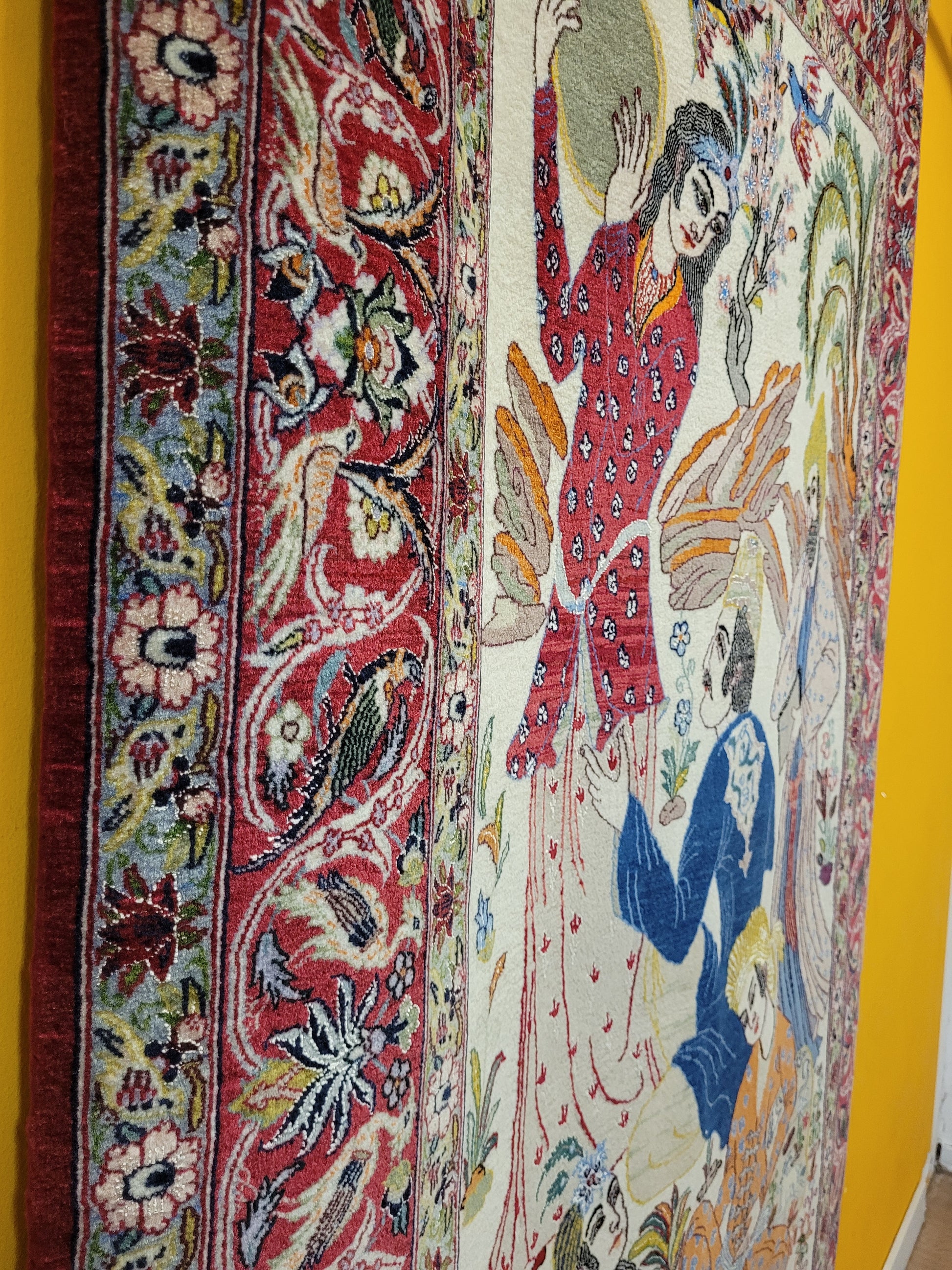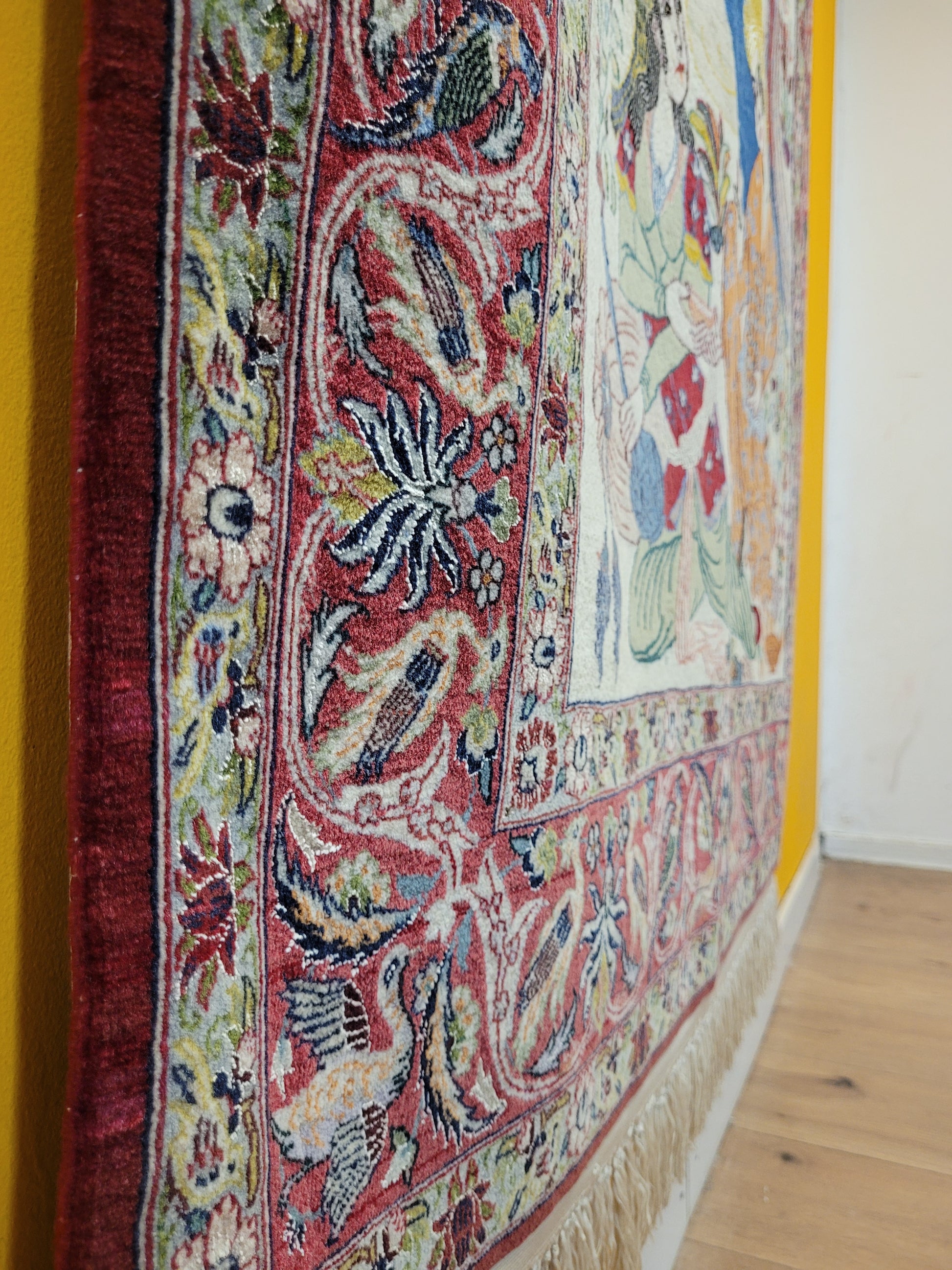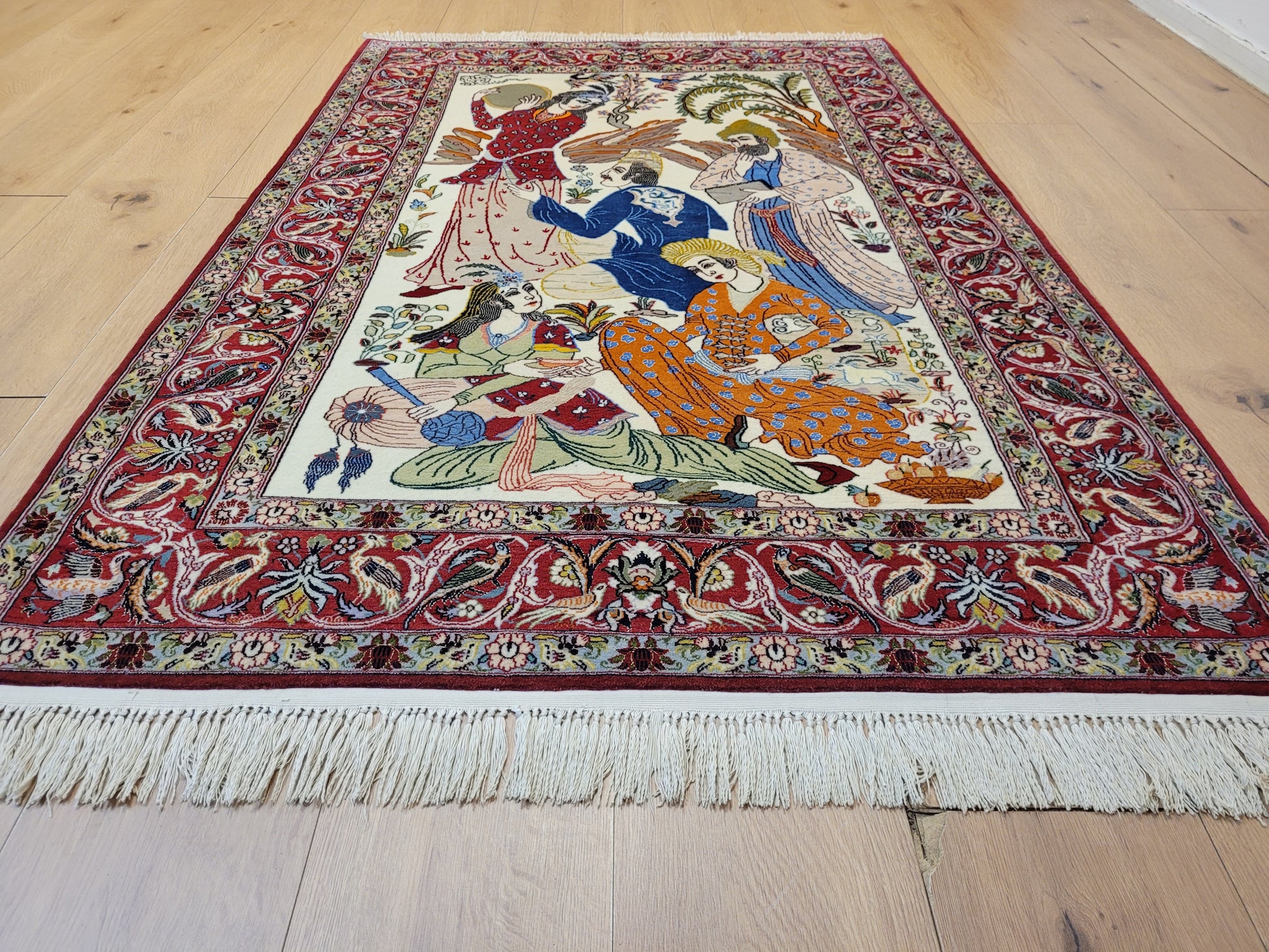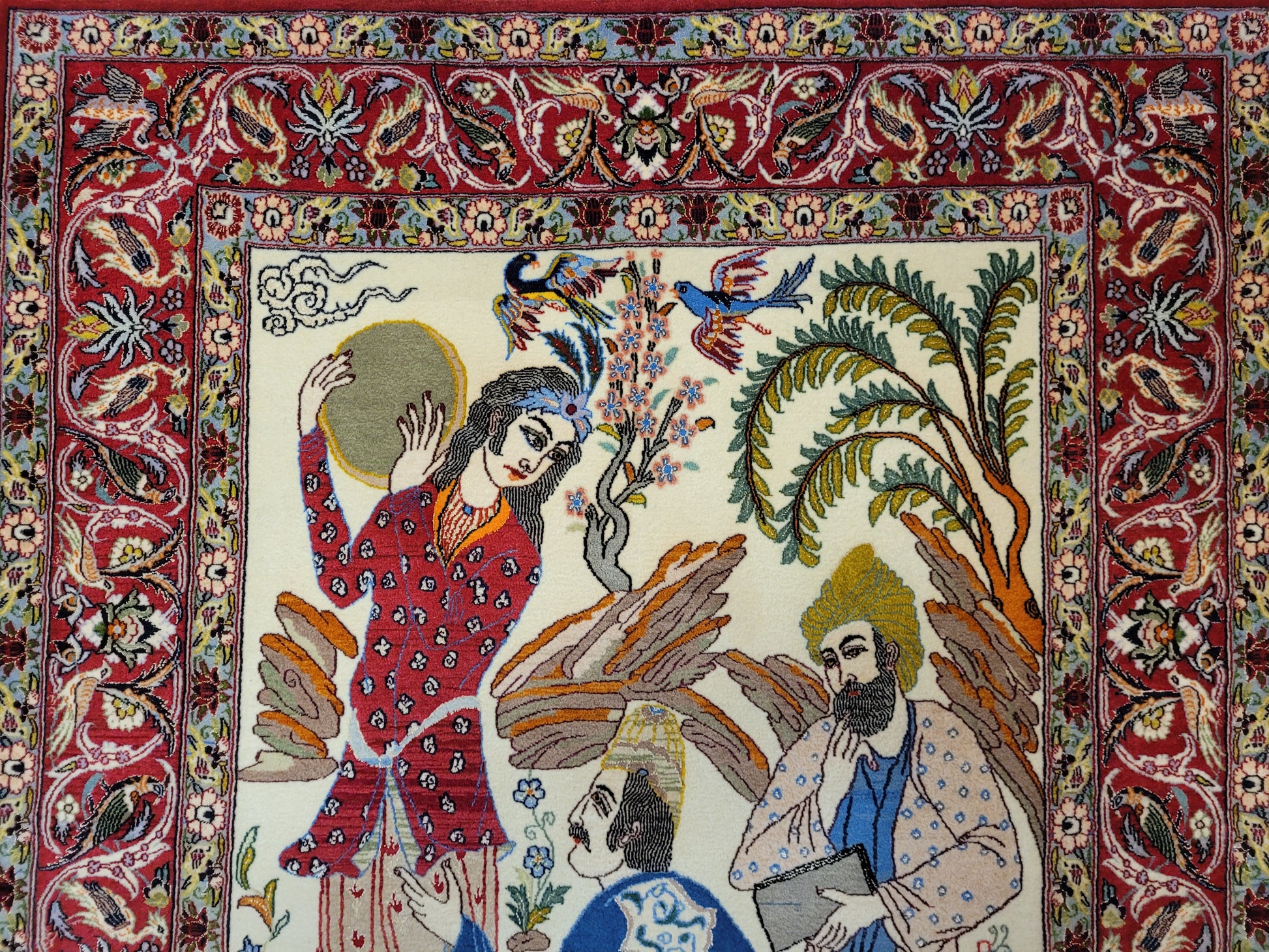 angeboten wird ein außergewöhnlicher Isfahan Bilderteppich aus feiner Korkwolle mit zarten Seidenelementen, meisterhaft von Hand geknüpft. Der Teppich zeigt eine detailreiche Bildszene, kunstvoll in ein orientalisches Dekor eingebettet und umrahmt von einer fein ausgearbeiteten Bordüre. Durch die Kombination aus figürlicher Darstellung und ornamentalen Elementen entsteht eine künstlerische Komposition mit hoher Ausdruckskraft.