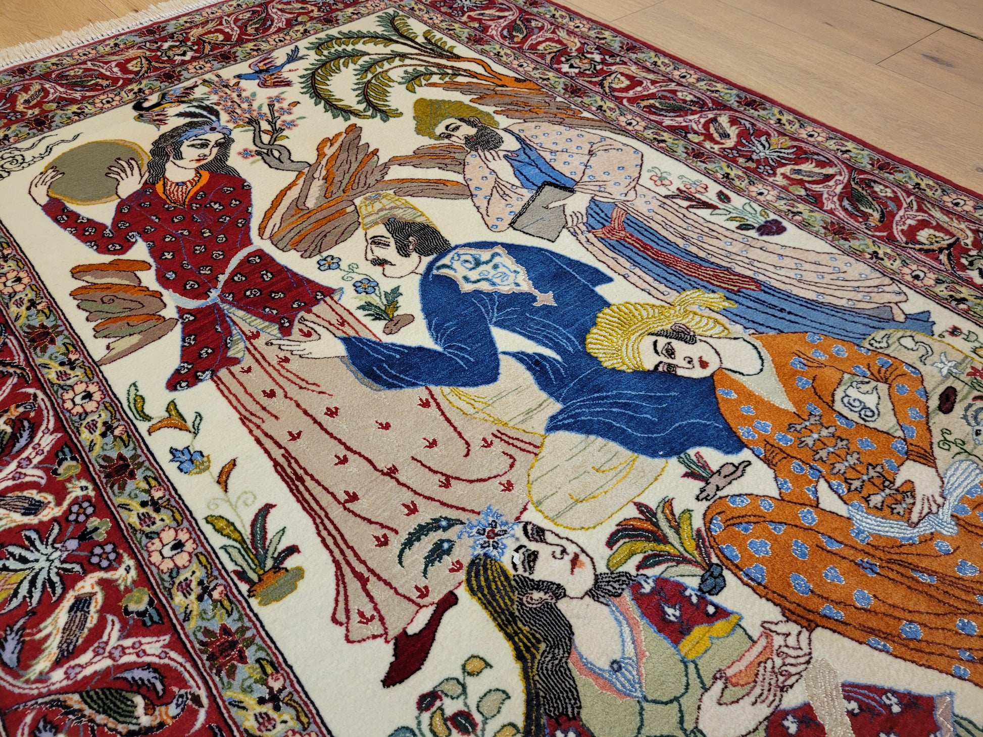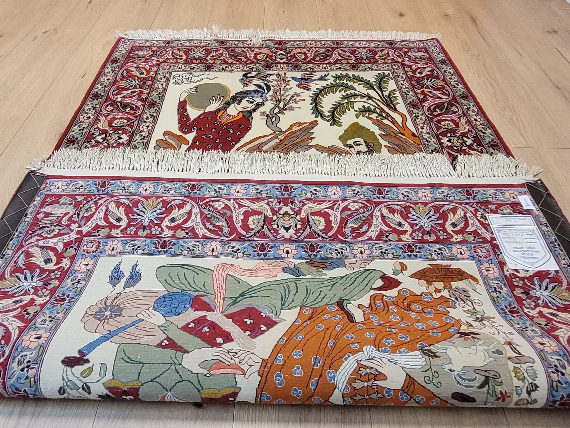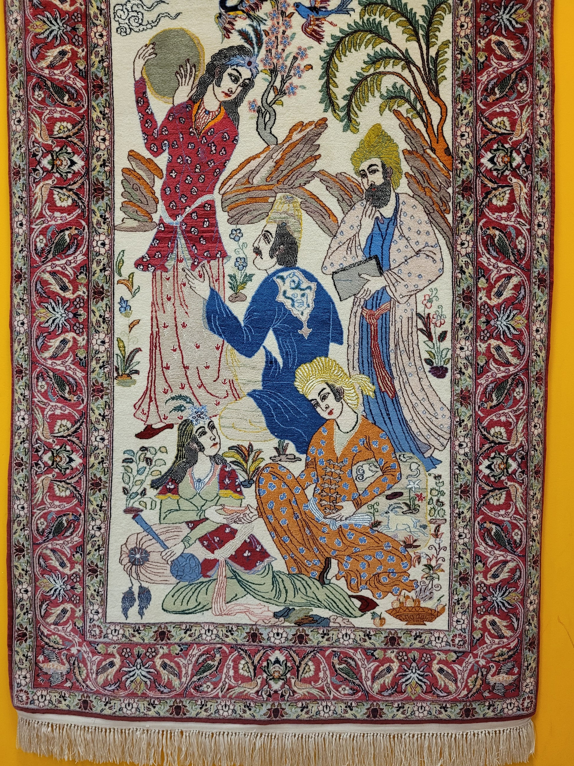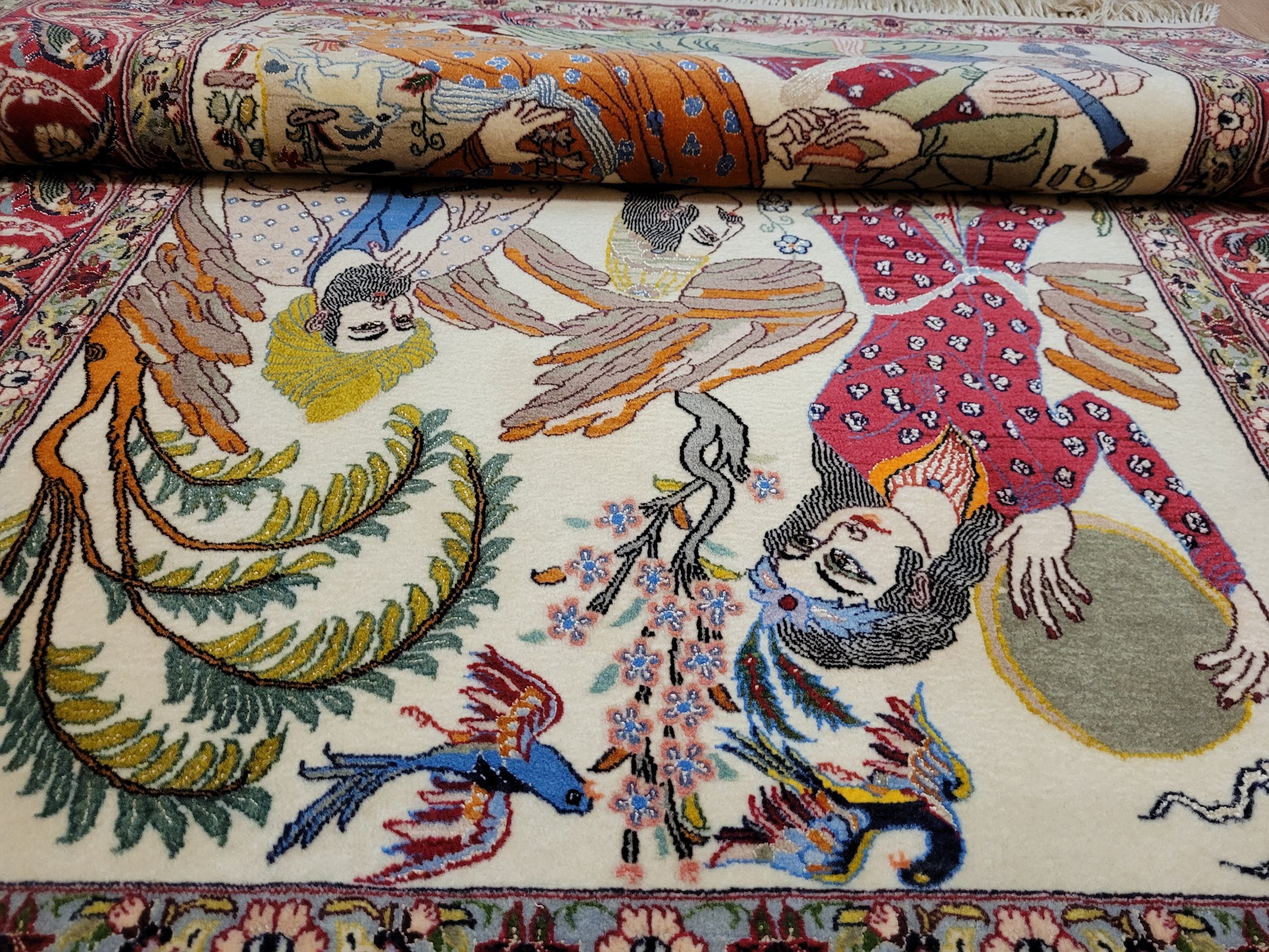 angeboten wird ein außergewöhnlicher Isfahan Bilderteppich aus feiner Korkwolle mit zarten Seidenelementen, meisterhaft von Hand geknüpft. Der Teppich zeigt eine detailreiche Bildszene, kunstvoll in ein orientalisches Dekor eingebettet und umrahmt von einer fein ausgearbeiteten Bordüre. Durch die Kombination aus figürlicher Darstellung und ornamentalen Elementen entsteht eine künstlerische Komposition mit hoher Ausdruckskraft.