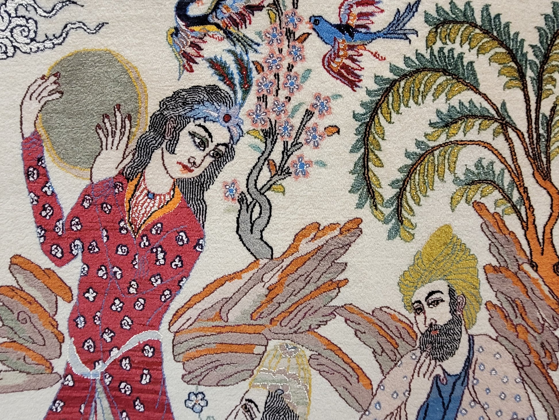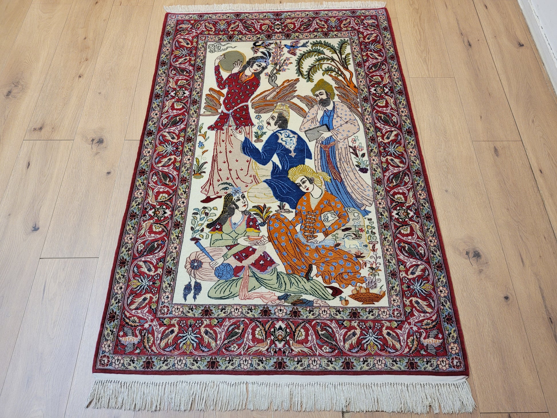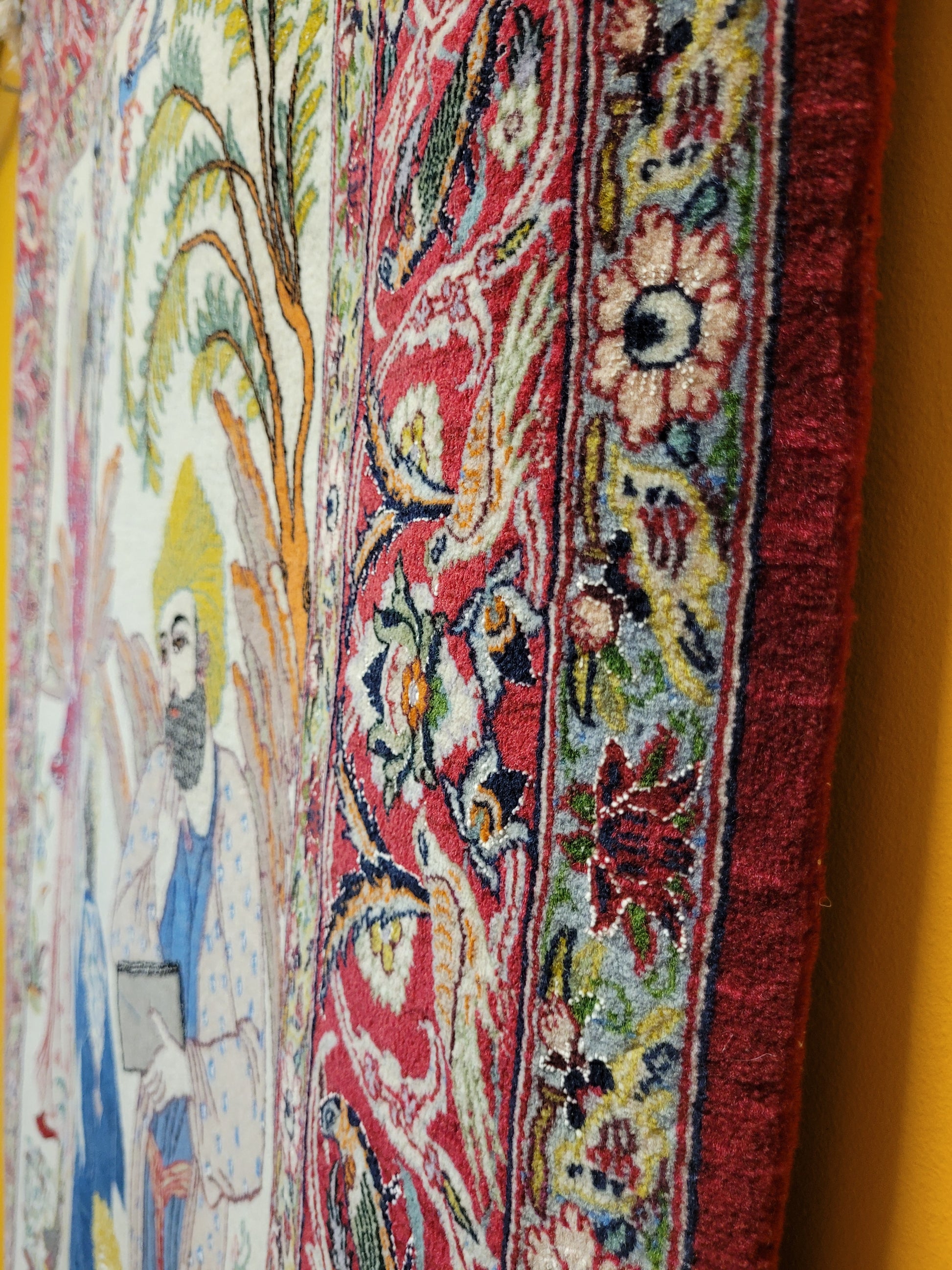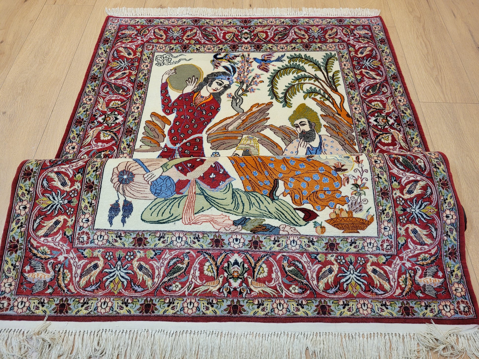 angeboten wird ein außergewöhnlicher Isfahan Bilderteppich aus feiner Korkwolle mit zarten Seidenelementen, meisterhaft von Hand geknüpft. Der Teppich zeigt eine detailreiche Bildszene, kunstvoll in ein orientalisches Dekor eingebettet und umrahmt von einer fein ausgearbeiteten Bordüre. Durch die Kombination aus figürlicher Darstellung und ornamentalen Elementen entsteht eine künstlerische Komposition mit hoher Ausdruckskraft.