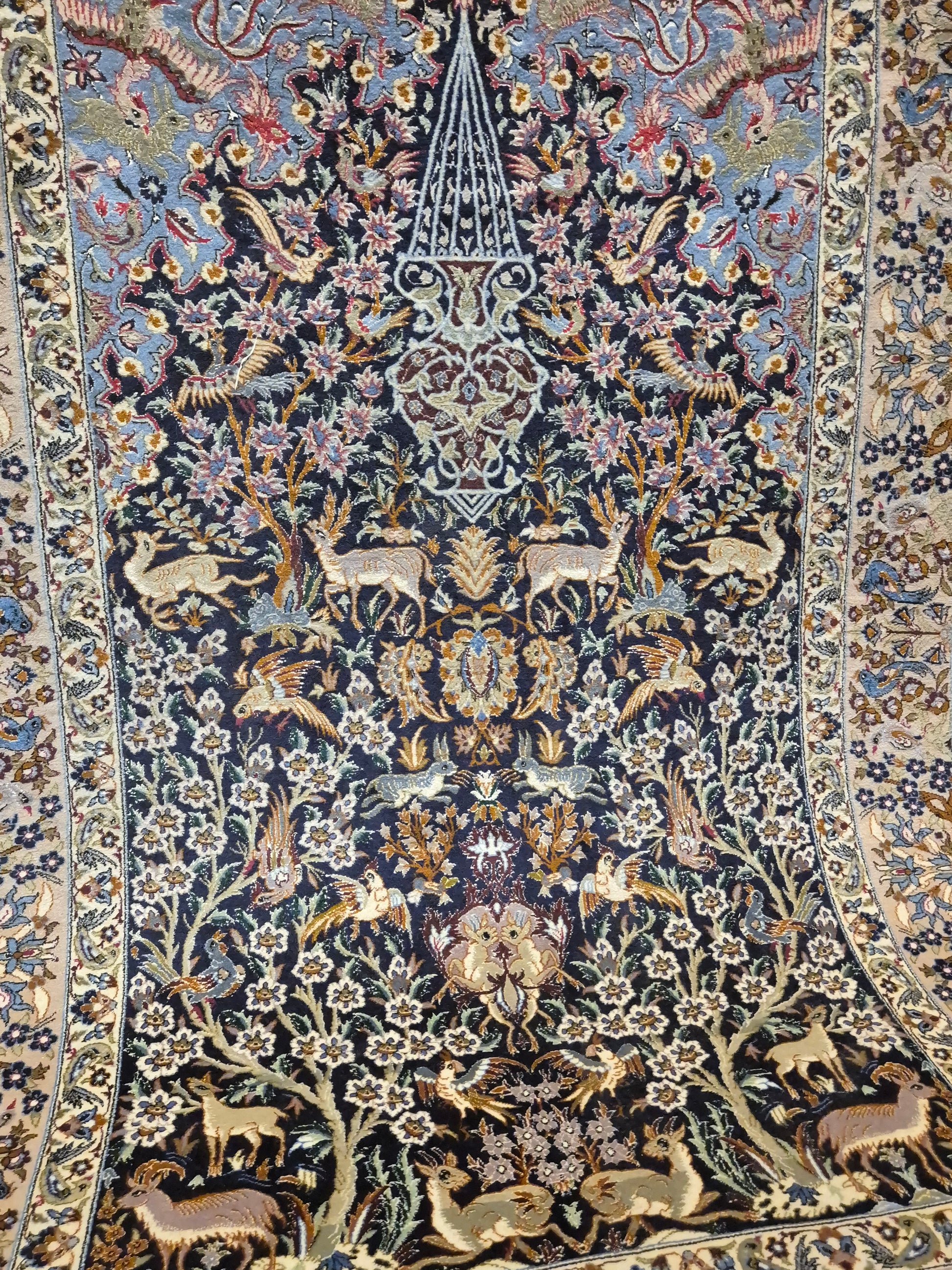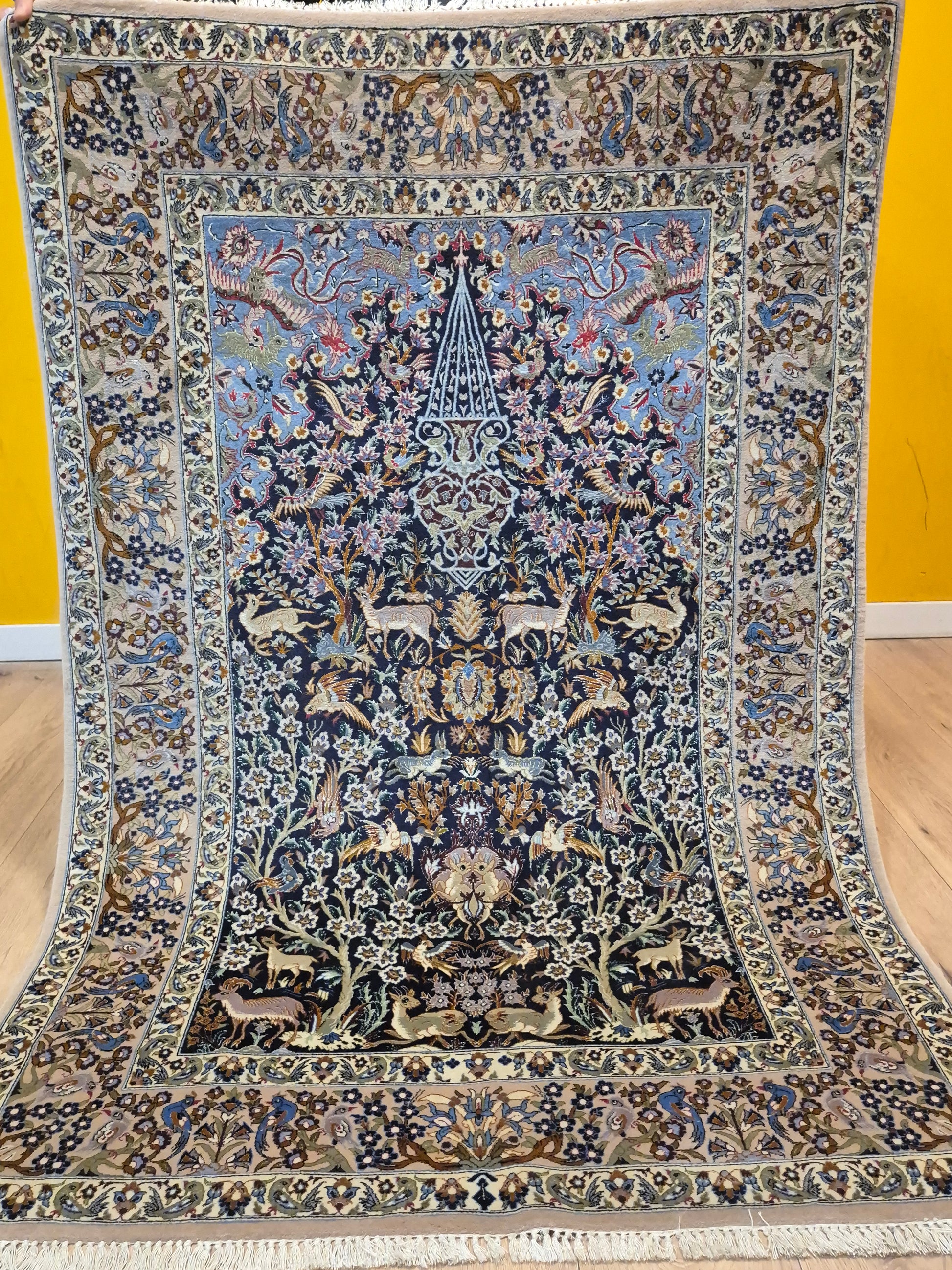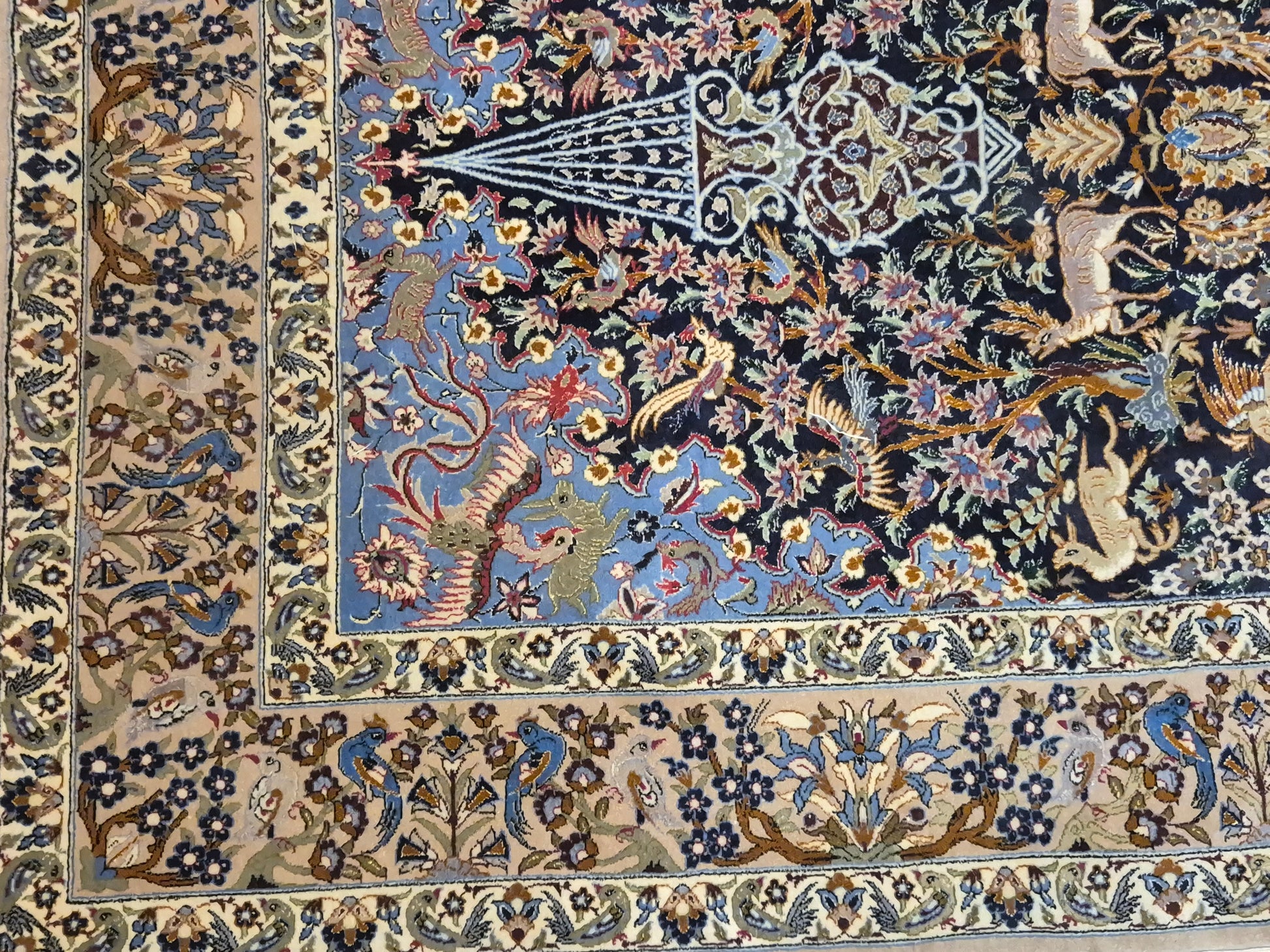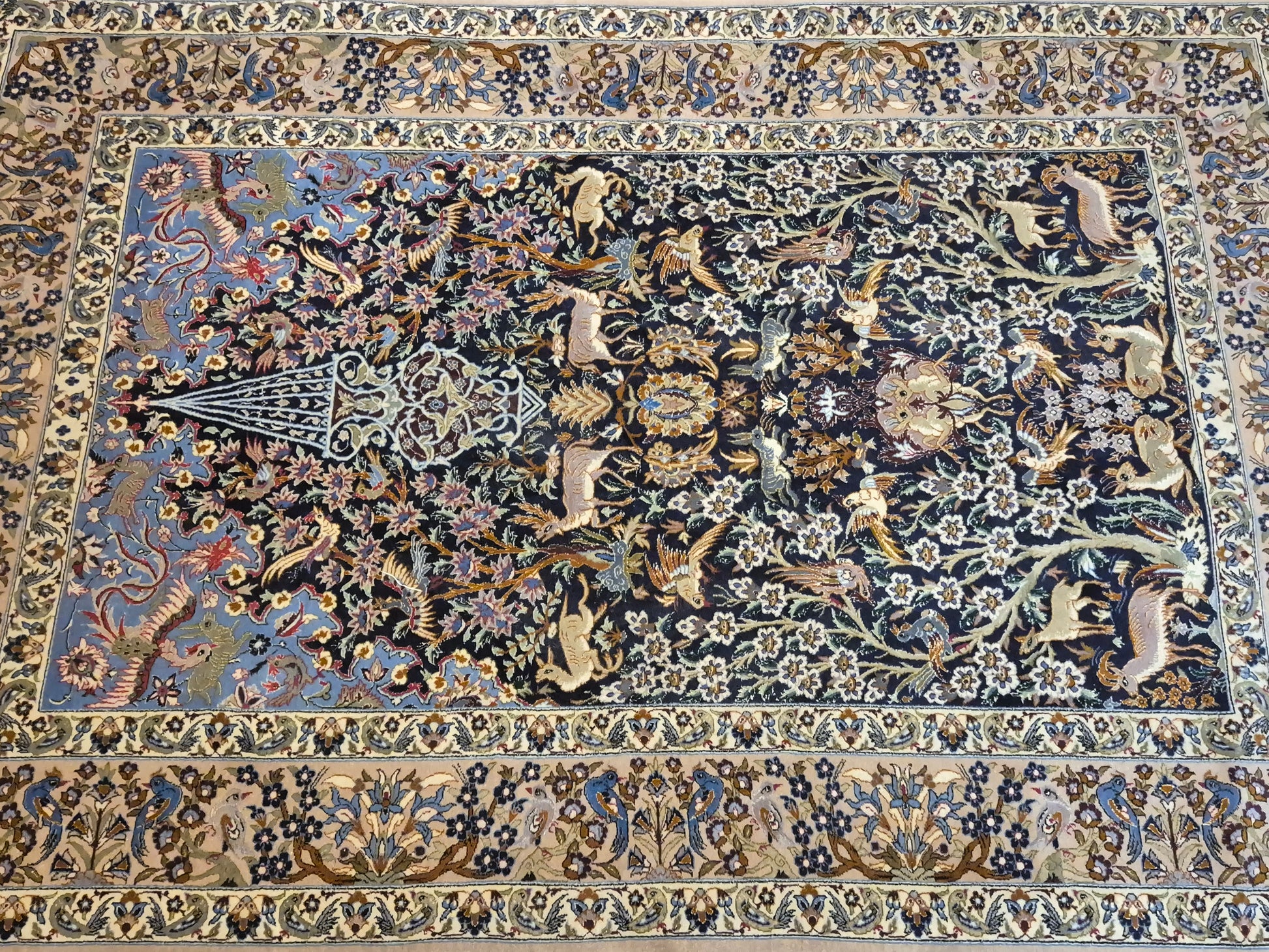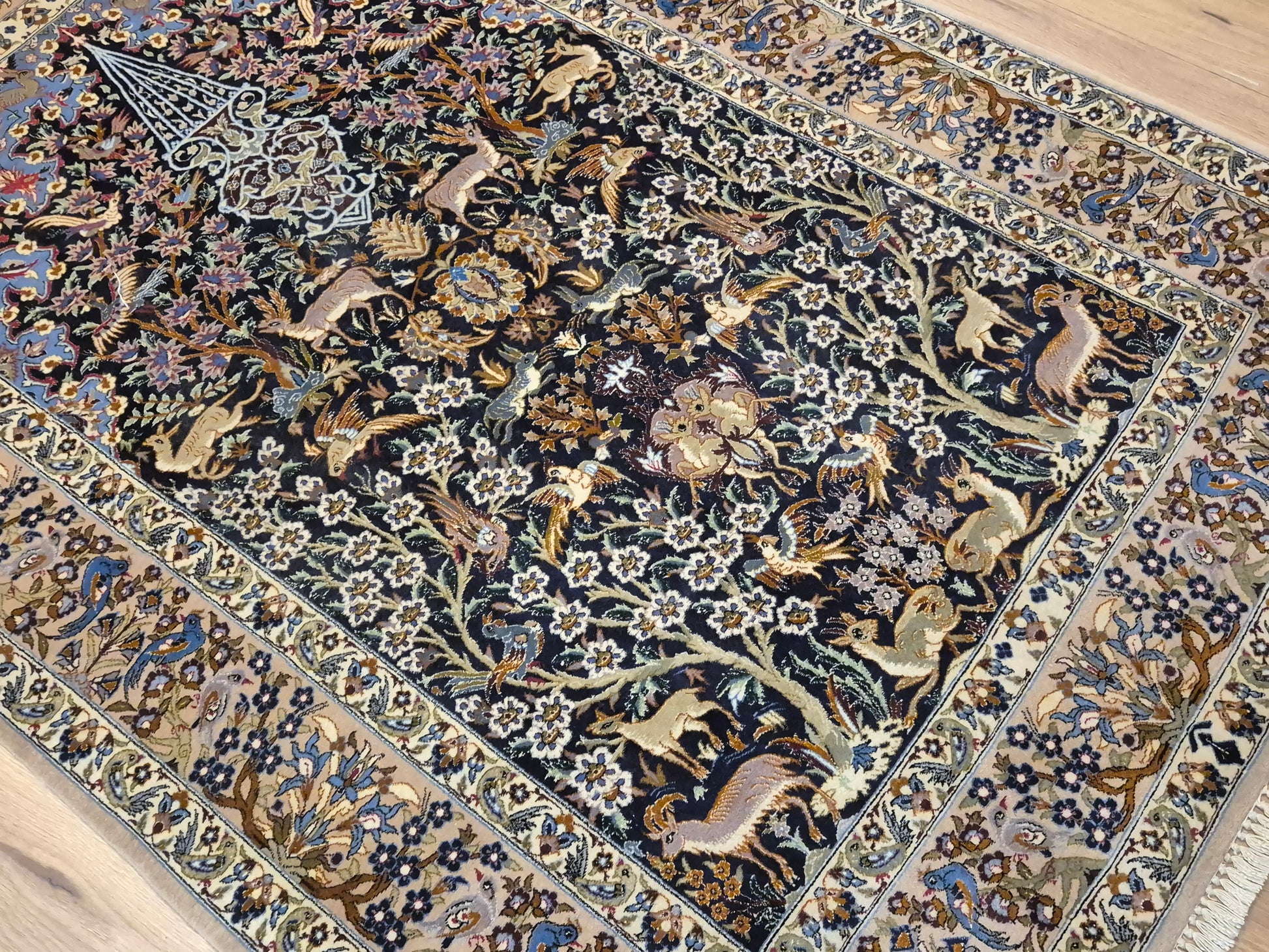 angeboten wird ein edler Isfahan Teppich aus feinster Korkwolle mit Seidenakzenten, handgeknüpft in meisterlicher Qualität. Das Motiv zeigt eine detailreiche Jagdszene mit Hirschen, Gazellen und Vögeln, eingebettet in ein dicht gestaltetes Paradiesgarten-Dekor mit Bäumen, Ranken und Blüten. Ein prachtvolles Beispiel klassischer Knüpfkunst mit lebendiger Bildwirkung.