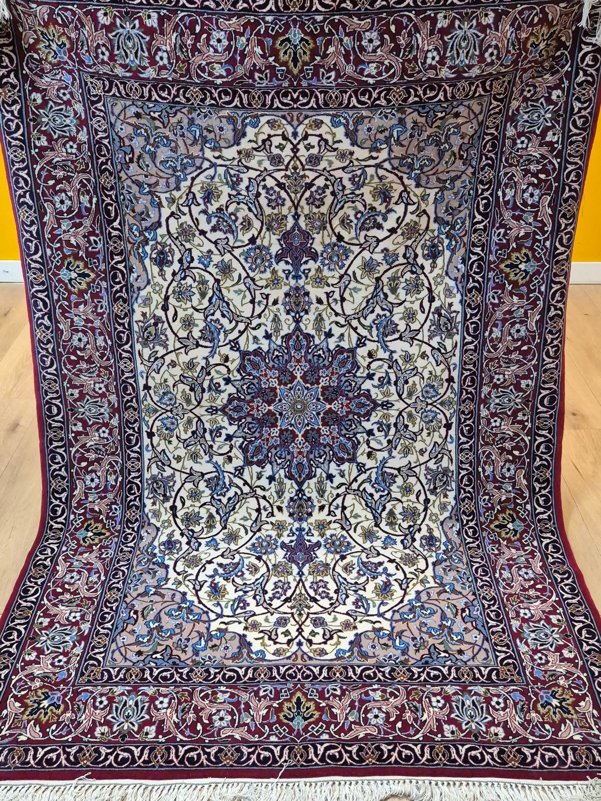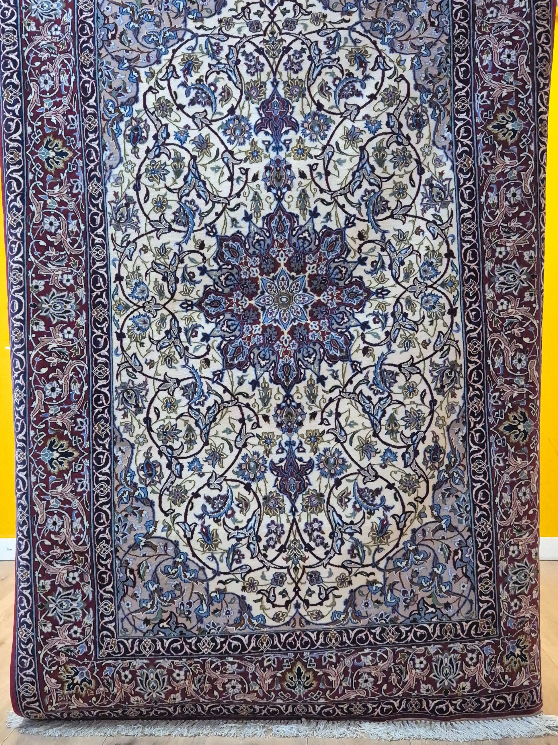 angeboten wird ein edler Isfahan Teppich aus feiner Korkwolle mit Seidenapplikationen, handgeknüpft auf Seide. Im Zentrum erstrahlt ein kunstvolles, sternförmiges Medaillon, das von filigranen Ranken und Blütenmotiven umgeben ist. Die Komposition ist von klassischer Eleganz geprägt und zeugt von meisterhafter Knüpfkunst.