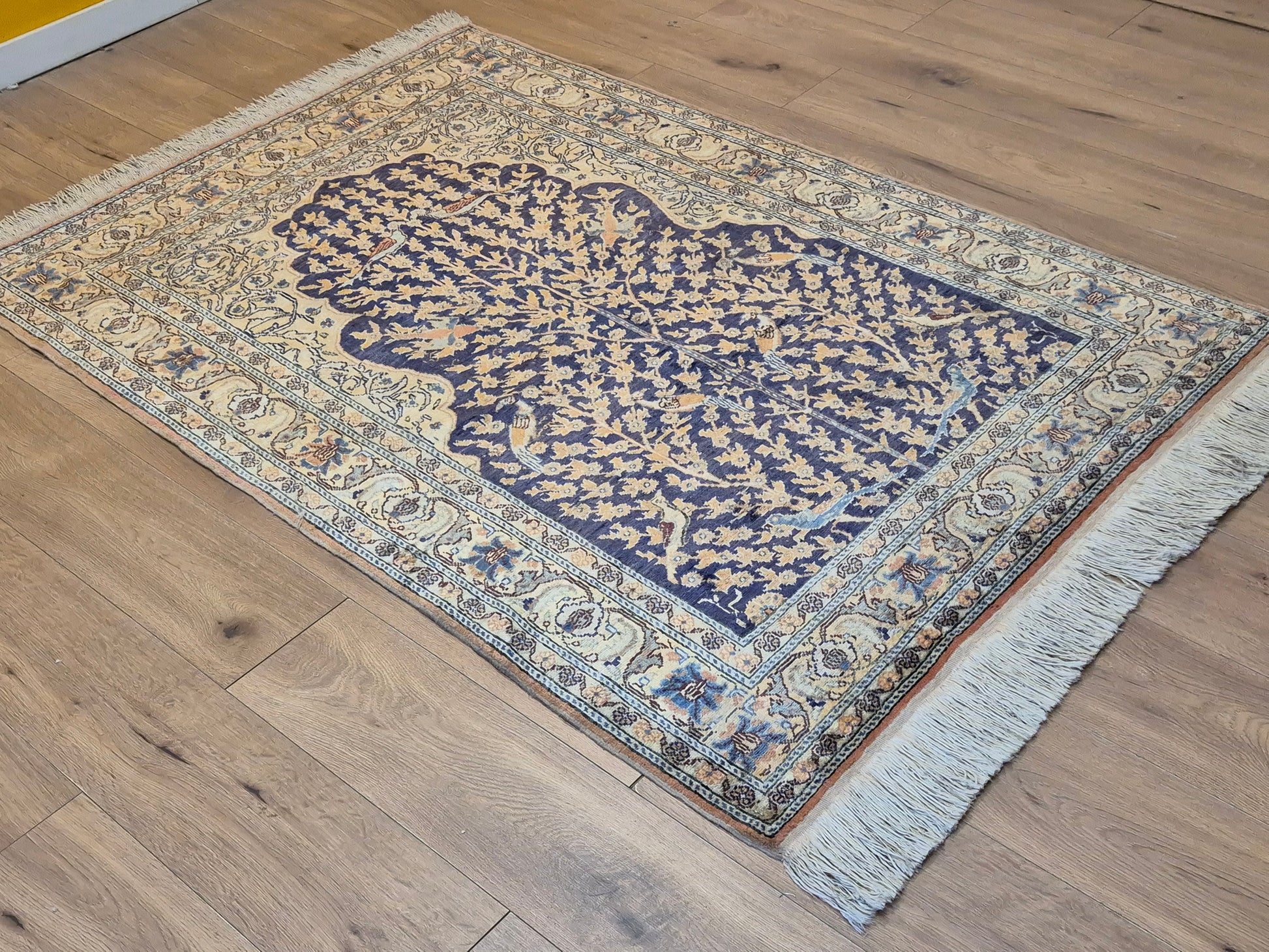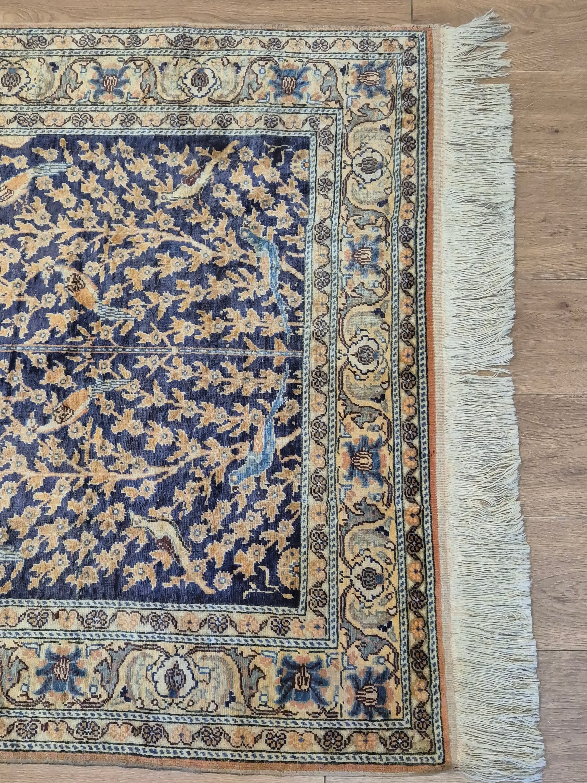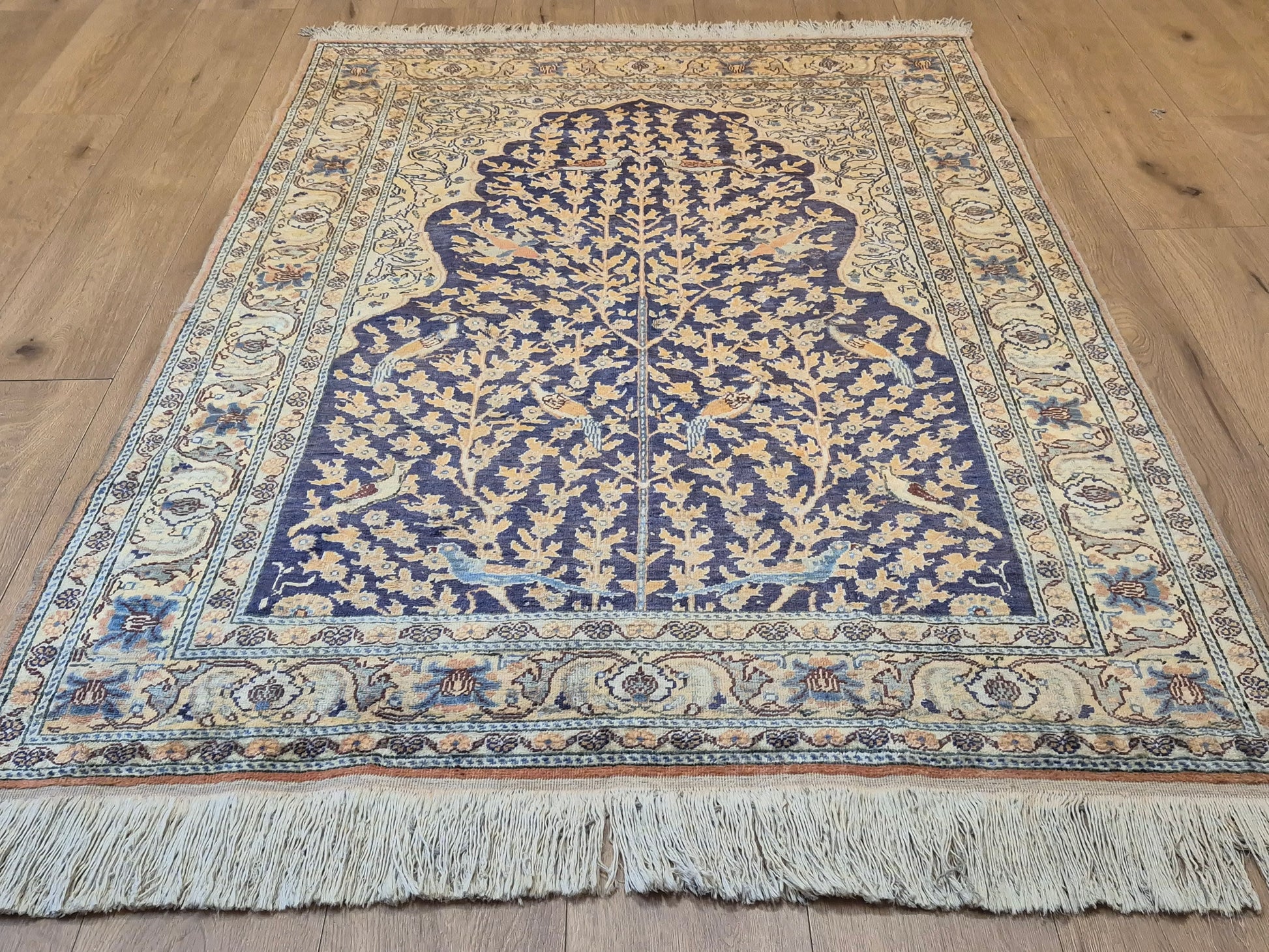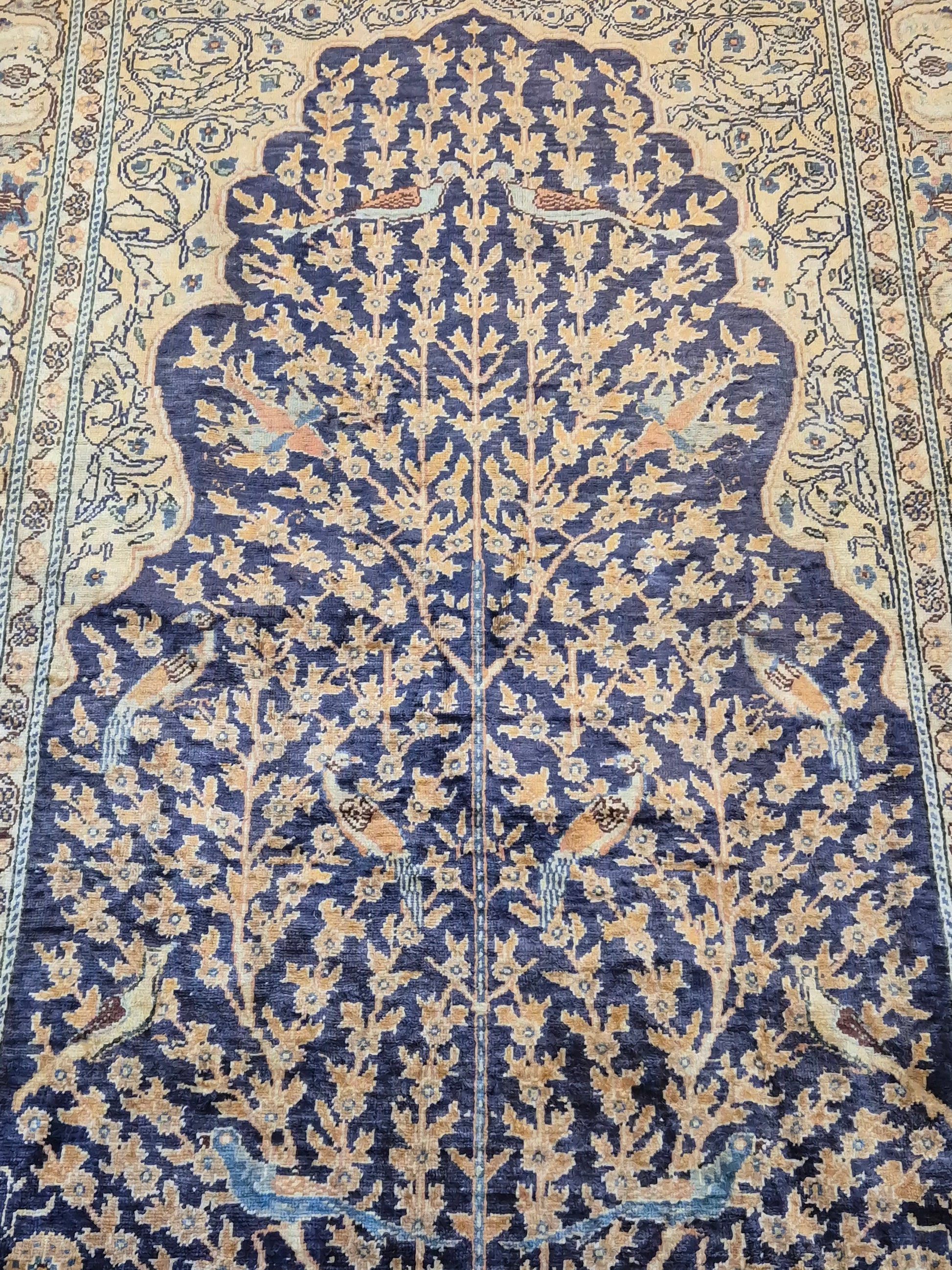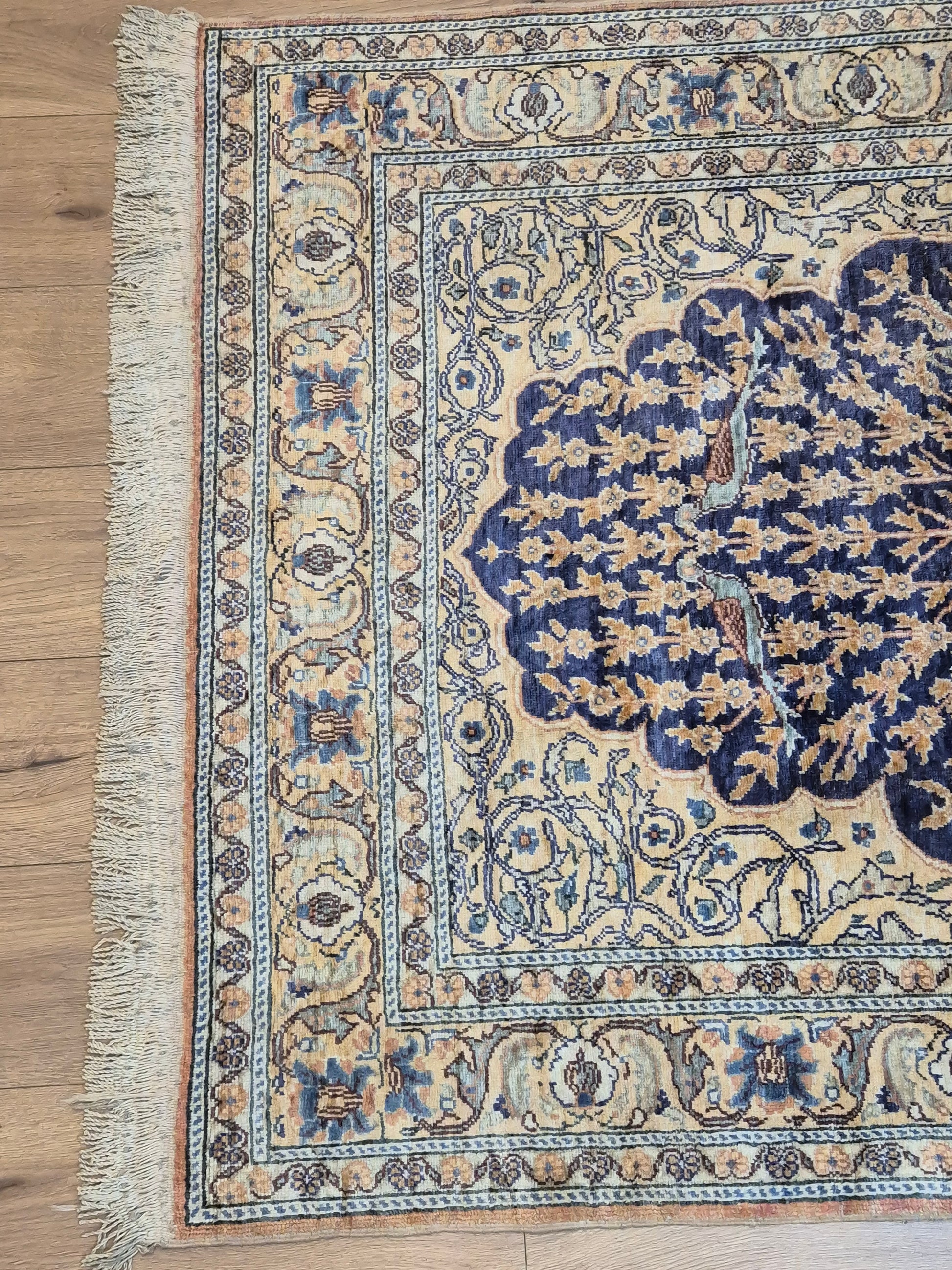 angeboten wird ein dekorativer Kayseri Flosh-Teppich in handgeknüpfter Ausführung. Das Hauptmotiv zeigt den Lebensbaum, dessen goldfarbene Ranken sich auf einem tiefblauen Fond erheben. Zwischen den Zweigen sind kunstvoll Vögel eingearbeitet, die dem Teppich eine lebendige und symbolische Ausstrahlung verleihen. Die helle Bordüre mit floralen Ornamenten und Medaillons rahmt die Mittelpartie harmonisch ein.