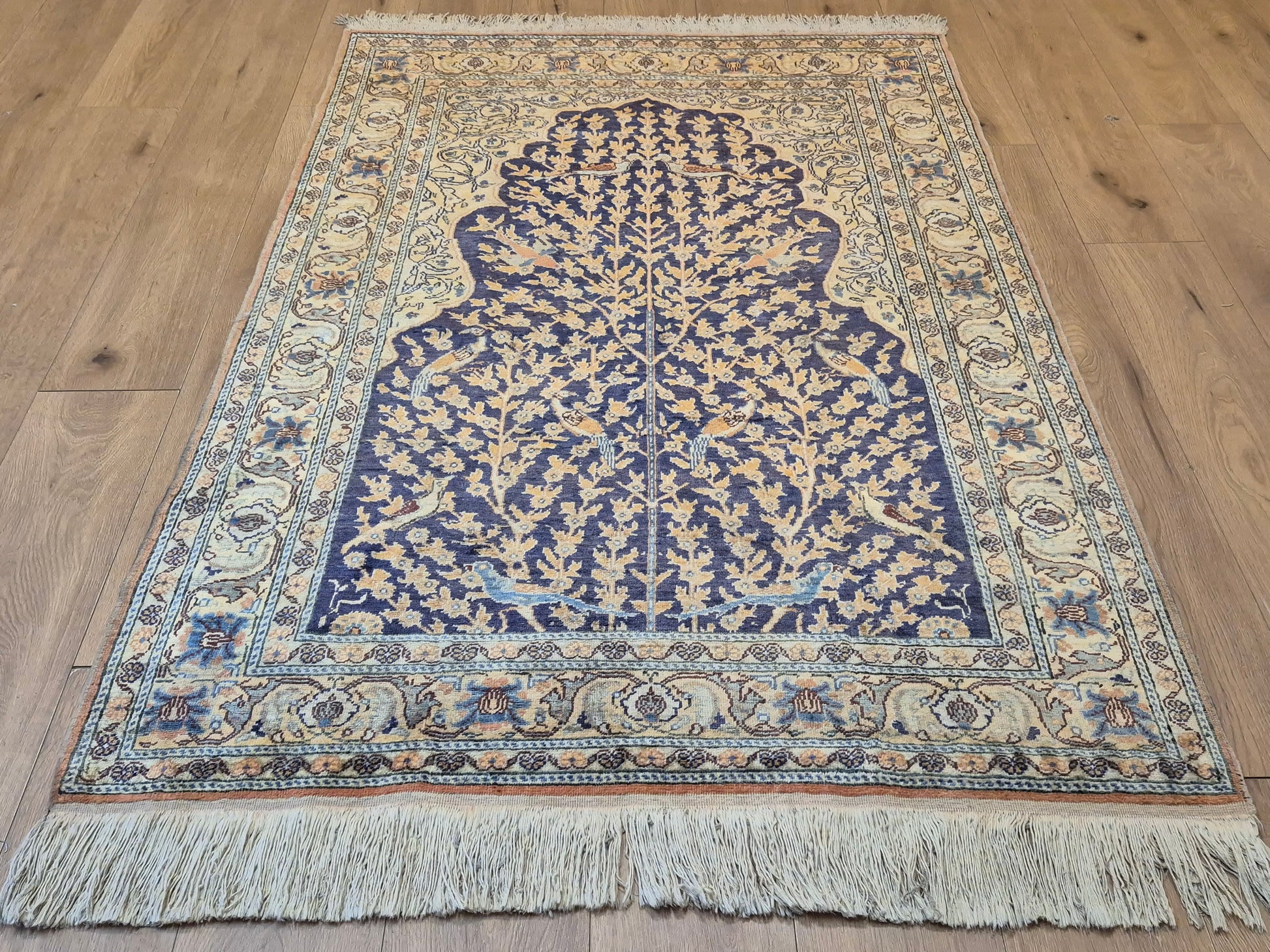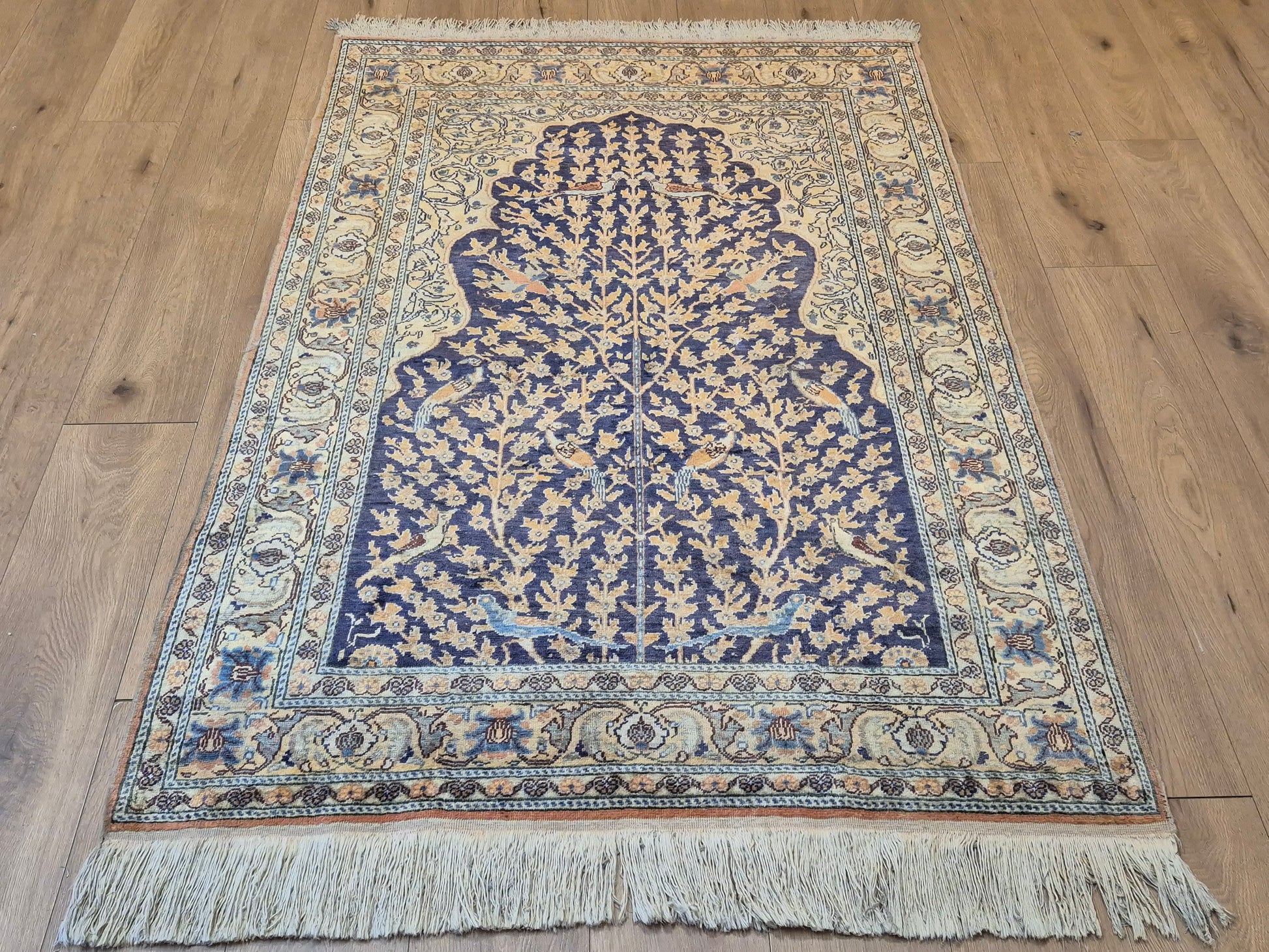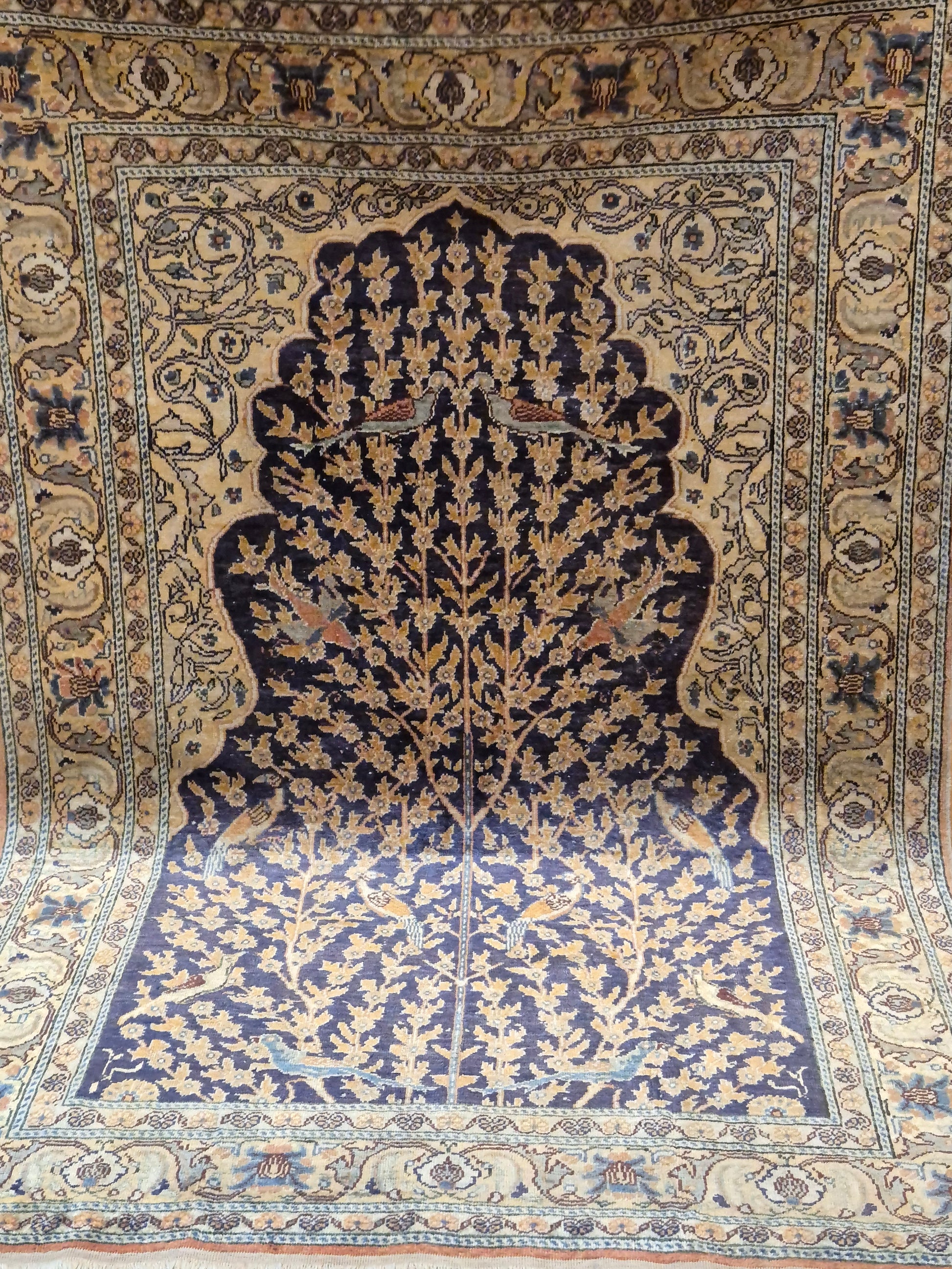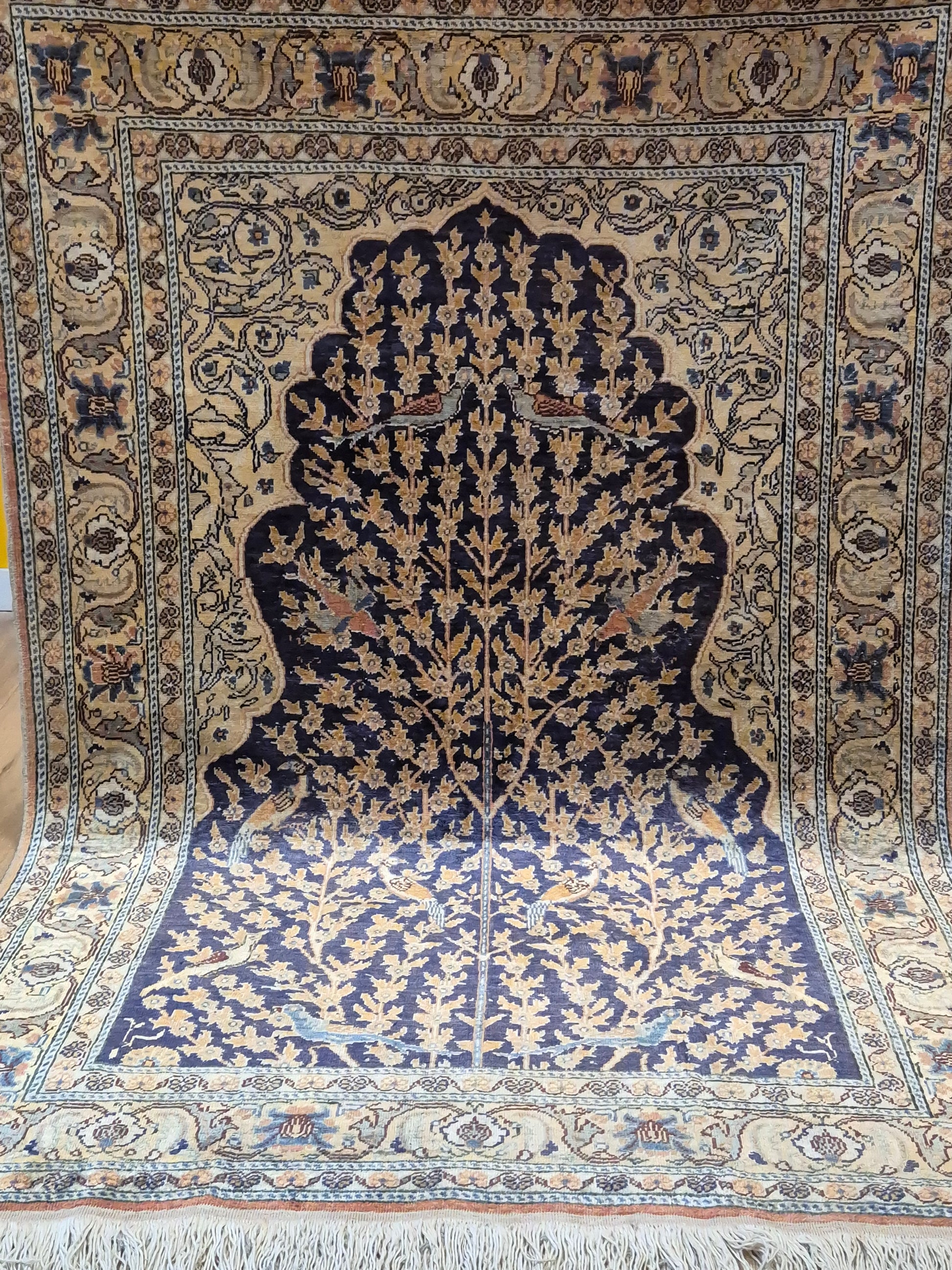 angeboten wird ein dekorativer Kayseri Flosh-Teppich in handgeknüpfter Ausführung. Das Hauptmotiv zeigt den Lebensbaum, dessen goldfarbene Ranken sich auf einem tiefblauen Fond erheben. Zwischen den Zweigen sind kunstvoll Vögel eingearbeitet, die dem Teppich eine lebendige und symbolische Ausstrahlung verleihen. Die helle Bordüre mit floralen Ornamenten und Medaillons rahmt die Mittelpartie harmonisch ein.