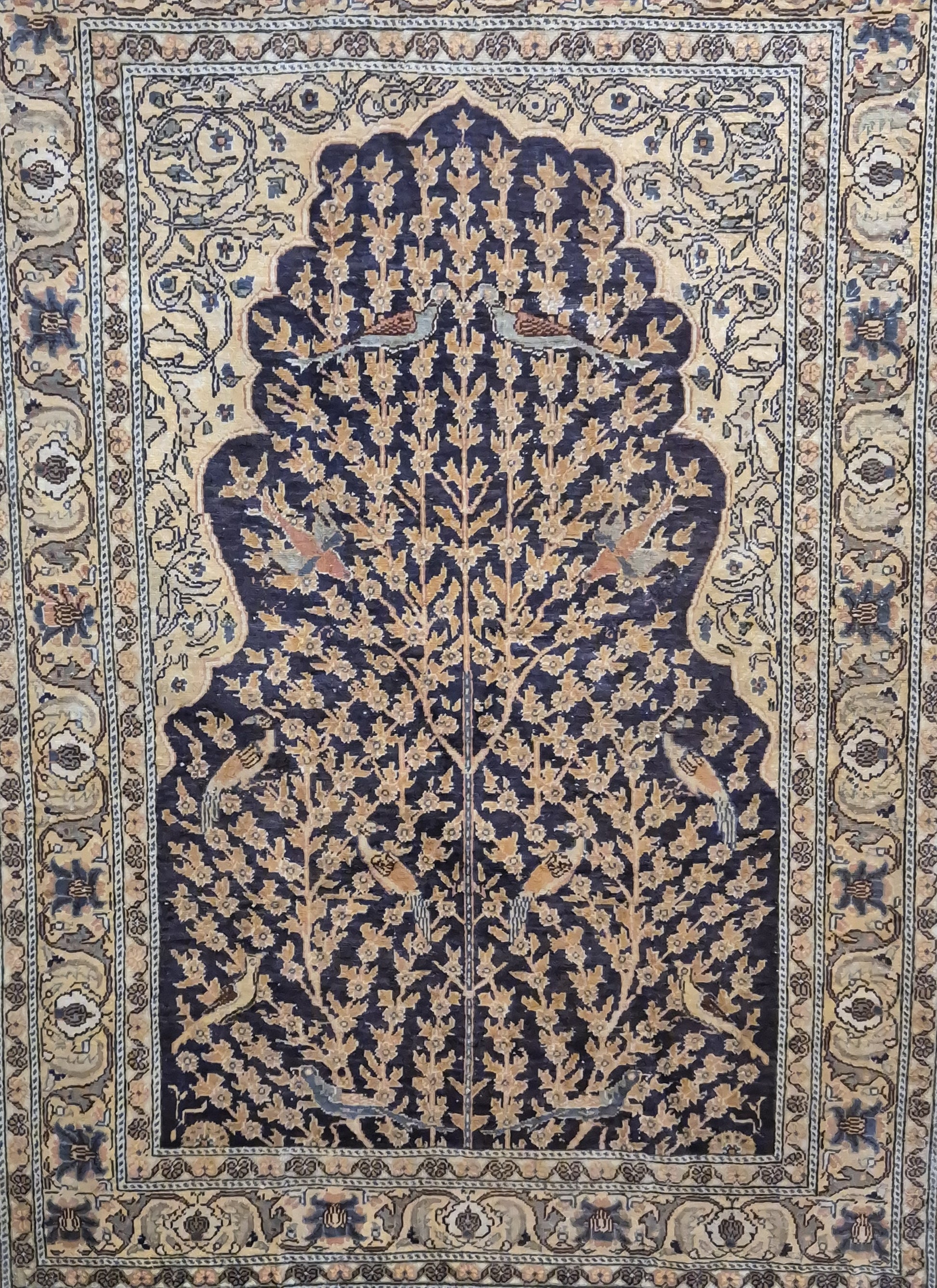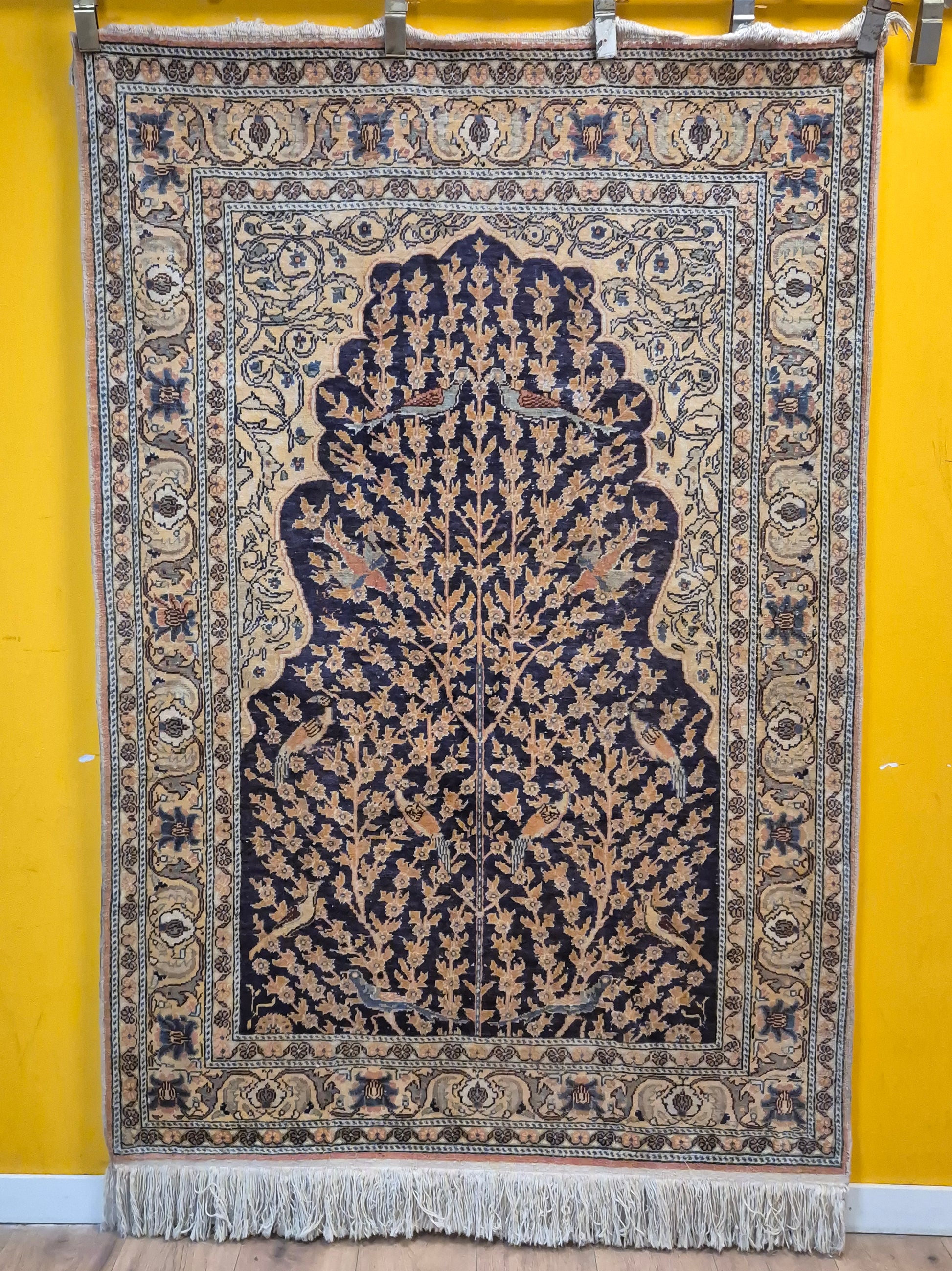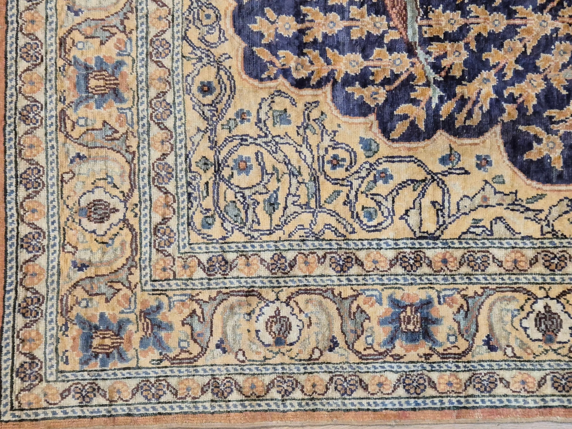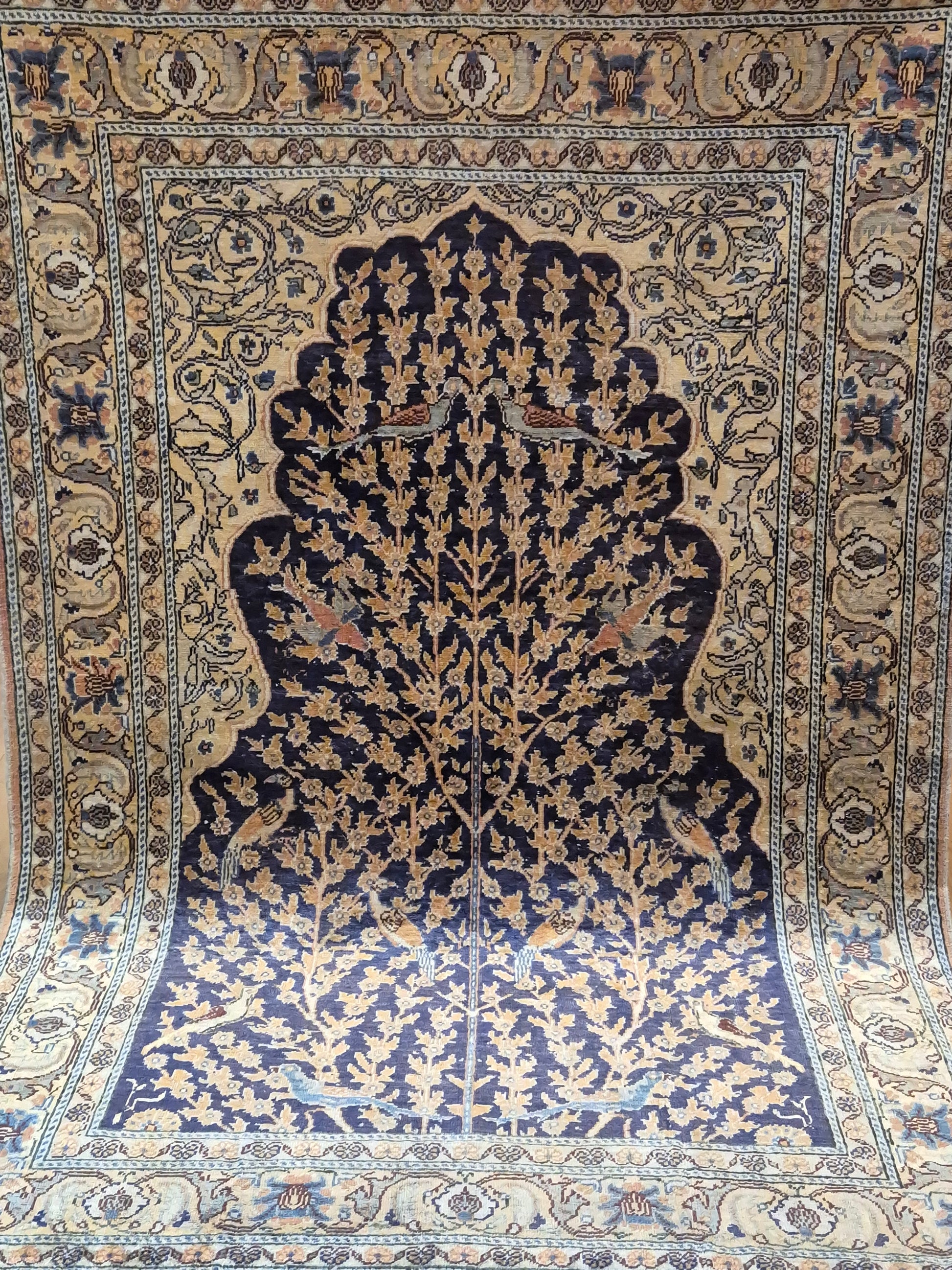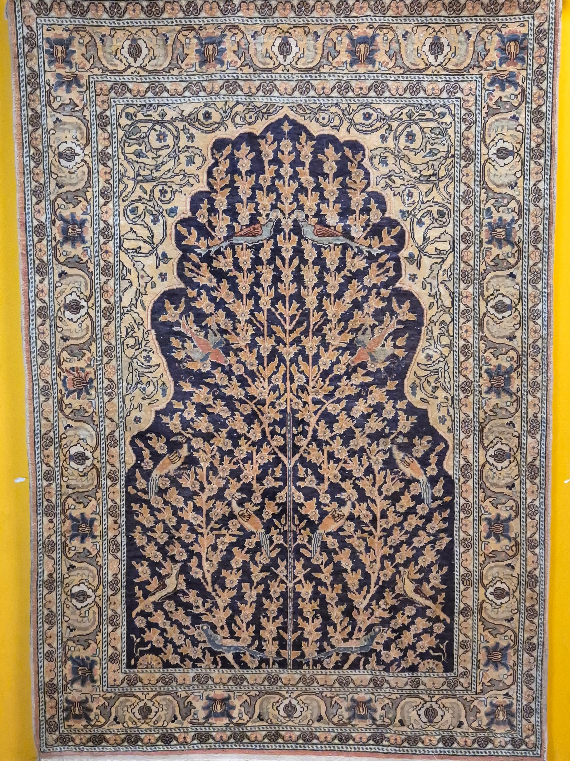 angeboten wird ein dekorativer Kayseri Flosh-Teppich in handgeknüpfter Ausführung. Das Hauptmotiv zeigt den Lebensbaum, dessen goldfarbene Ranken sich auf einem tiefblauen Fond erheben. Zwischen den Zweigen sind kunstvoll Vögel eingearbeitet, die dem Teppich eine lebendige und symbolische Ausstrahlung verleihen. Die helle Bordüre mit floralen Ornamenten und Medaillons rahmt die Mittelpartie harmonisch ein.