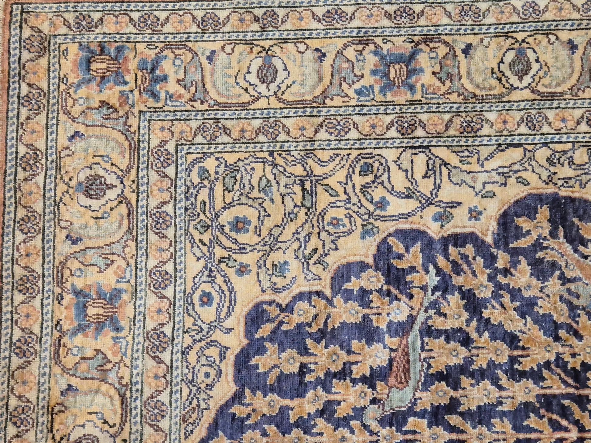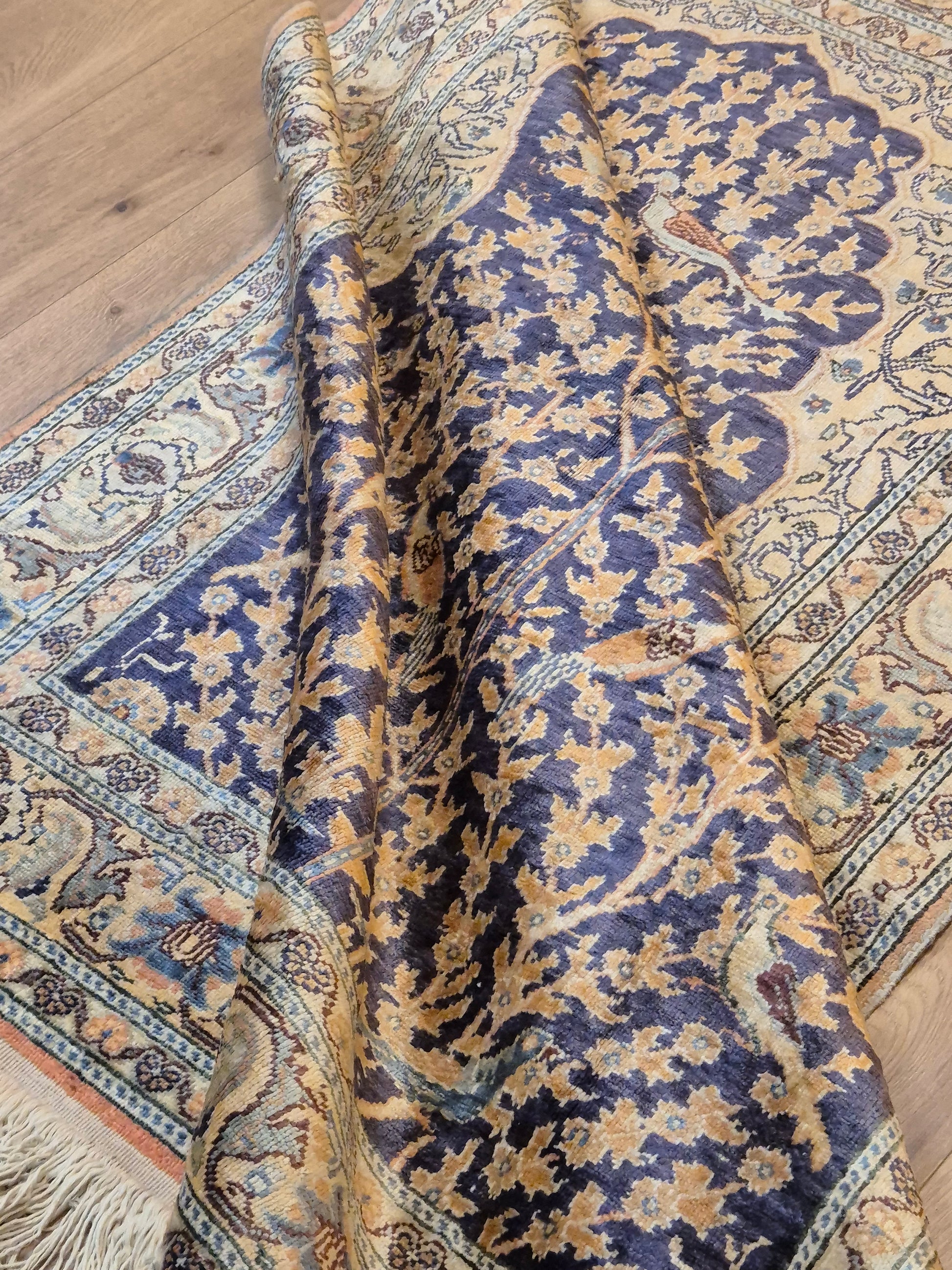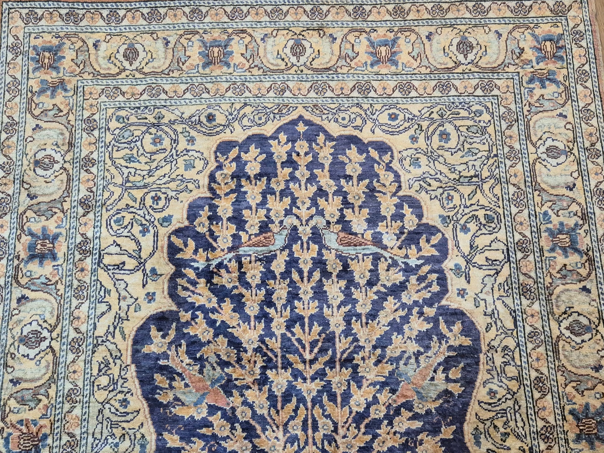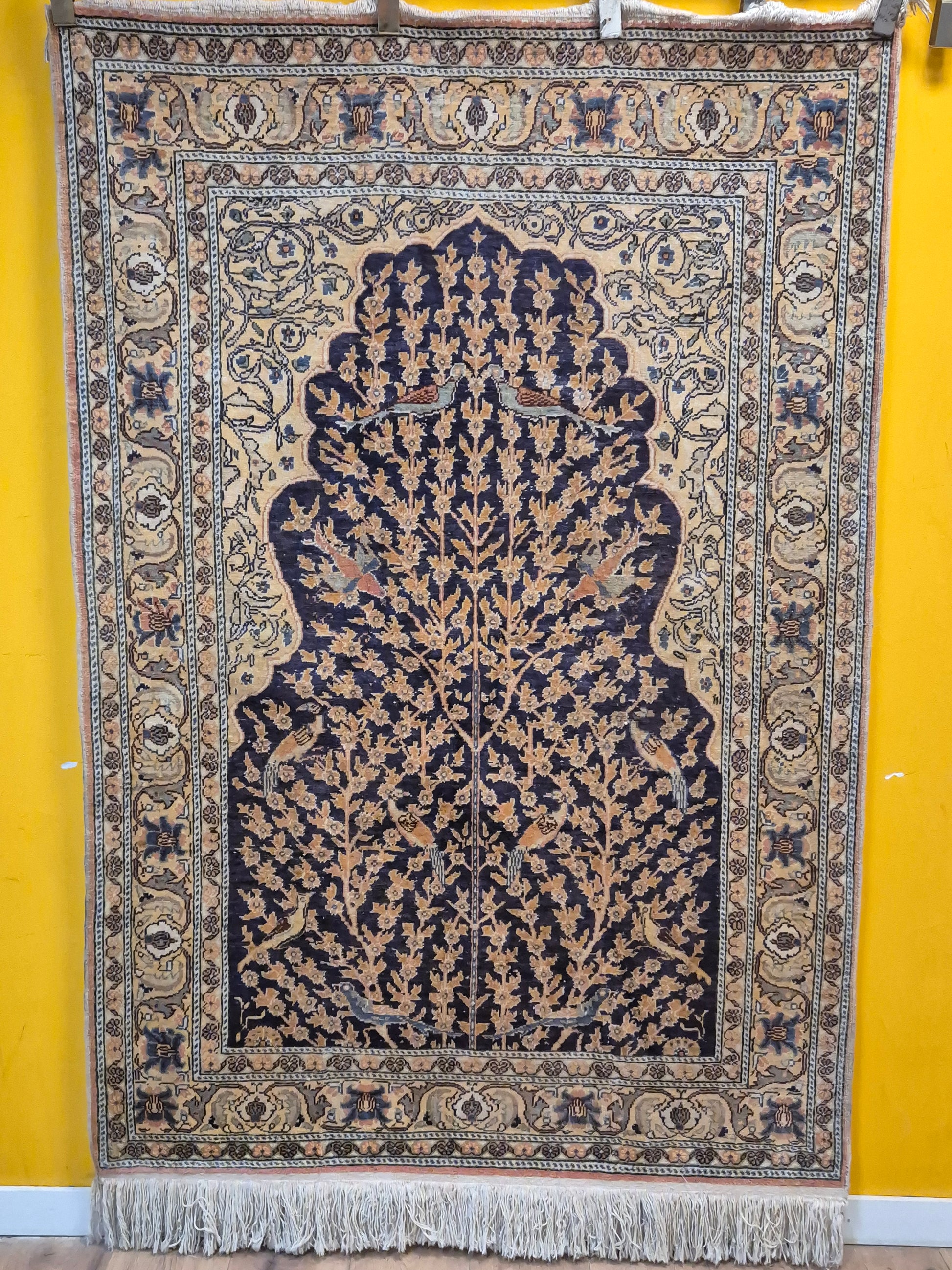 angeboten wird ein dekorativer Kayseri Flosh-Teppich in handgeknüpfter Ausführung. Das Hauptmotiv zeigt den Lebensbaum, dessen goldfarbene Ranken sich auf einem tiefblauen Fond erheben. Zwischen den Zweigen sind kunstvoll Vögel eingearbeitet, die dem Teppich eine lebendige und symbolische Ausstrahlung verleihen. Die helle Bordüre mit floralen Ornamenten und Medaillons rahmt die Mittelpartie harmonisch ein.