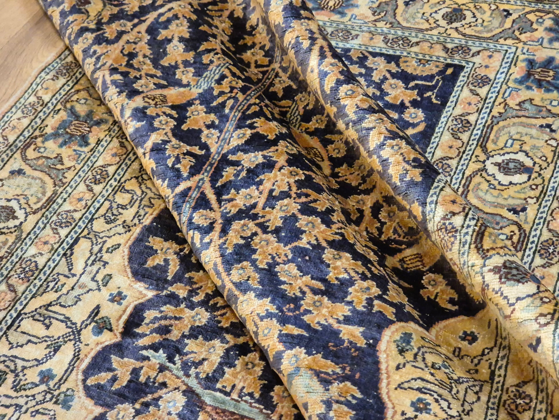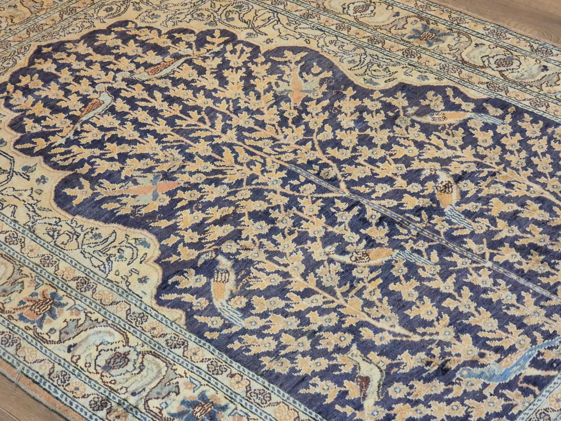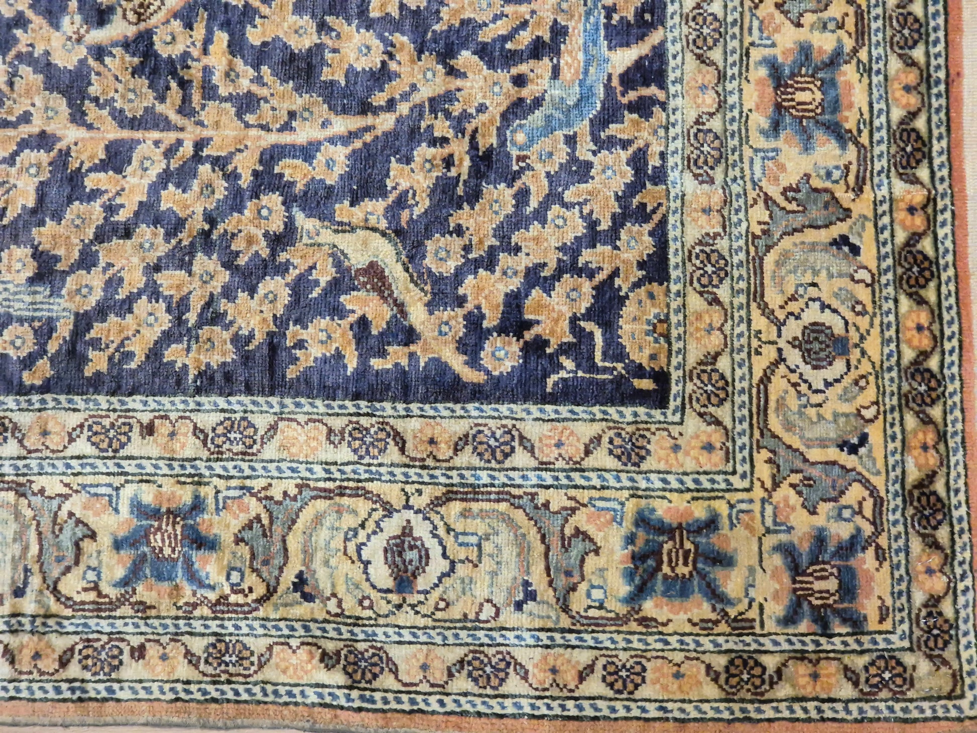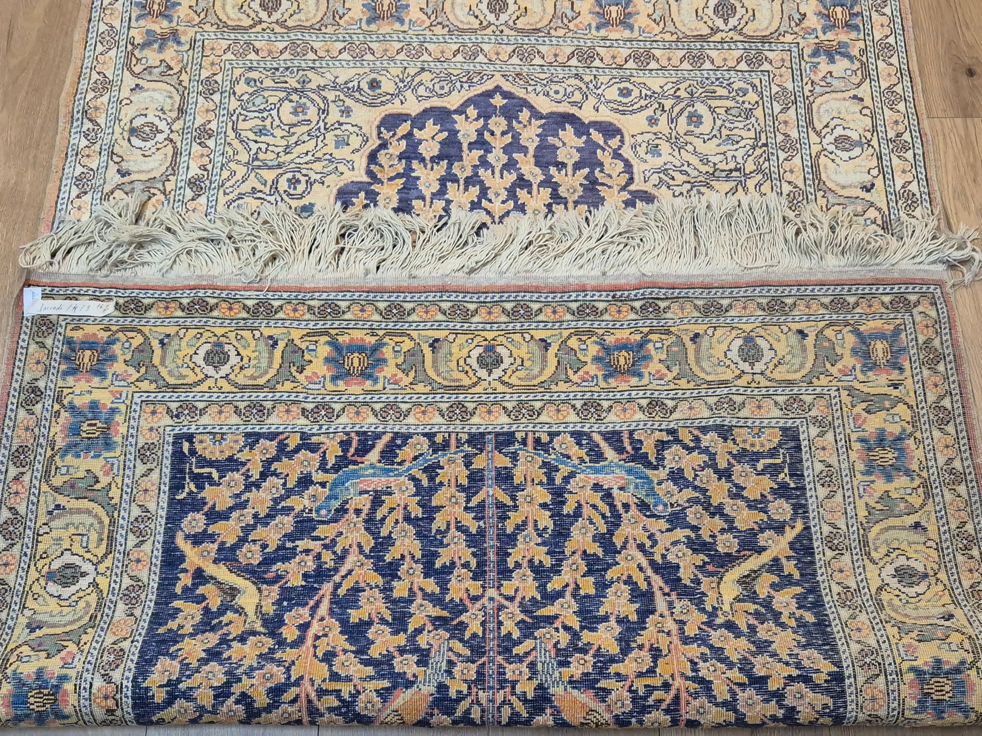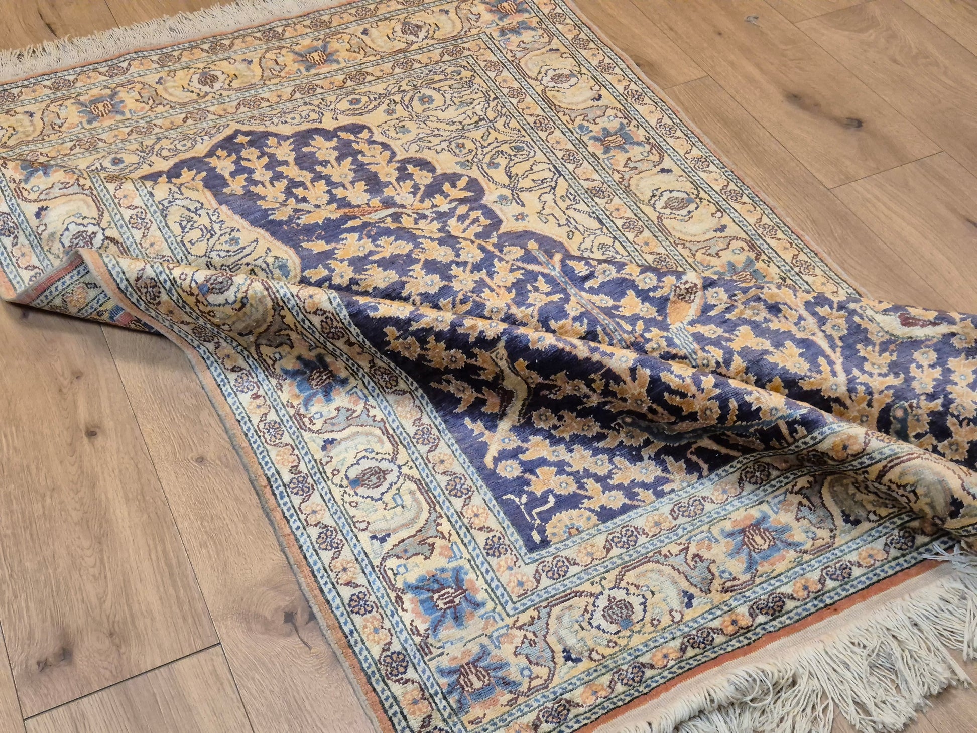 angeboten wird ein dekorativer Kayseri Flosh-Teppich in handgeknüpfter Ausführung. Das Hauptmotiv zeigt den Lebensbaum, dessen goldfarbene Ranken sich auf einem tiefblauen Fond erheben. Zwischen den Zweigen sind kunstvoll Vögel eingearbeitet, die dem Teppich eine lebendige und symbolische Ausstrahlung verleihen. Die helle Bordüre mit floralen Ornamenten und Medaillons rahmt die Mittelpartie harmonisch ein.