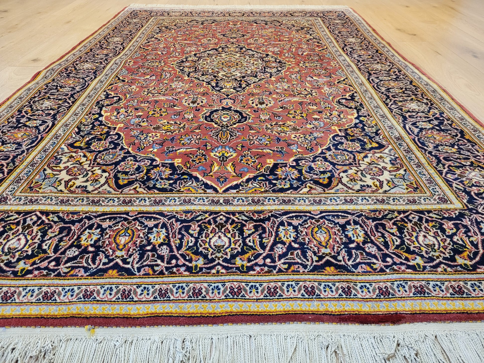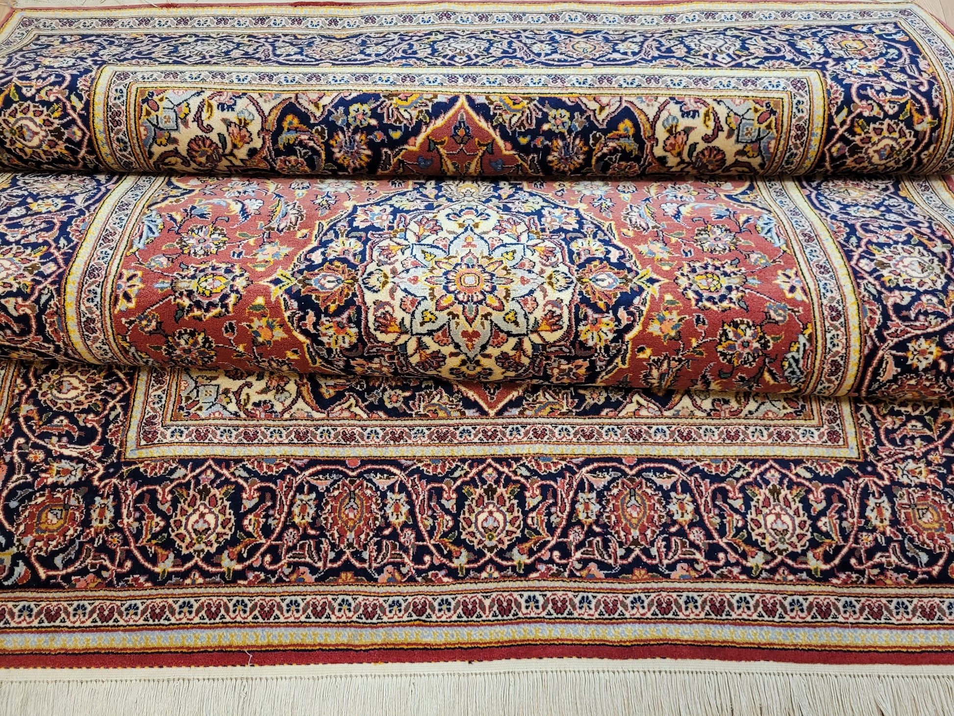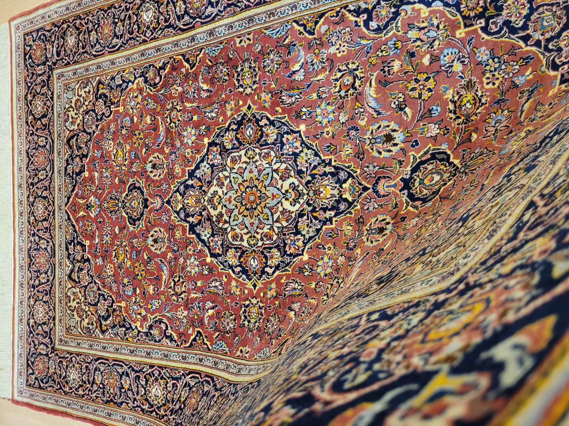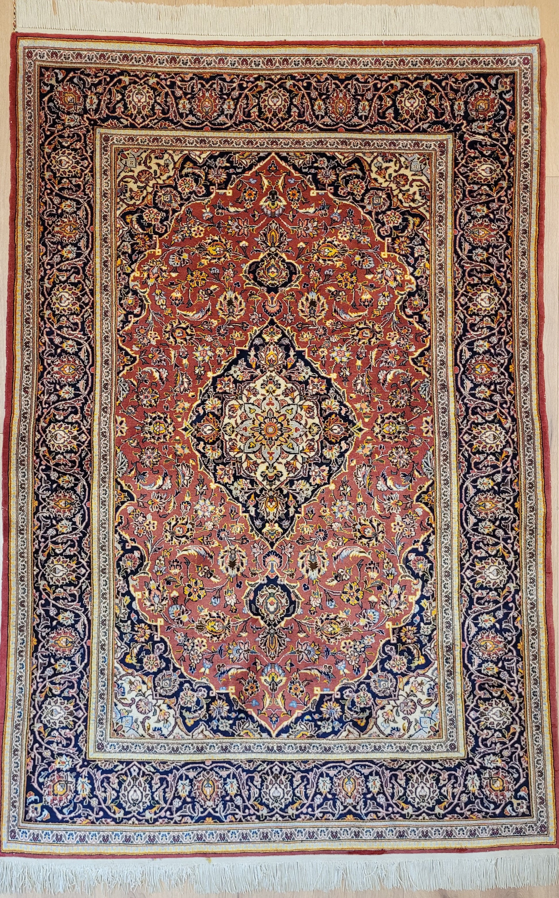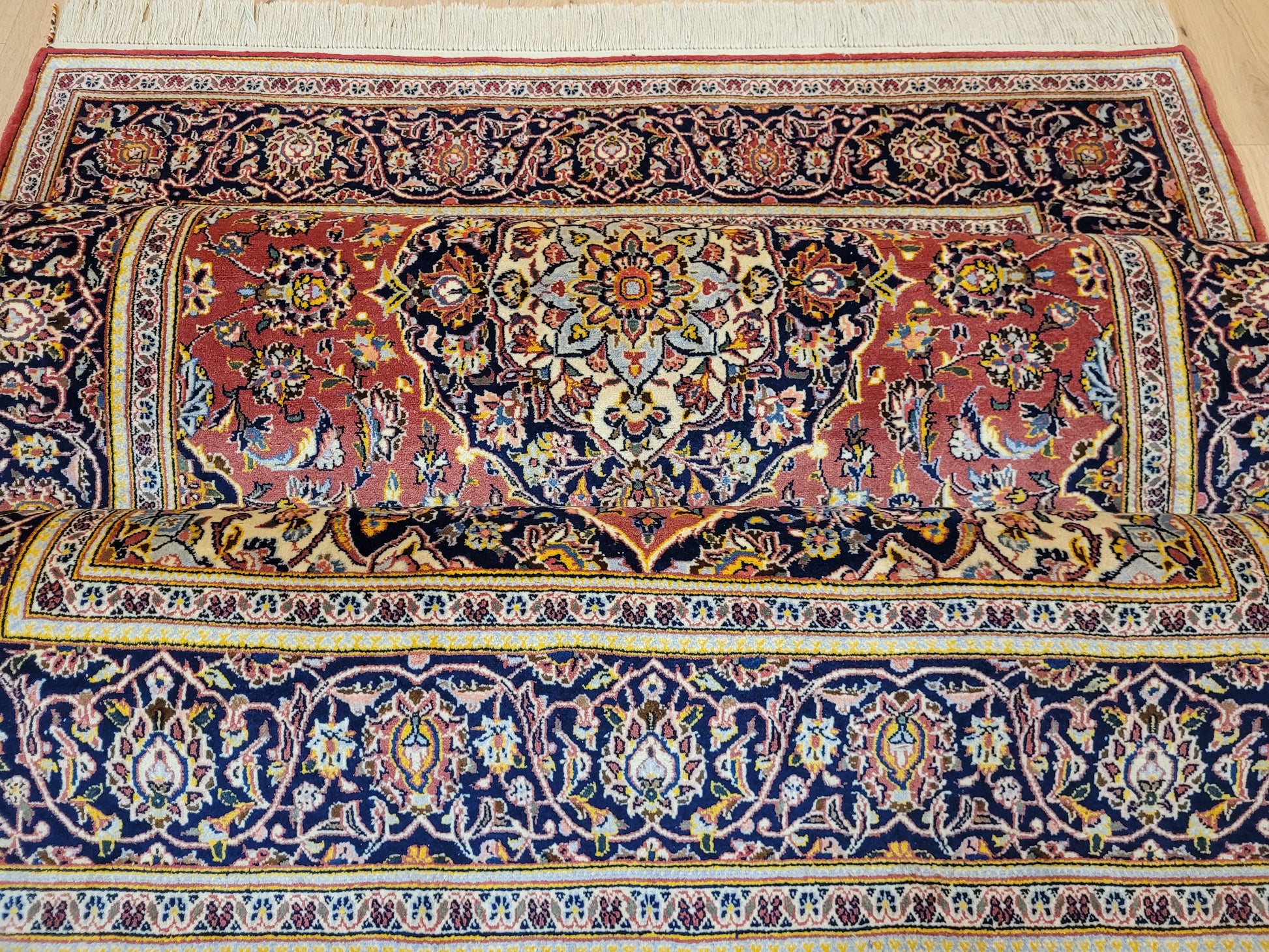 angeboten wird ein edler Keschan Teppich, handgeknüpft aus feiner Korkwolle in dichter Knüpfung gearbeitet. Das klassische Design zeigt ein zentrales Medaillon mit umlaufenden Arabesken und floralen Mustern, eingerahmt von einer kunstvoll gestalteten Bordüre. Die Komposition verbindet traditionelle Ornamentik mit harmonischer Farbgebung und feiner Ausführung.