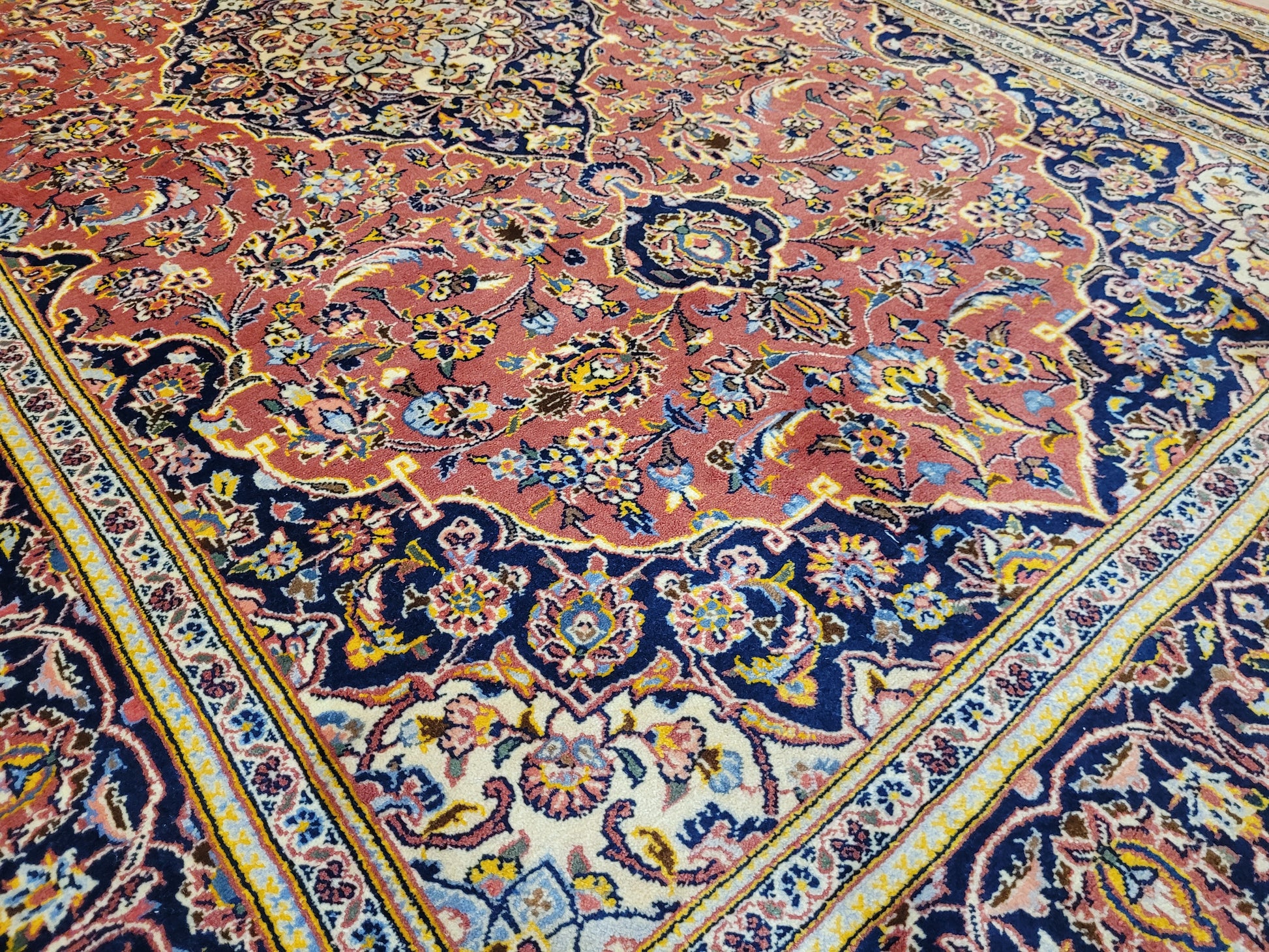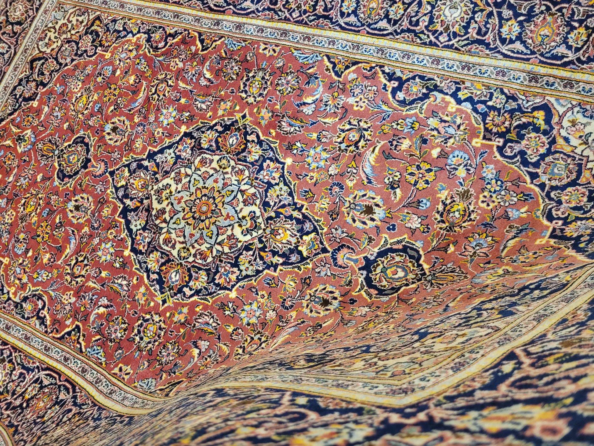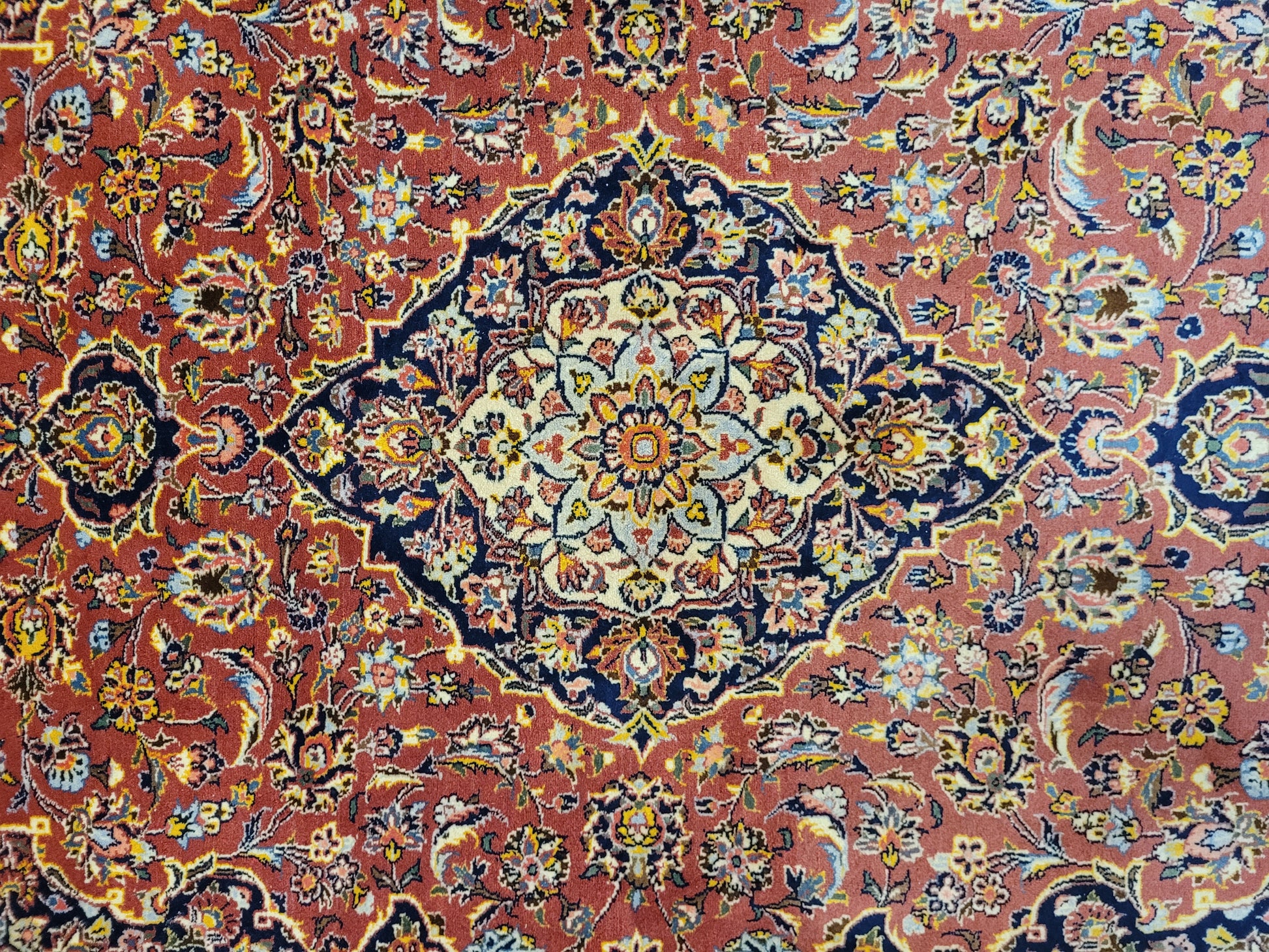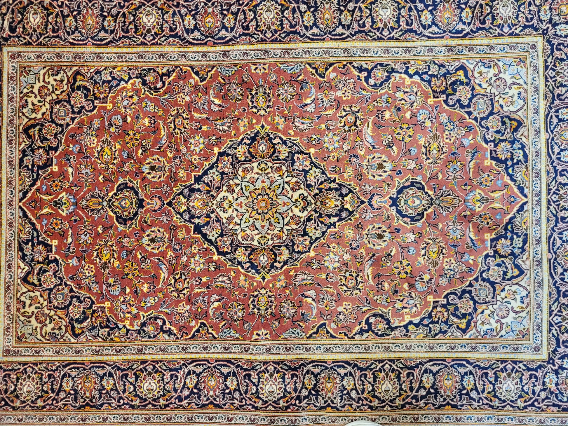 angeboten wird ein edler Keschan Teppich, handgeknüpft aus feiner Korkwolle in dichter Knüpfung gearbeitet. Das klassische Design zeigt ein zentrales Medaillon mit umlaufenden Arabesken und floralen Mustern, eingerahmt von einer kunstvoll gestalteten Bordüre. Die Komposition verbindet traditionelle Ornamentik mit harmonischer Farbgebung und feiner Ausführung.