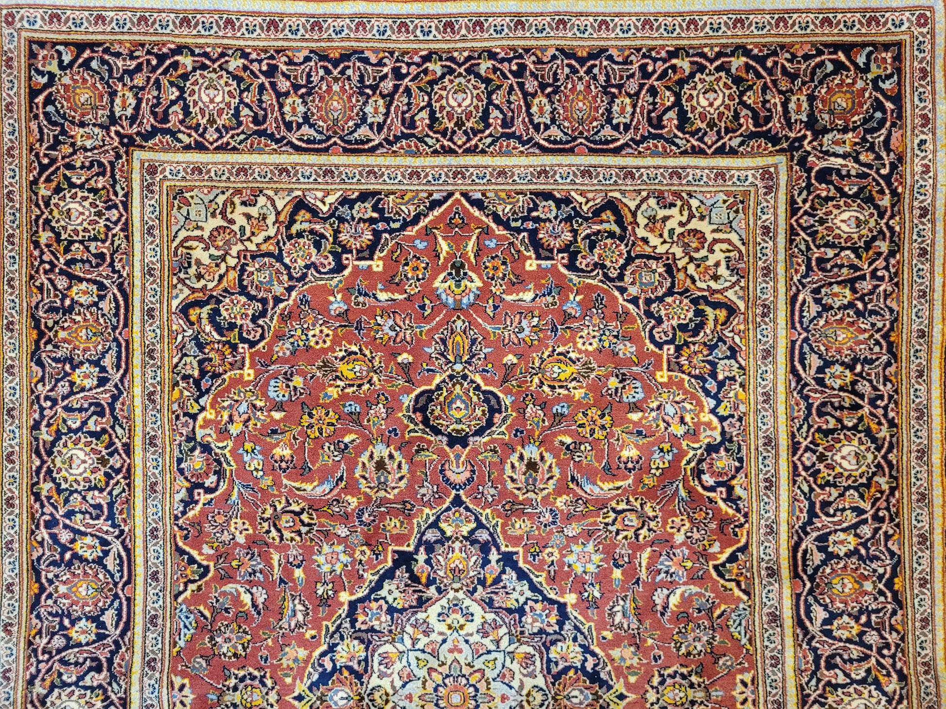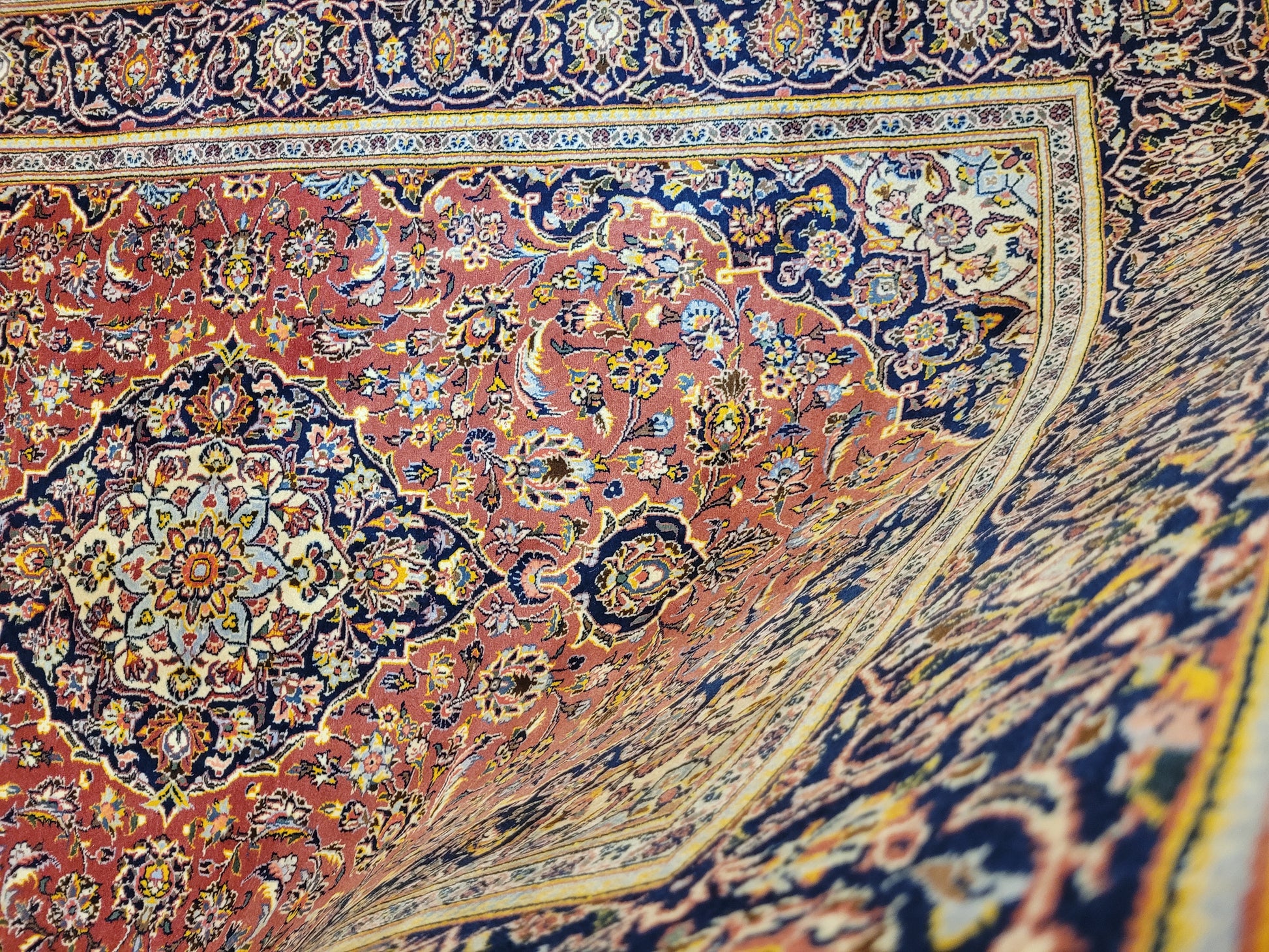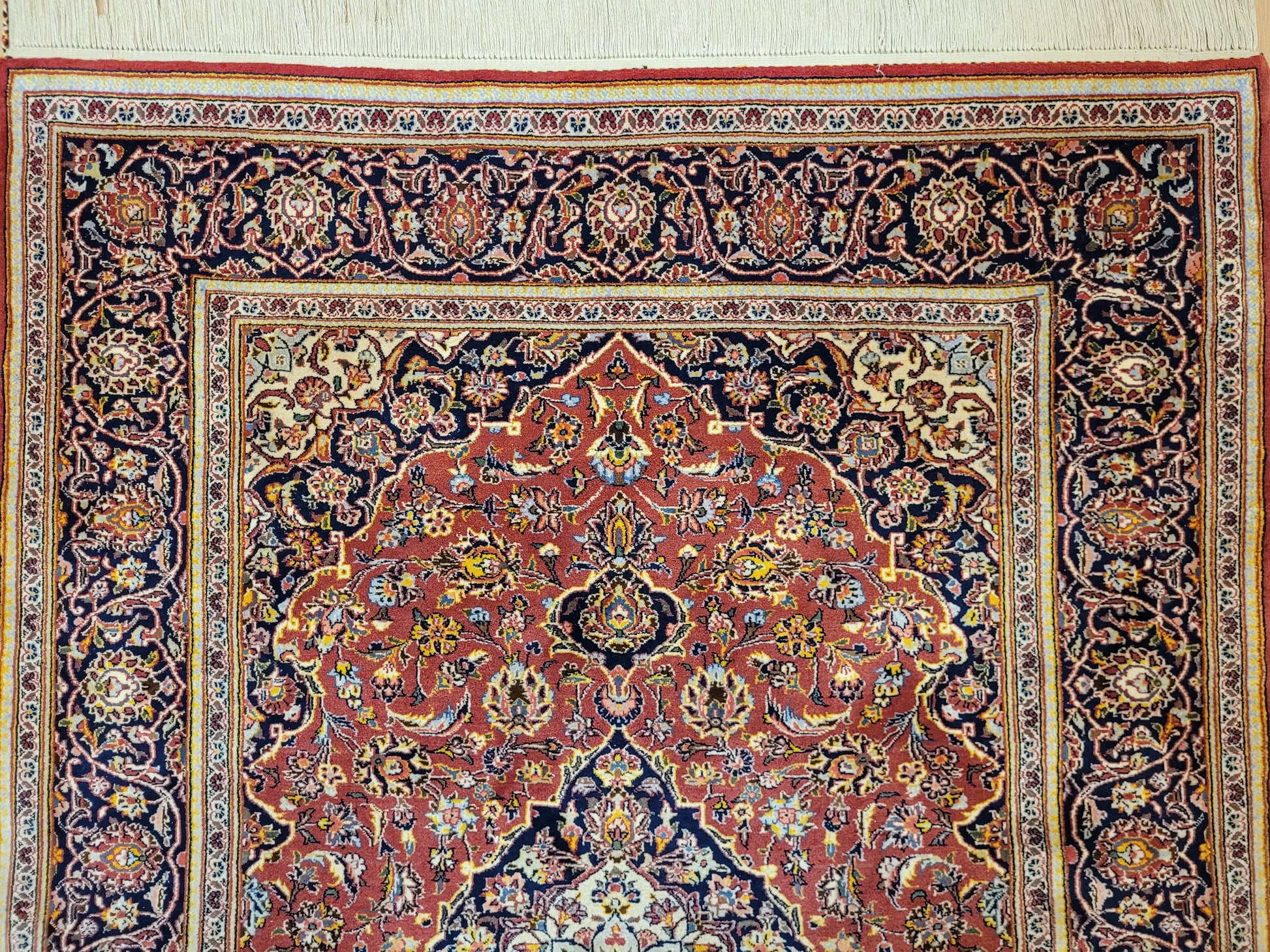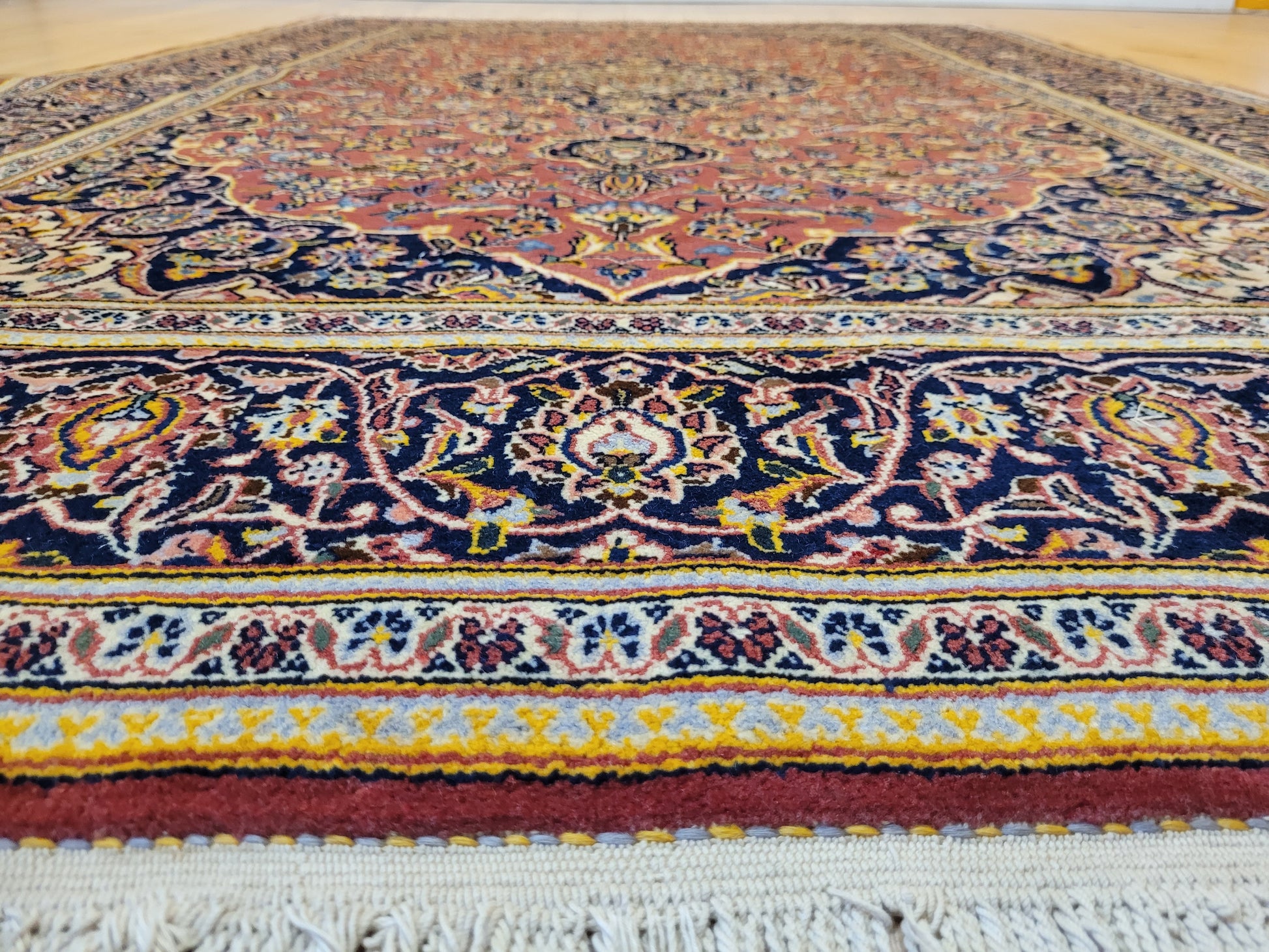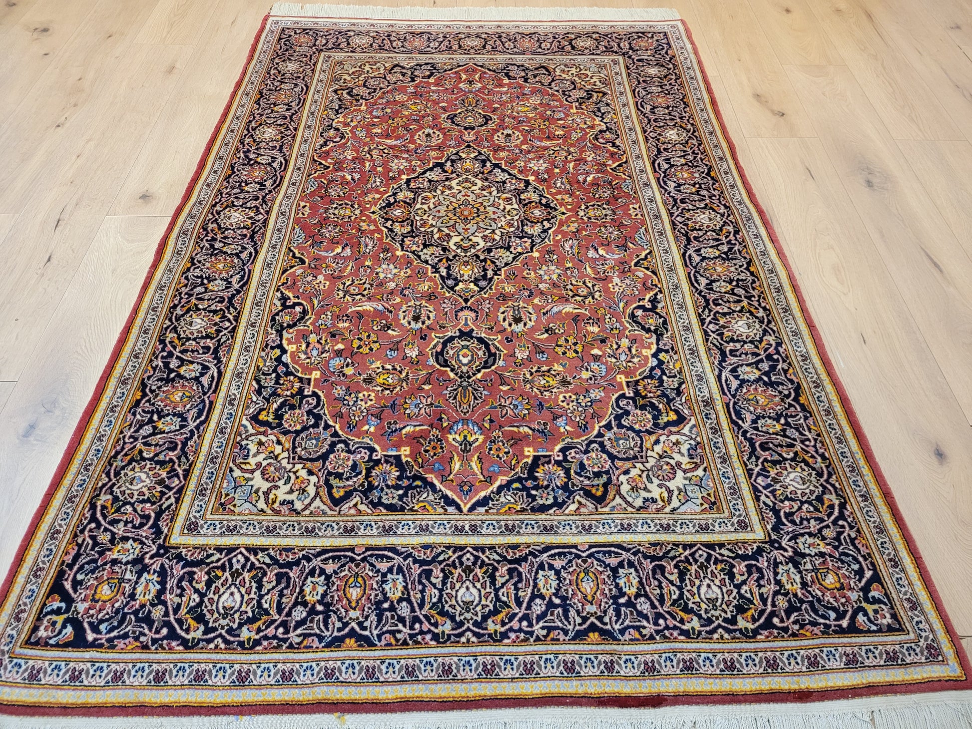 angeboten wird ein edler Keschan Teppich, handgeknüpft aus feiner Korkwolle in dichter Knüpfung gearbeitet. Das klassische Design zeigt ein zentrales Medaillon mit umlaufenden Arabesken und floralen Mustern, eingerahmt von einer kunstvoll gestalteten Bordüre. Die Komposition verbindet traditionelle Ornamentik mit harmonischer Farbgebung und feiner Ausführung.