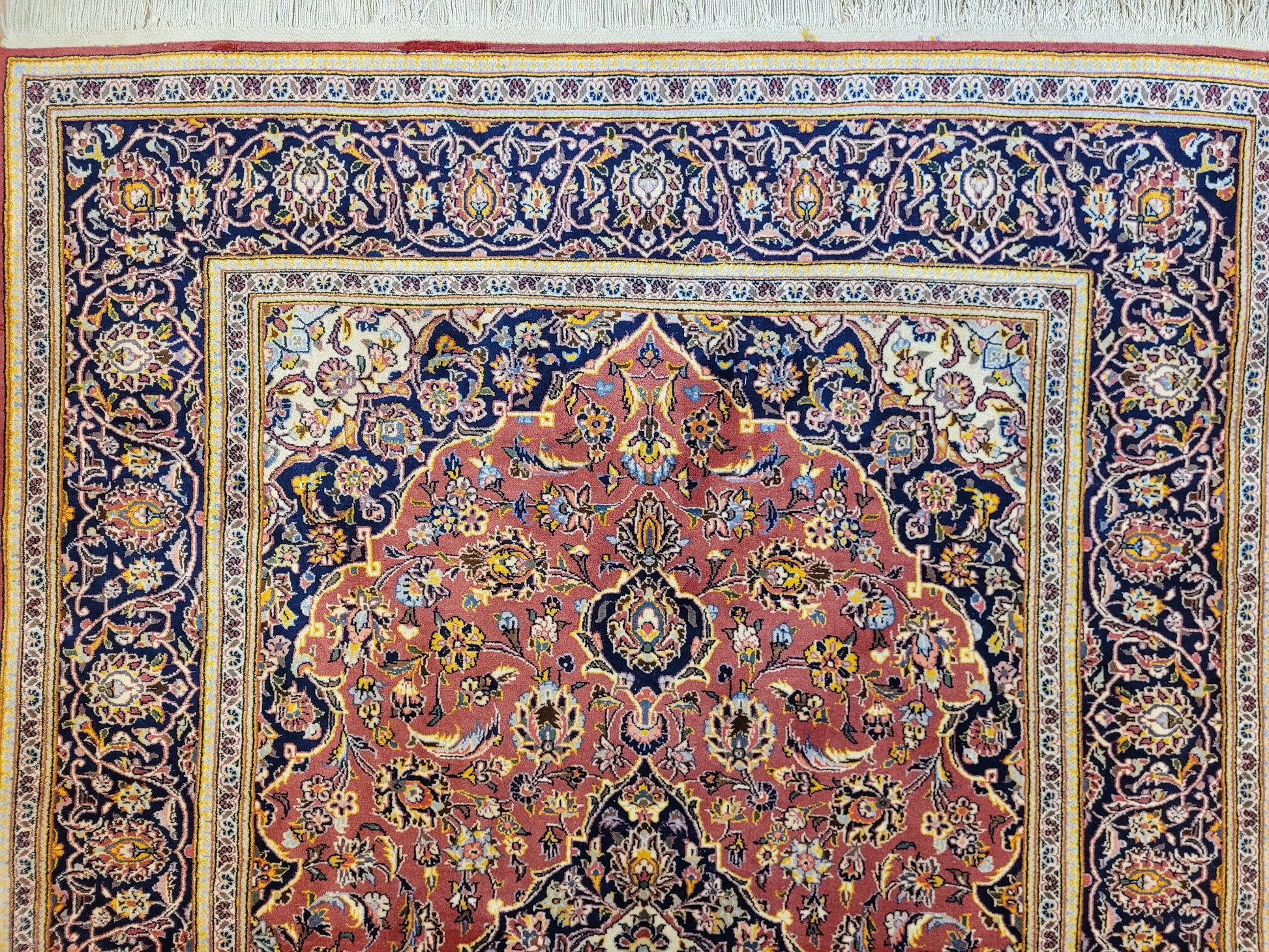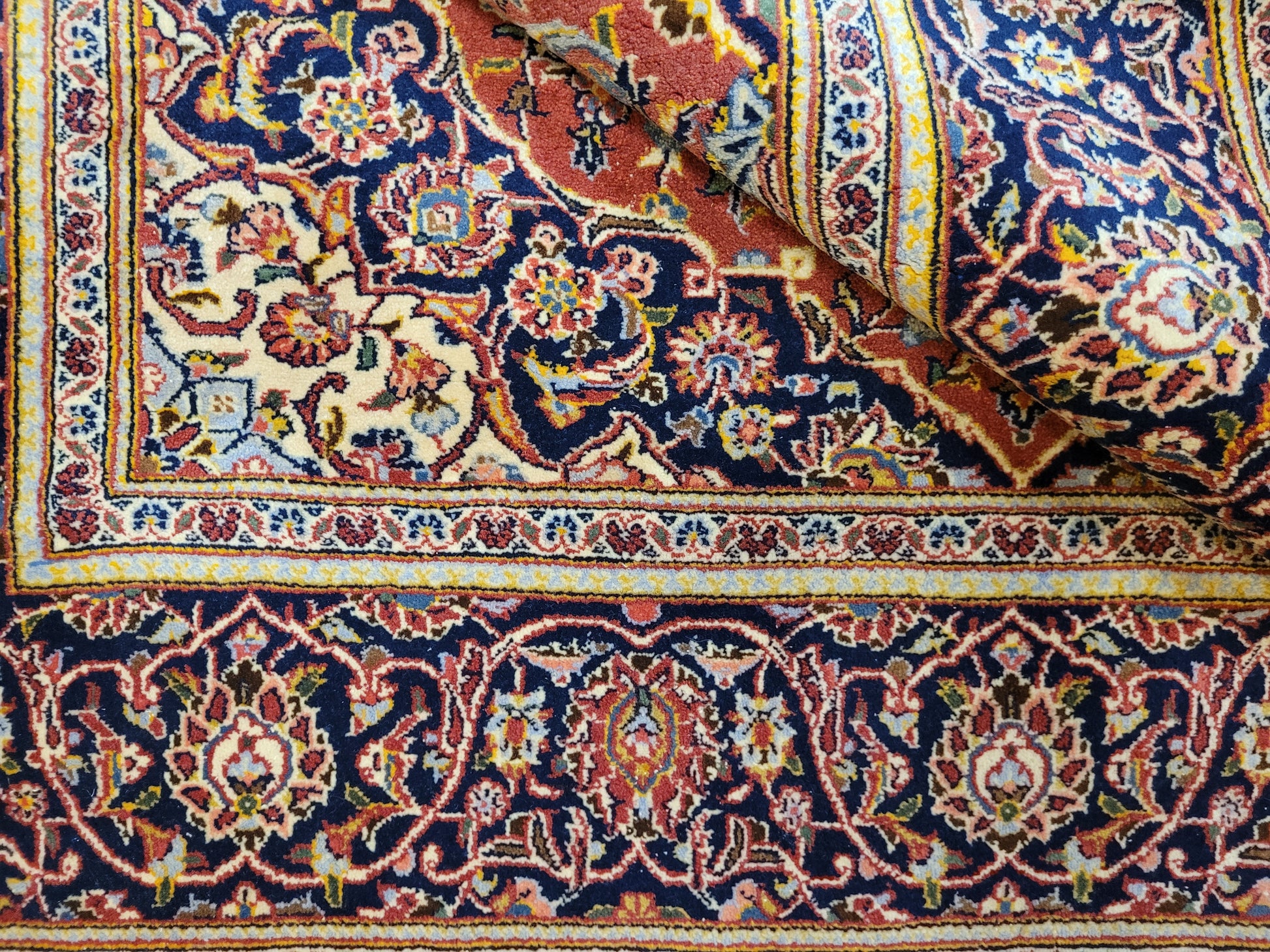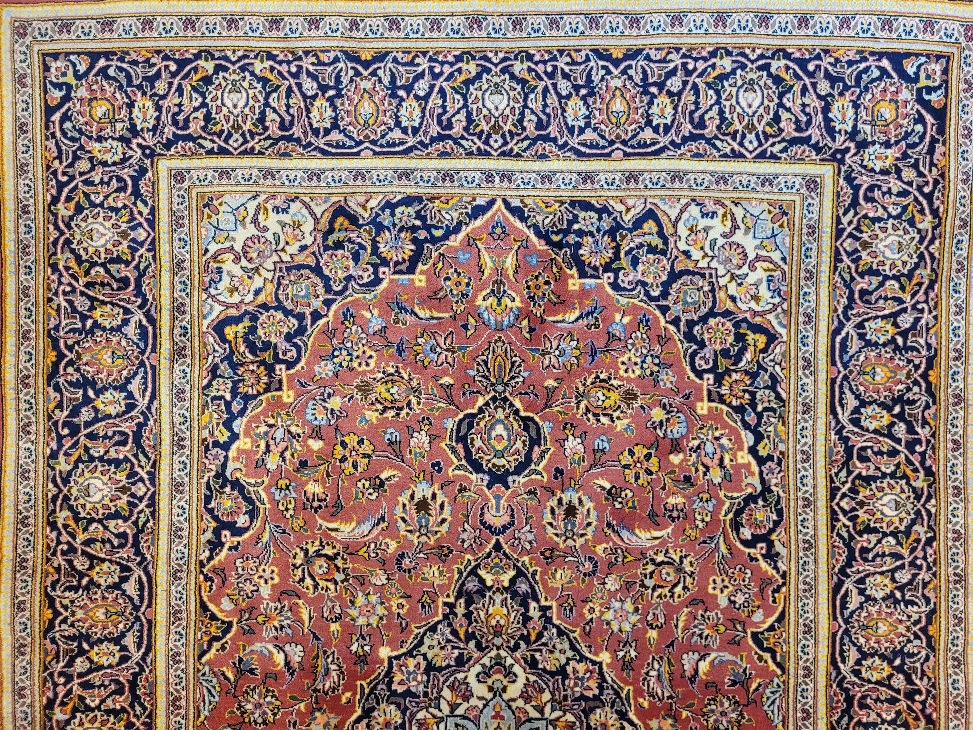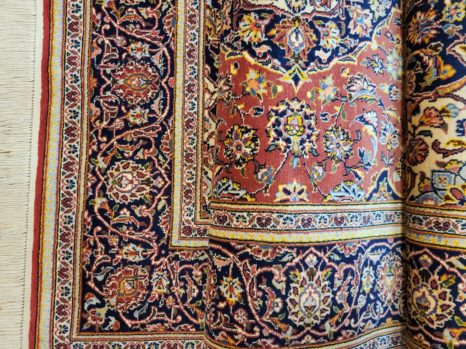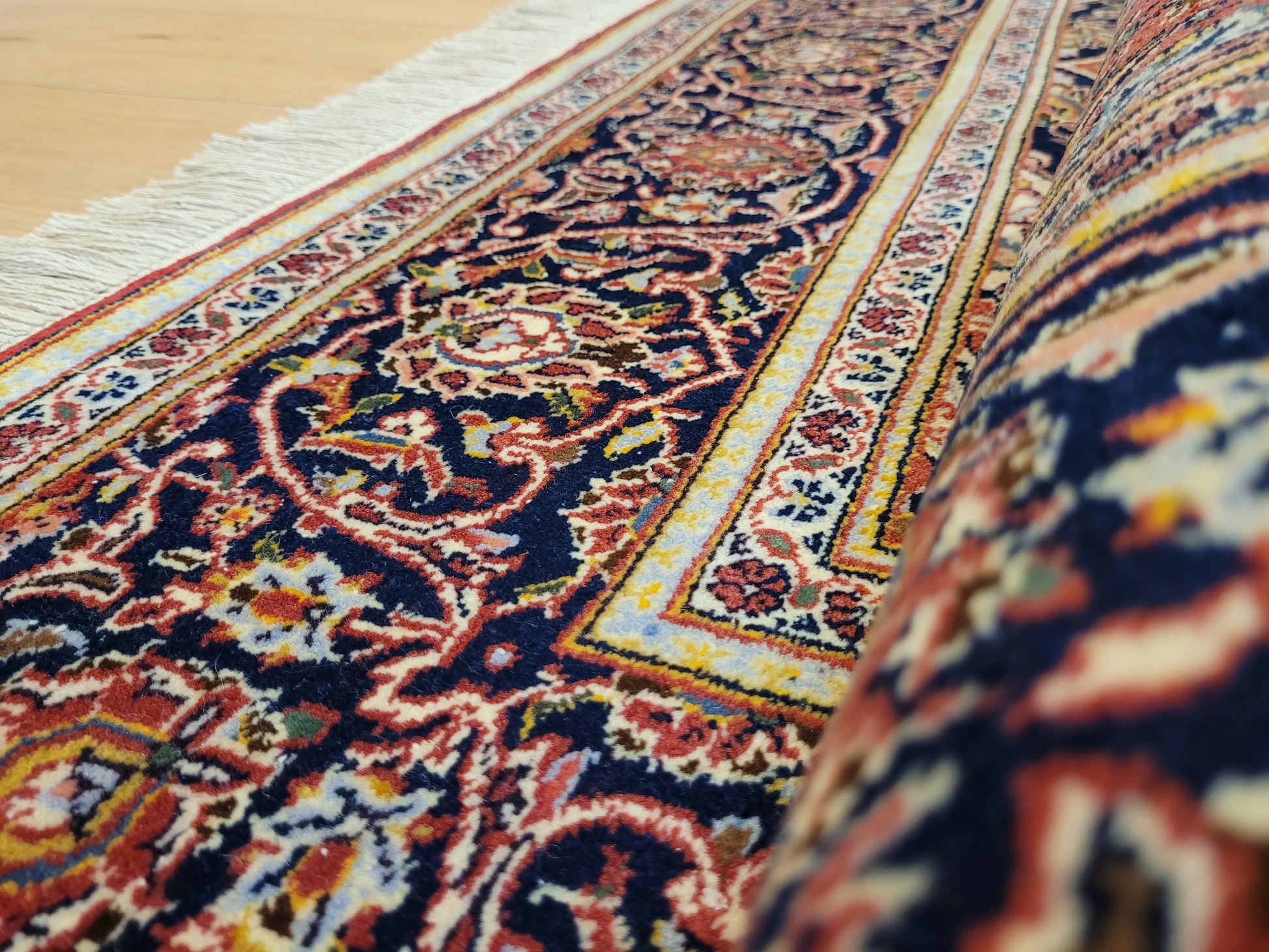 angeboten wird ein edler Keschan Teppich, handgeknüpft aus feiner Korkwolle in dichter Knüpfung gearbeitet. Das klassische Design zeigt ein zentrales Medaillon mit umlaufenden Arabesken und floralen Mustern, eingerahmt von einer kunstvoll gestalteten Bordüre. Die Komposition verbindet traditionelle Ornamentik mit harmonischer Farbgebung und feiner Ausführung.