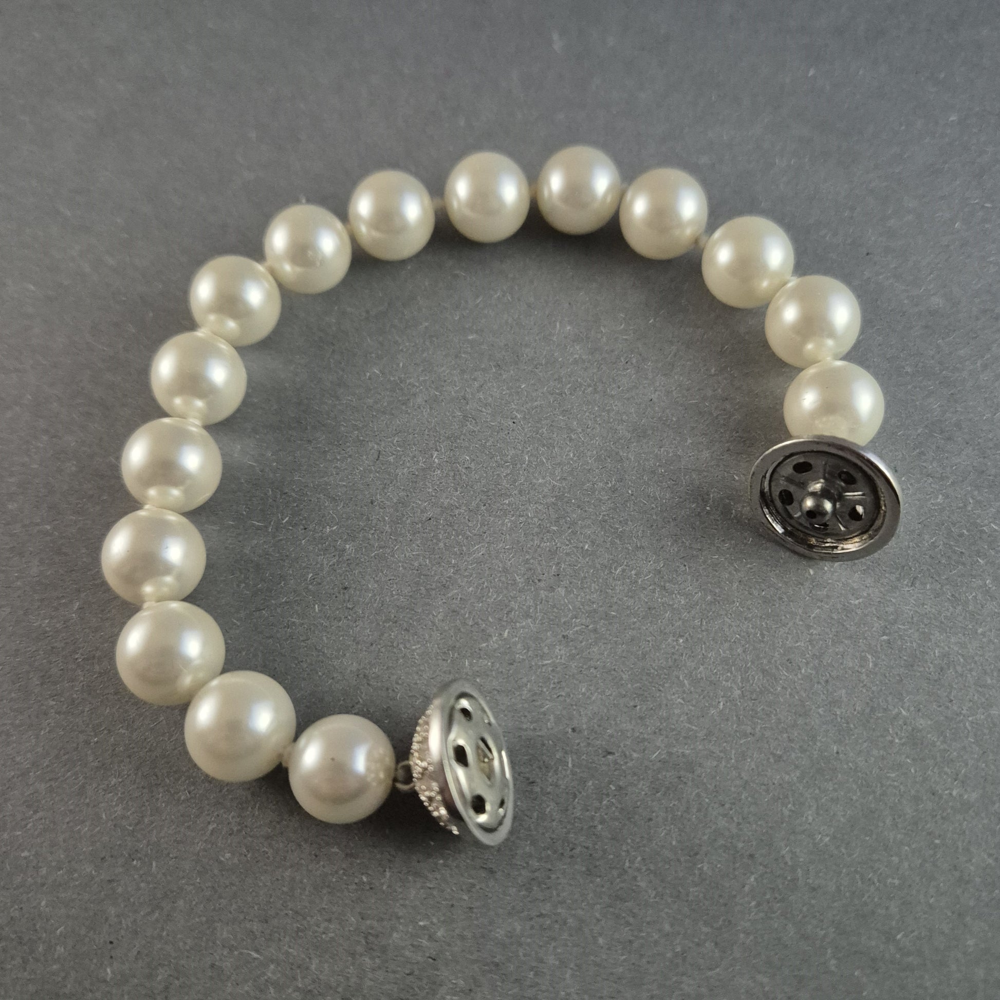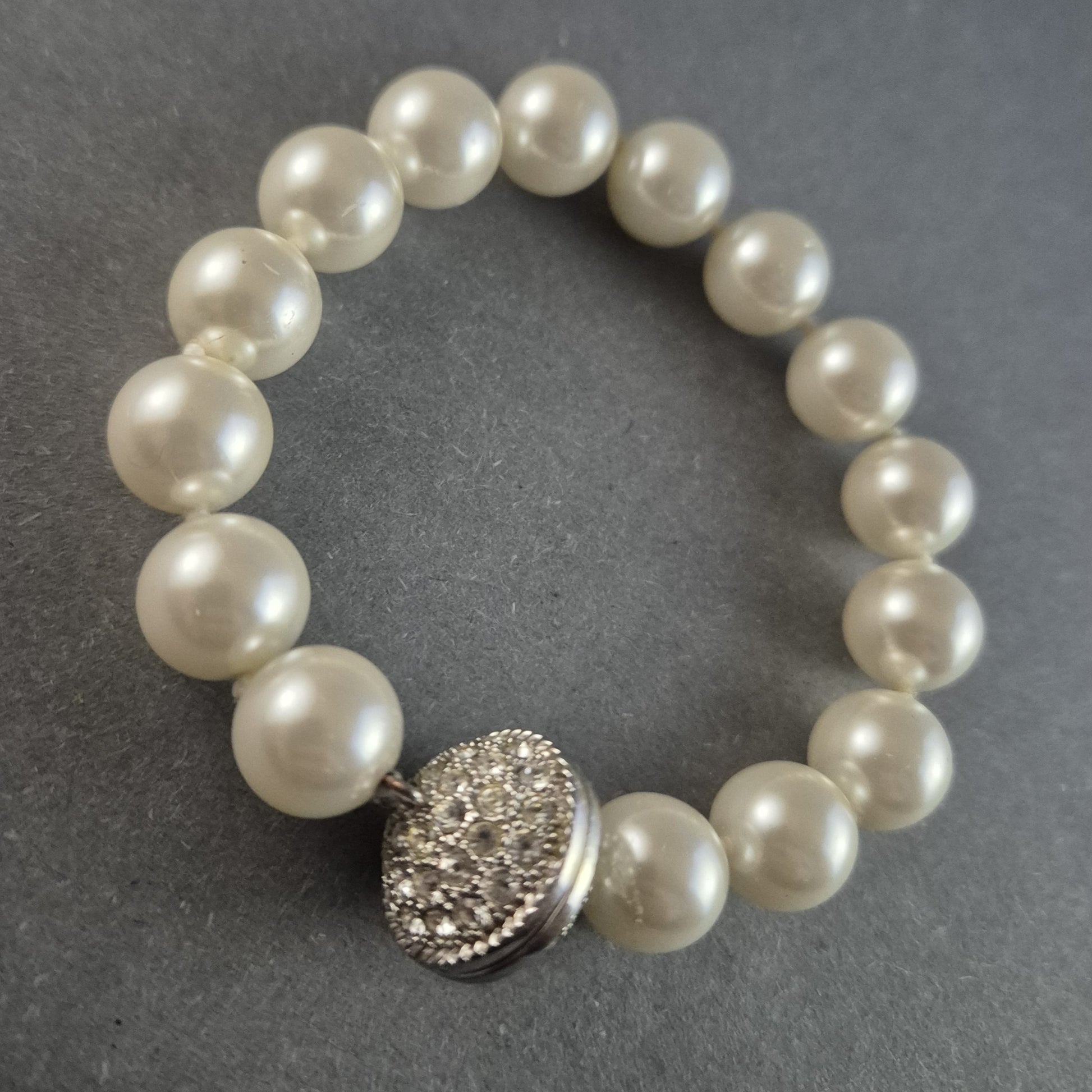 Dieses stilvolle Perlenarmband besticht durch seine edlen, gleichmäßig großen Kunstperlen in glänzendem Weiß. Der hochwertige Magnetverschluss mit funkelnden Strasssteinen sorgt für ein luxuriöses Finish und erleichtert das An- und Ablegen des Armbands. Ein zeitloses Accessoire für besondere Anlässe oder den eleganten Alltagslook.