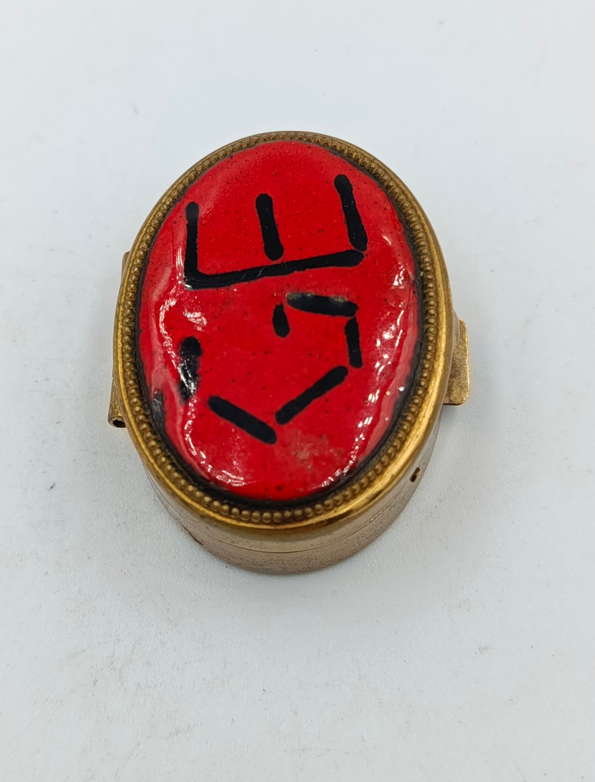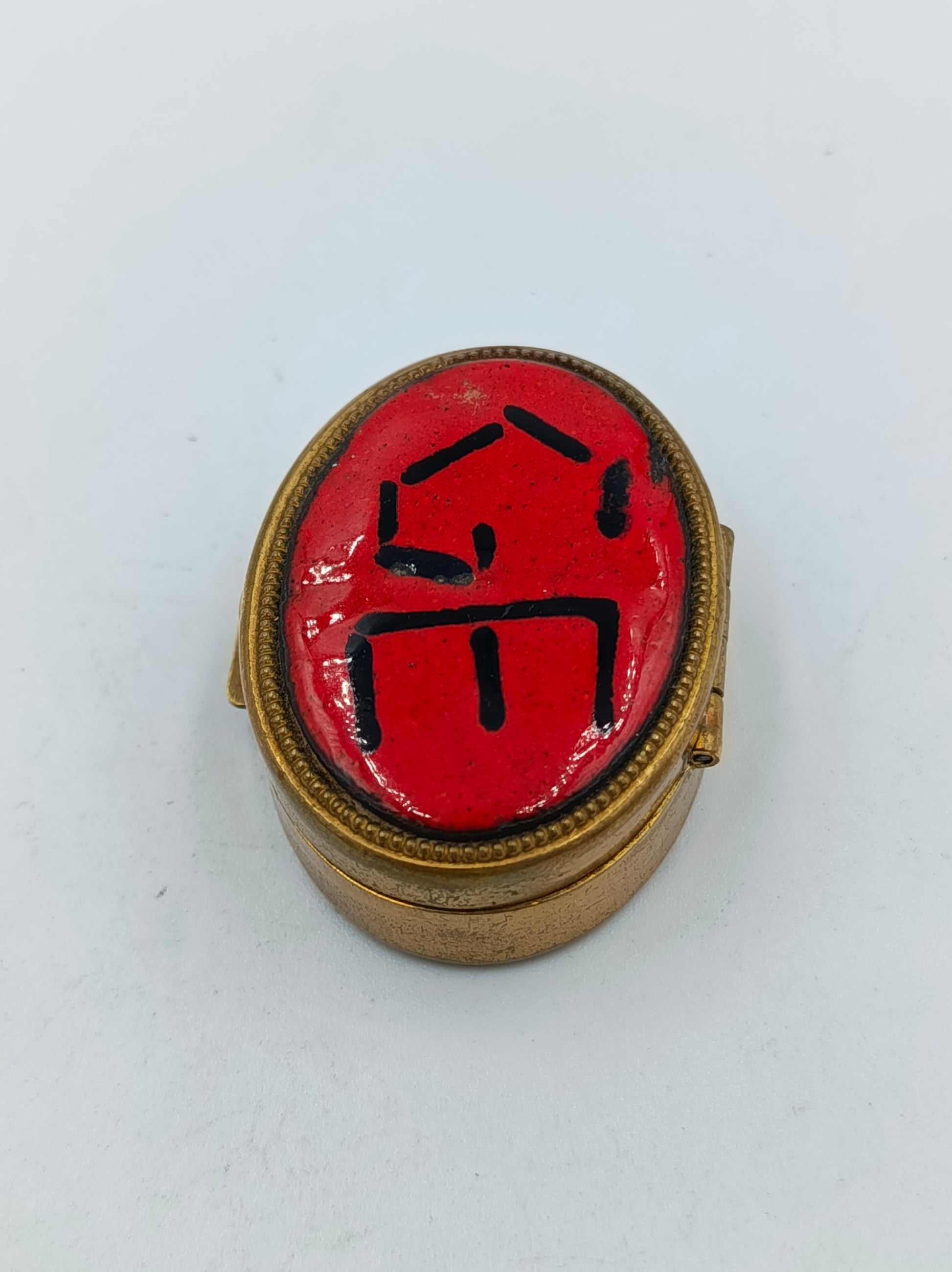 Schöne kleine Vintage-Dose aus Metall in Goldoptik mit rotem, handbemaltem Deckel. Die Dose lässt sich aufklappen und eignet sich ideal zur Aufbewahrung von kleinen Schmuckstücken, Pillen oder anderen Kleinigkeiten.