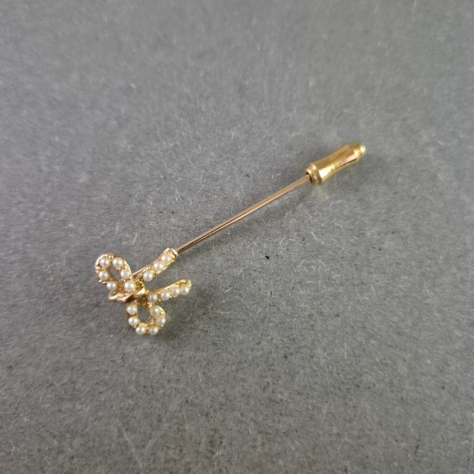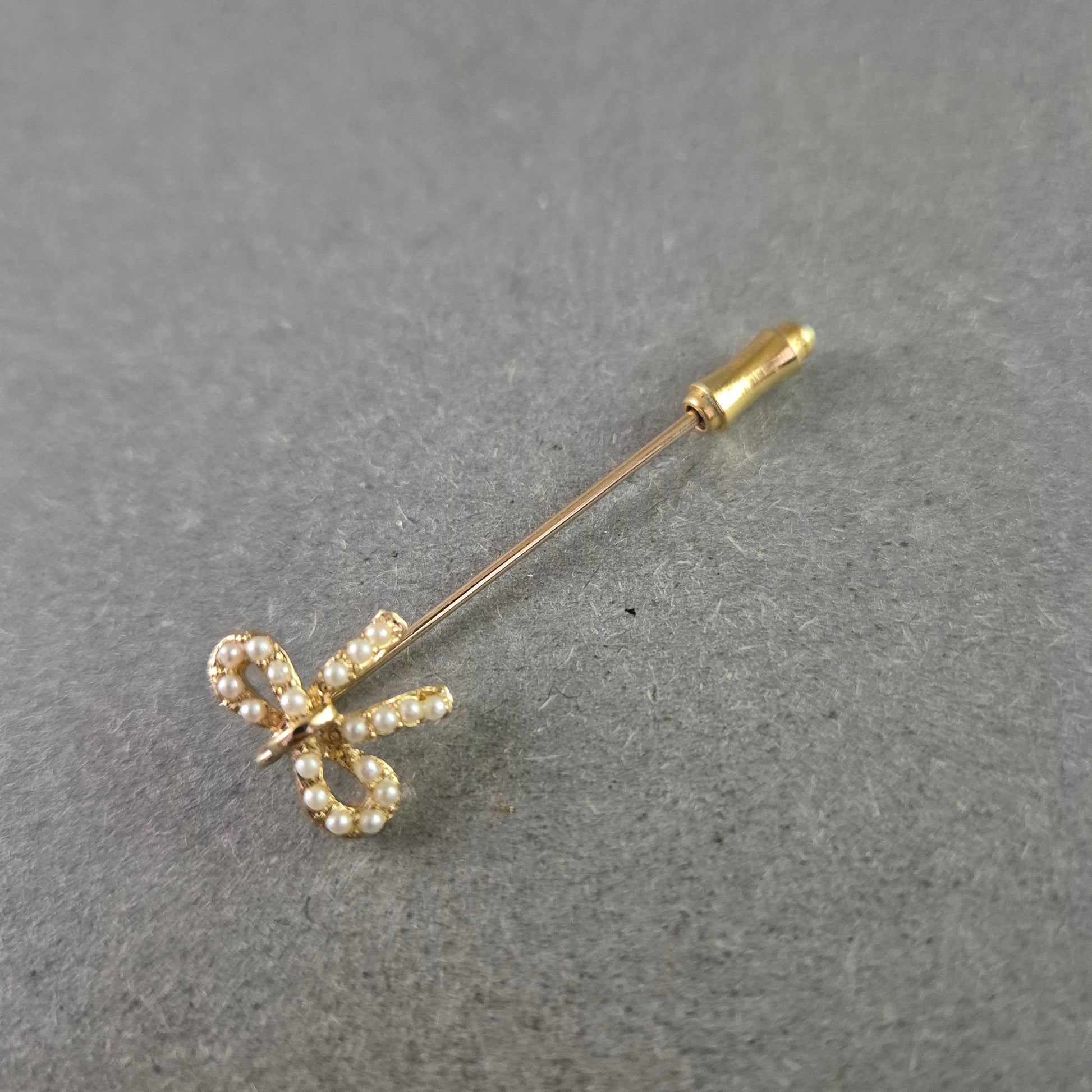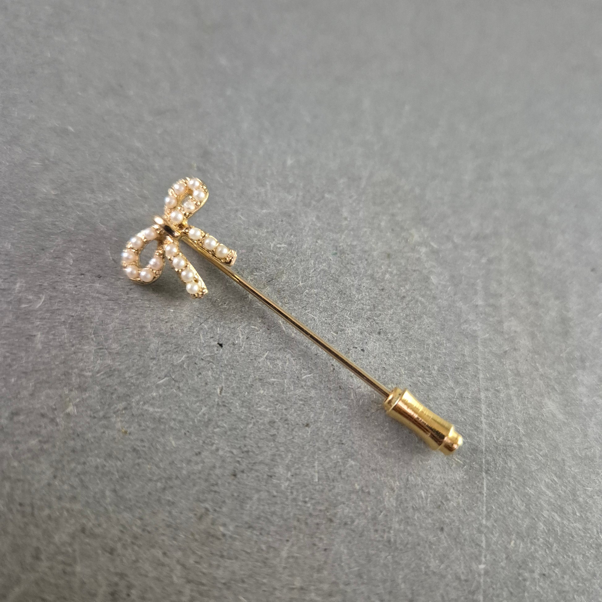 Diese niedliche Vintage Stecknadel besticht durch ihr filigranes Schleifen-Motiv in glänzend goldfarbenem Metall. Ein dezentes Accessoire, das jedem Outfit eine charmante und elegante Note verleiht. Perfekt zum Anstecken an Revers, Schal oder Krawatte.