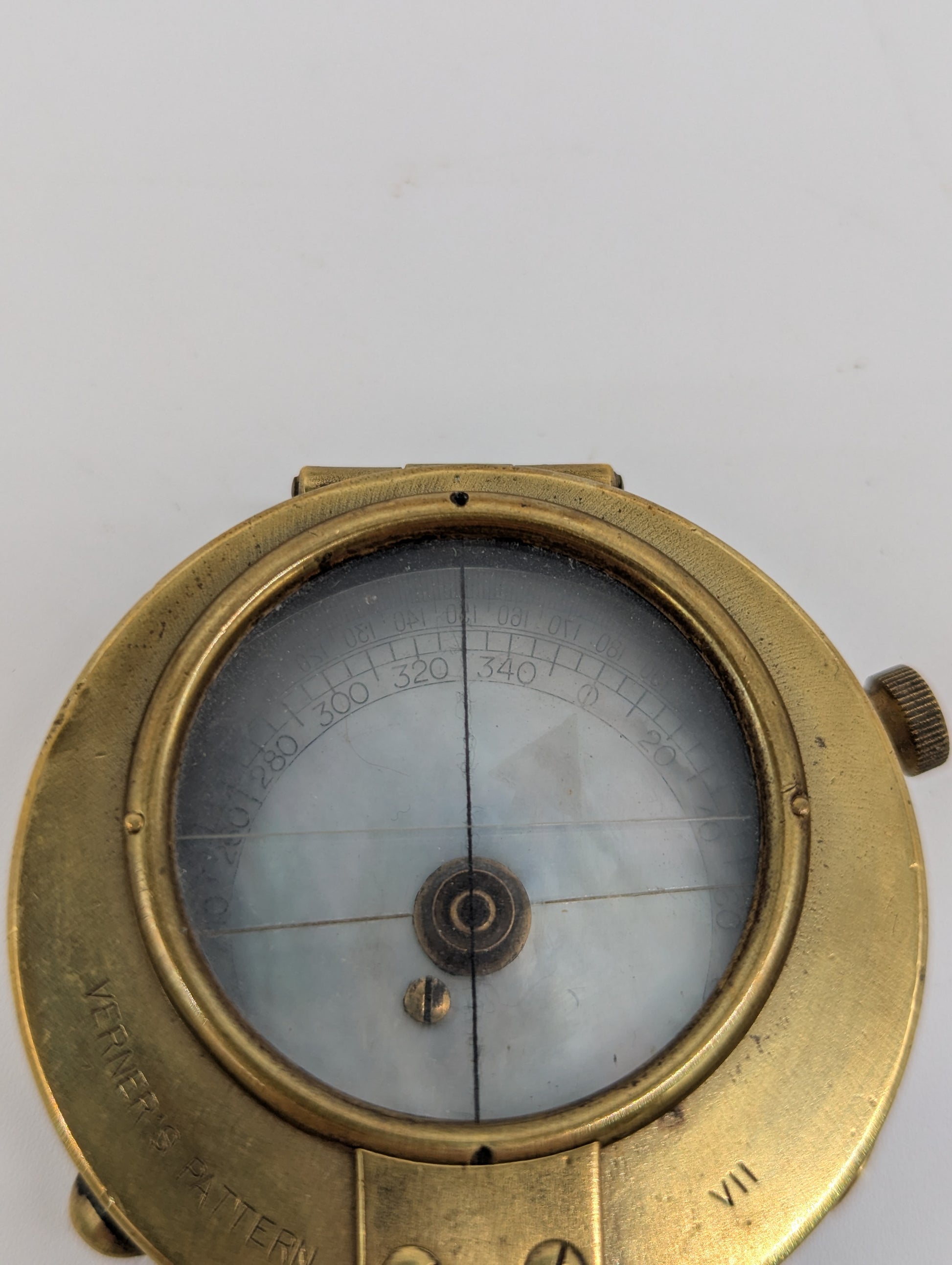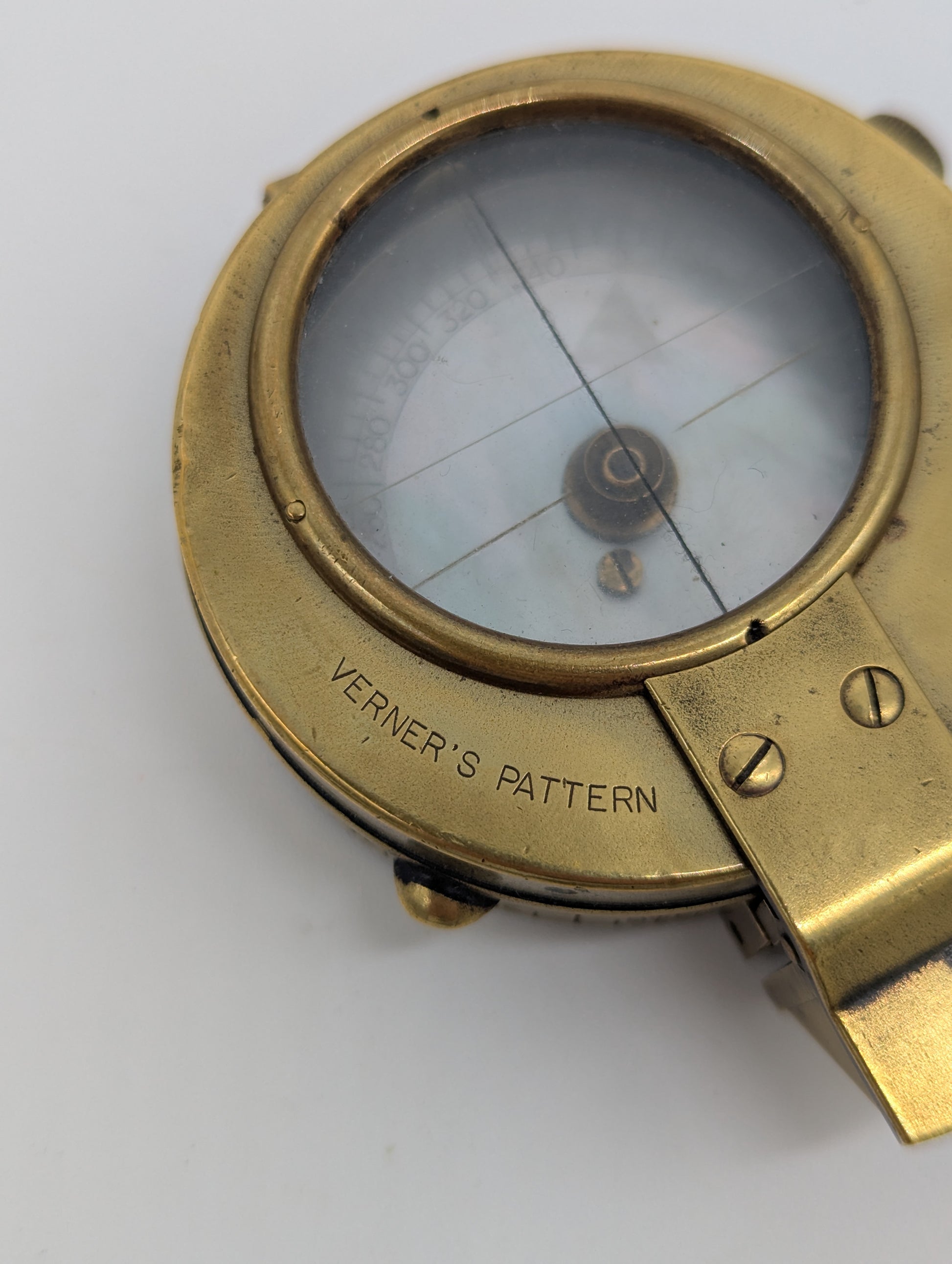 Das runde Gehäuse ist aus massivem Messing gefertigt. Unter dem Glasdeckel liegt die drehbare Kompassscheibe mit Gradskala (0–360°) sowie eine Fadenkreuz-Markierung zur exakten Peilung. Auf der Außenseite ist zusätzlich die Gravur „VERNER’S PATTERN VII“ erkennbar.