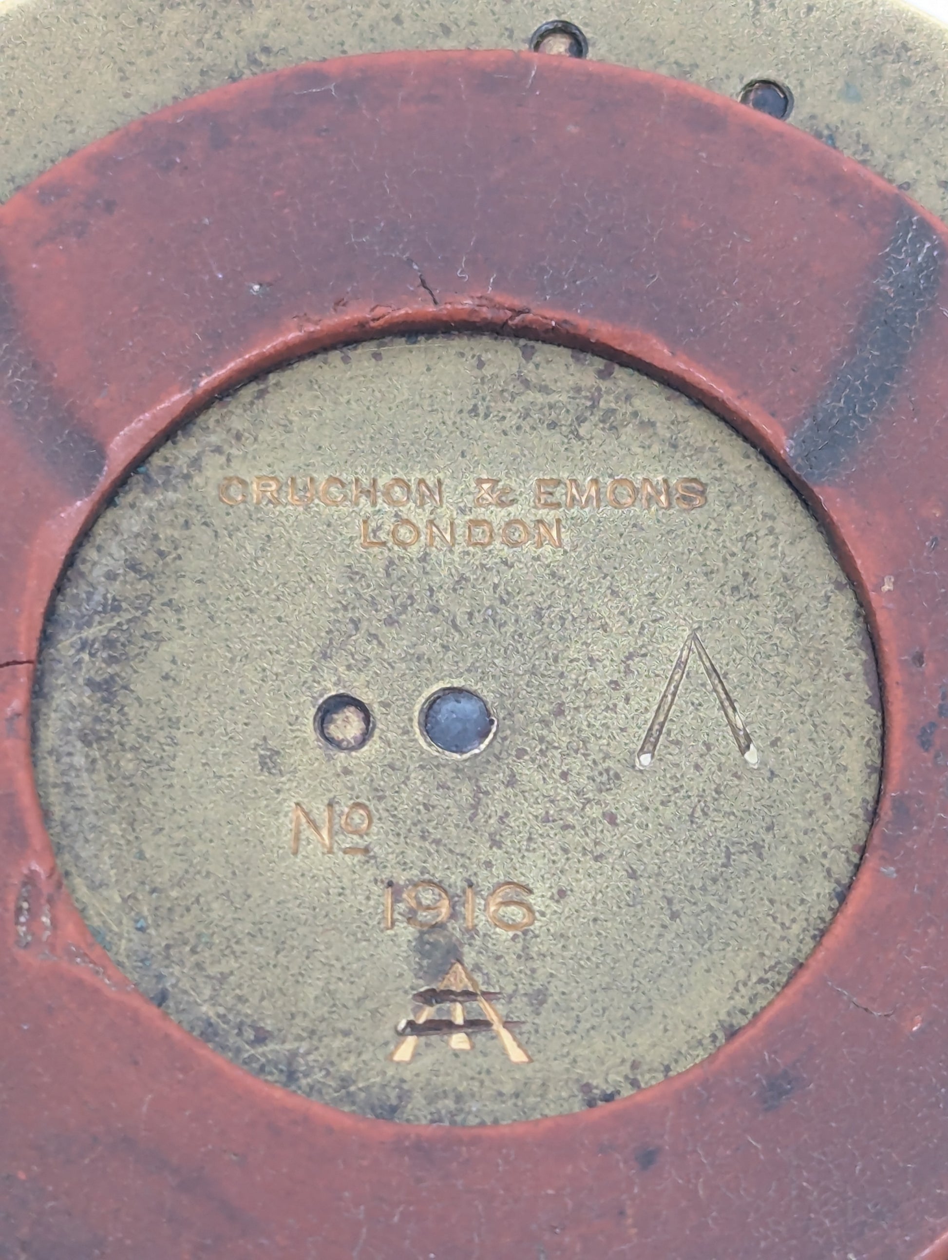 Angeboten wird ein originaler Verners Pattern Kompass aus Messing, Modell MK VII, mit einem Durchmesser von ca. 5,5 cm. Dieser Kompass stammt aus dem Ersten Weltkrieg und ist auf der Rückseite mit einer Gravur des Herstellers Cruchon & Emons, London versehen. Darunter findet sich die Jahreszahl 1916 sowie die militärische Abnahmemarkierung des britischen Heeres (Broad Arrow).