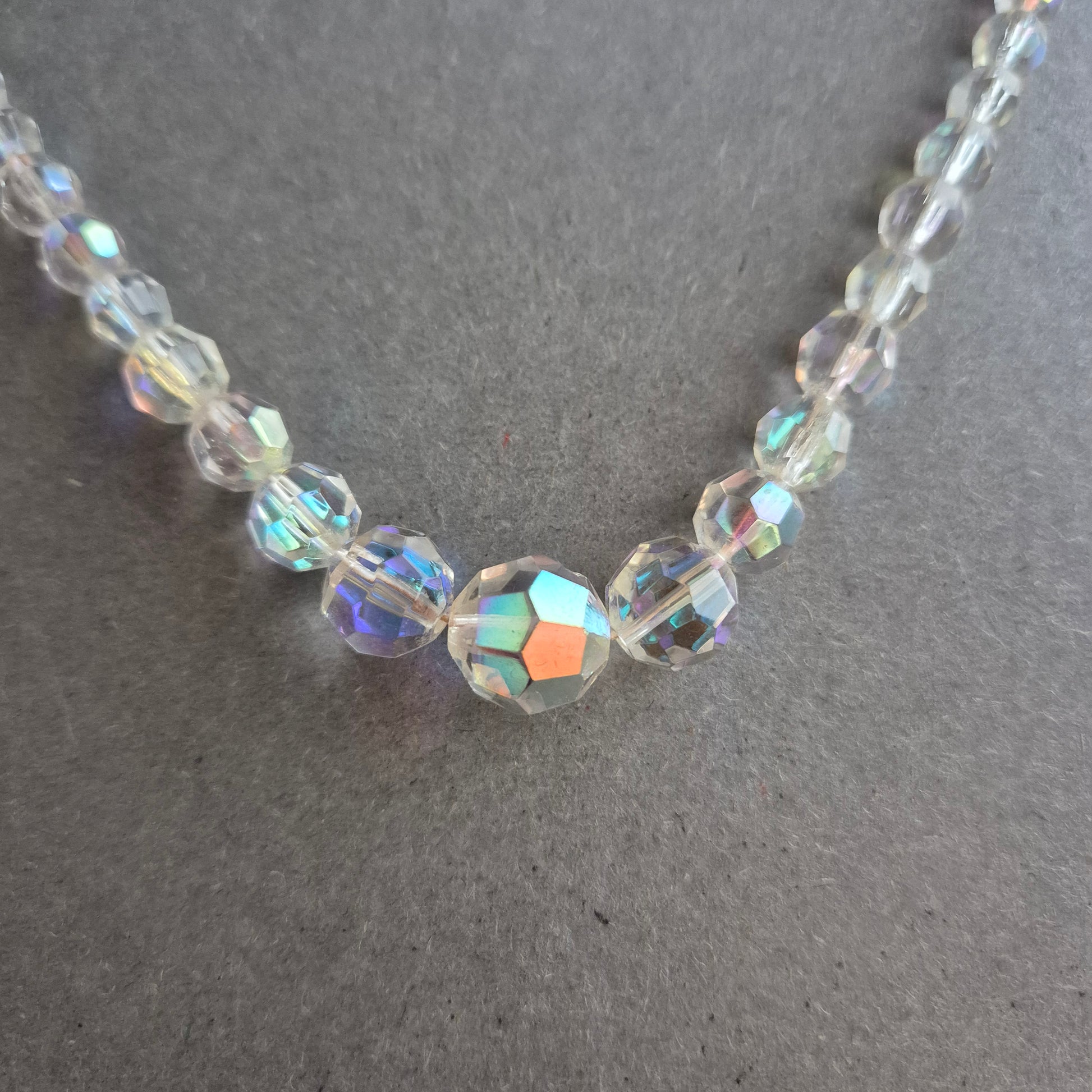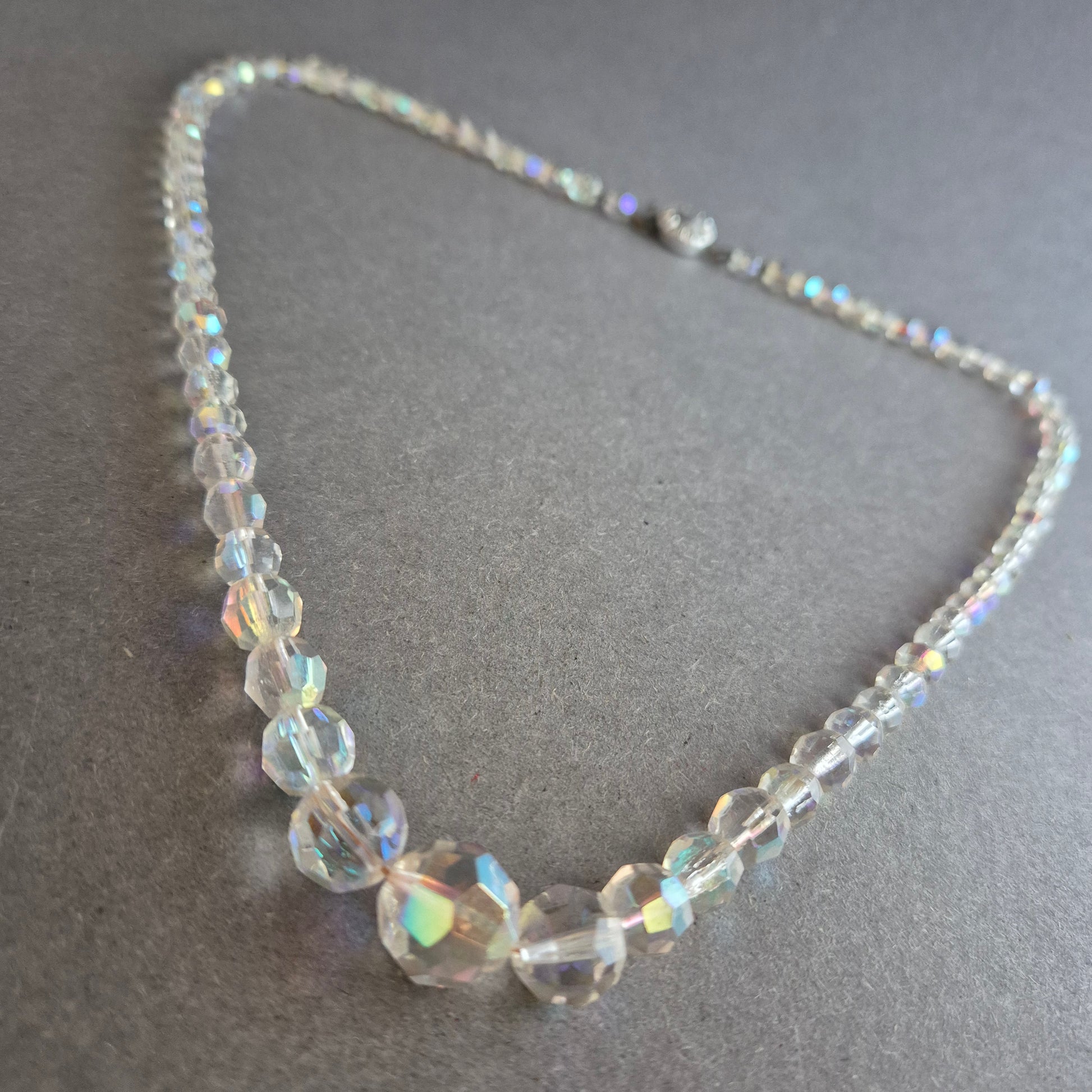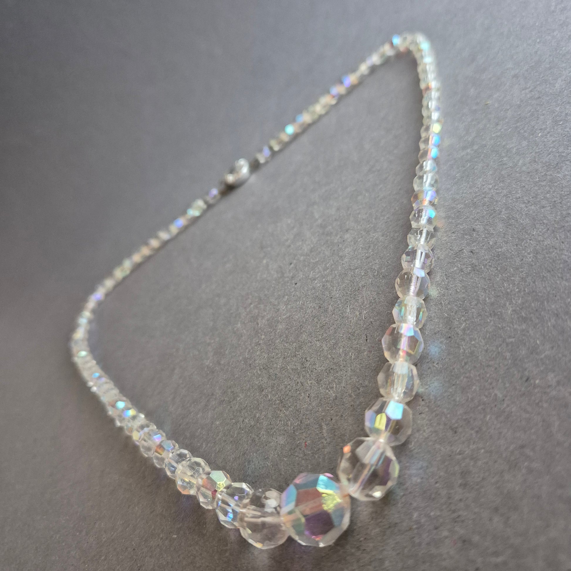 Diese zauberhafte Halskette aus geschliffenen, irisierenden Glasperlen funkelt bei jeder Bewegung in zarten Regenbogenfarben. Die Perlen sind zur Mitte hin größer gestaltet, was dem Schmuckstück eine elegante Form verleiht. Der nostalgisch verzierte Verschluss rundet den klassischen Vintage-Charakter perfekt ab.
