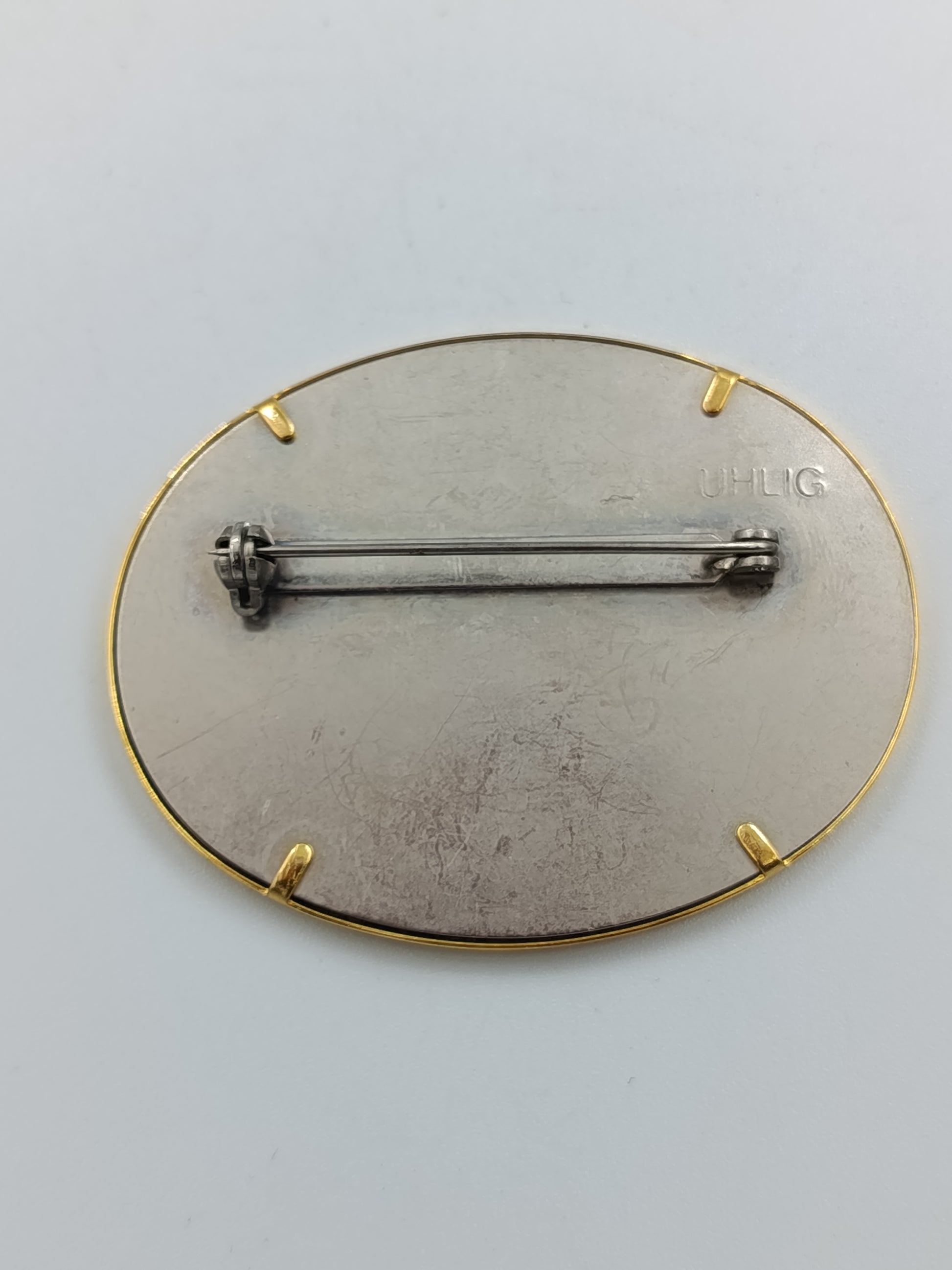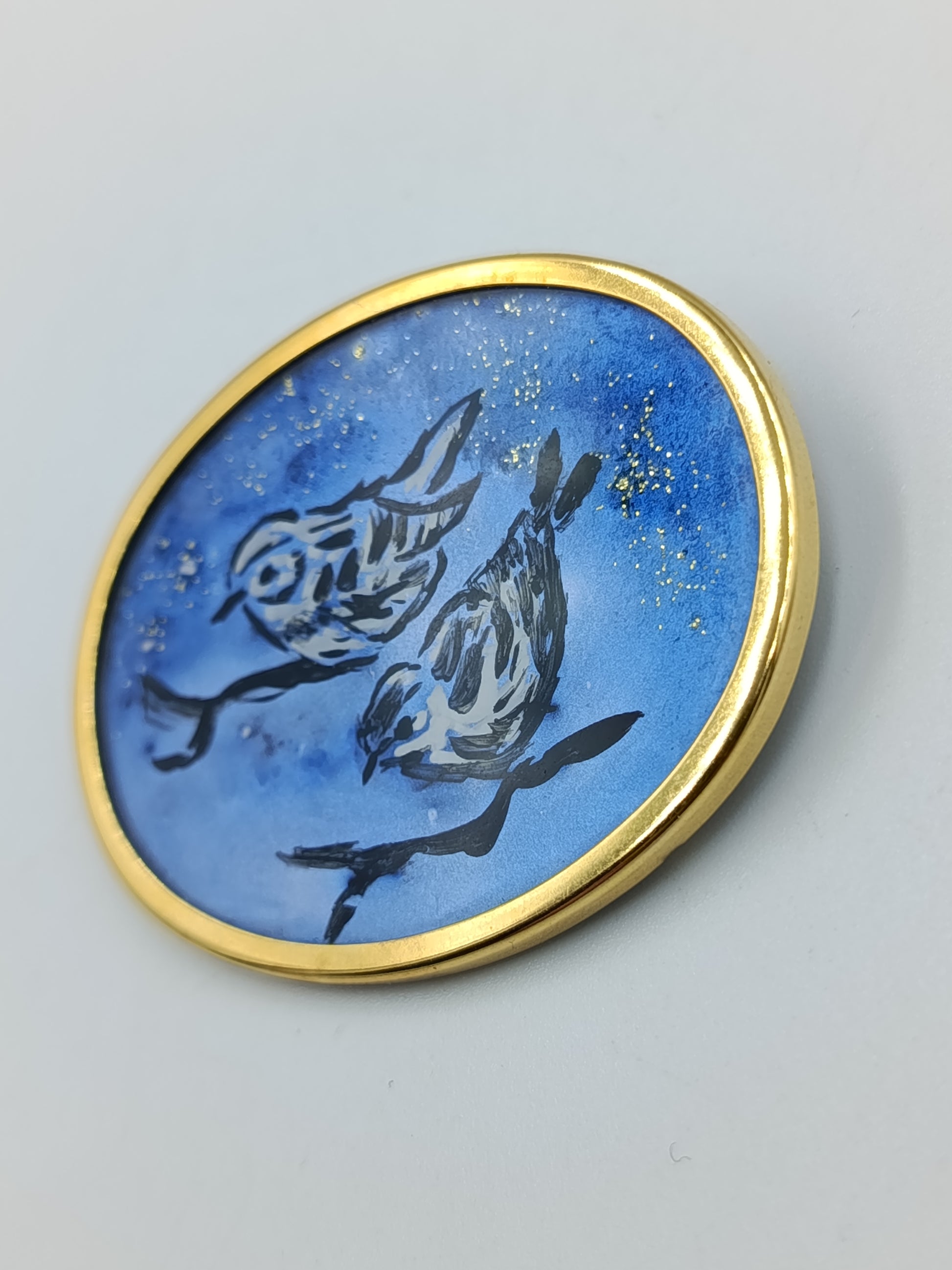 Elegante, ovale Vintage-Brosche aus dem Hause Uhlig, verziert mit einem handgemalten Emaille-Motiv. Zwei Vögel in Schwarz-Weiß sitzen auf Zweigen, eingefasst in eine intensiv blaue Hintergrundszene mit goldfarbenen Sprenkeln, die an einen funkelnden Nachthimmel erinnern. Der goldfarbene Rahmen setzt einen edlen Kontrast und hebt die künstlerische Gestaltung hervor.