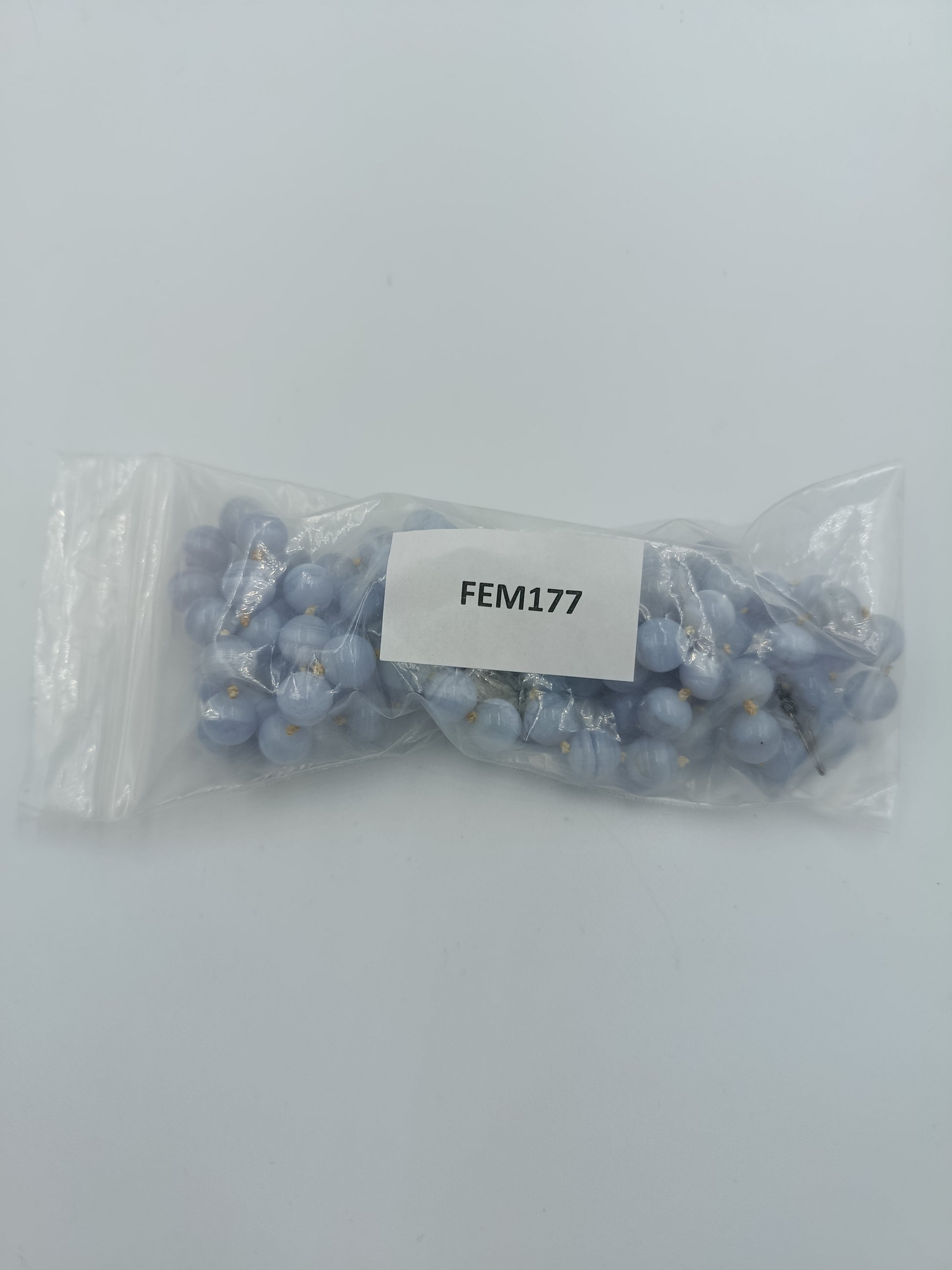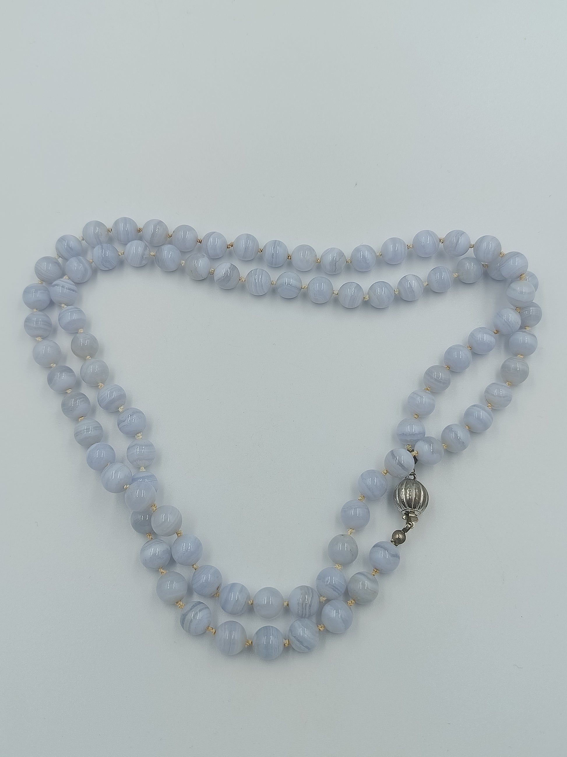 Elegante, handgeknotete Halskette aus wunderschönem, hellblauem Chalcedon. Die runden Perlen haben eine sanfte Bänderung und einen zarten Glanz, der für Chalcedon typisch ist. Geschlossen wird die Kette mit einem silberfarbenen, gerillten Steckverschluss, der perfekt zum klassischen Look passt.