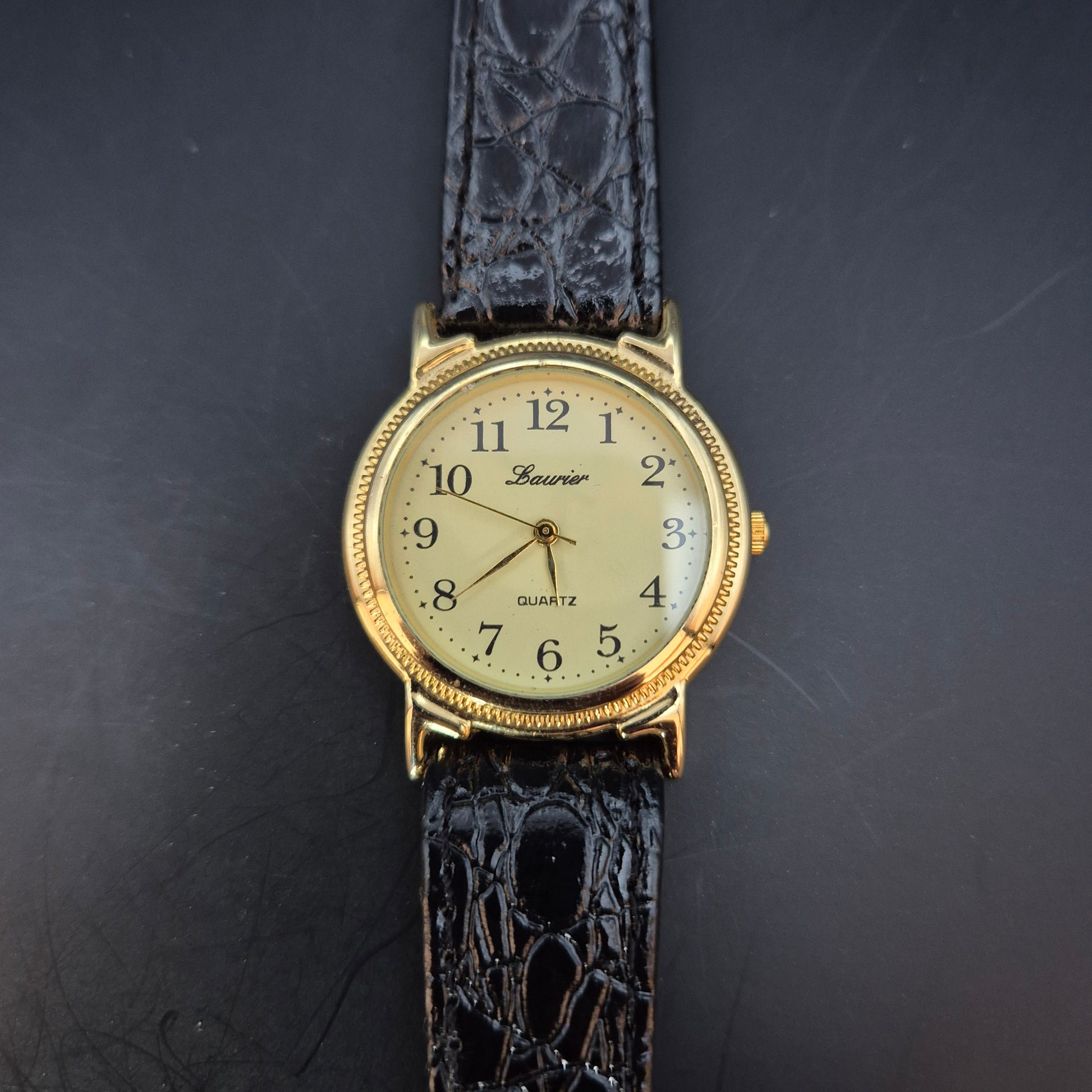 Diese klassische Laurier Damen Uhr strahlt zeitlose Eleganz aus. Das goldfarbene Gehäuse harmoniert perfekt mit dem cremefarbenen Zifferblatt, auf dem schwarze arabische Ziffern für gute Ablesbarkeit sorgen. Das hochwertige schwarze Lederarmband im Kroko-Look unterstreicht den anspruchsvollen Charakter dieser Uhr, die "HIGH QUALITY MOVEMENT" verspricht.