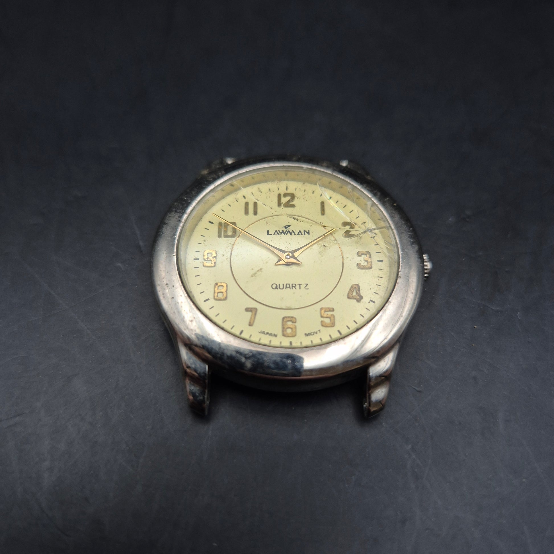 Diese klassische Herren Uhr von Lawman bietet ein schlichtes, funktionales Design mit einem beigen Zifferblatt und gut ablesbaren goldfarbenen Zahlen. Das runde Metallgehäuse zeigt deutliche Gebrauchsspuren, was ihr einen rustikalen Vintage-Charme verleiht. Ausgestattet mit einem zuverlässigen Quarzwerk „Japan Movt“, ist sie ein interessantes Stück für Bastler oder zur Ersatzteilgewinnung. Wird ohne Armband geliefert.
