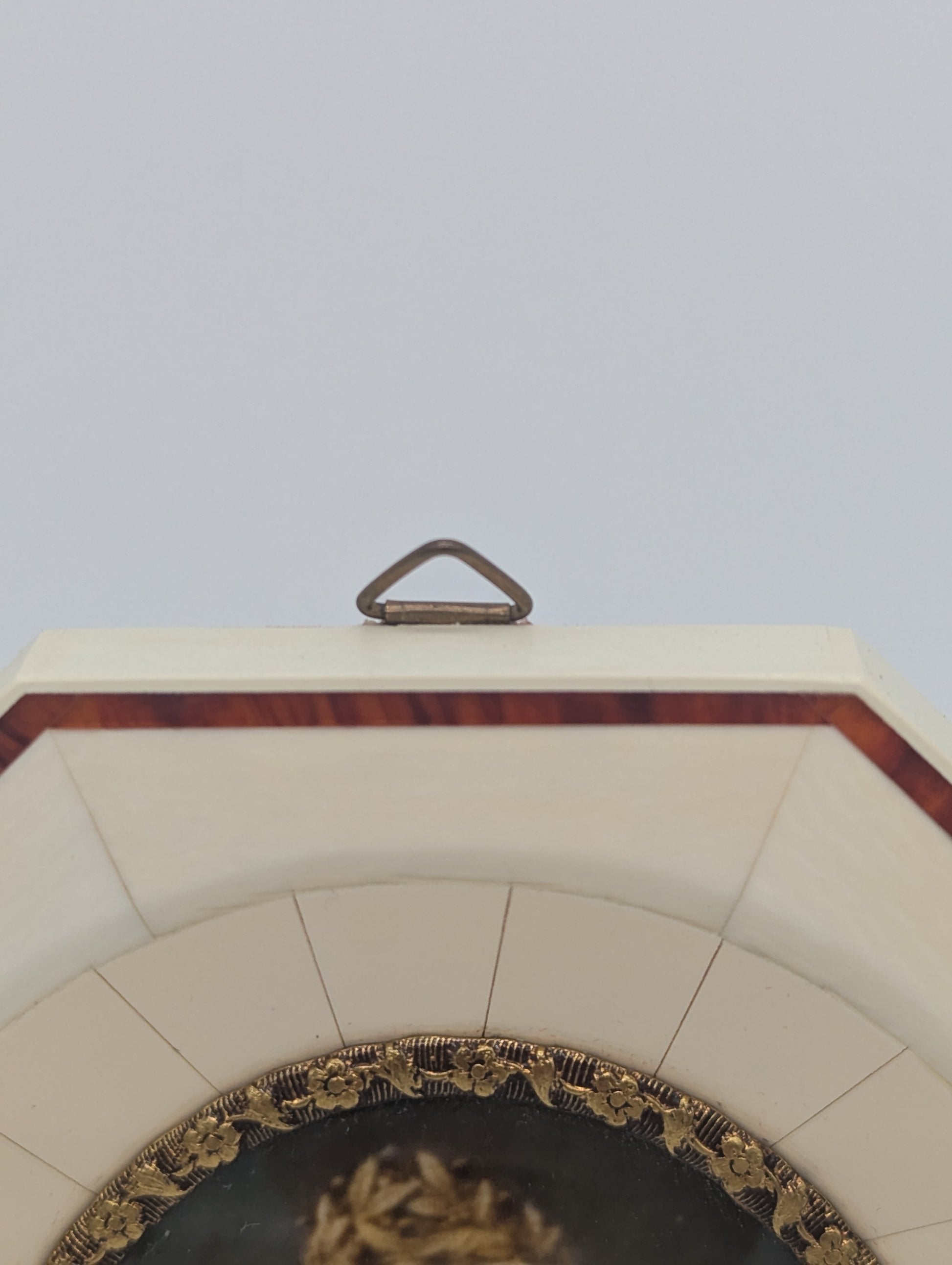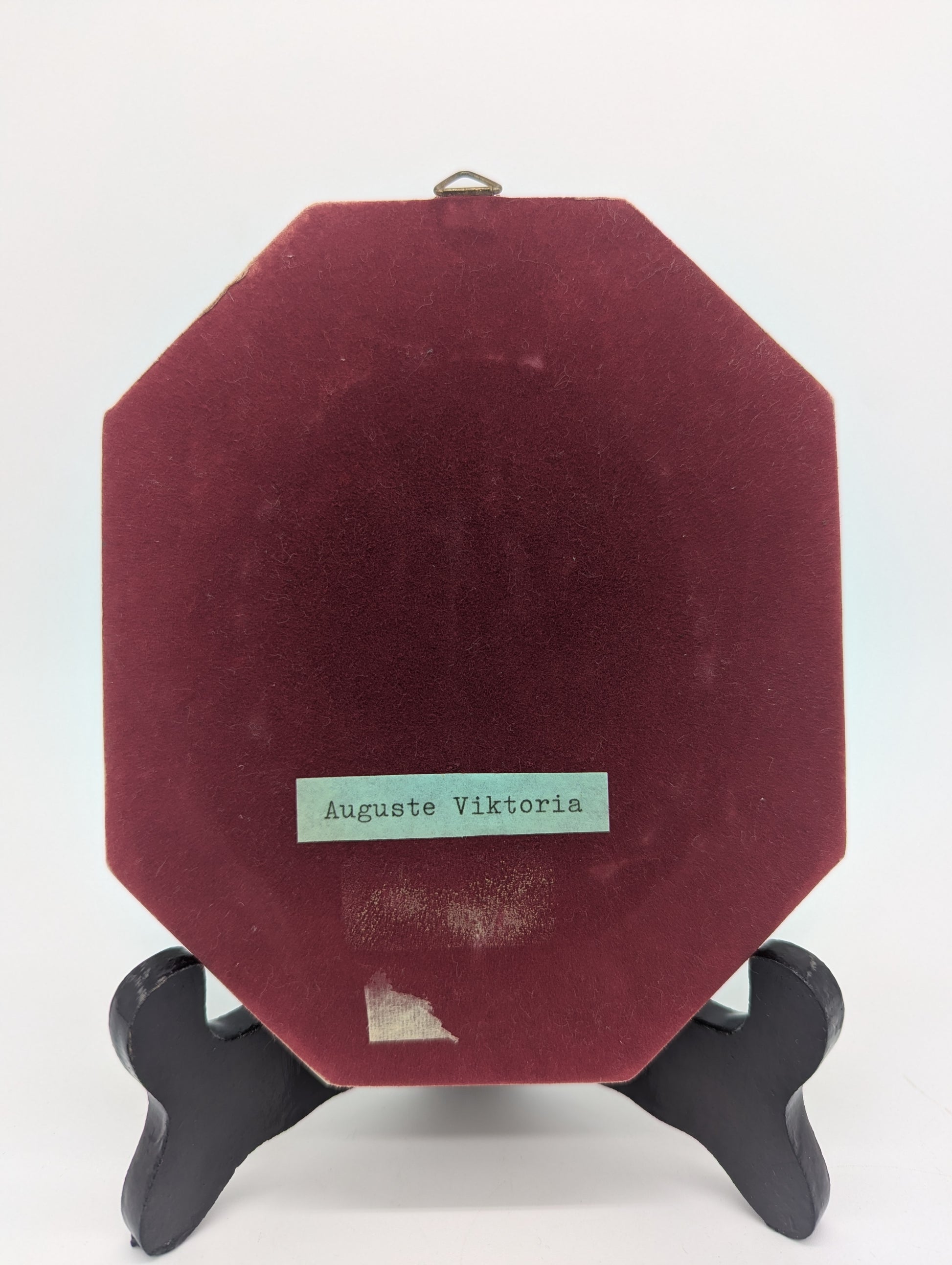 Das ovale Bild ist von einem reich verzierten Rahmen umgeben und in eine achteckige Einfassung integriert, deren Rückseite mit rotem Samt bezogen ist. Auf der Rückseite befindet sich ein Hinweiszettel mit der Bezeichnung „Auguste Viktoria“.