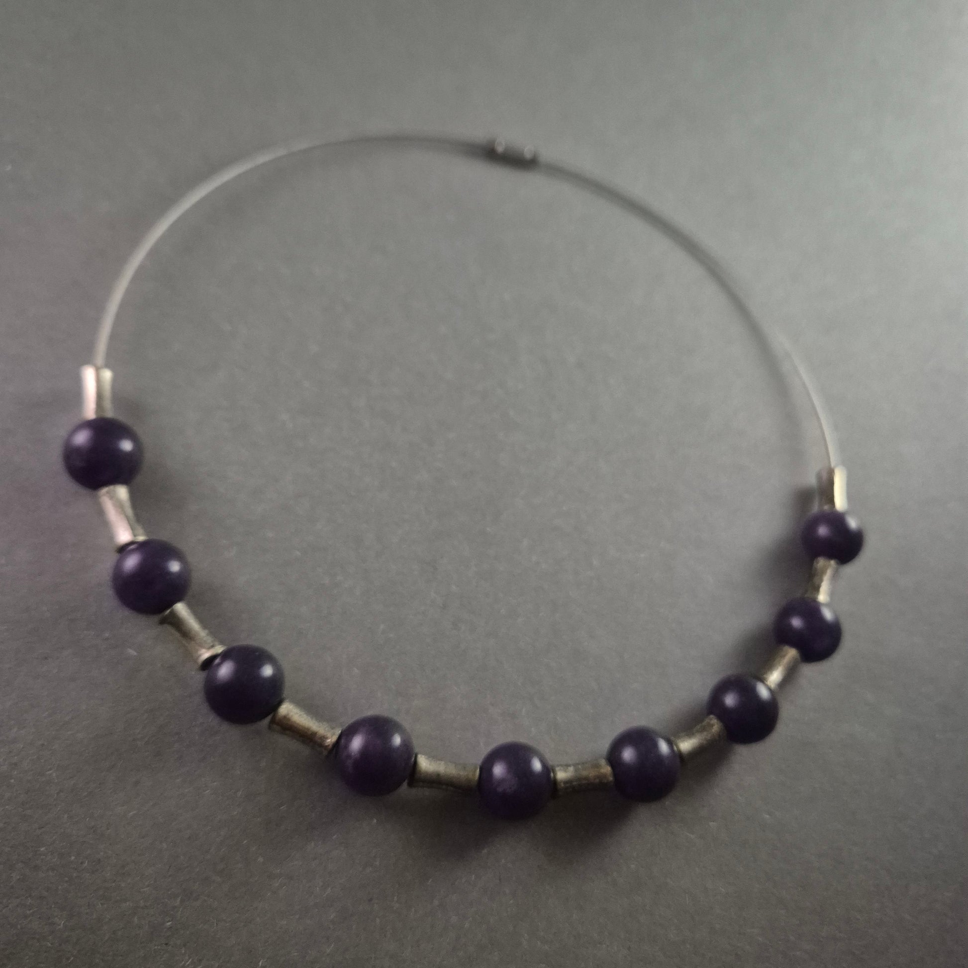 Diese elegante Halskette kombiniert tiefviolette Amethyst-Perlen mit silberfarbenen Metallröhrchen zu einem schlichten und modernen Design. Der filigrane Draht sorgt für eine leichte und angenehme Passform, während der dezente Magnetverschluss ein einfaches Anlegen ermöglicht. Perfekt für Liebhaber von minimalistischen Naturstein-Schmuckstücken.