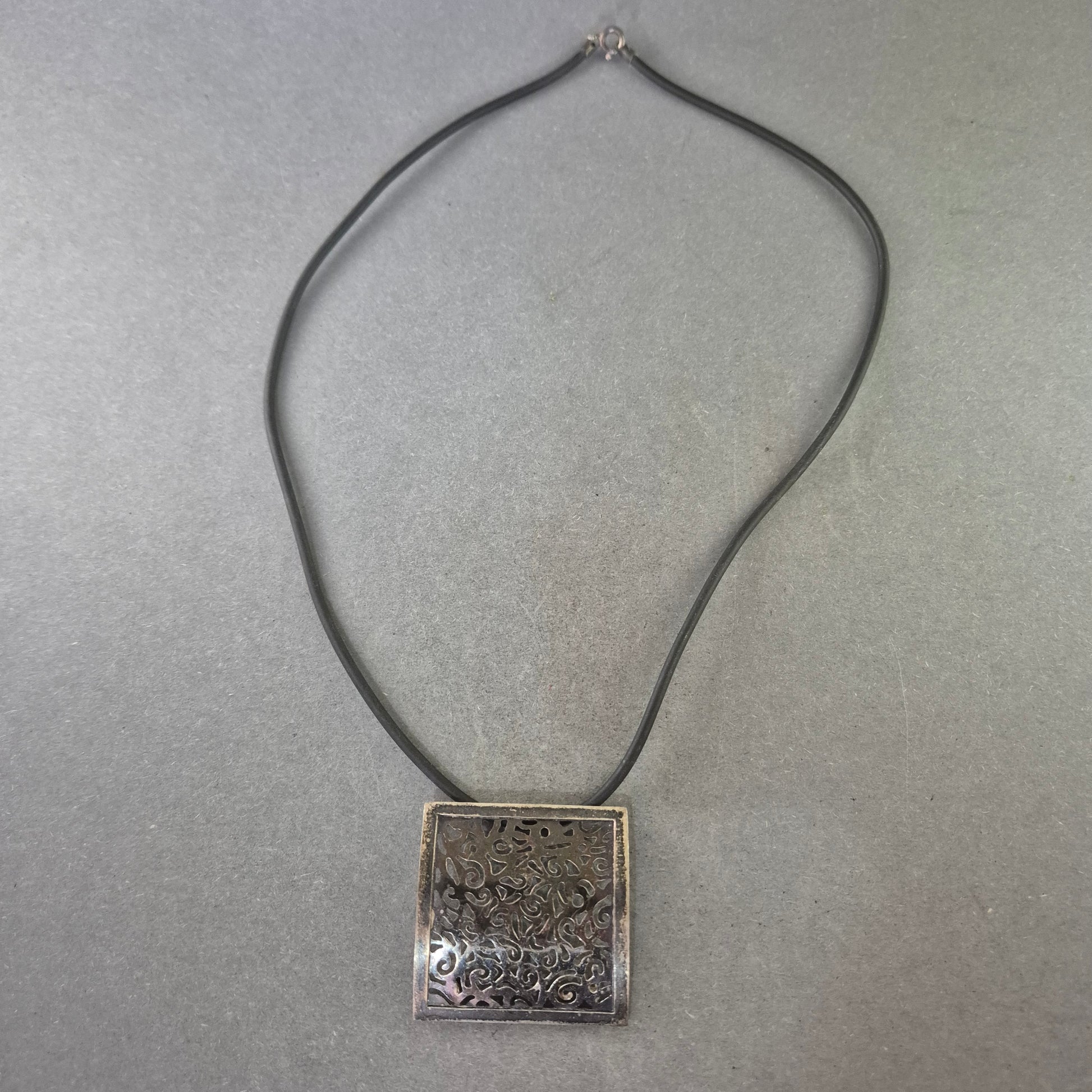 Diese charmante Halskette präsentiert einen rechteckigen Anhänger mit einem filigranen, ornamentalen Muster im Vintage-Stil. Gefertigt aus einem dunklen Metall, das an Silber oder Edelstahl erinnert, ist der Anhänger an einer schlichten schwarzen Kautschuk-Kordel befestigt. Ein stilvolles Accessoire, das jedem Outfit eine besondere Note verleiht.