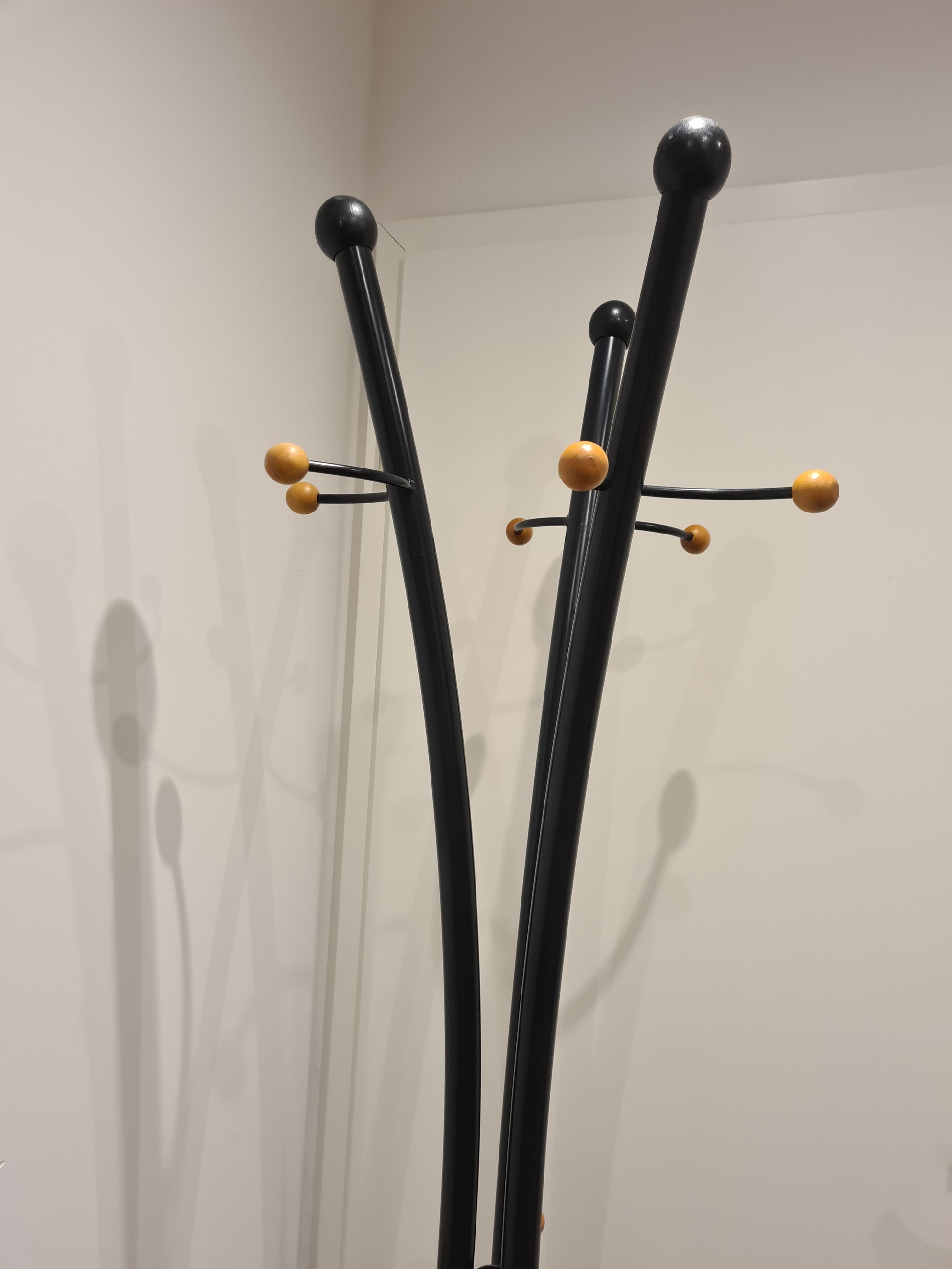 angeboten wird eine freistehende Garderobe aus schwarzem Metall. Der elegante Kleiderständer mit mehreren Haken bietet eine stilvolle und praktische Lösung zur Aufbewahrung von Jacken, Mänteln und Accessoires.