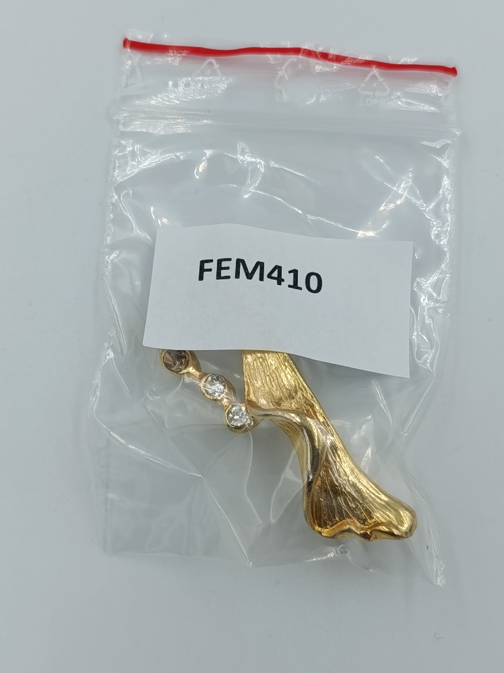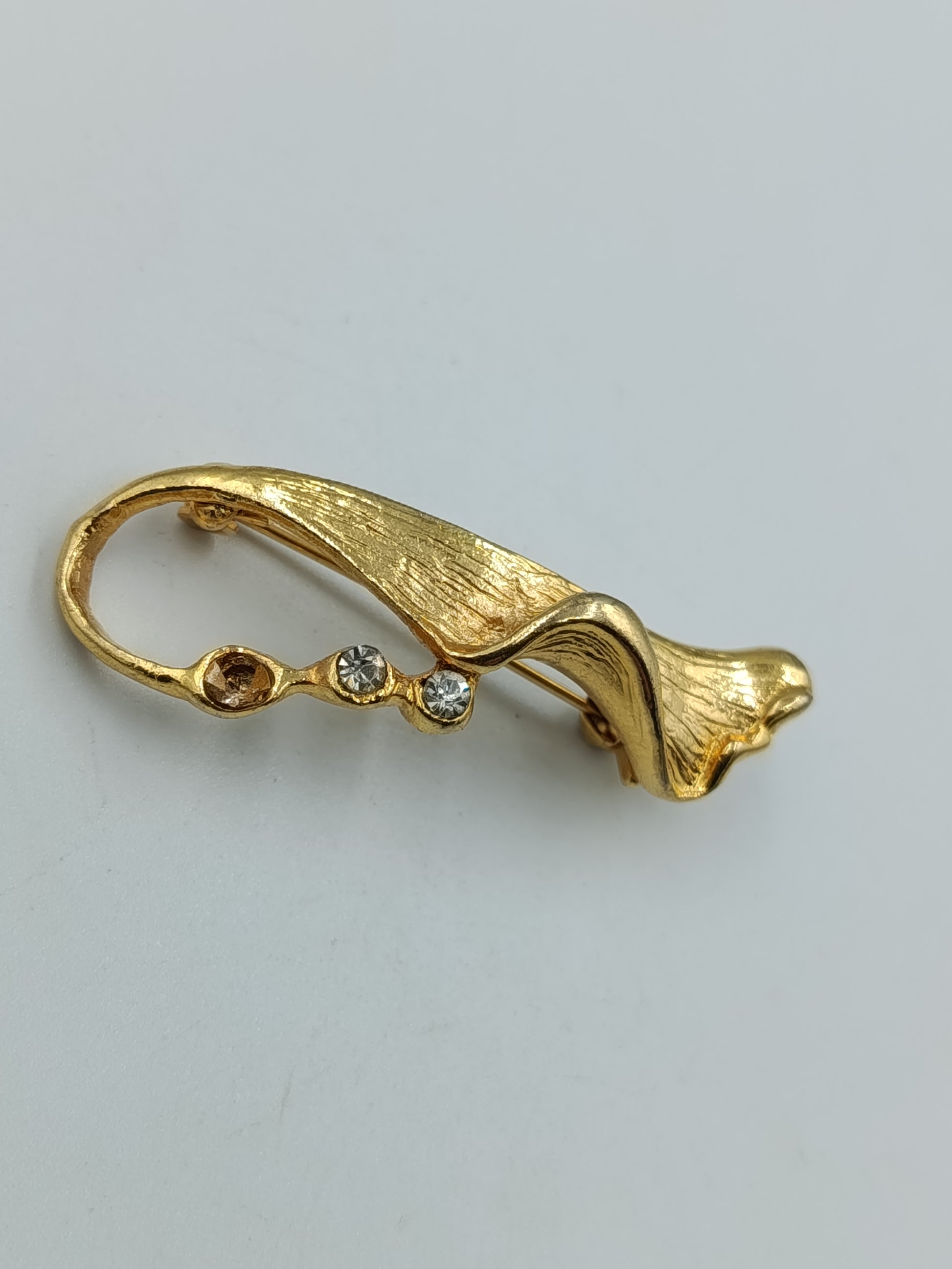 Elegante Brosche in geschwungener, moderner Form mit fein strukturierter Oberfläche in Goldoptik. Drei funkelnde Strasssteine setzen dezente Akzente und verleihen dem Schmuckstück einen Hauch von Glamour. Die außergewöhnliche Form macht die Brosche zu einem besonderen Blickfang – ideal für festliche Outfits oder als stilvolles Vintage-Sammlerstück.