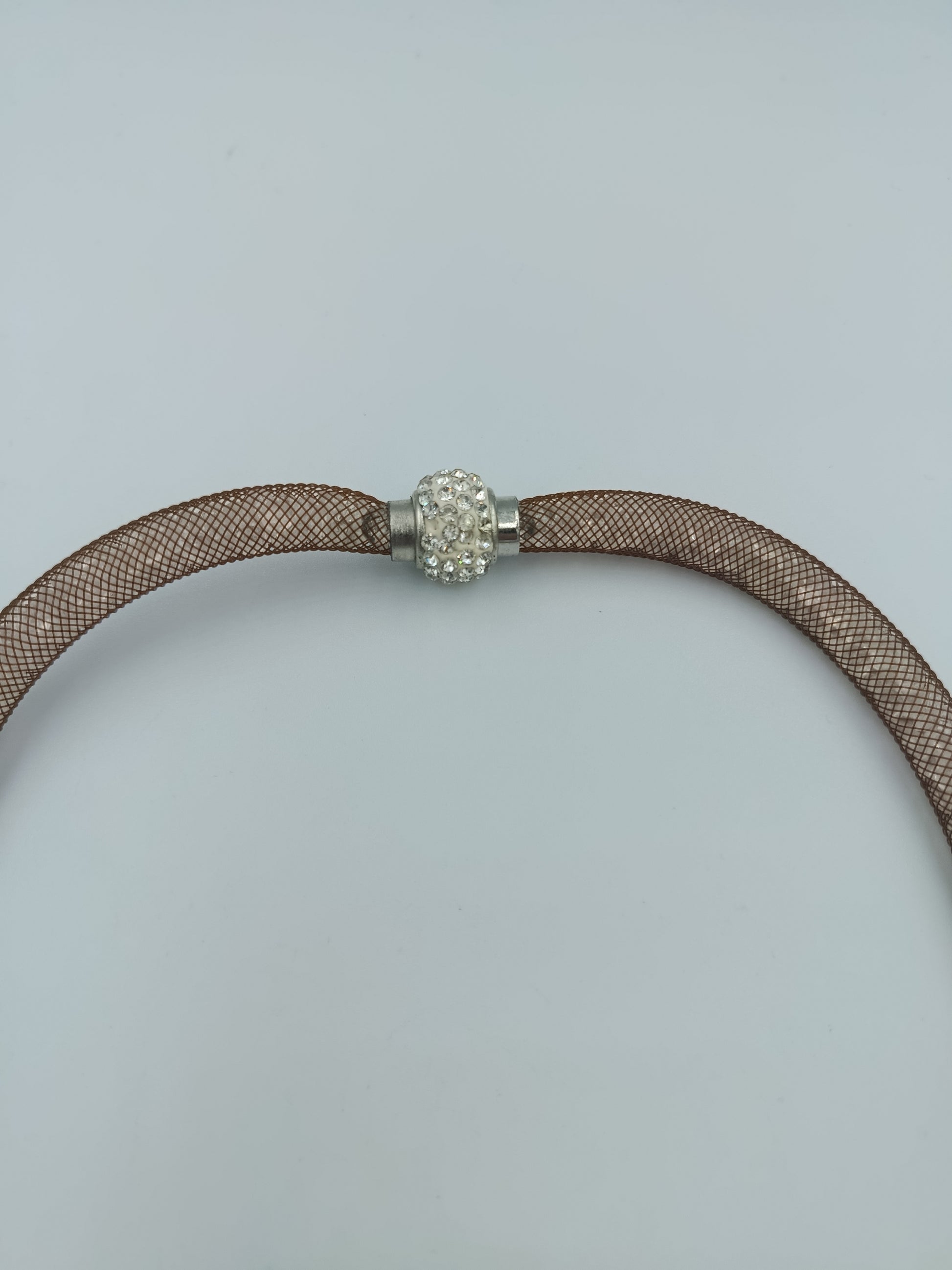 Stylische Halskette in trendiger Netz-Optik: Feine, beige schimmernde Stränge werden in einem modernen, flexiblen Design verarbeitet. Der funkelnde Magnetverschluss mit Strasssteinen sorgt nicht nur für sicheren Halt, sondern setzt auch einen eleganten Akzent. Ein vielseitiges Schmuckstück – perfekt für den Alltag oder als dezenter Hingucker am Abend.