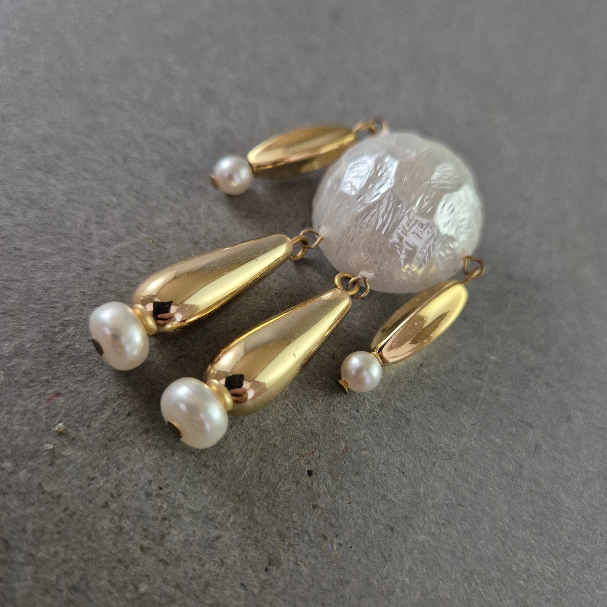 Diese faszinierende Vintage Brosche besticht durch ihr modernes, abstraktes Design. Das zentrale, opake Element mit seiner einzigartigen Textur wird von mehreren goldfarbenen Elementen umrahmt, die mit kleinen Perlen verziert sind und frei hängen. Ein ausdrucksstarkes Schmuckstück, das skulptural wirkt und garantiert Blicke auf sich zieht. Ideal für alle, die außergewöhnlichen Vintage-Schmuck lieben.