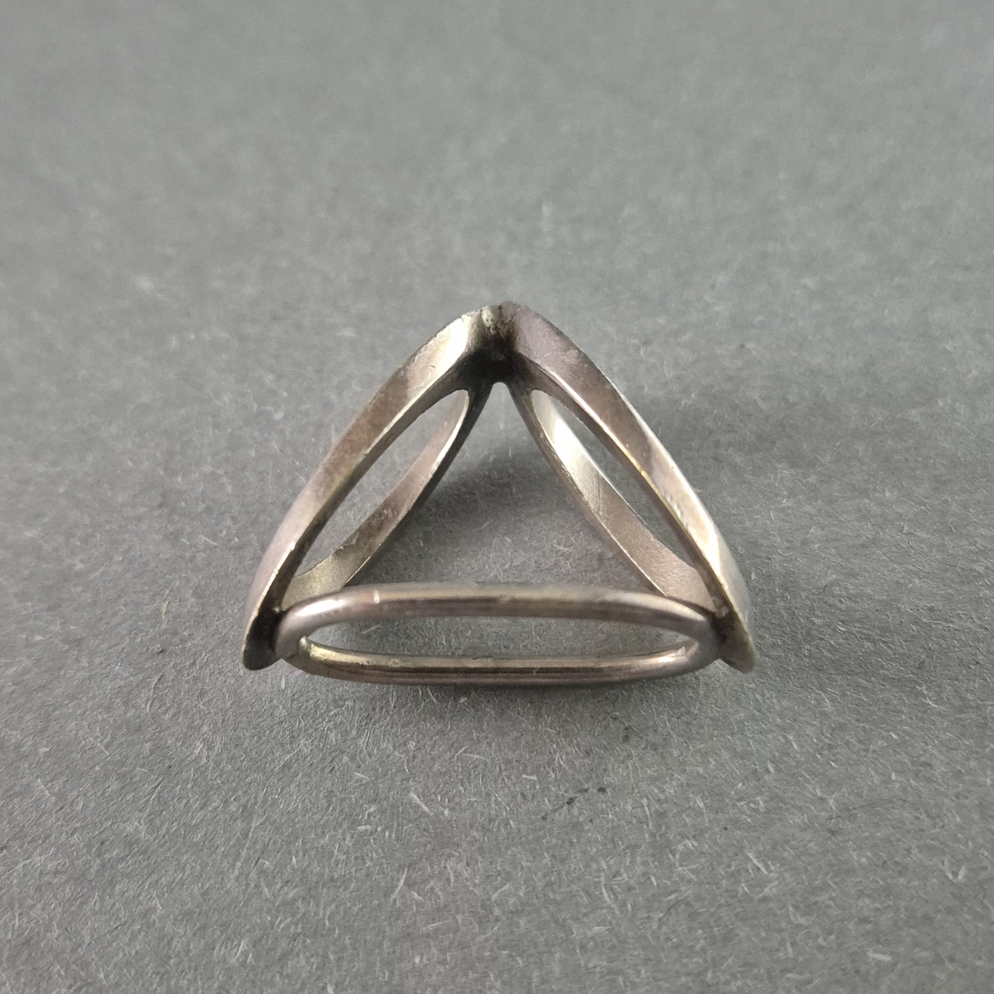 Dieser außergewöhnliche Silberring fasziniert mit seinem modernen, geometrischen Design. Die offene Dreiecksform verleiht dem Schmuckstück eine avantgardistische Note, die minimalistisch und dennoch markant wirkt. Der Ring eignet sich perfekt für Liebhaber von einzigartigem, architektonischem Schmuck und setzt ein klares Statement.
