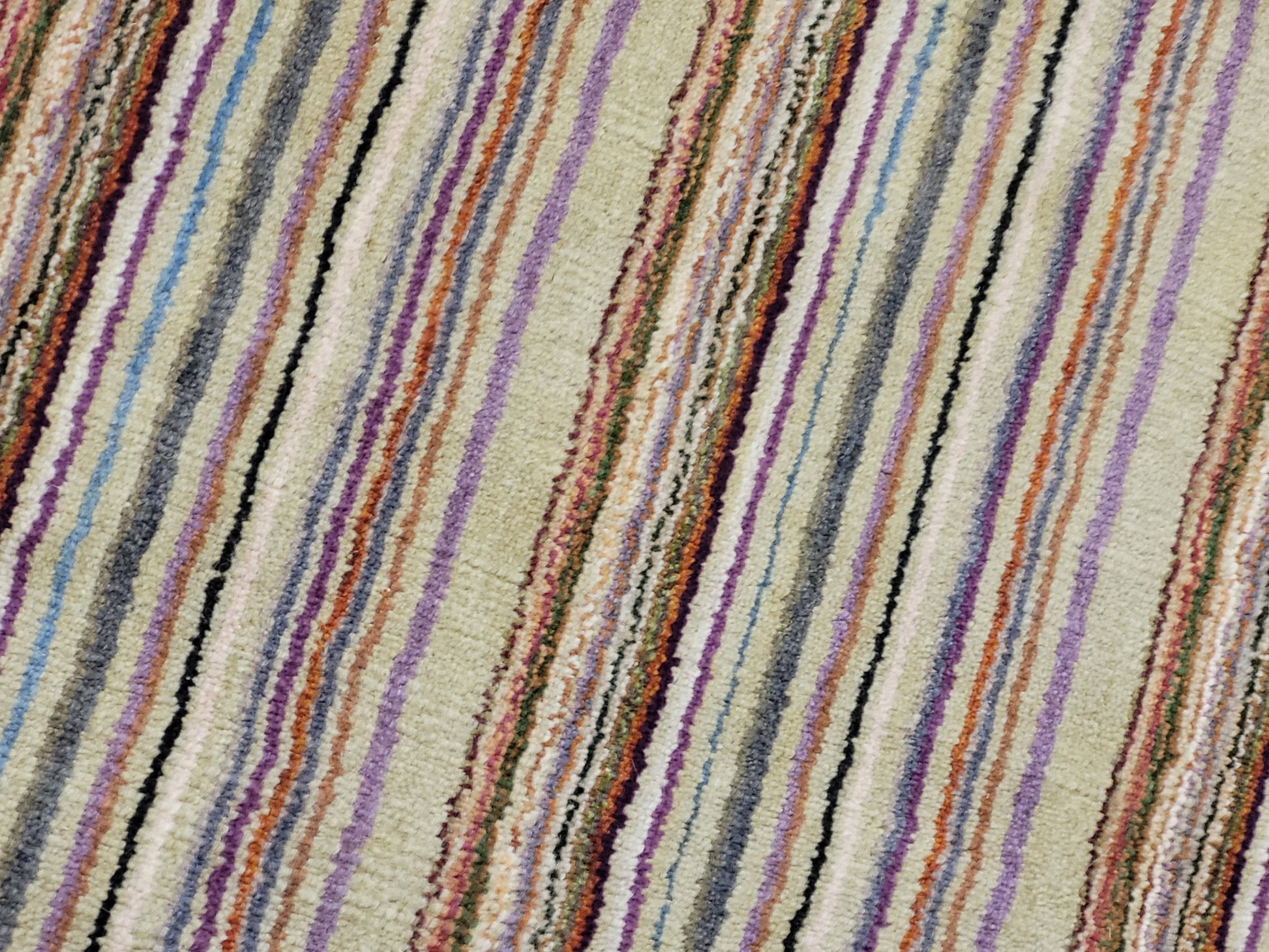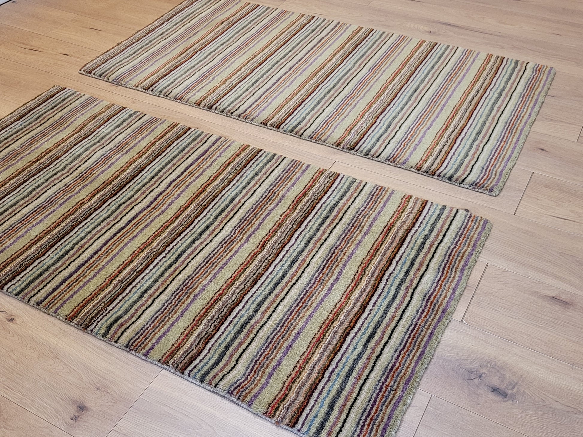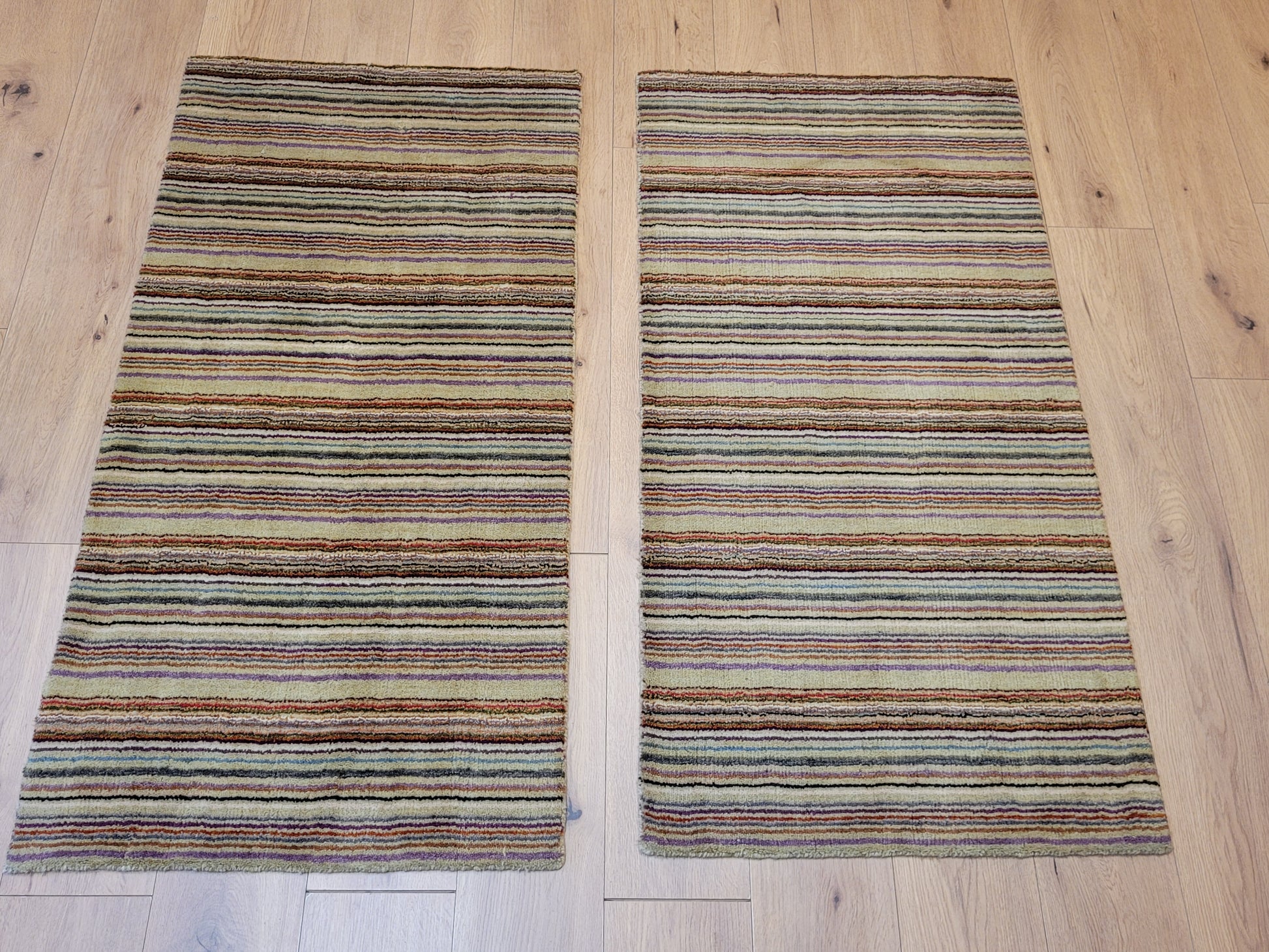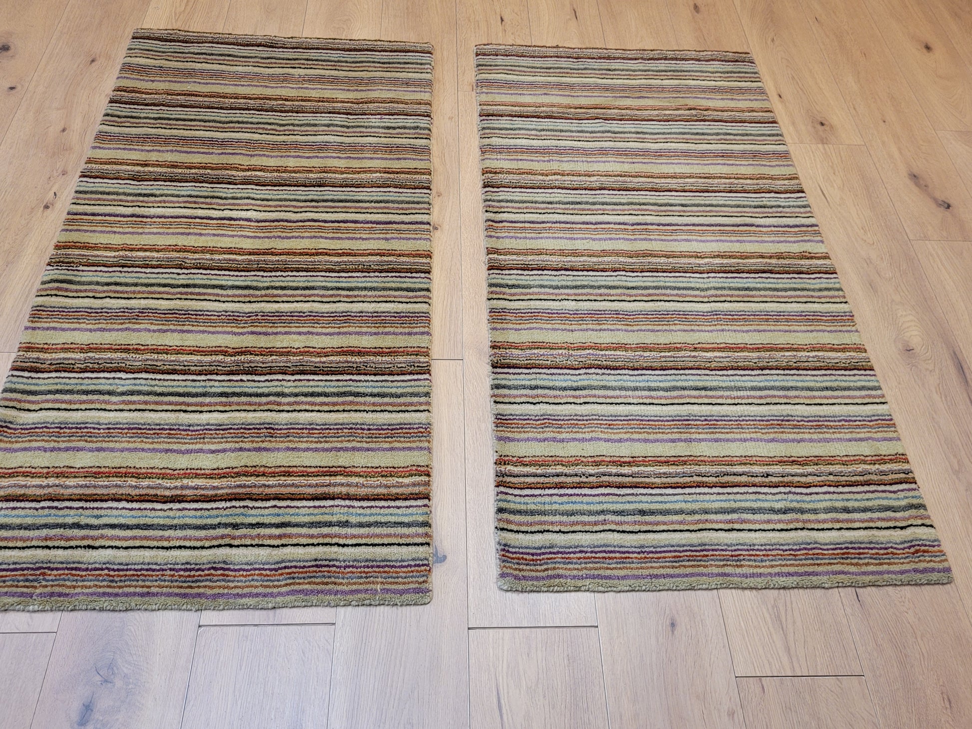 angeboten wird ein dekoratives Teppich-Set bestehend aus zwei handgeknüpften Wollteppichen. Das Design besticht durch ein modernes Streifenmuster in vielfältigen Farben, das jedem Wohnraum eine stilvolle und zugleich lebendige Note verleiht.