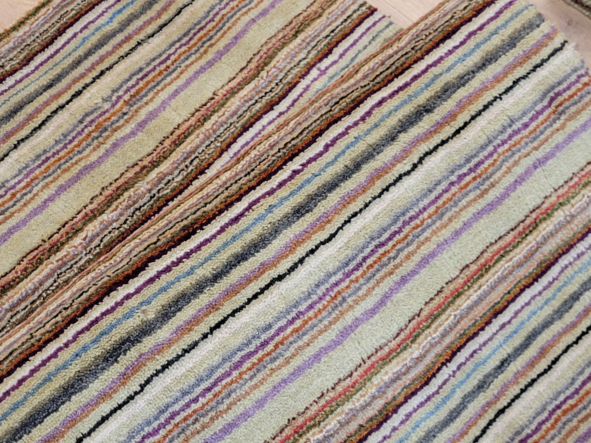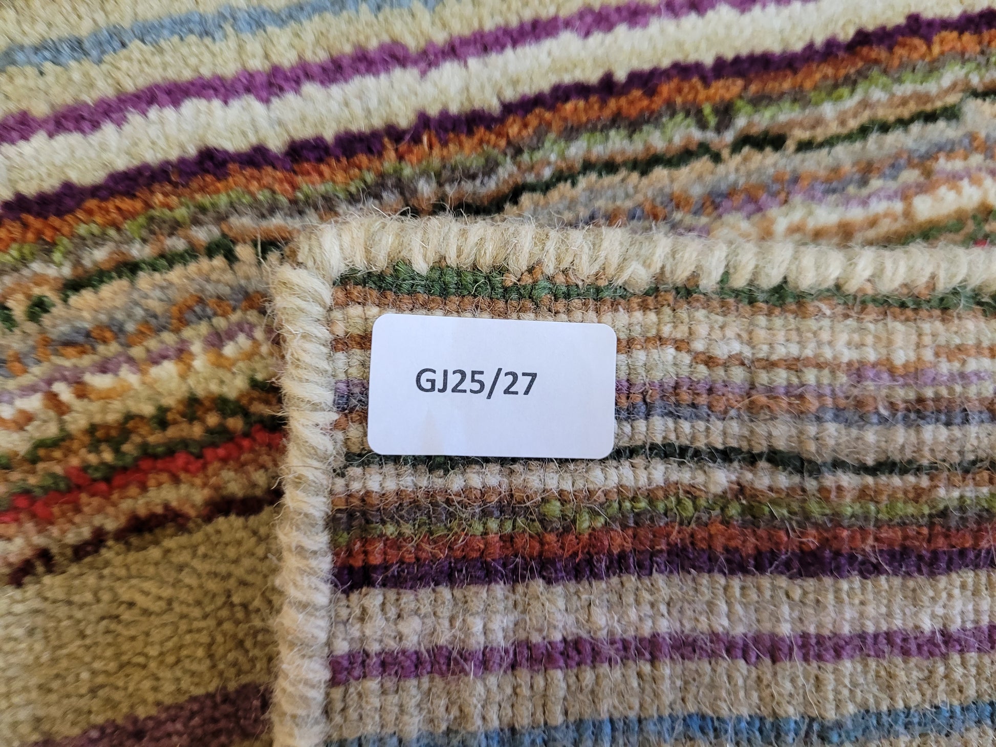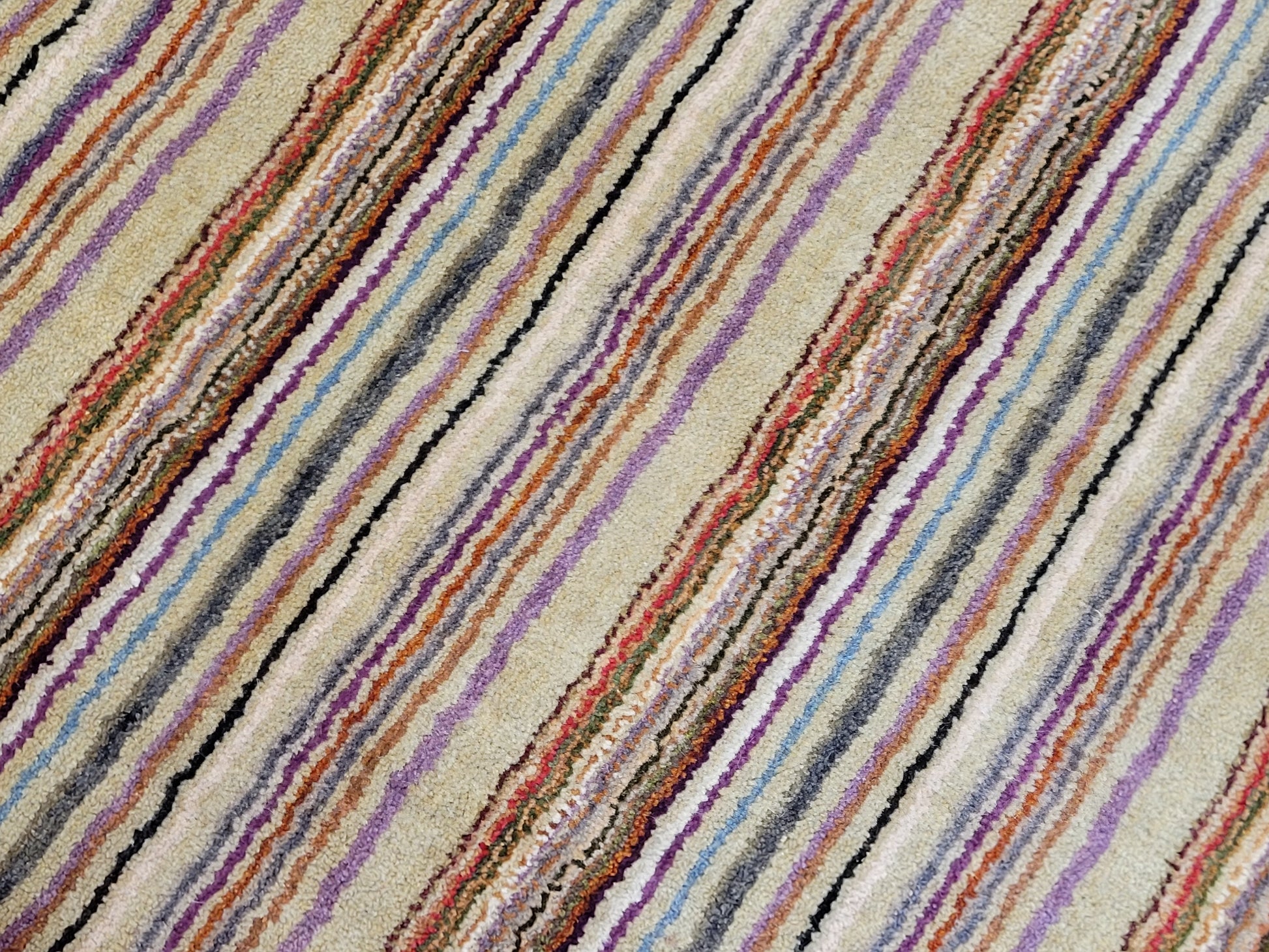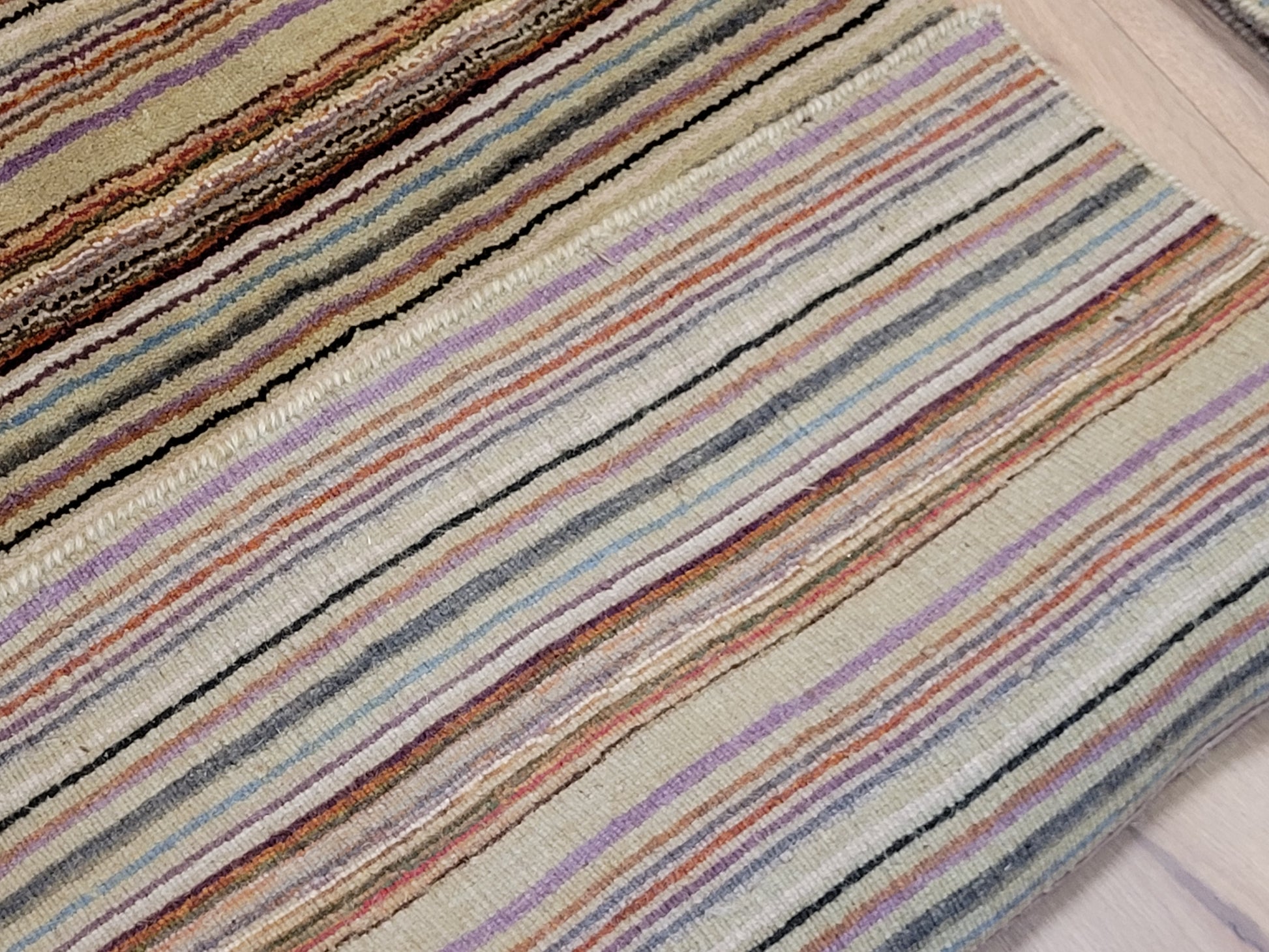 angeboten wird ein dekoratives Teppich-Set bestehend aus zwei handgeknüpften Wollteppichen. Das Design besticht durch ein modernes Streifenmuster in vielfältigen Farben, das jedem Wohnraum eine stilvolle und zugleich lebendige Note verleiht.