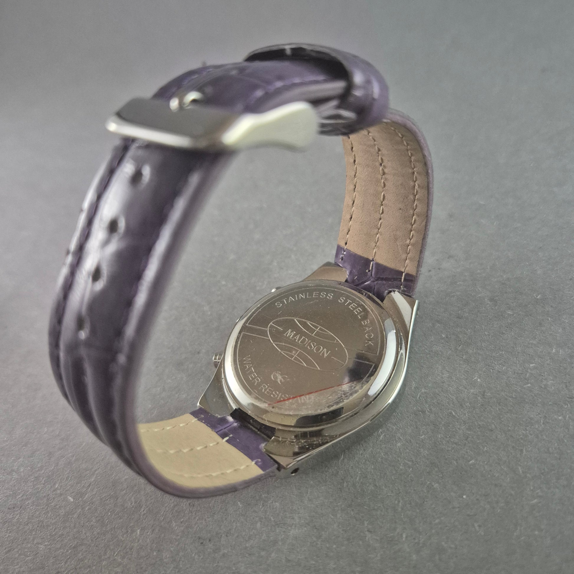Modische Madison Armbanduhr – Glitzerndes Design mit violettem Lederarmband