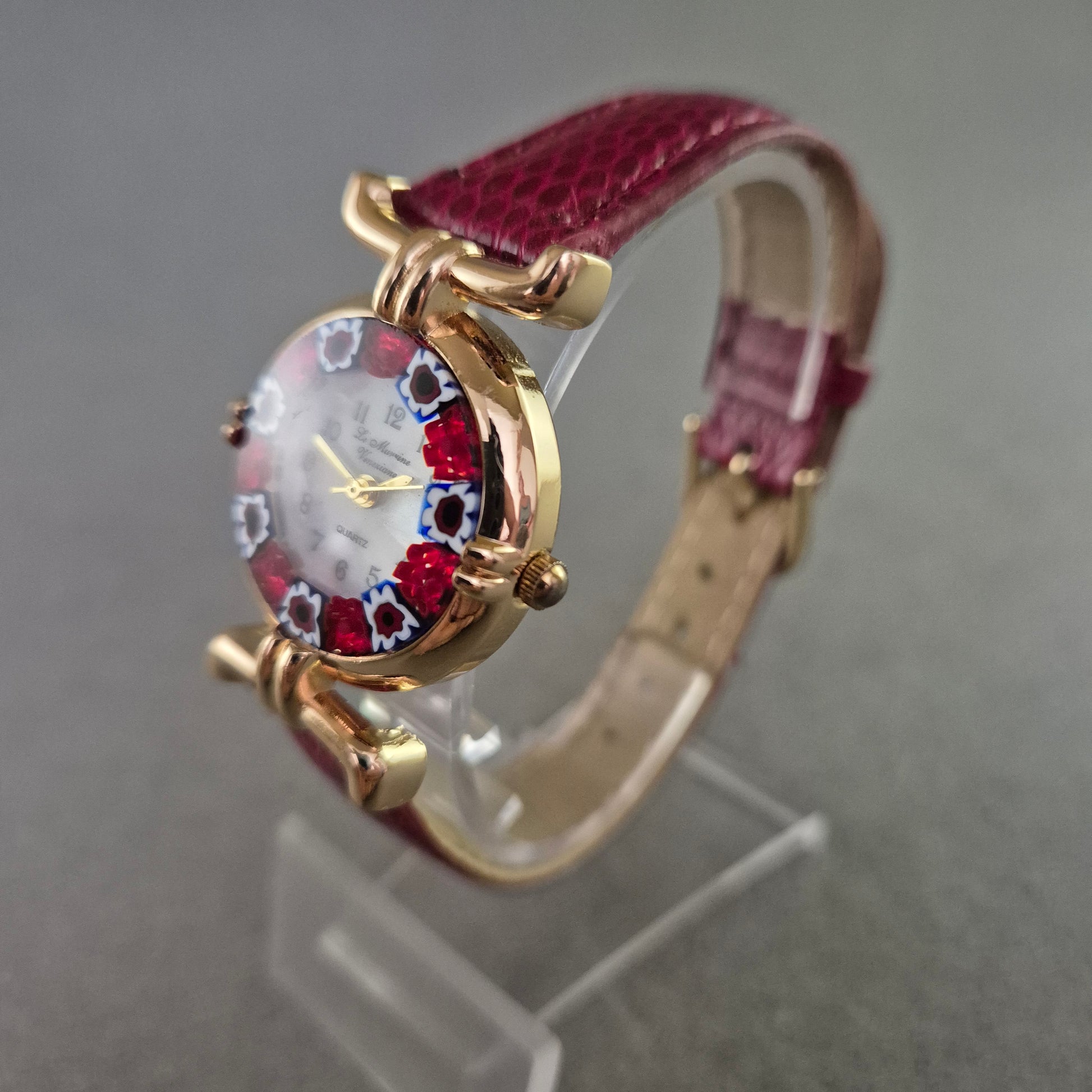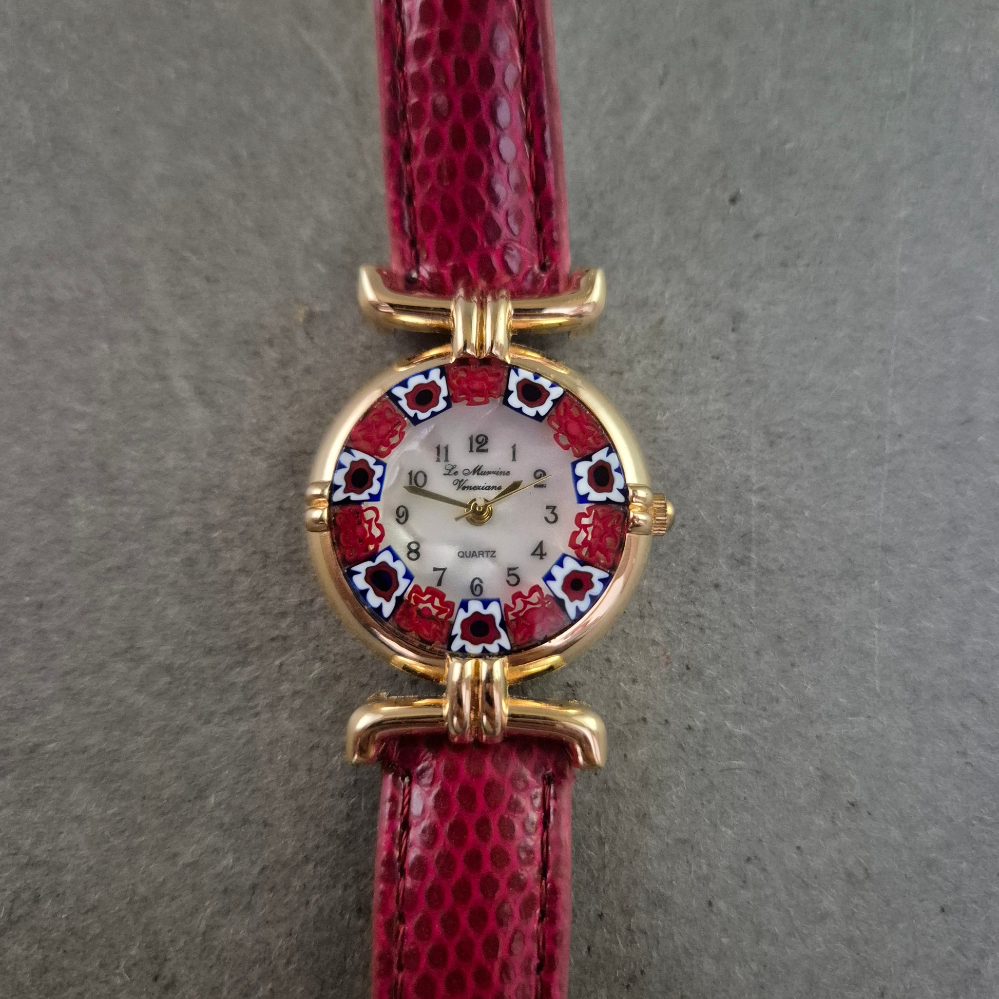 Diese auffällige Damenarmbanduhr kombiniert klassisches Uhrendesign mit farbenfroher italienischer Glaskunst. Das Zifferblatt ist von dekorativem Muranoglas eingefasst, das in kräftigem Rot und Weiß mit floralen Mustern glänzt. Die Uhr trägt den Schriftzug „Le Murine Veneziane“ und ist ein echter Eyecatcher – ideal für Liebhaberinnen kunstvoller Details.