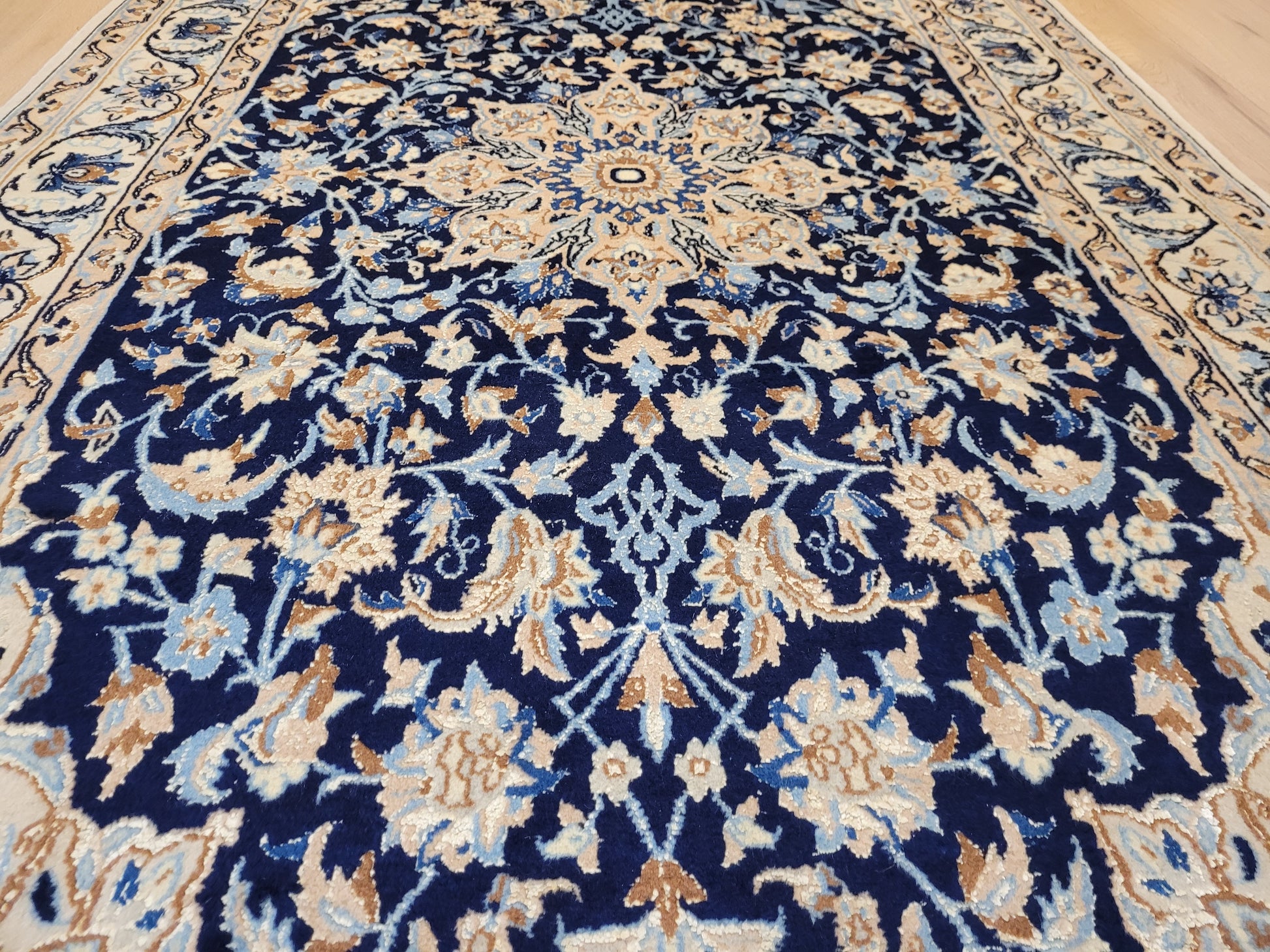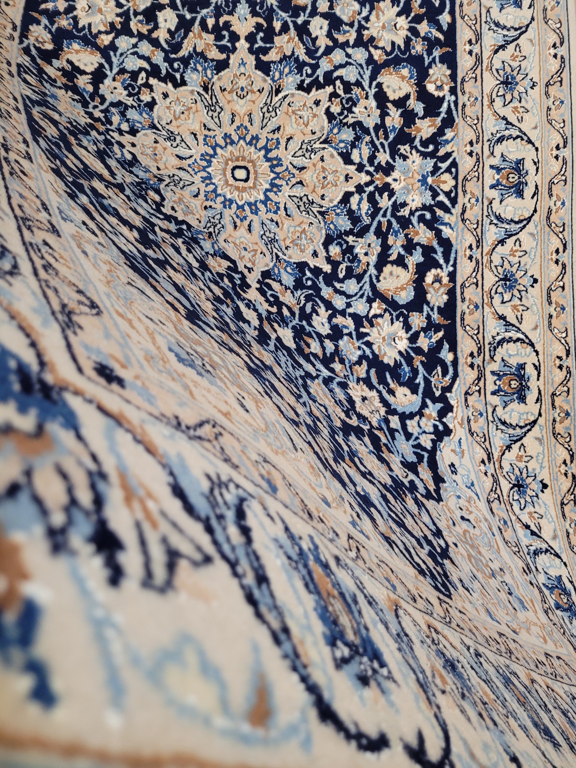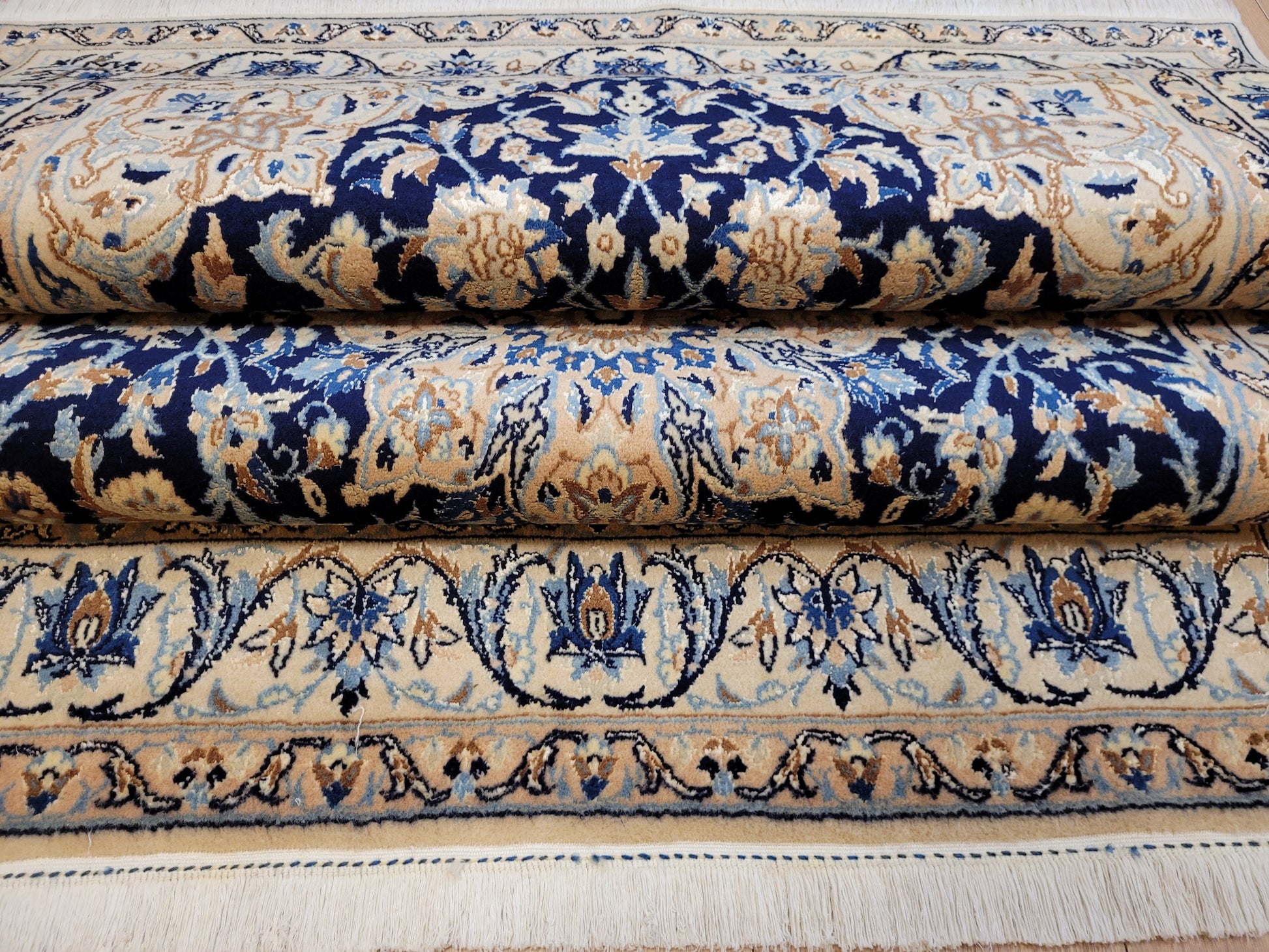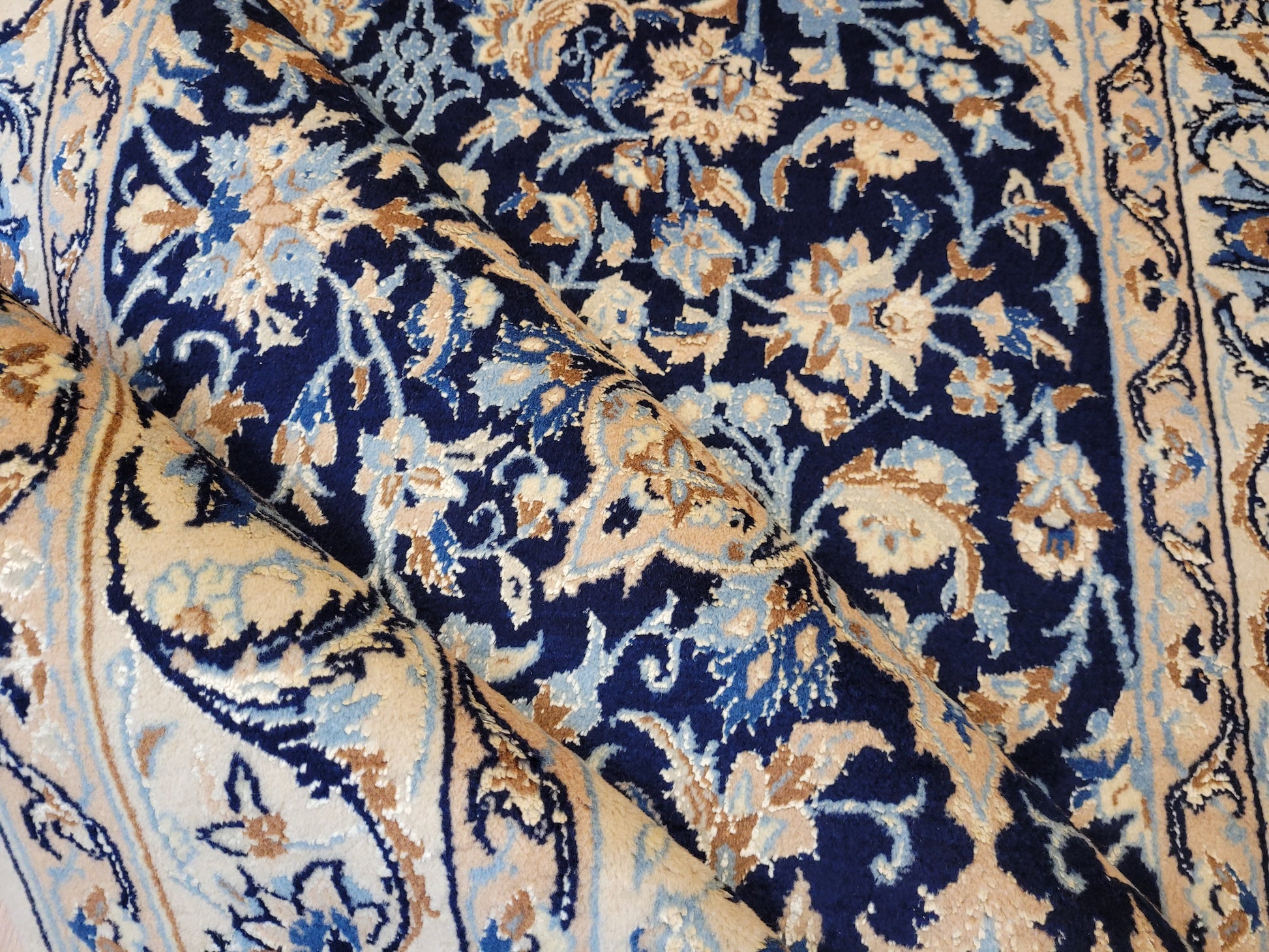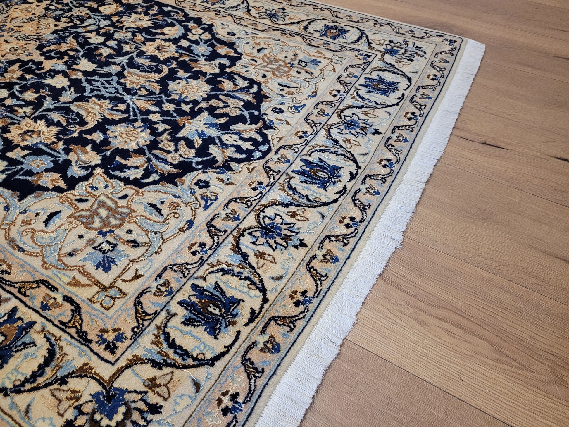 angeboten wird ein edler Nain Teppich aus feinster Korkwolle mit eingelegter Seide. Dieses kunstvolle Stück beeindruckt durch sein symmetrisches Medaillon-Design auf dunkelblauem Grund, das von floralen Arabesken und zarten Ranken umrahmt wird. Die eingearbeiteten Seidenelemente verleihen dem Teppich eine elegante Brillanz und betonen die plastische Wirkung der Muster.