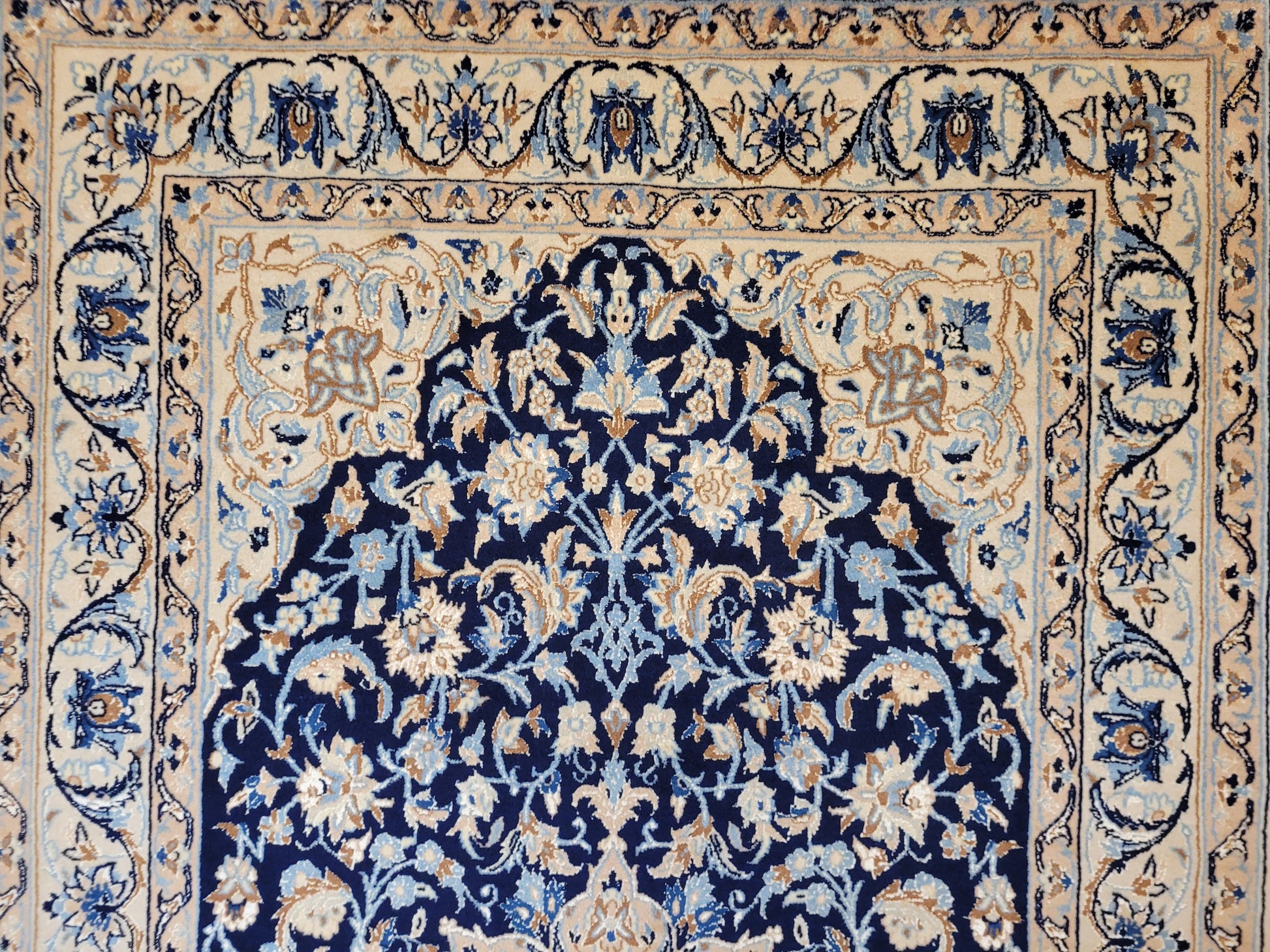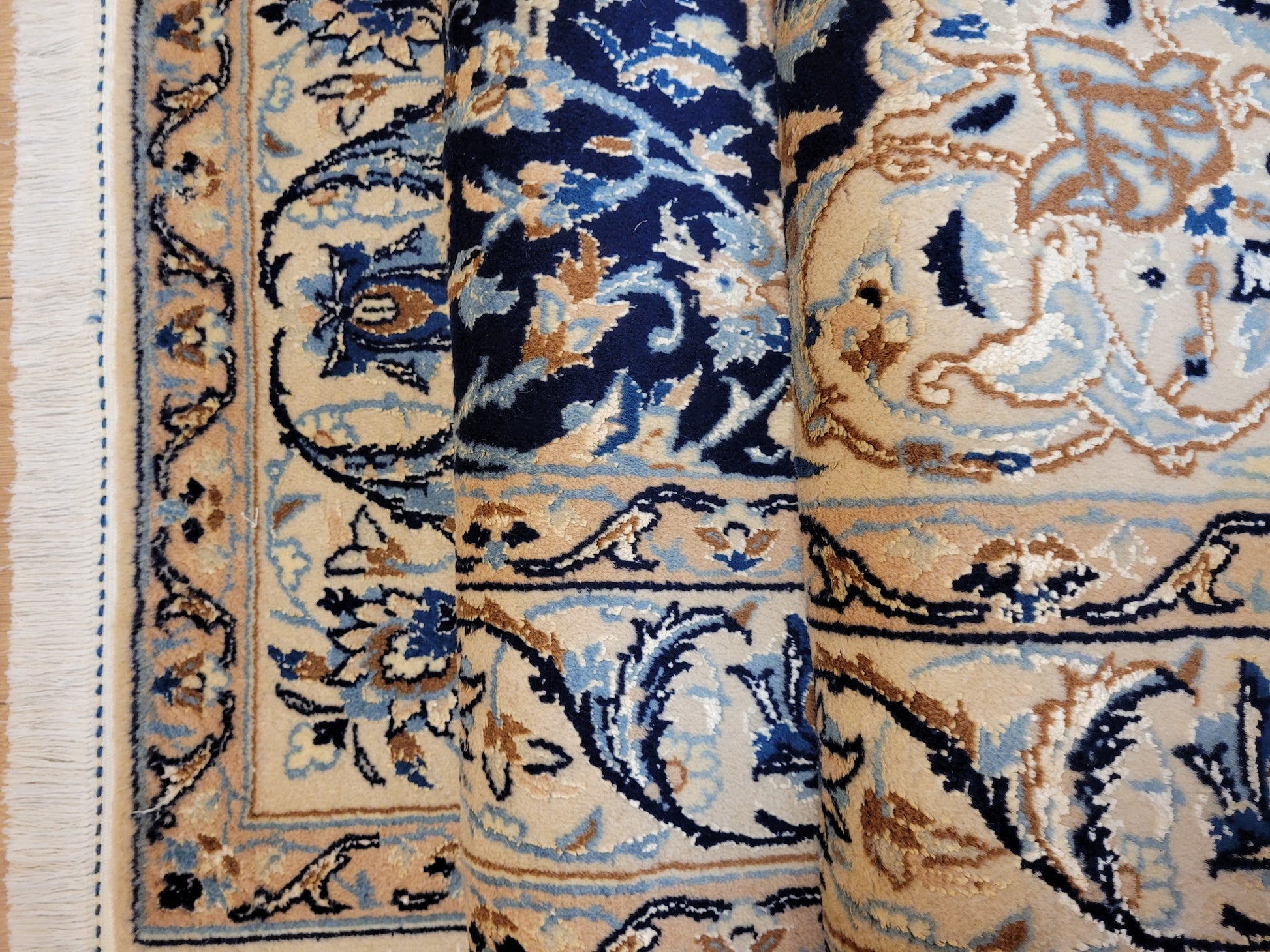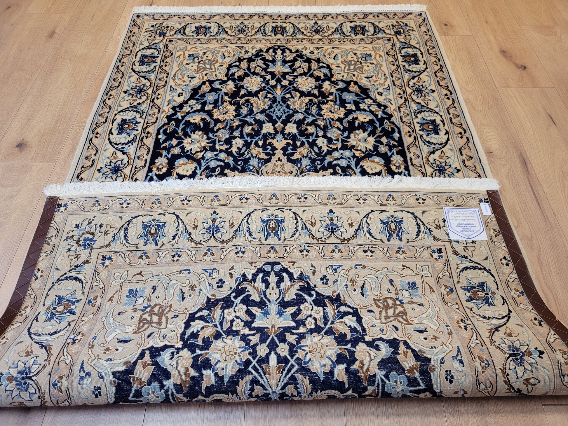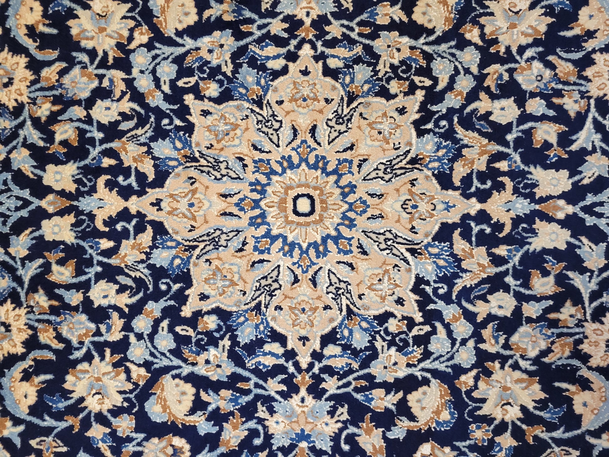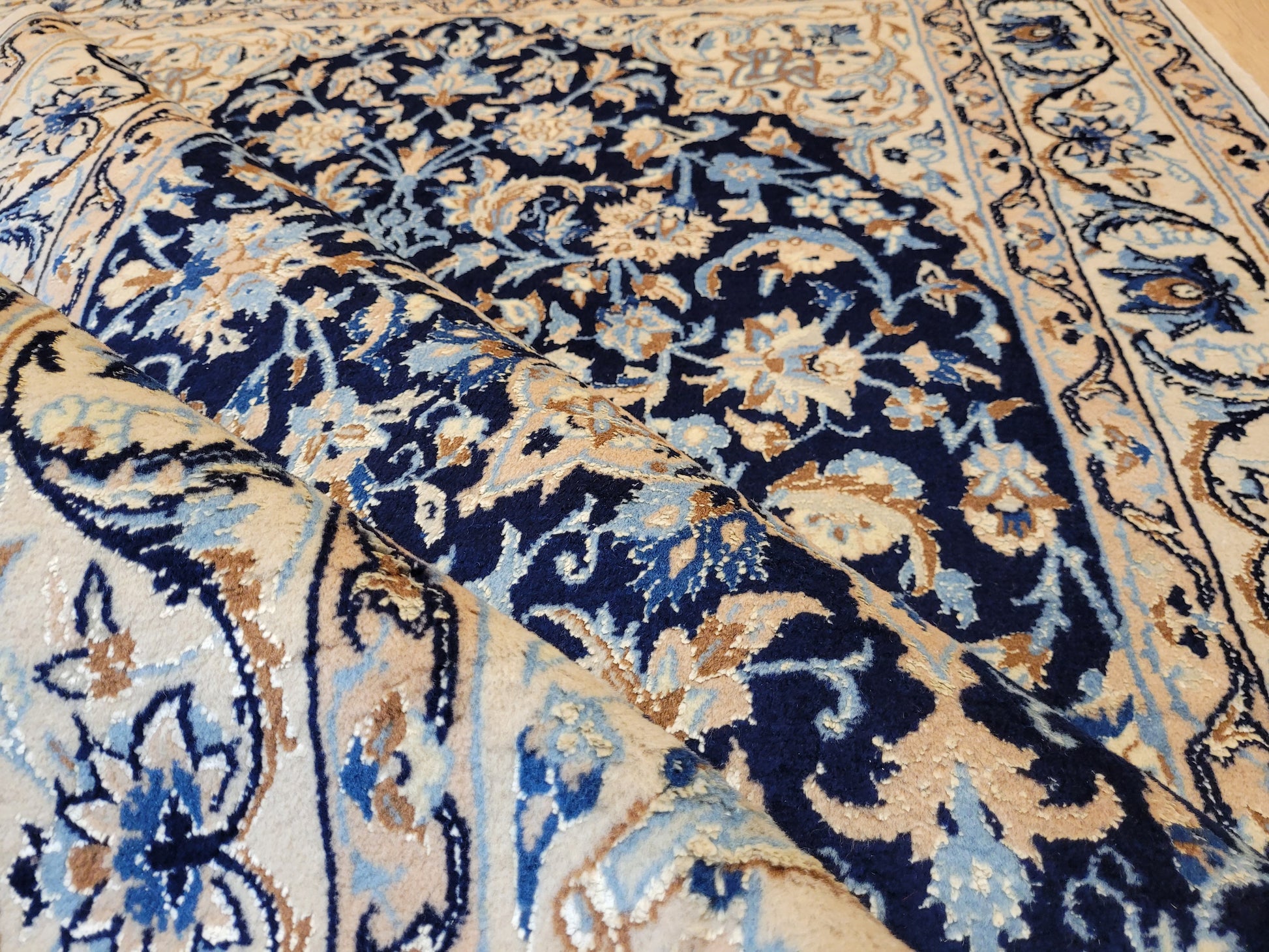 angeboten wird ein edler Nain Teppich aus feinster Korkwolle mit eingelegter Seide. Dieses kunstvolle Stück beeindruckt durch sein symmetrisches Medaillon-Design auf dunkelblauem Grund, das von floralen Arabesken und zarten Ranken umrahmt wird. Die eingearbeiteten Seidenelemente verleihen dem Teppich eine elegante Brillanz und betonen die plastische Wirkung der Muster.