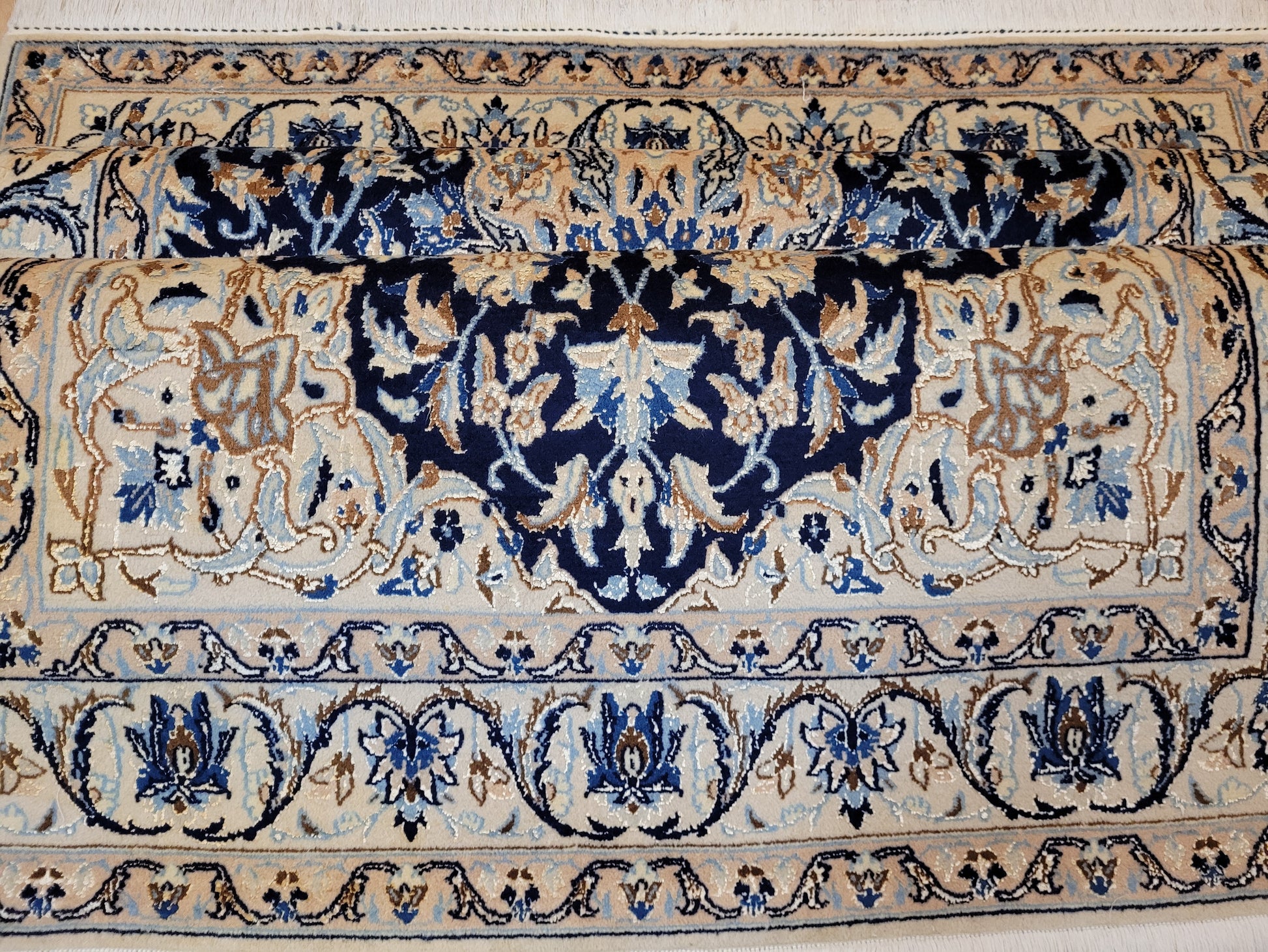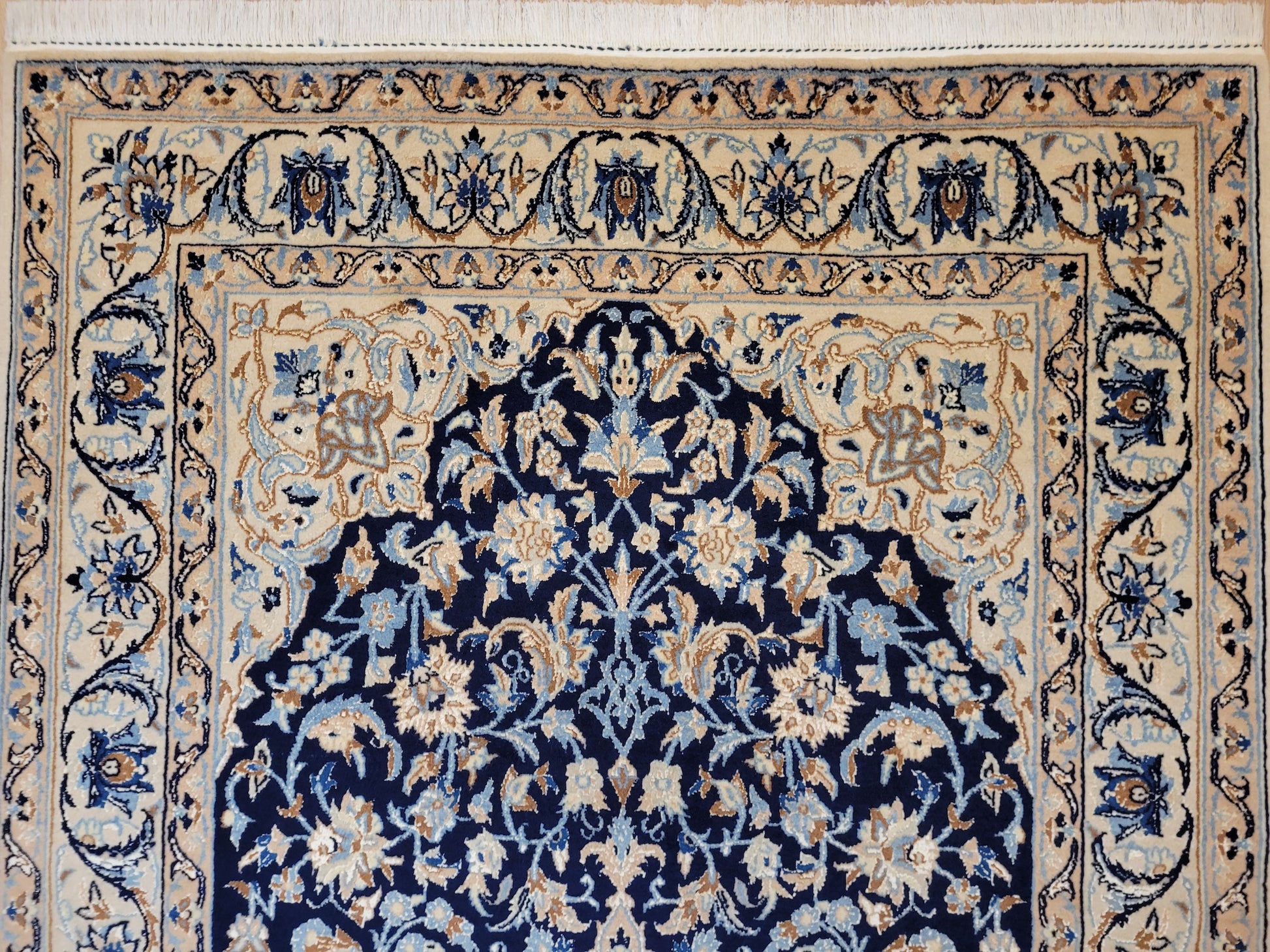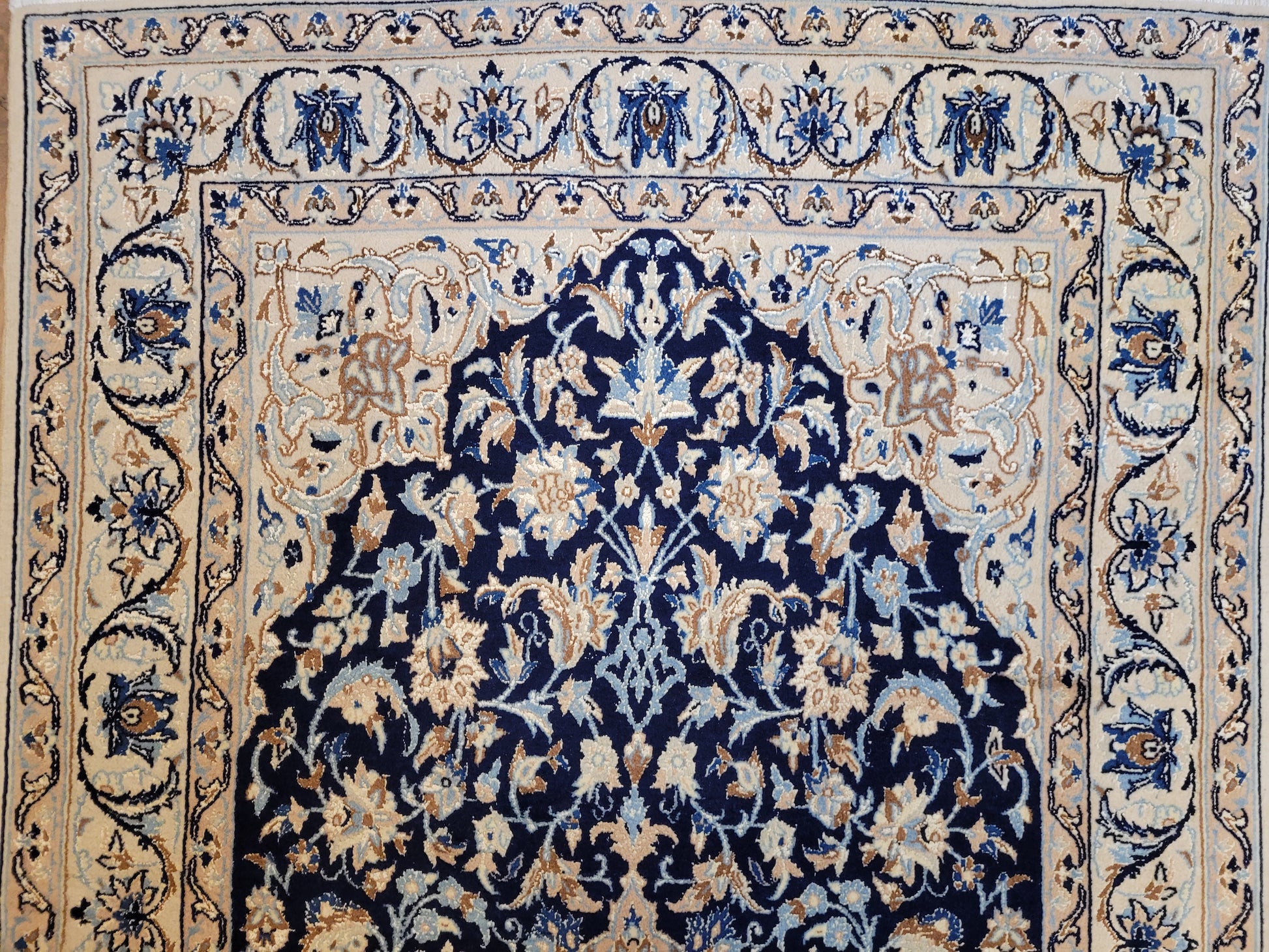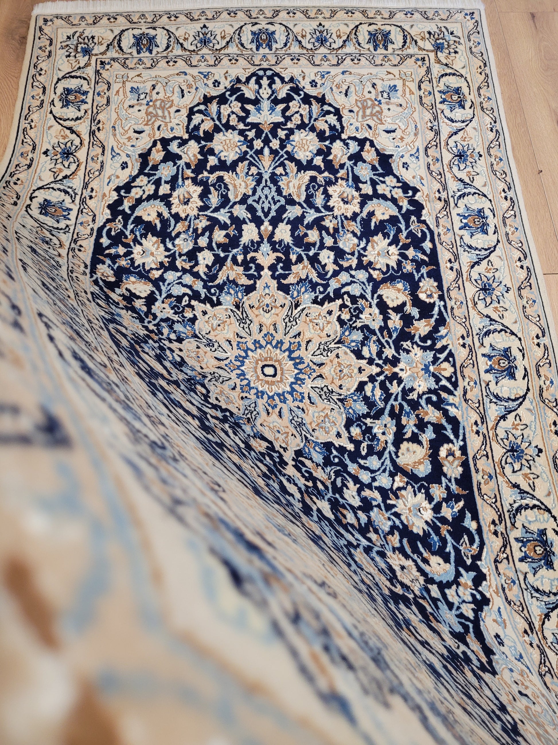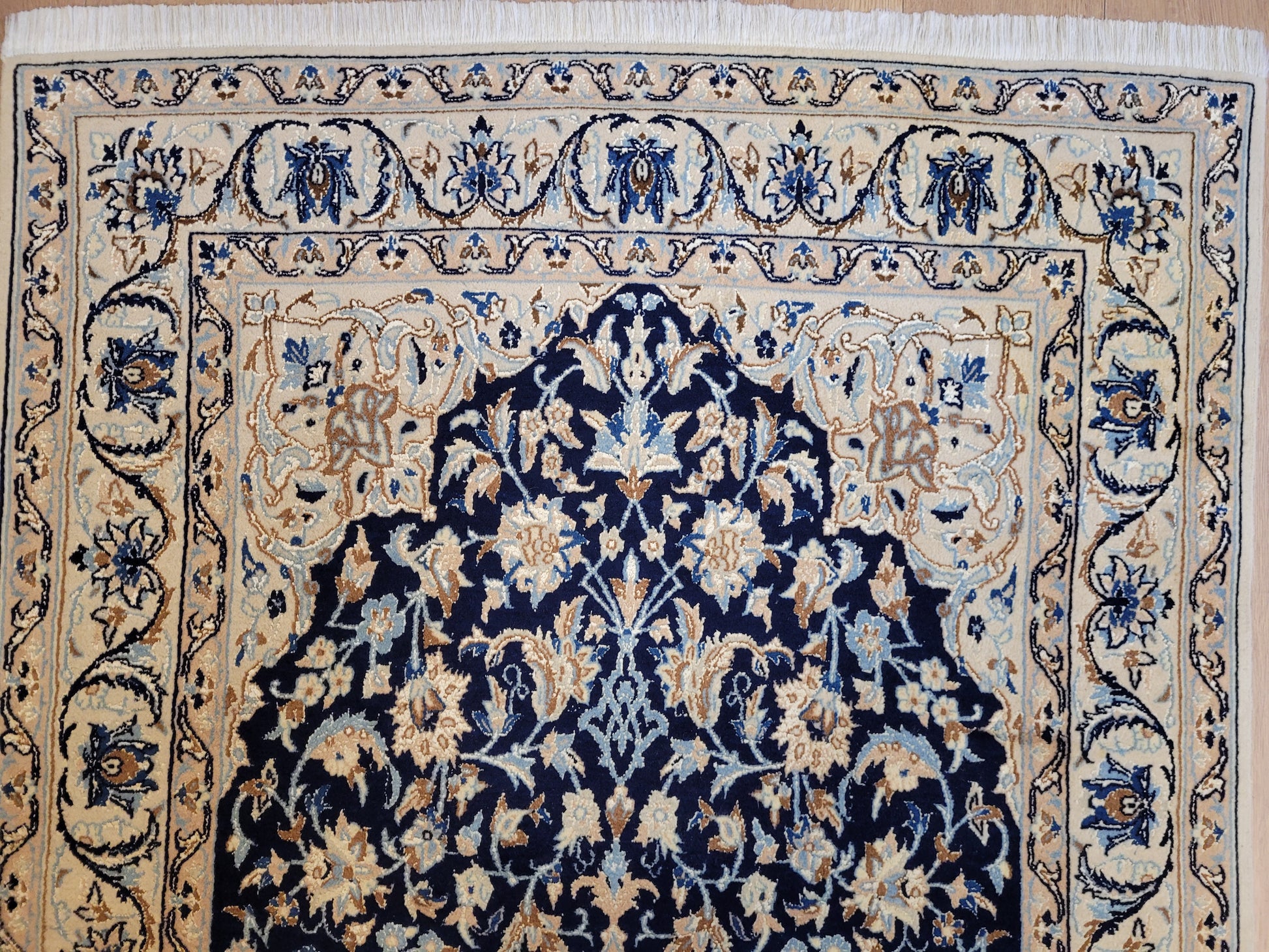 angeboten wird ein edler Nain Teppich aus feinster Korkwolle mit eingelegter Seide. Dieses kunstvolle Stück beeindruckt durch sein symmetrisches Medaillon-Design auf dunkelblauem Grund, das von floralen Arabesken und zarten Ranken umrahmt wird. Die eingearbeiteten Seidenelemente verleihen dem Teppich eine elegante Brillanz und betonen die plastische Wirkung der Muster.